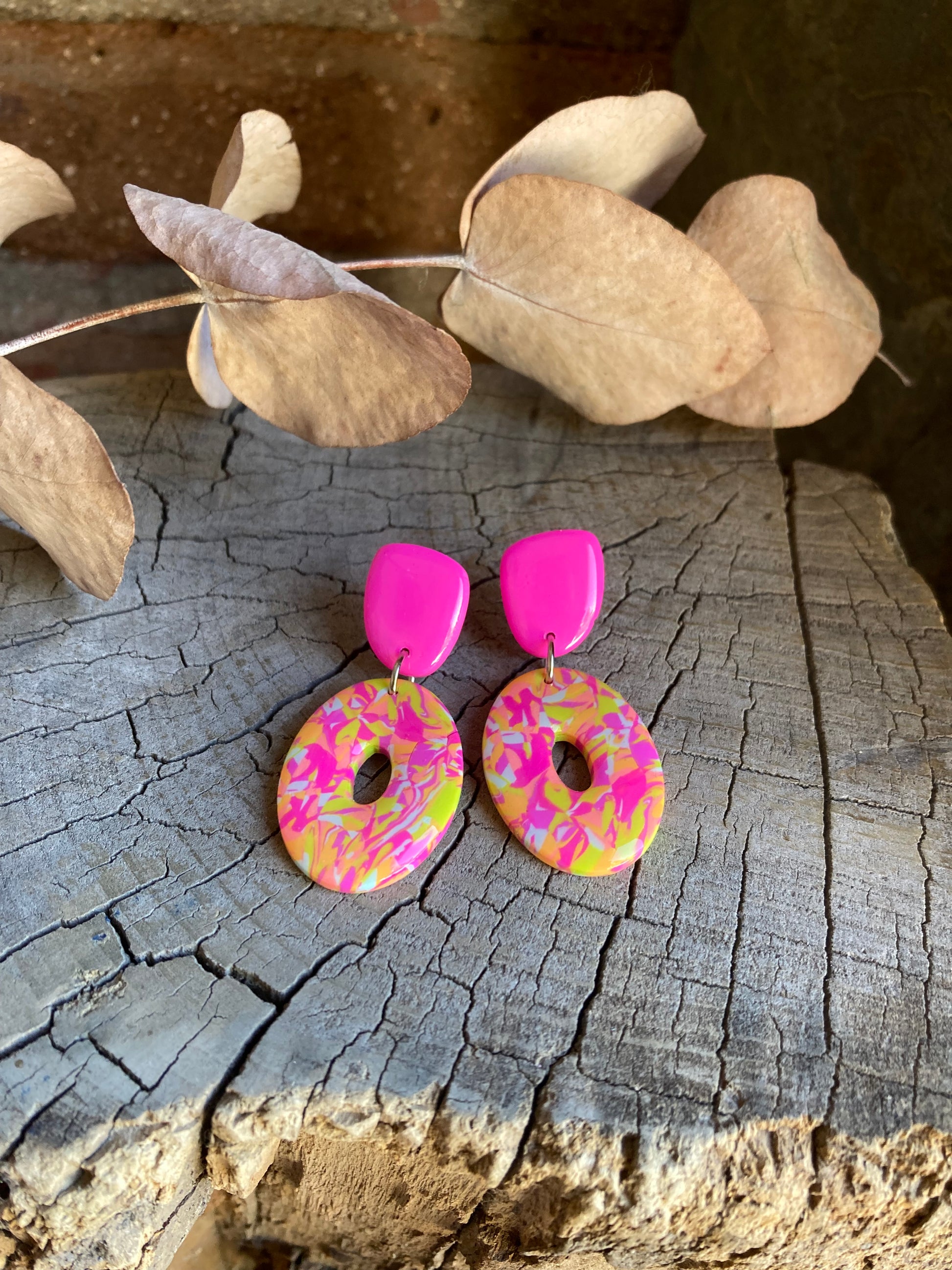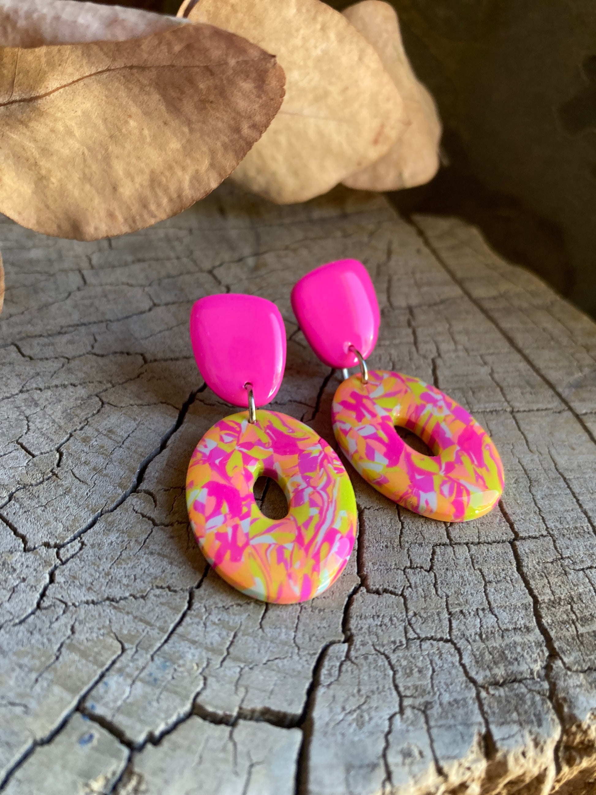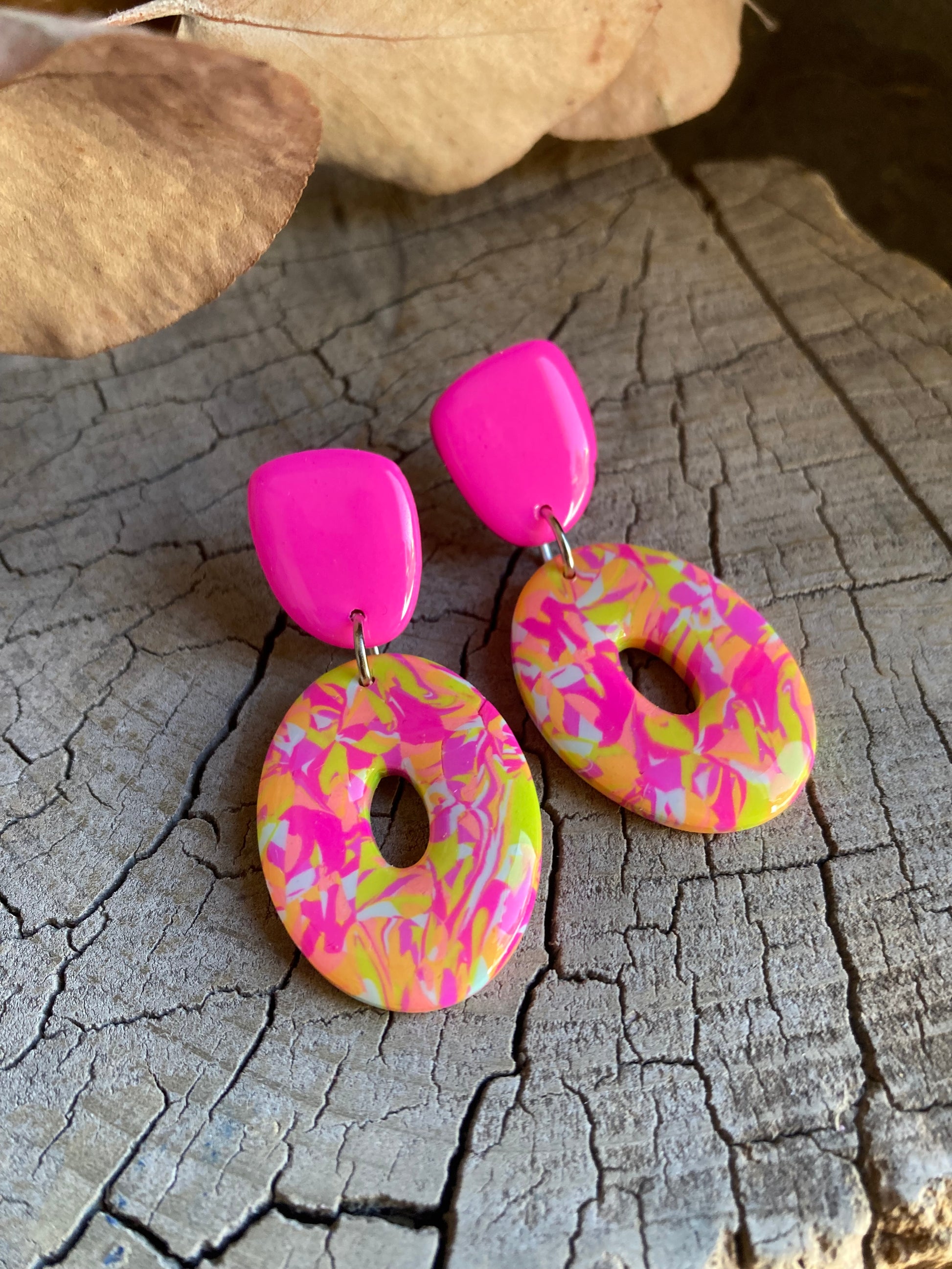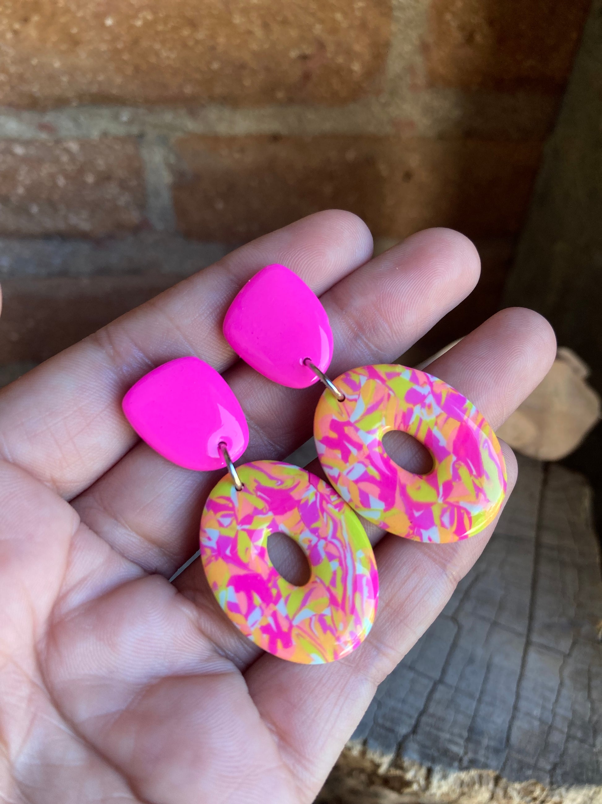 Aros de arcilla polimérica con top coat de resina uv. Miden 4,8 cms. Palito de acero quirúrgico y tope de goma.