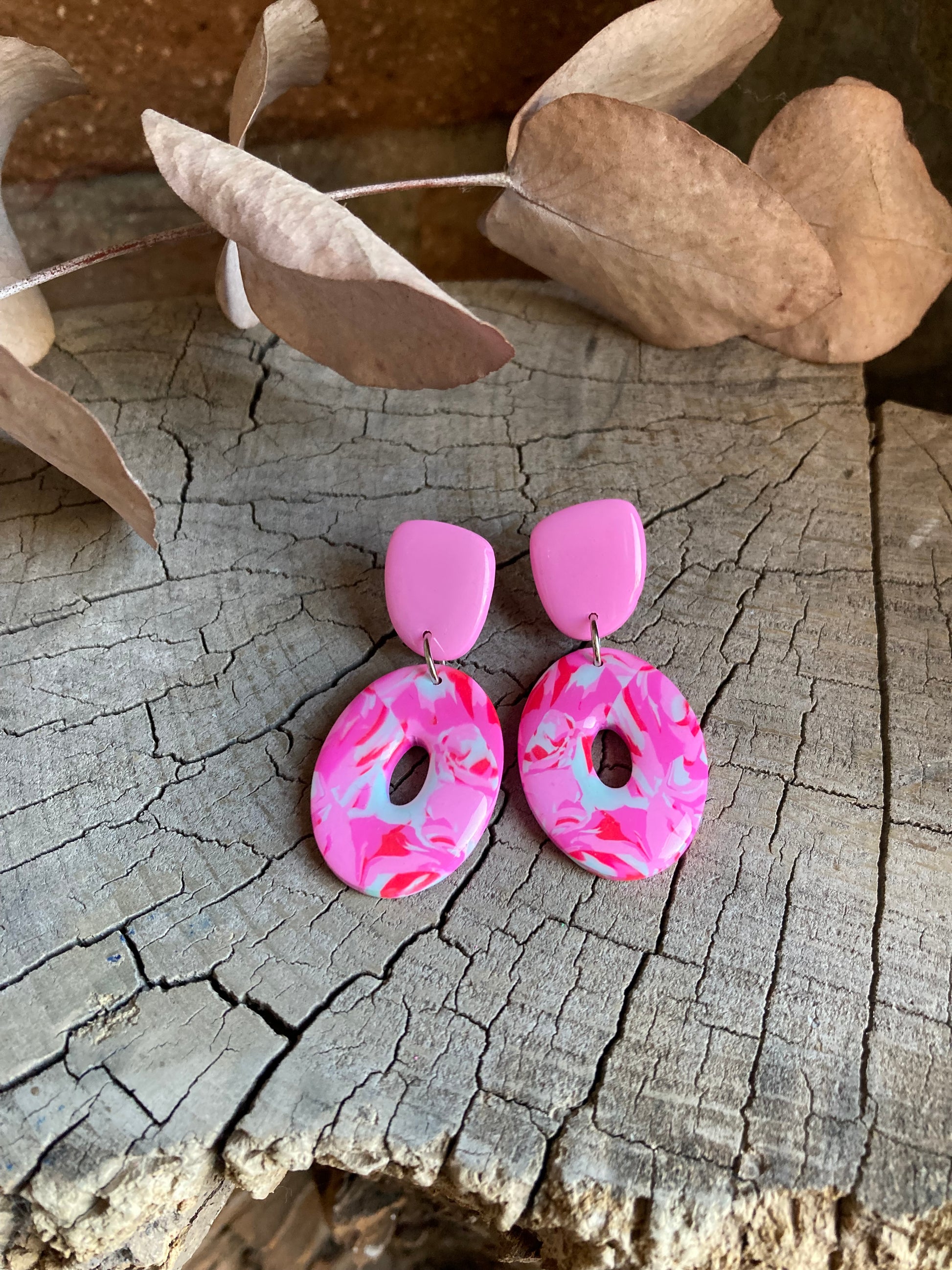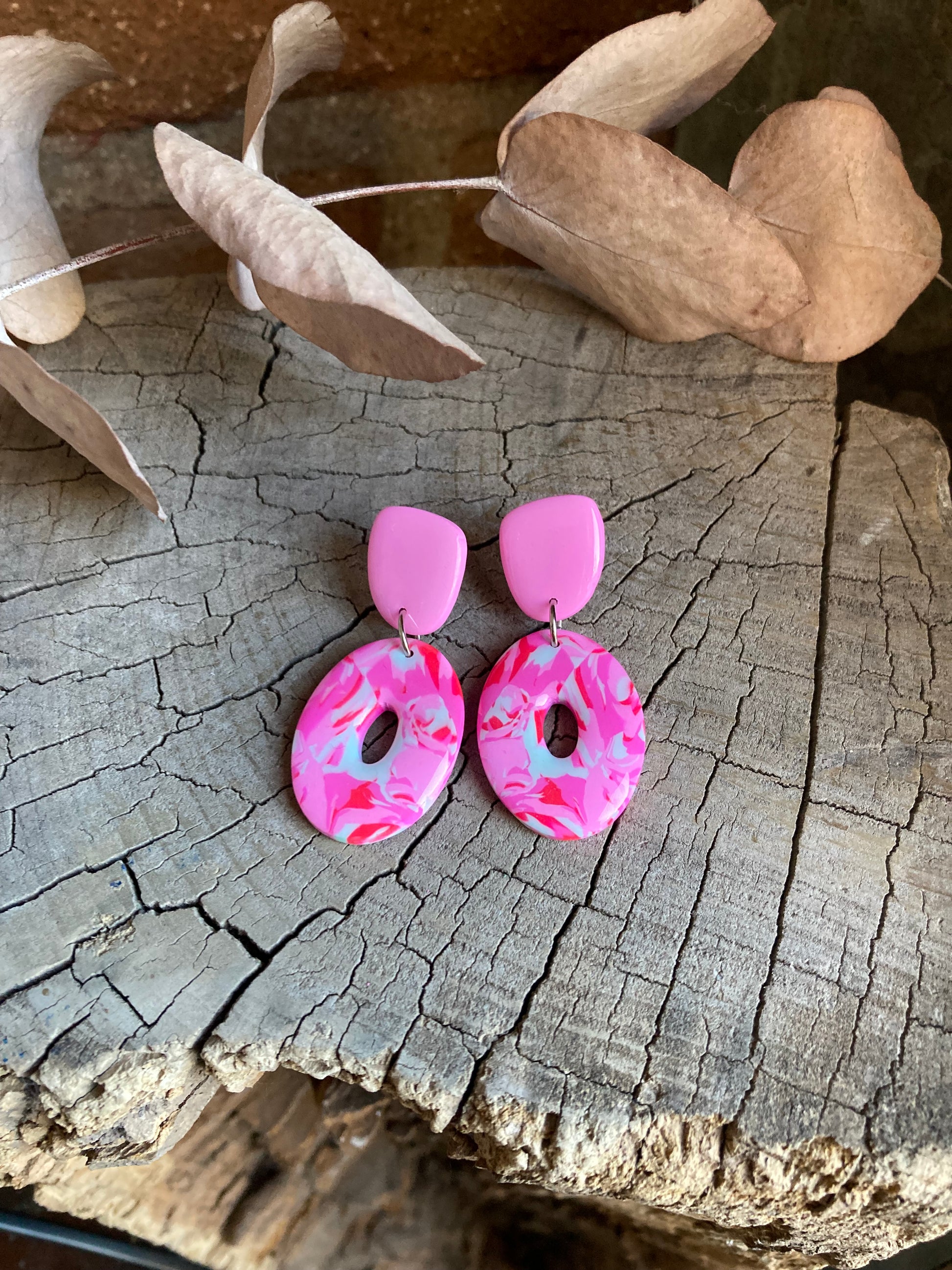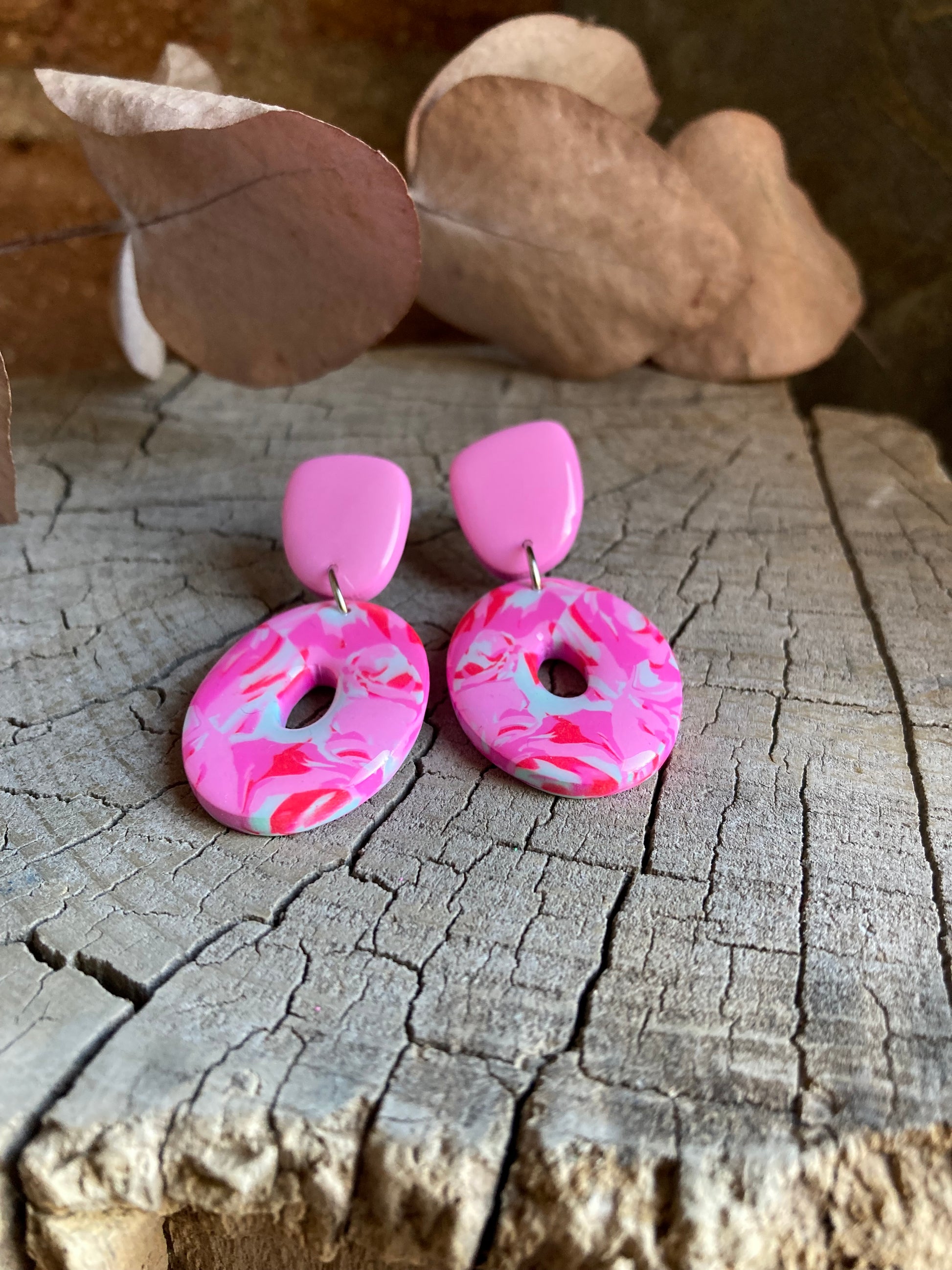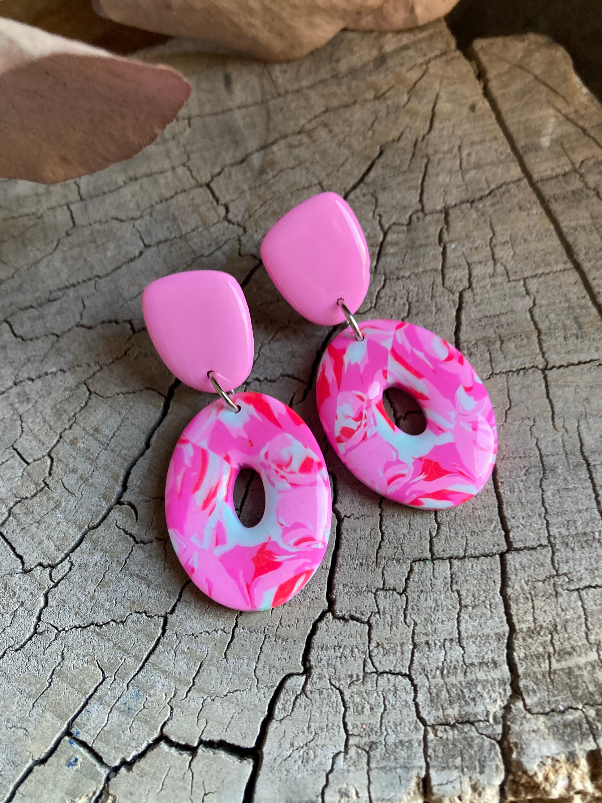 Aros de arcilla polimérica con top coat de resina uv. Miden 4,8 cms. Palito de acero quirúrgico y tope de goma.