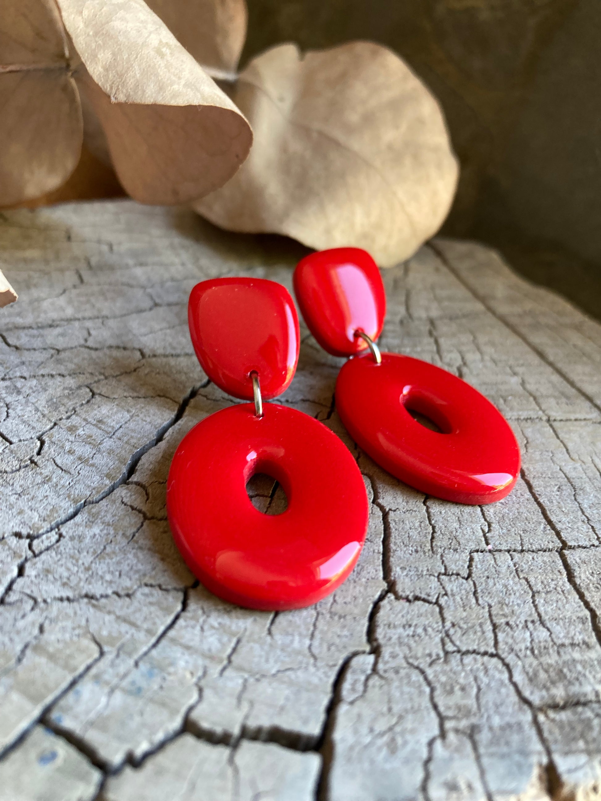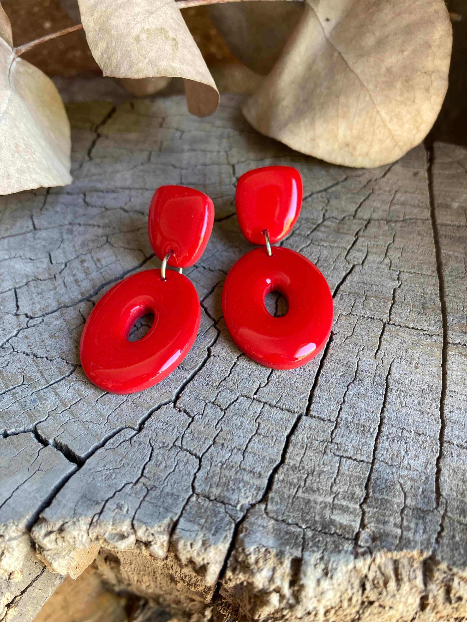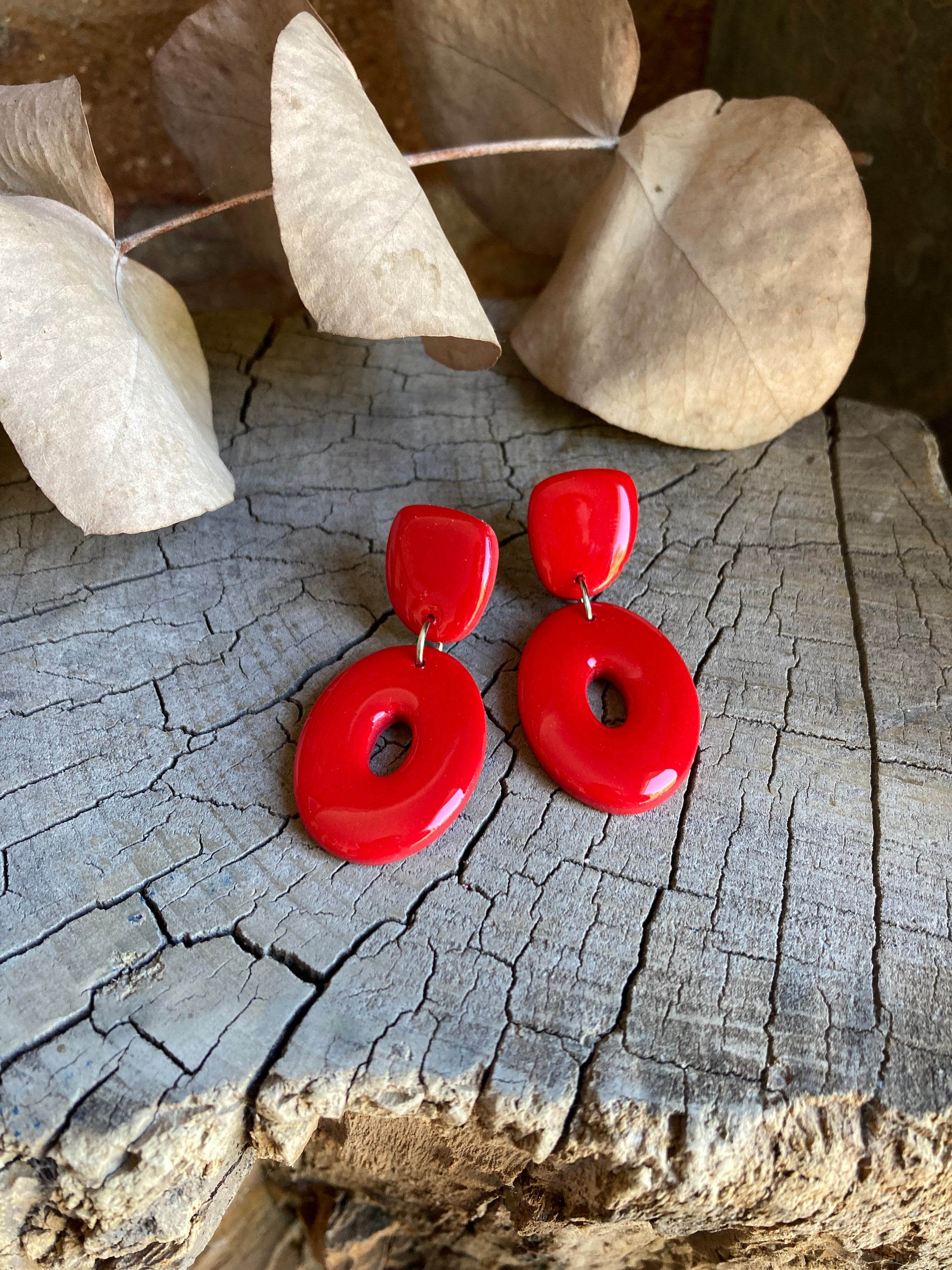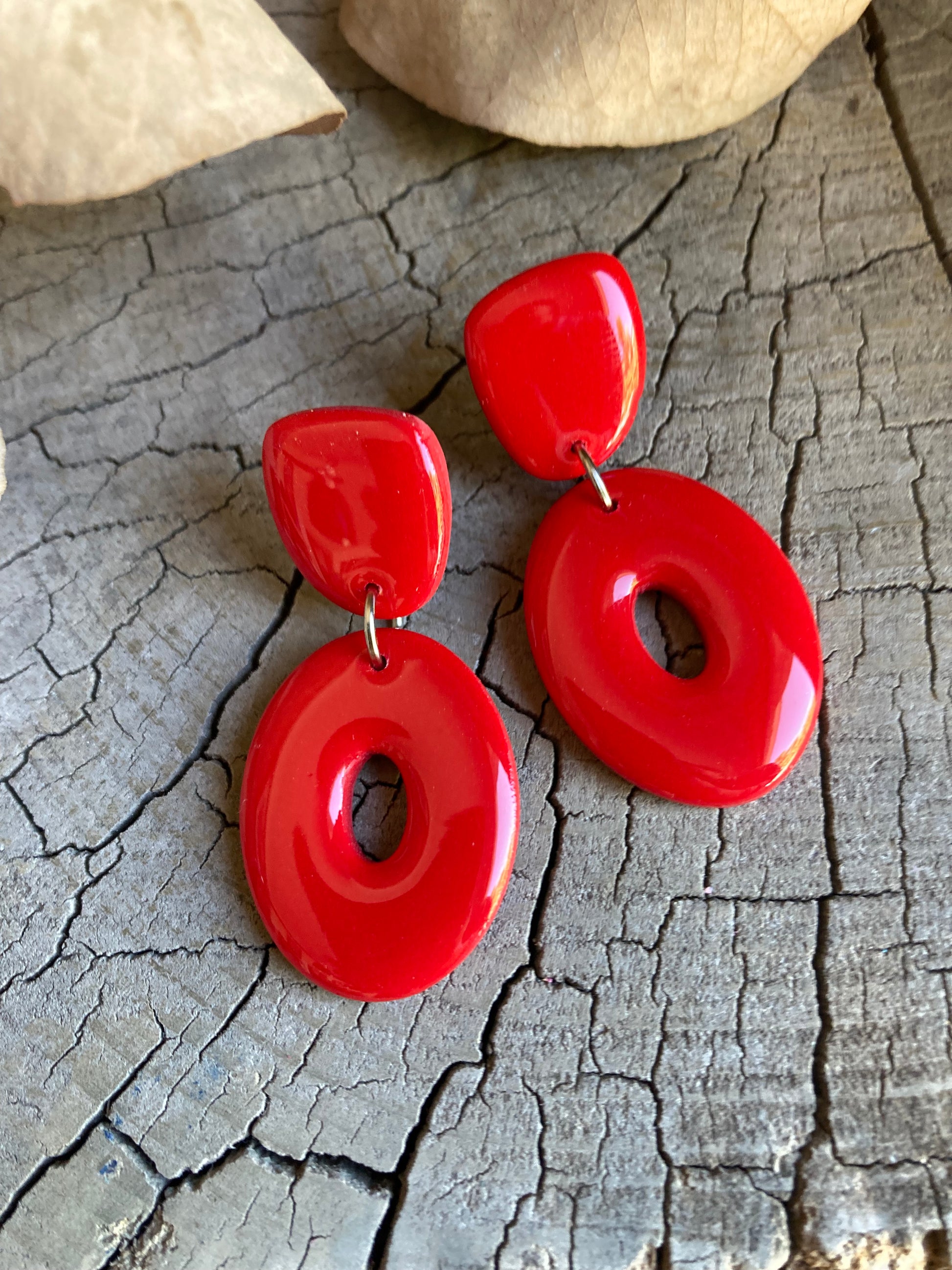 Aros de arcilla polimérica con top coat de resina uv. Miden 4,8 cms. Palito de acero quirúrgico y tope de goma.