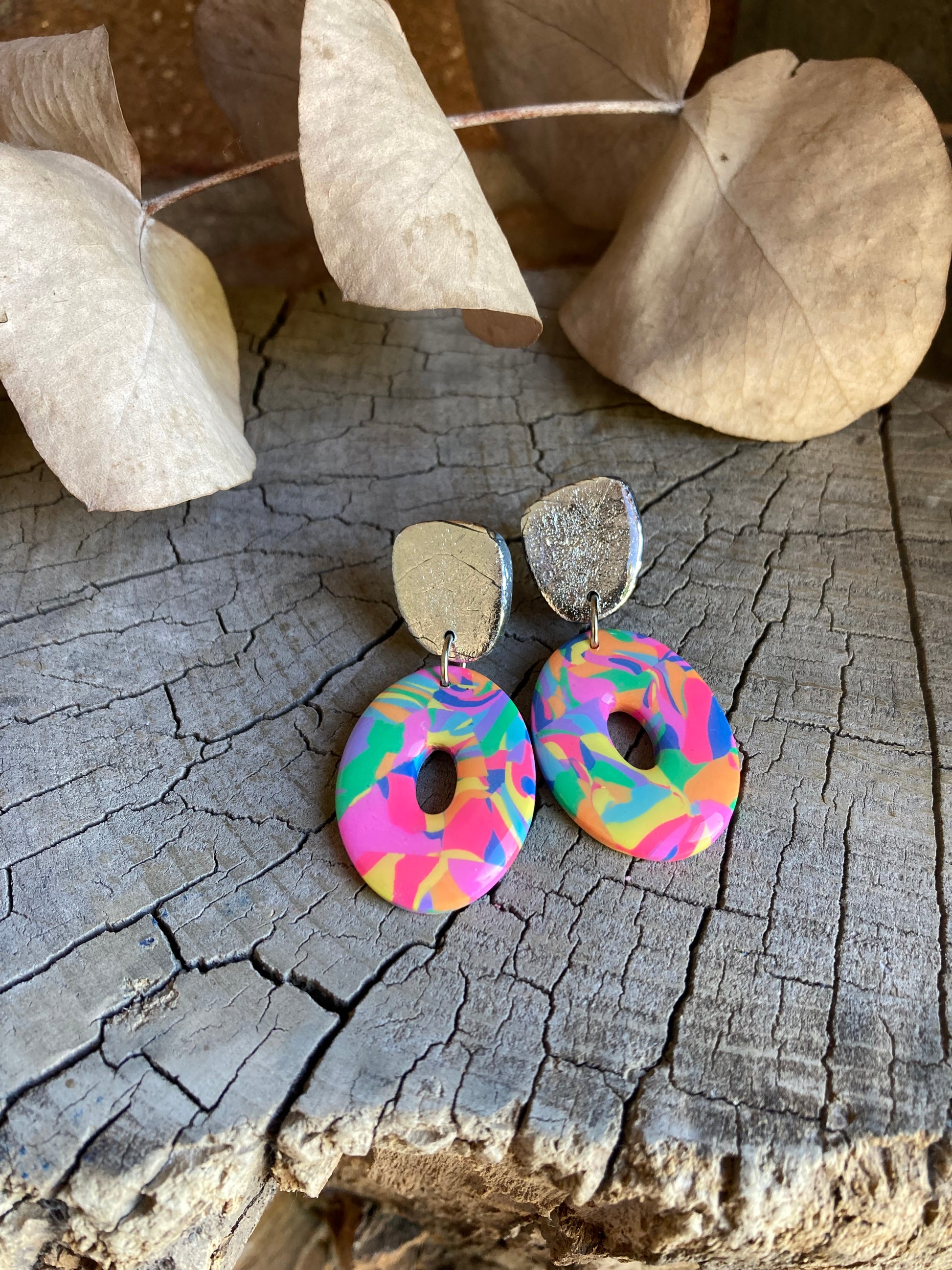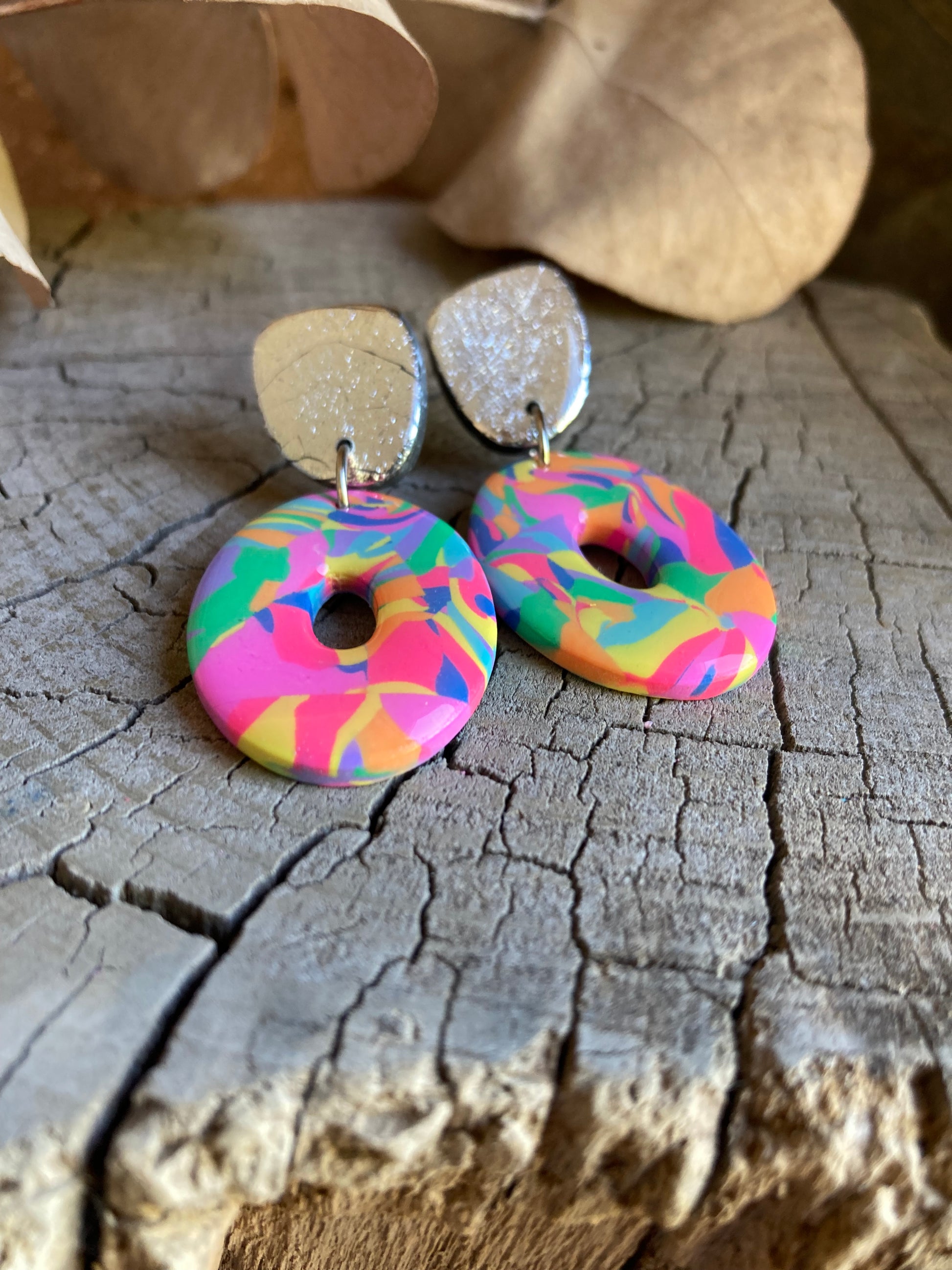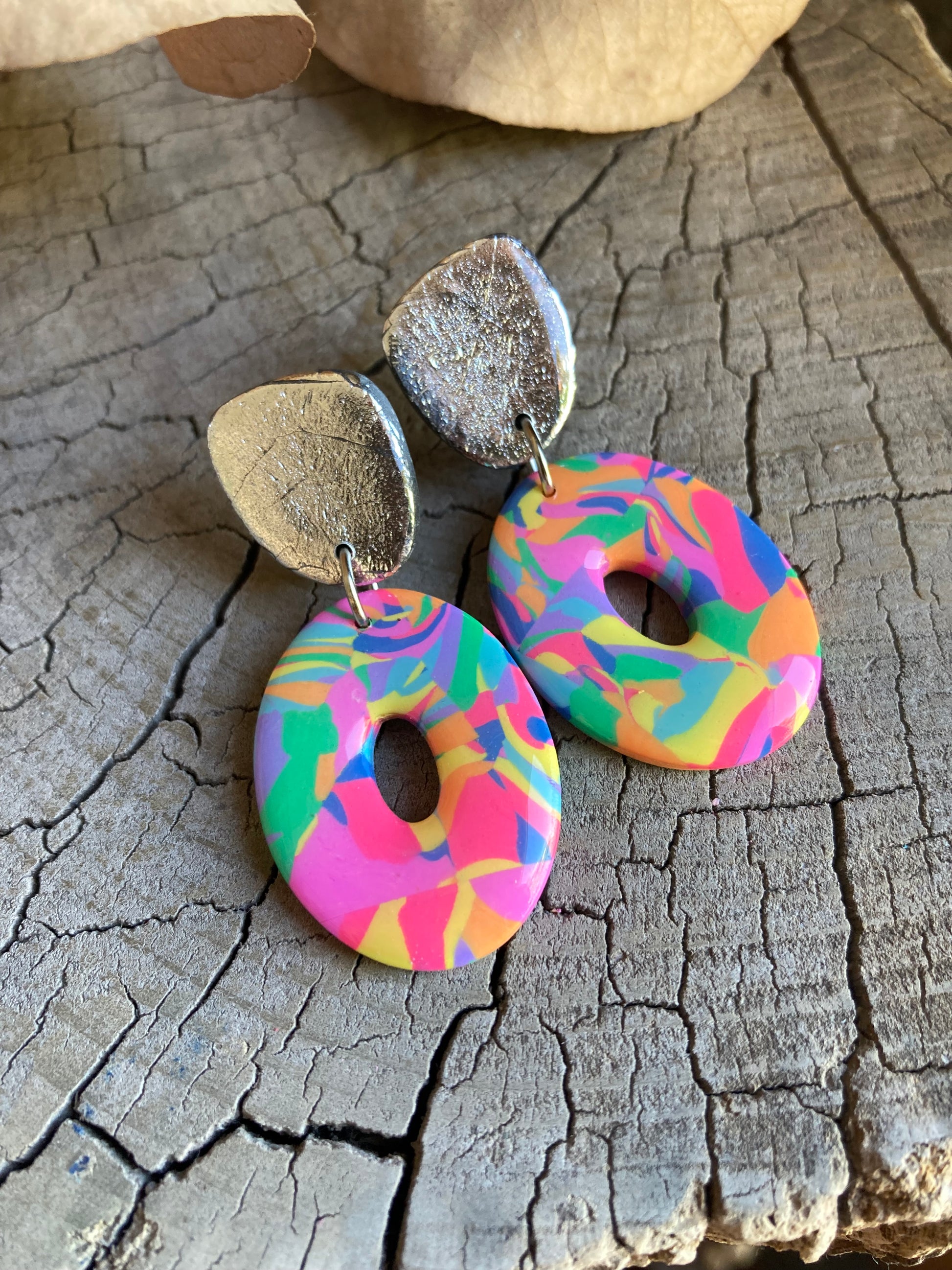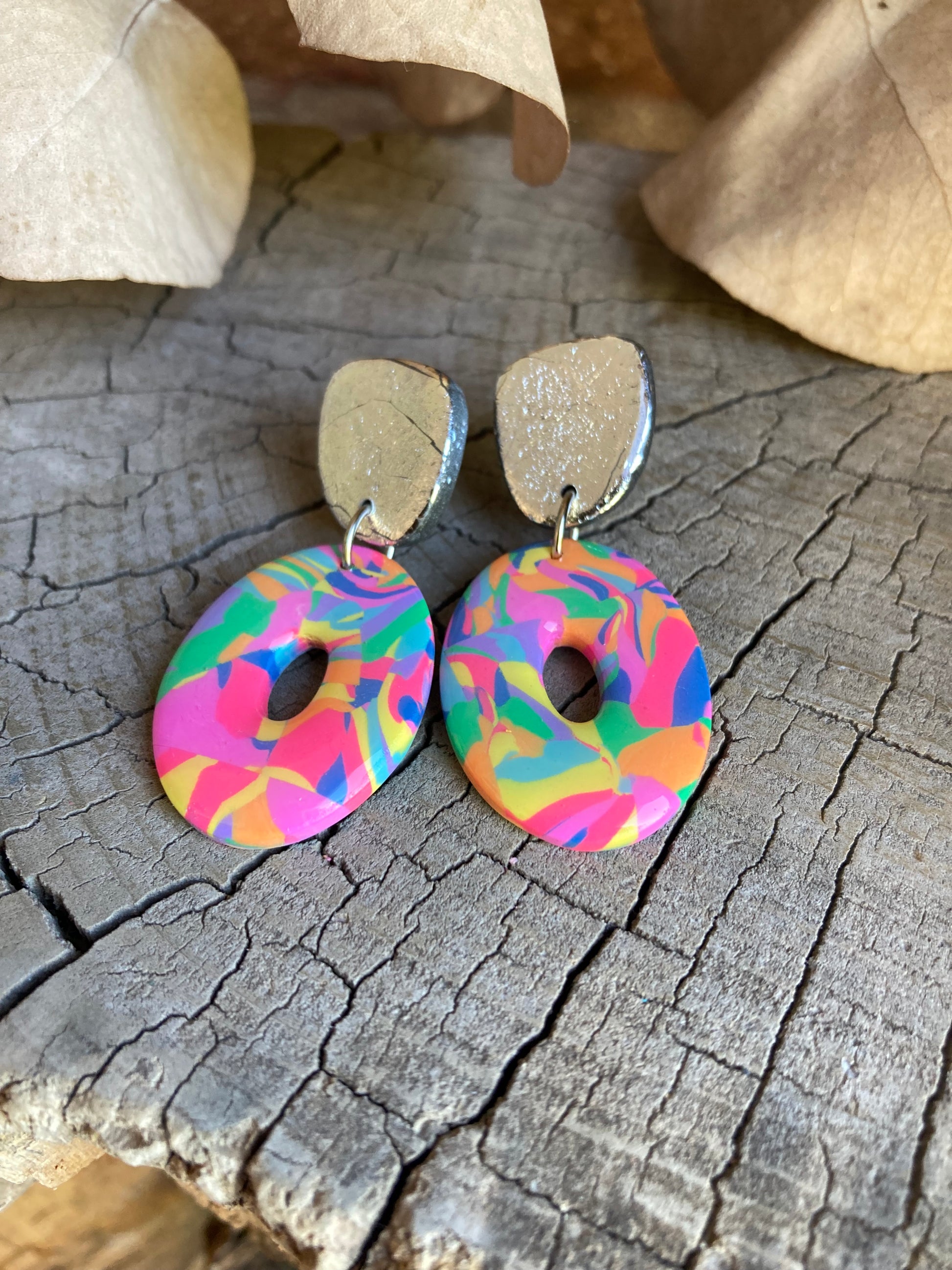 Aros de arcilla polimérica con top coat de resina uv. Miden 4,8 cms. Palito de acero quirúrgico y tope de goma.