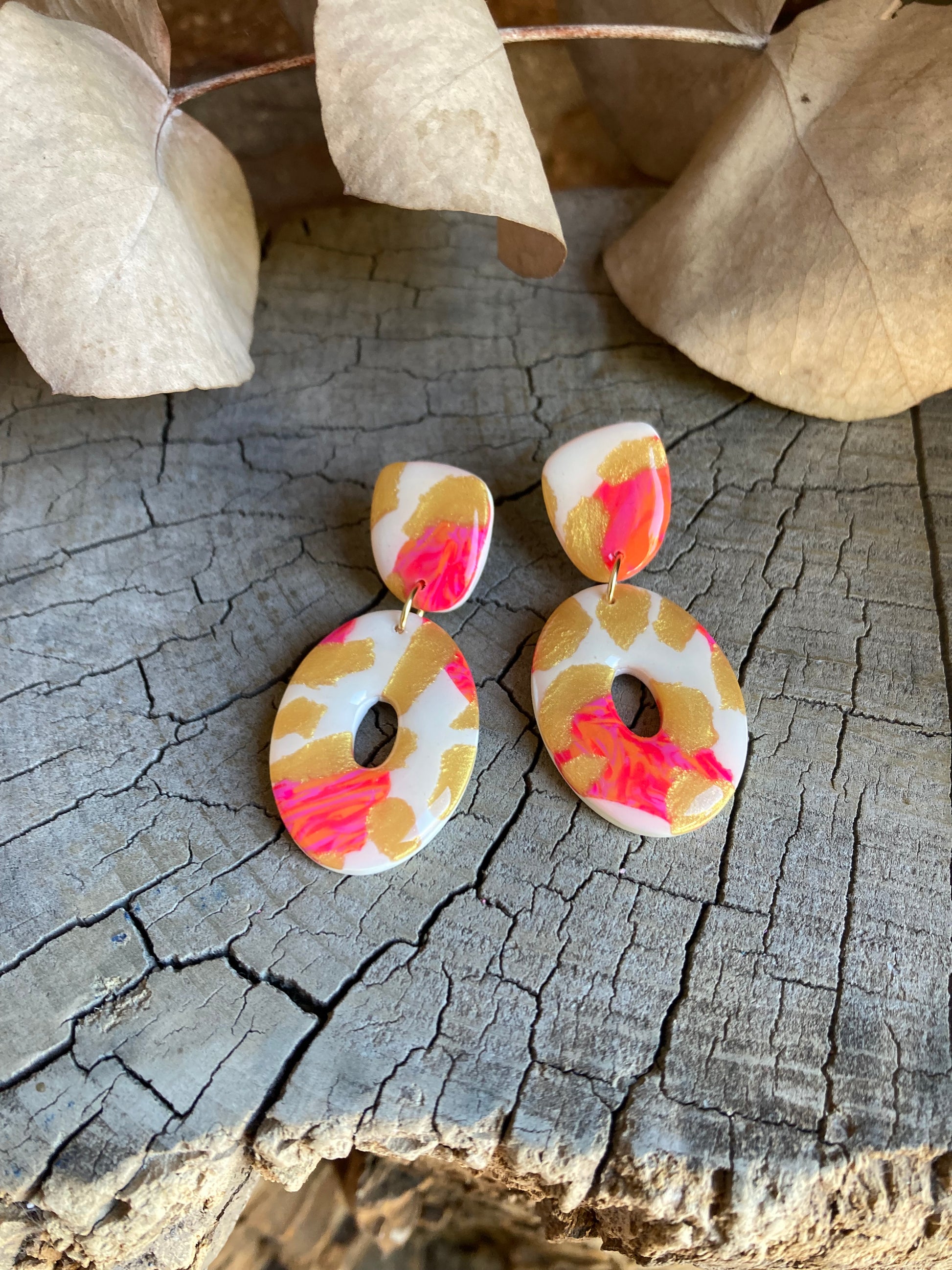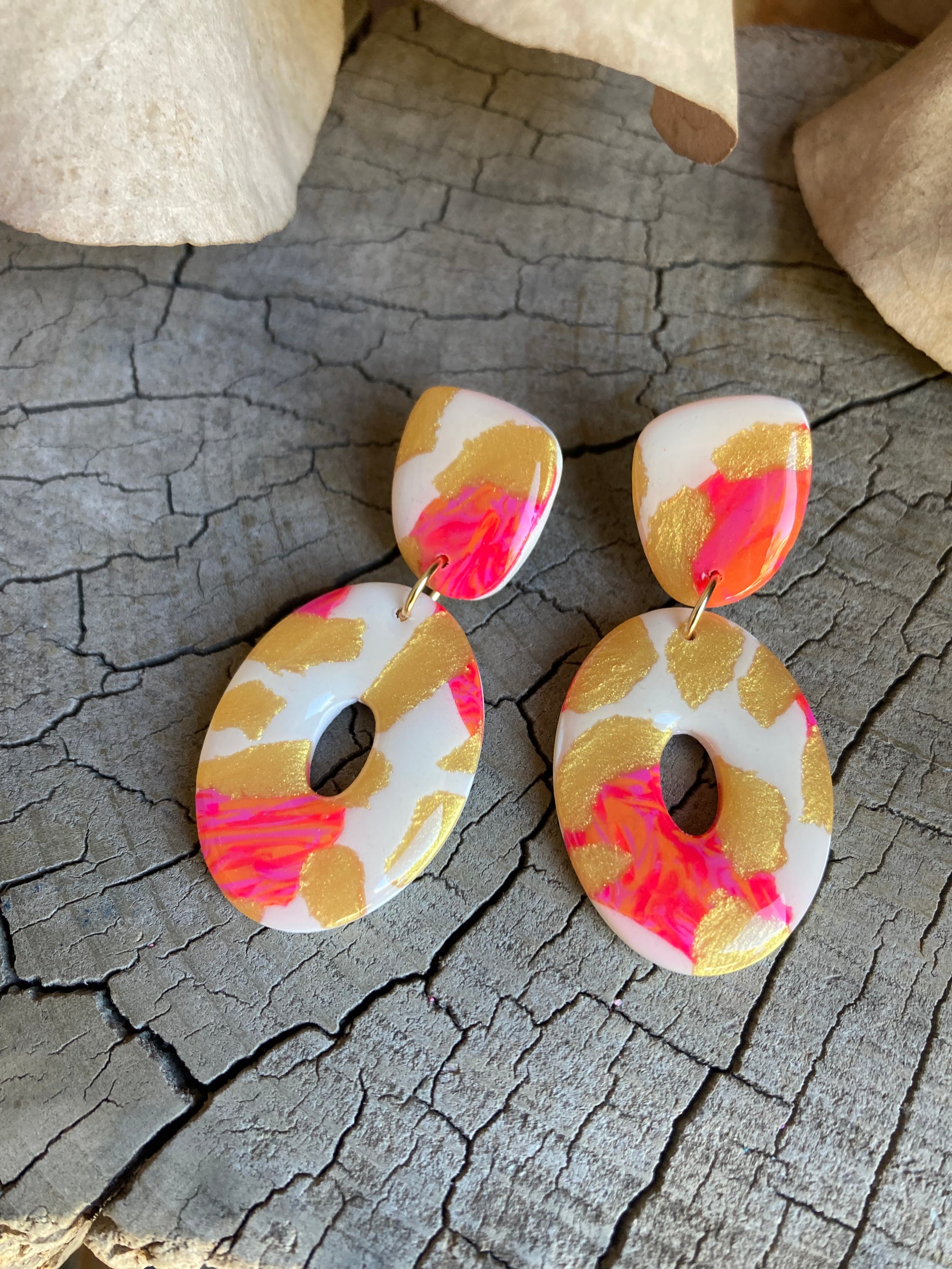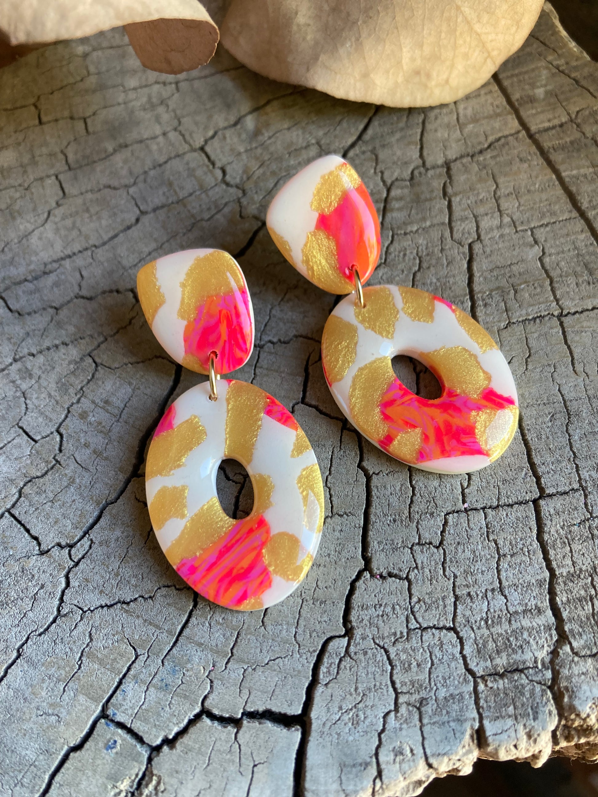 Aros de arcilla polimérica con top coat de resina uv. Miden 4,8 cms. Palito de acero quirúrgico y tope de goma.