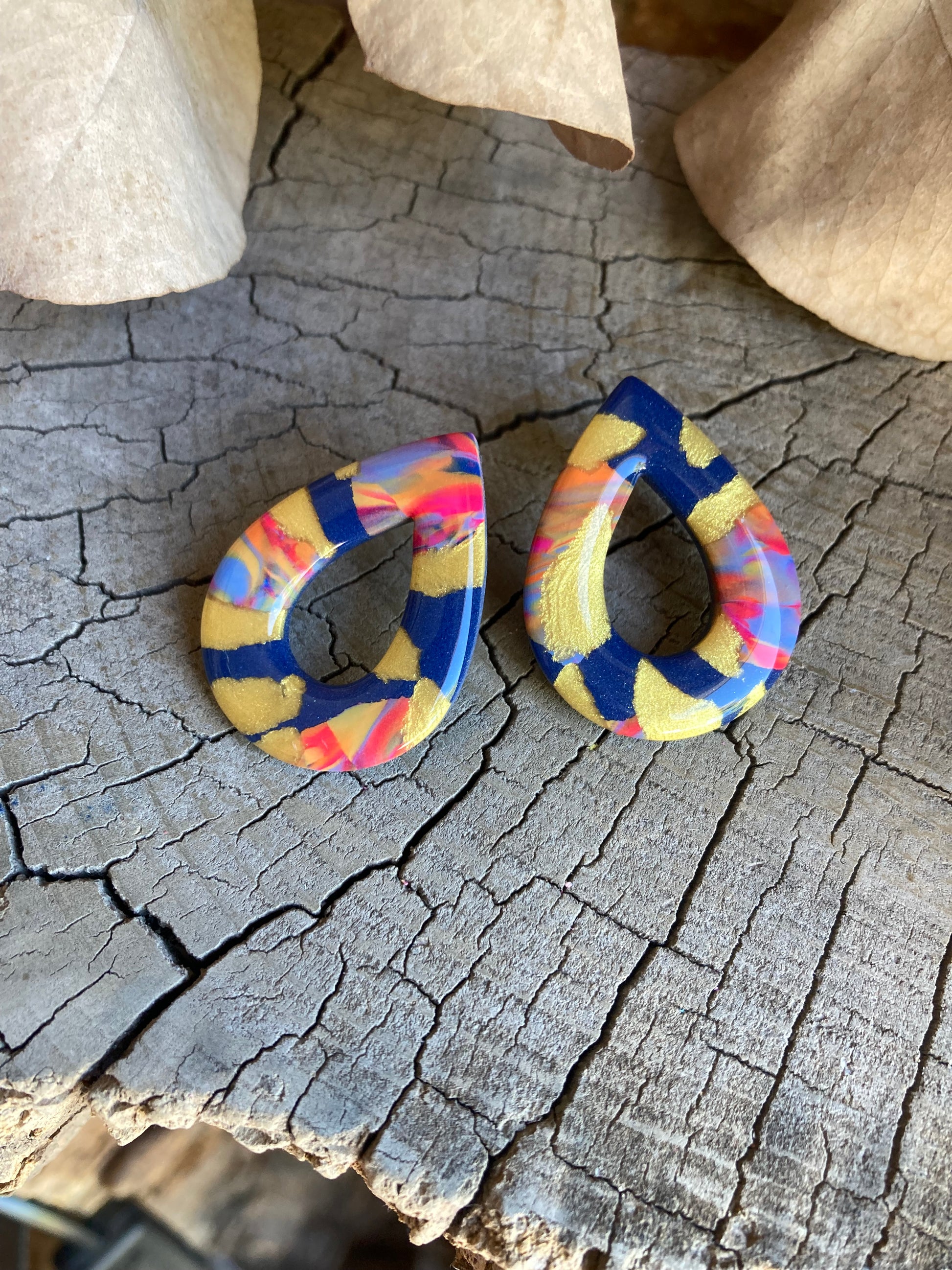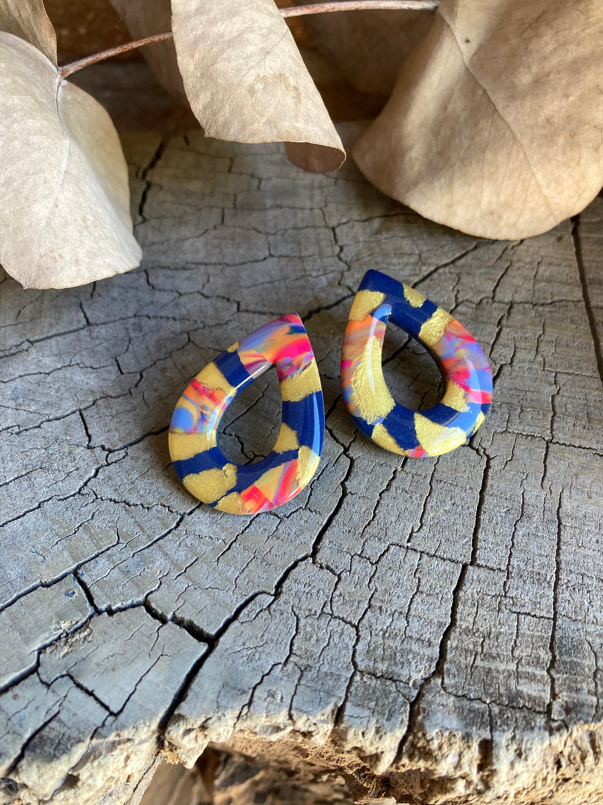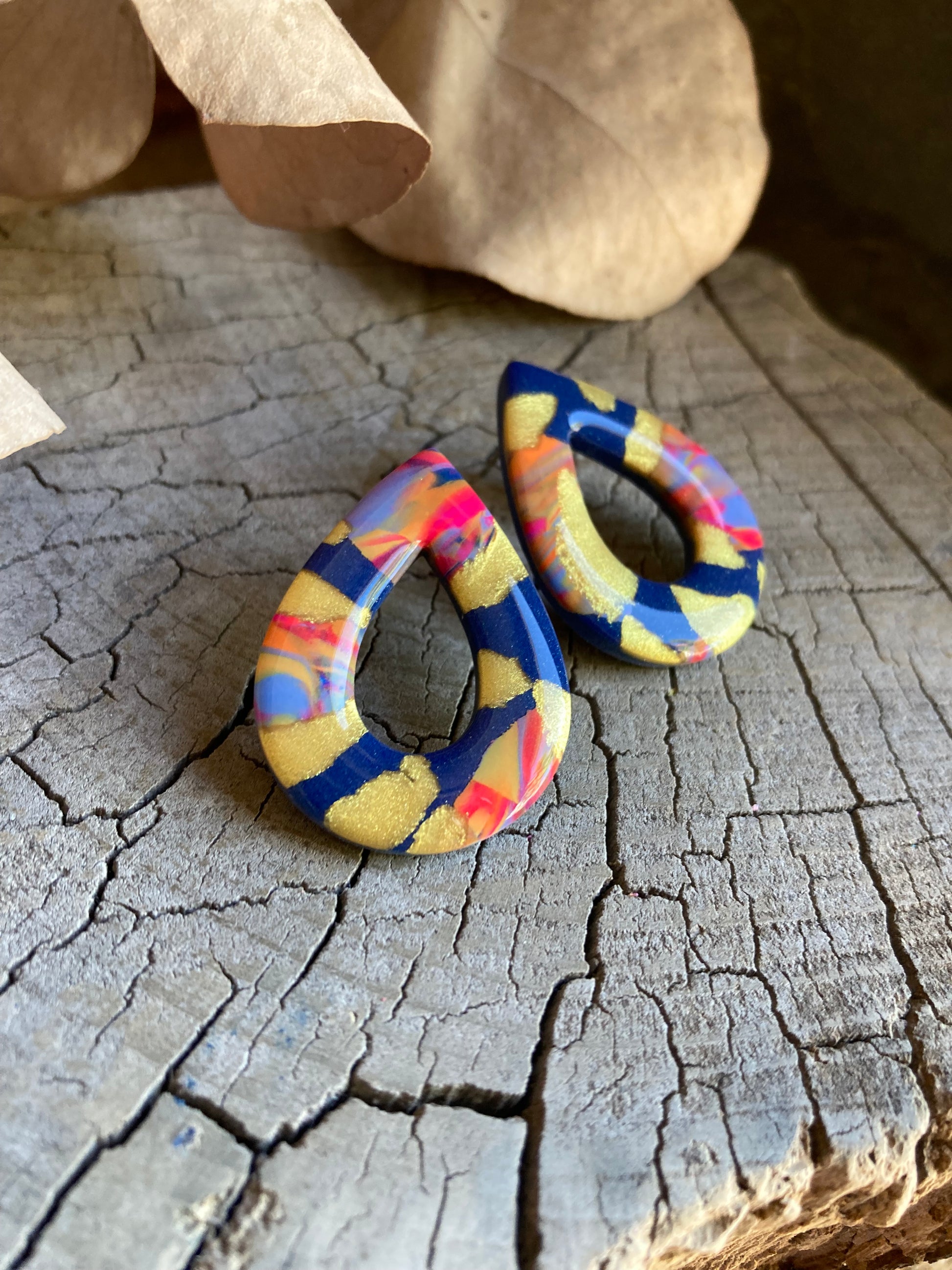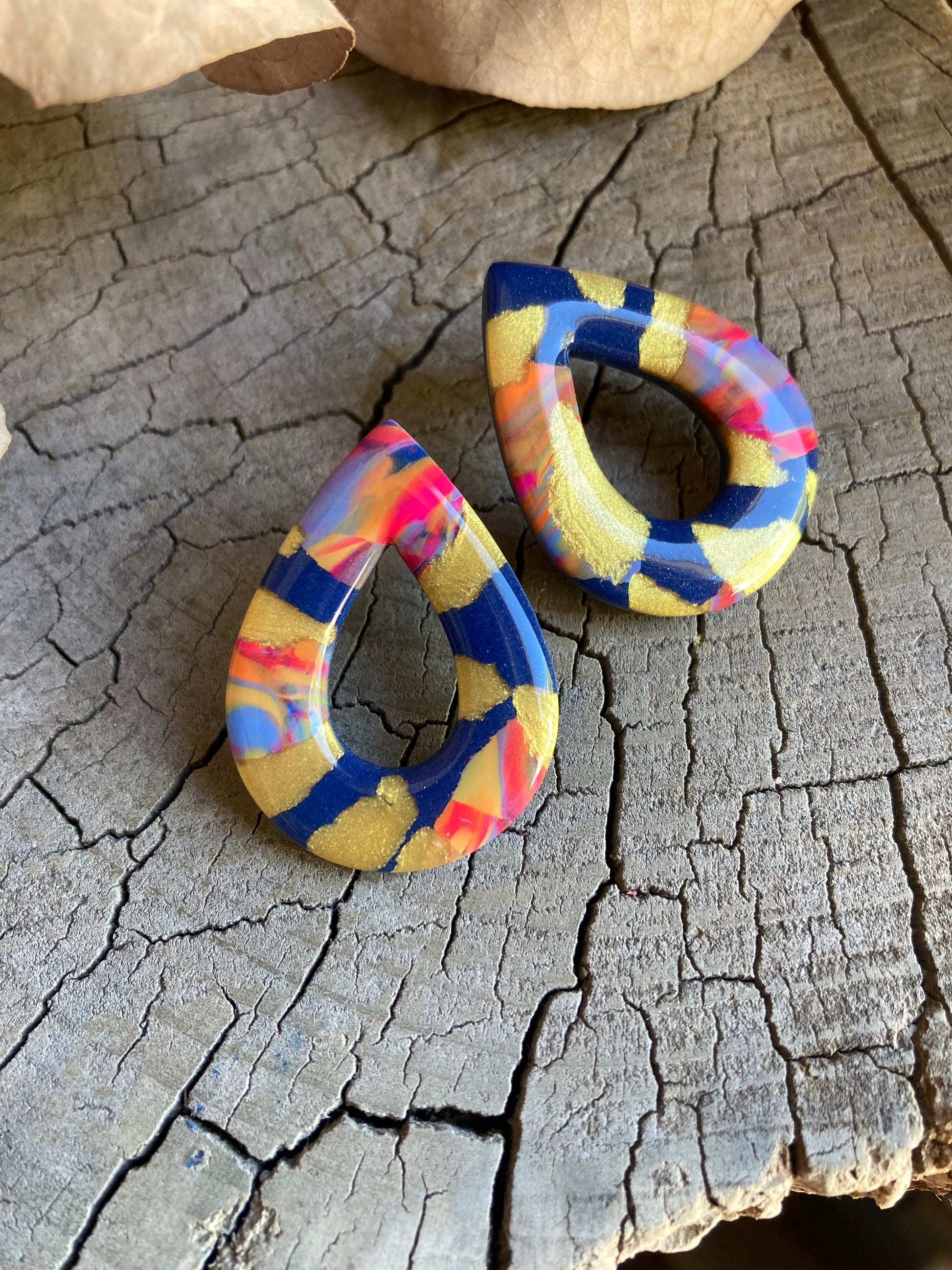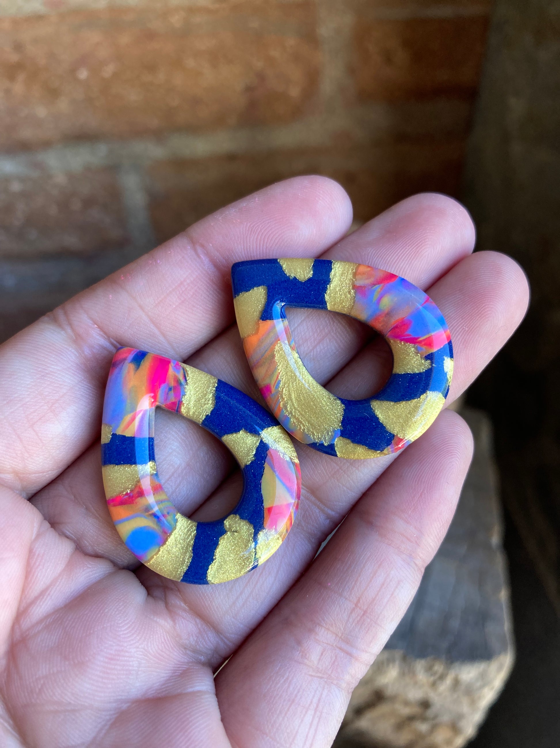 Aros de arcilla polimérica con top coat de resina uv. Miden 3,5 cms. Palito de acero quirúrgico y tope de goma.