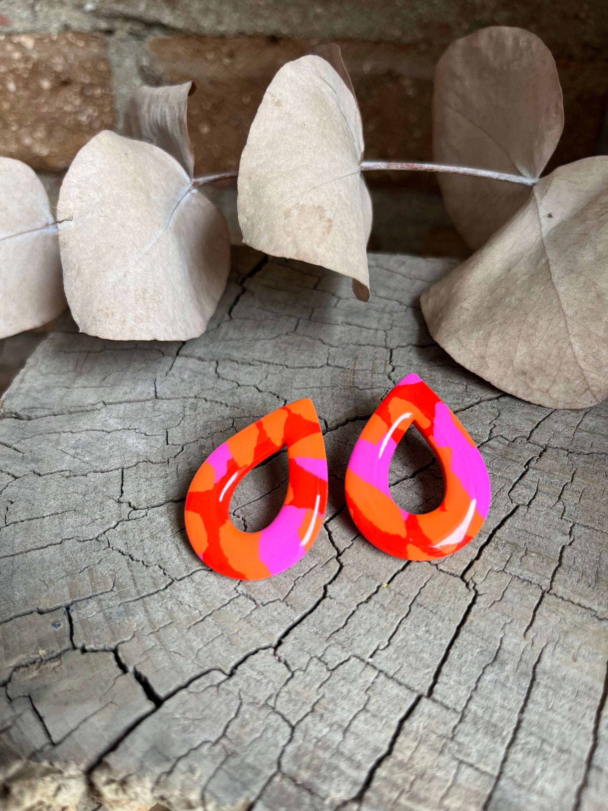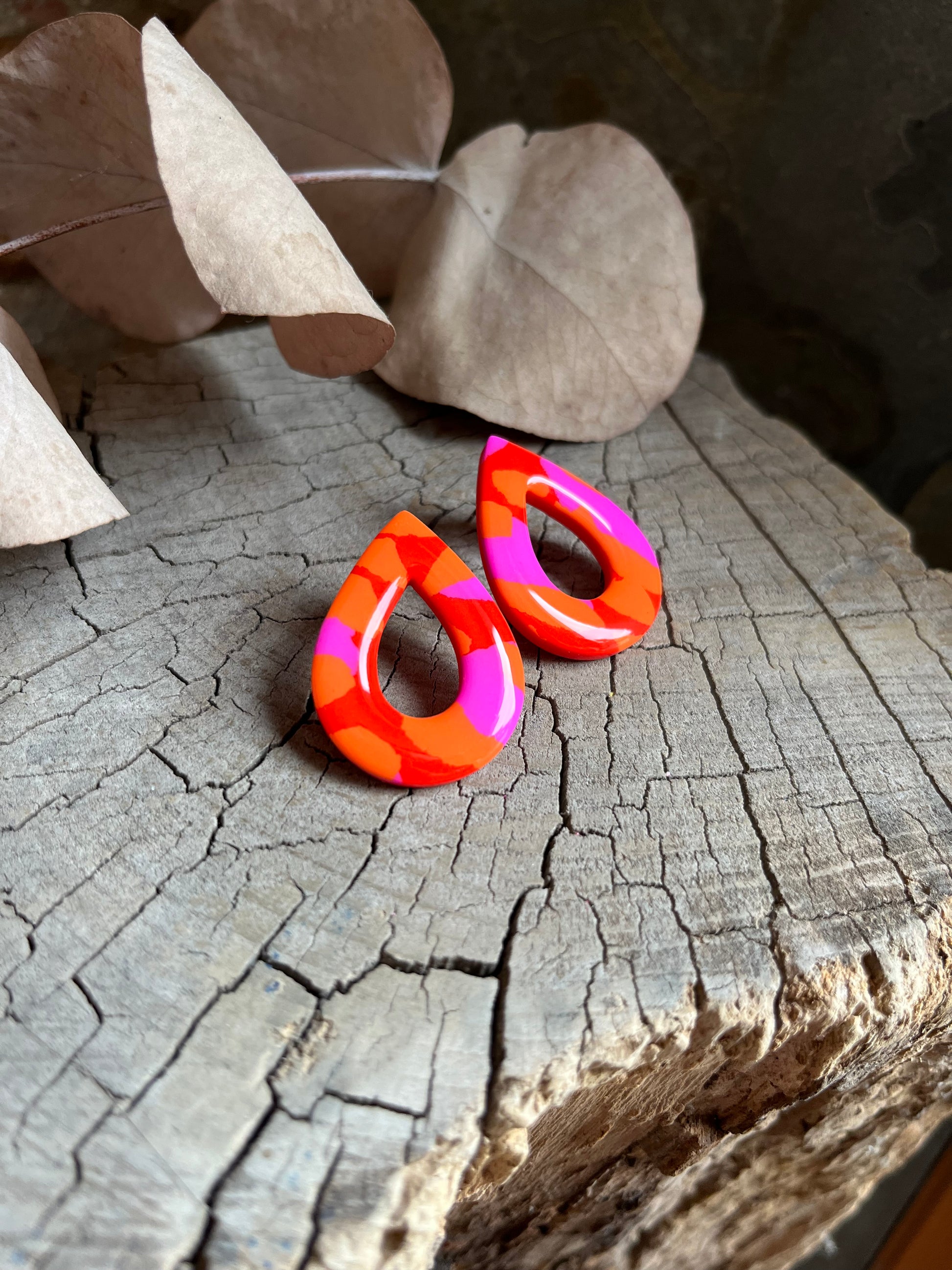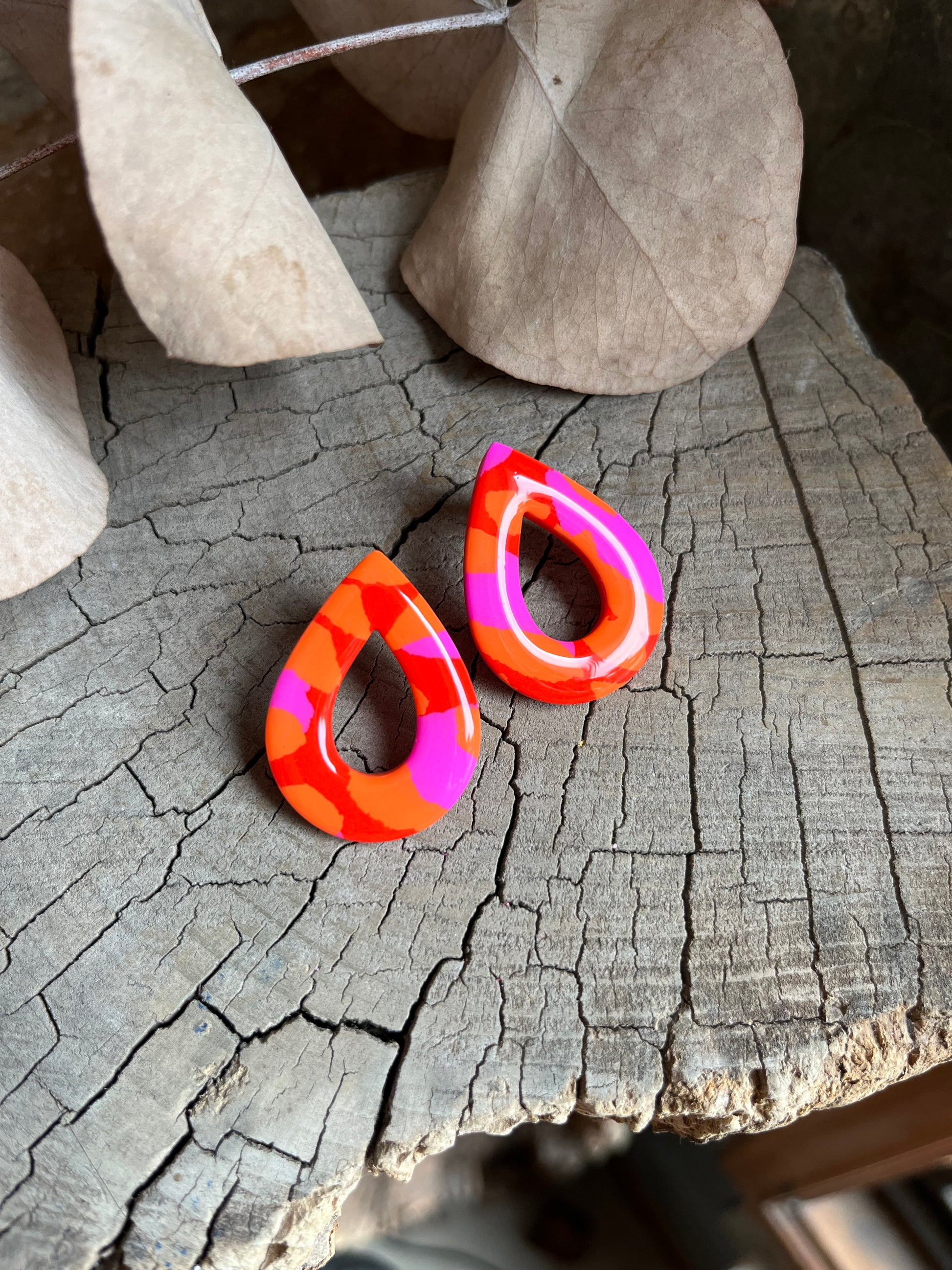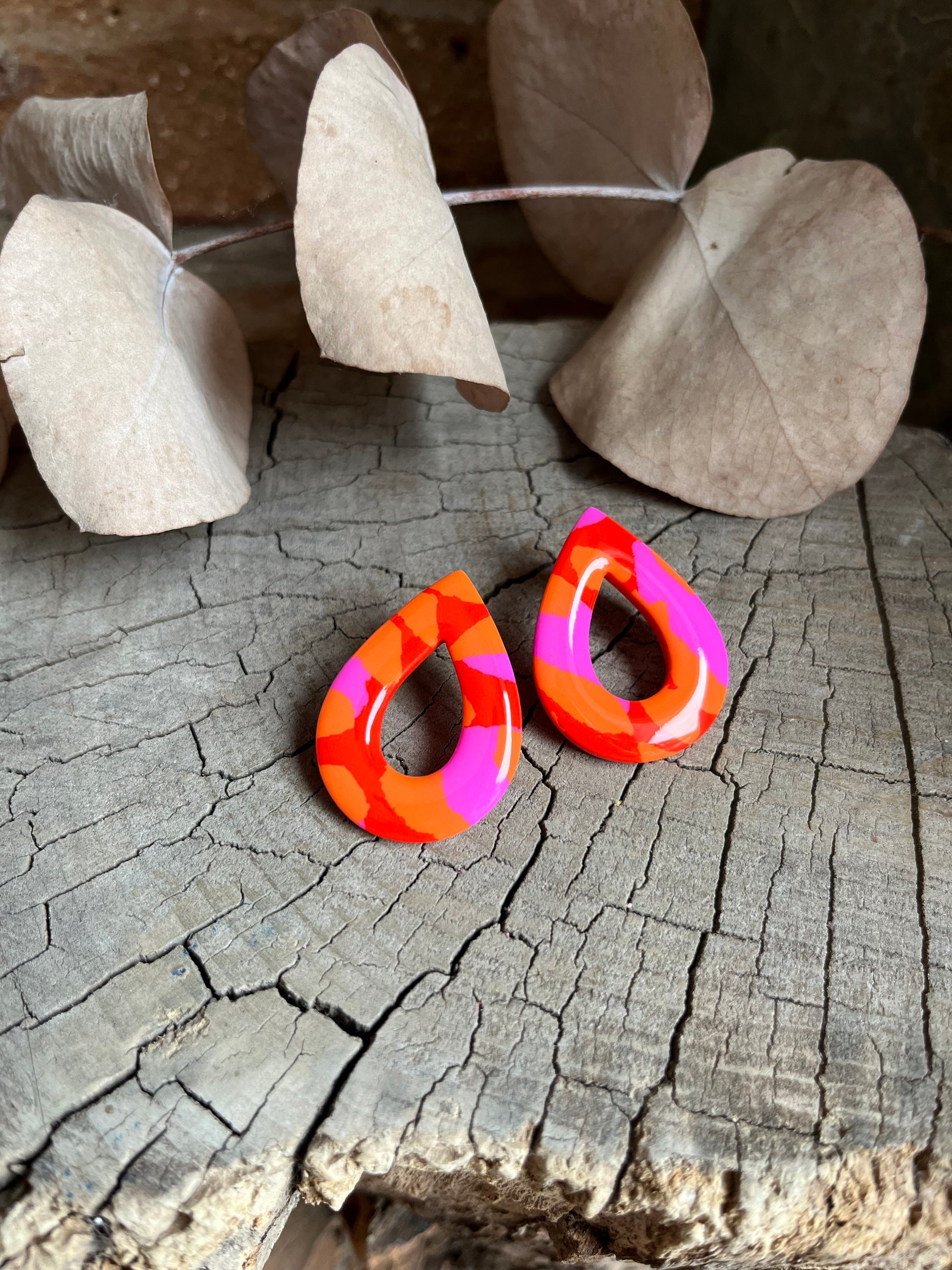 Aros de arcilla polimérica con top coat de resina uv. Miden 3,5 cms. Palito de acero quirúrgico y tope de goma.