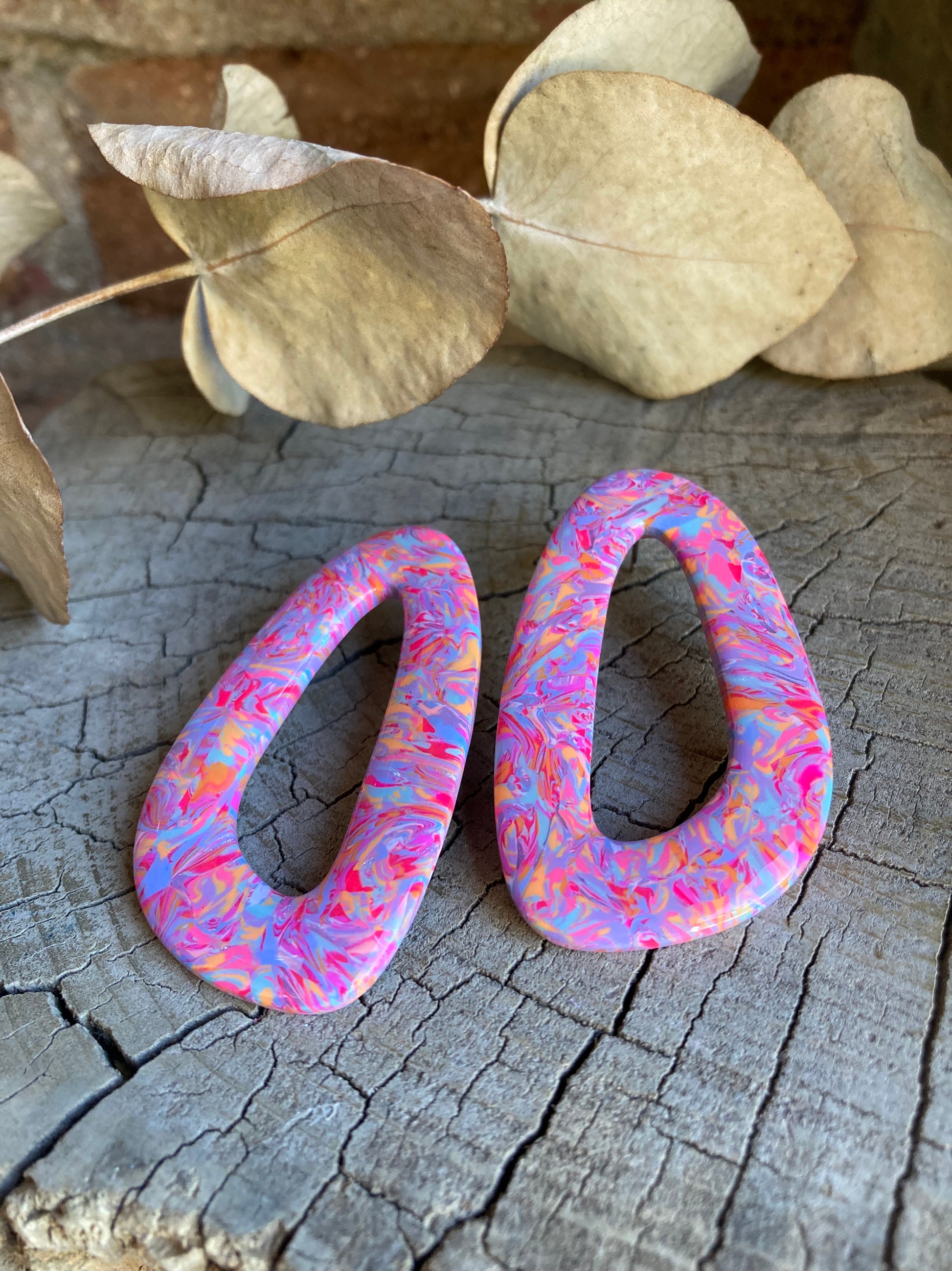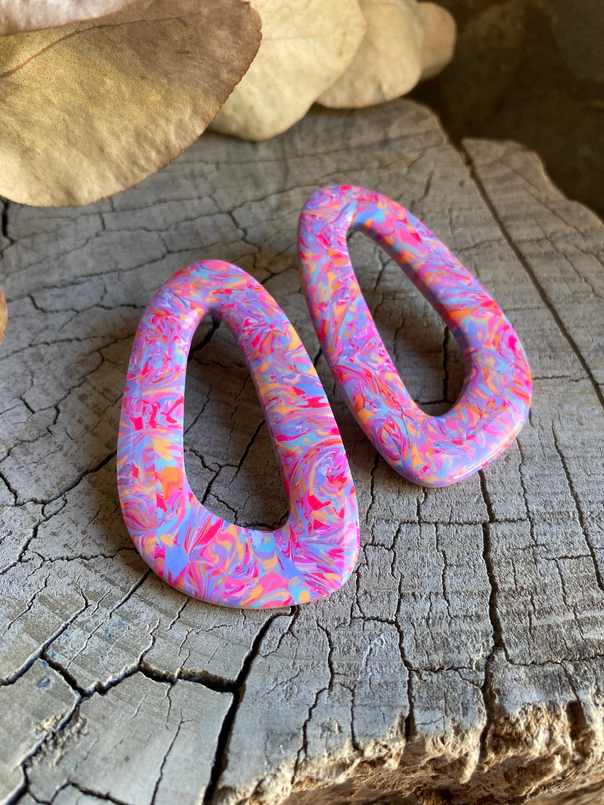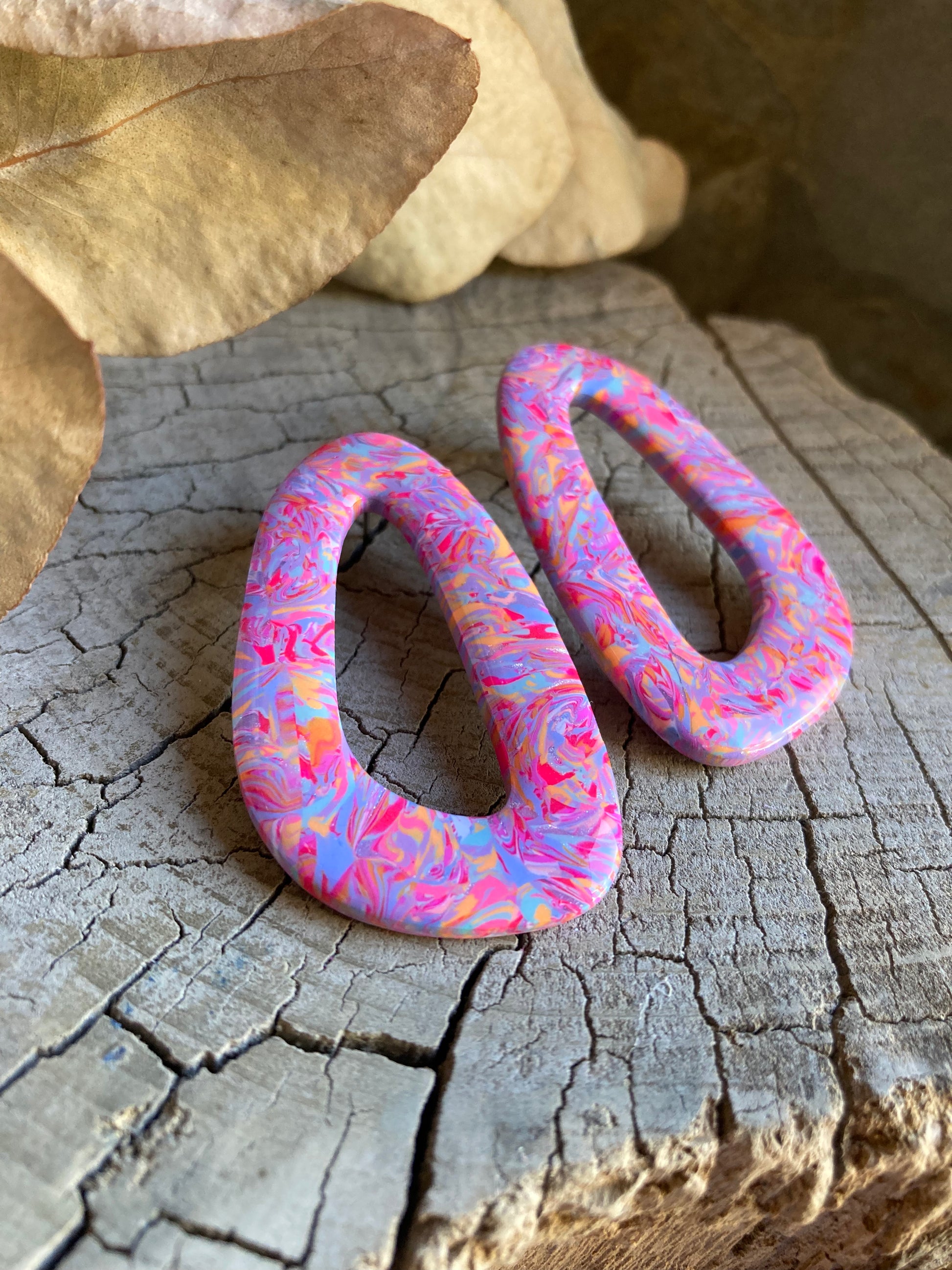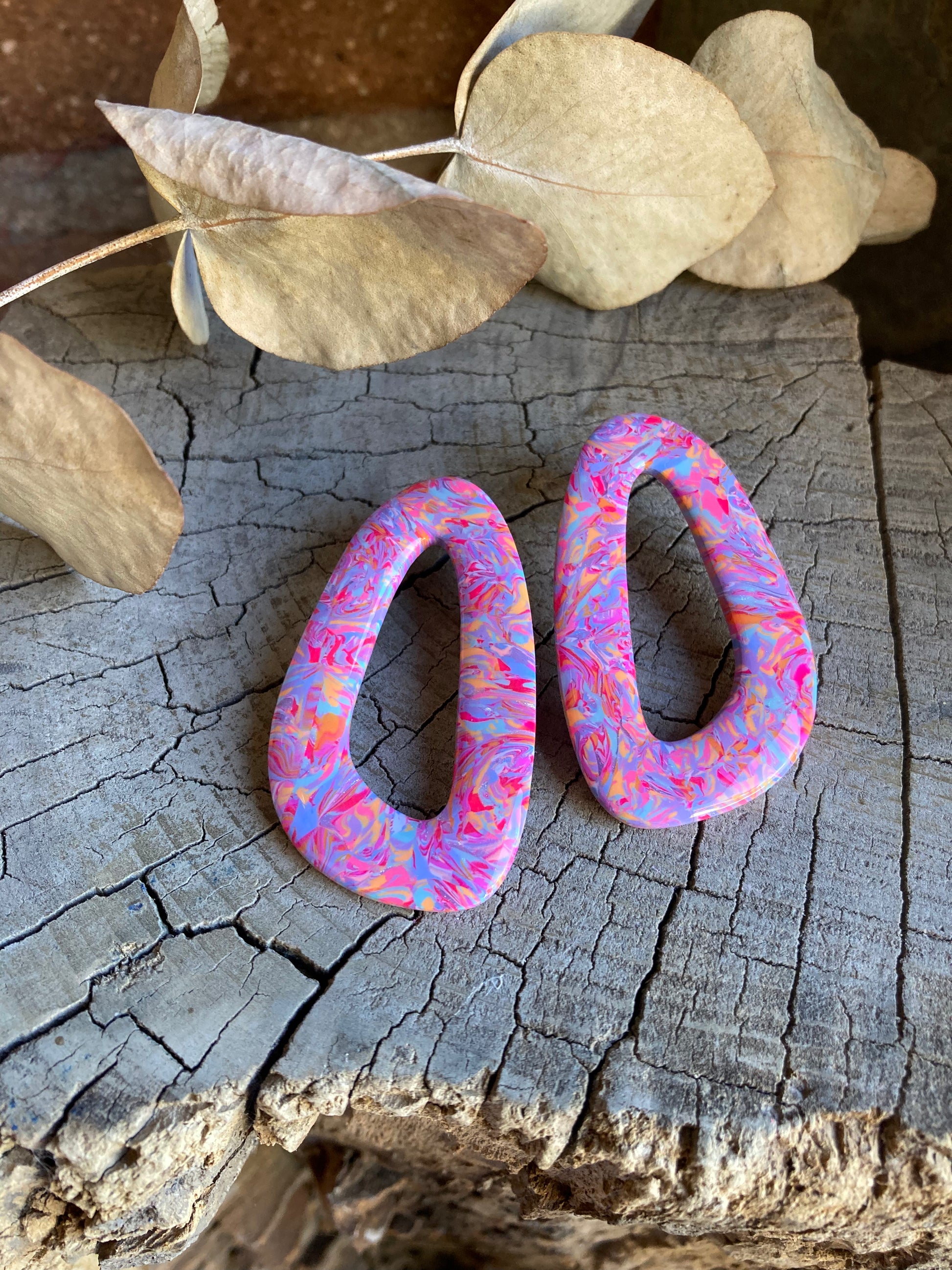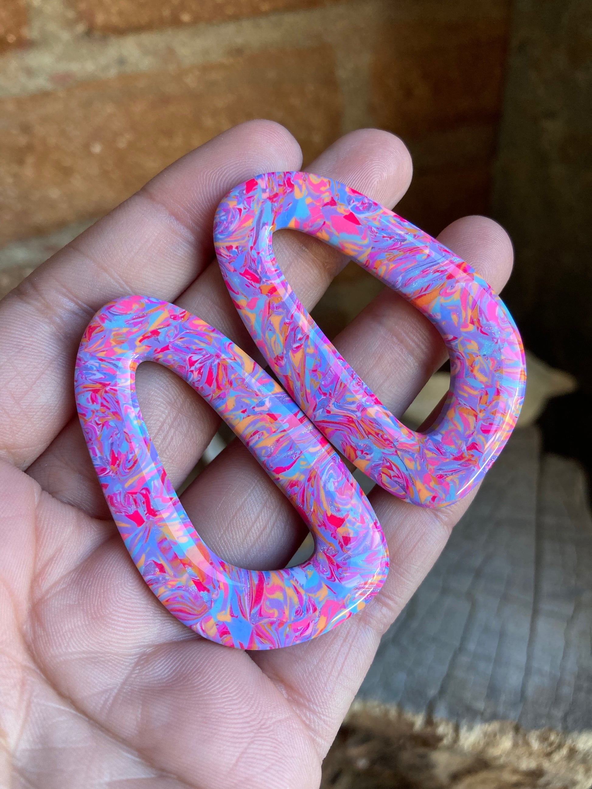 Aros de arcilla polimérica con top coat de resina uv. Miden 5,5 cms. Palito de acero quirúrgico y tope de goma.