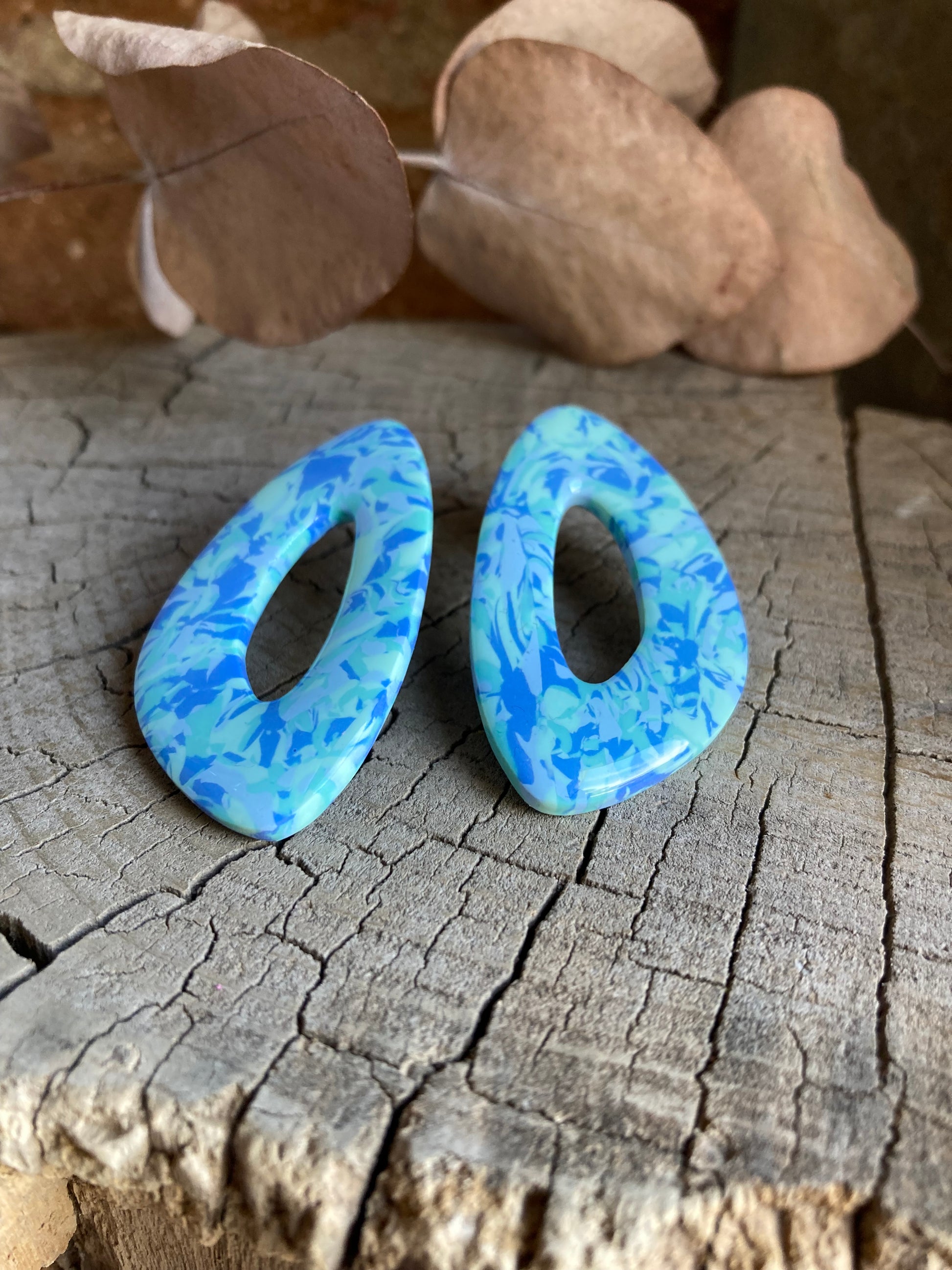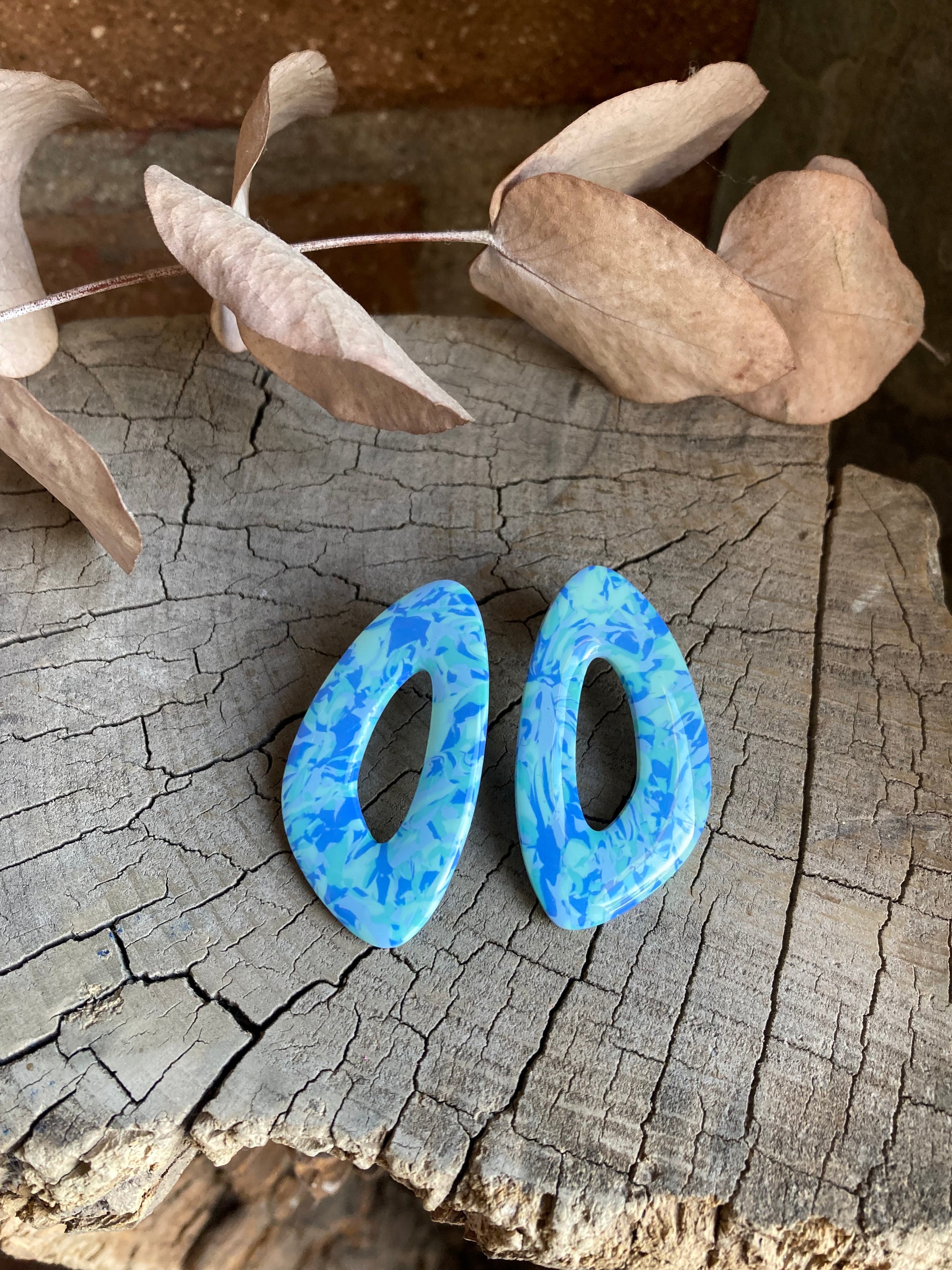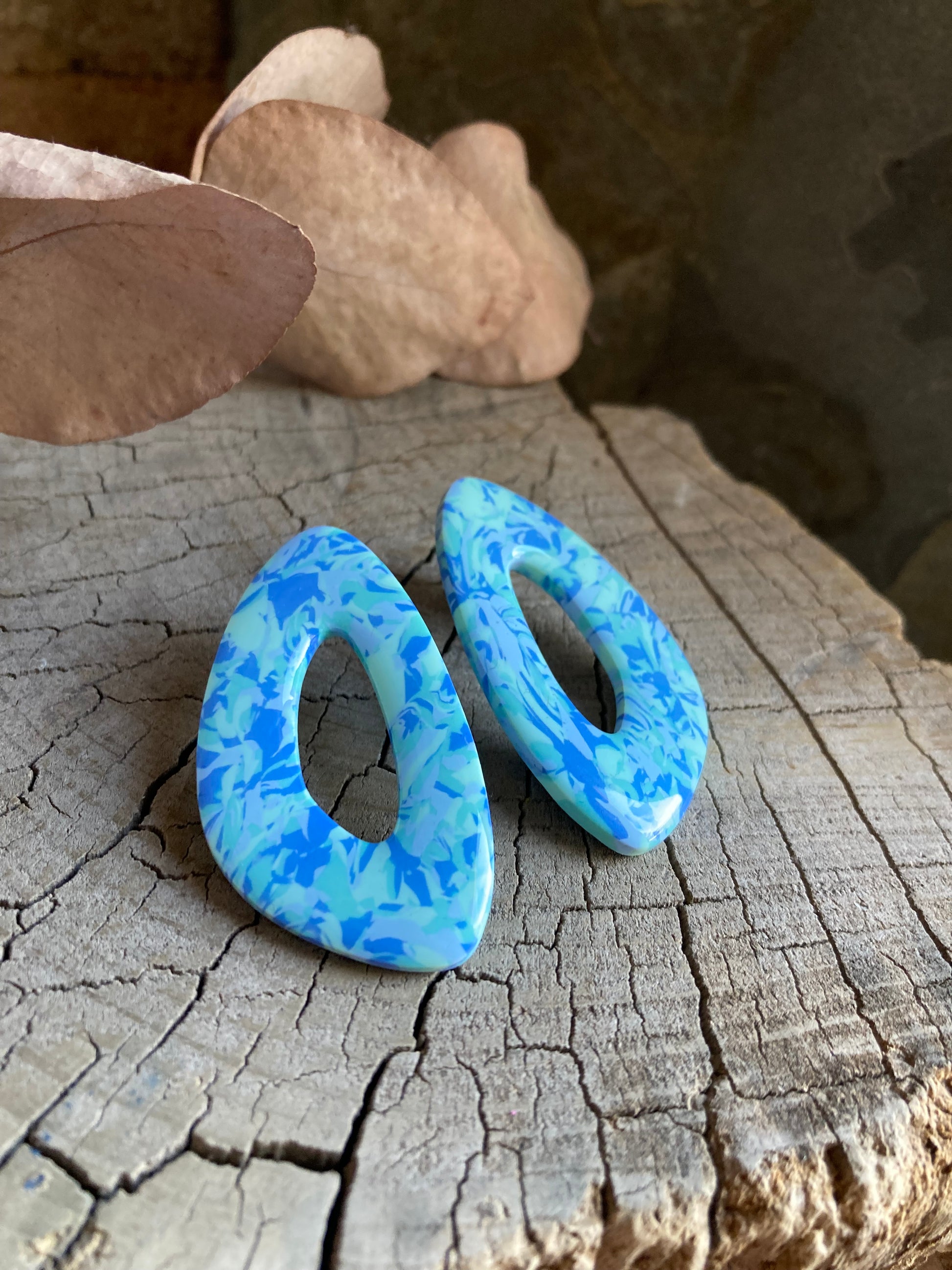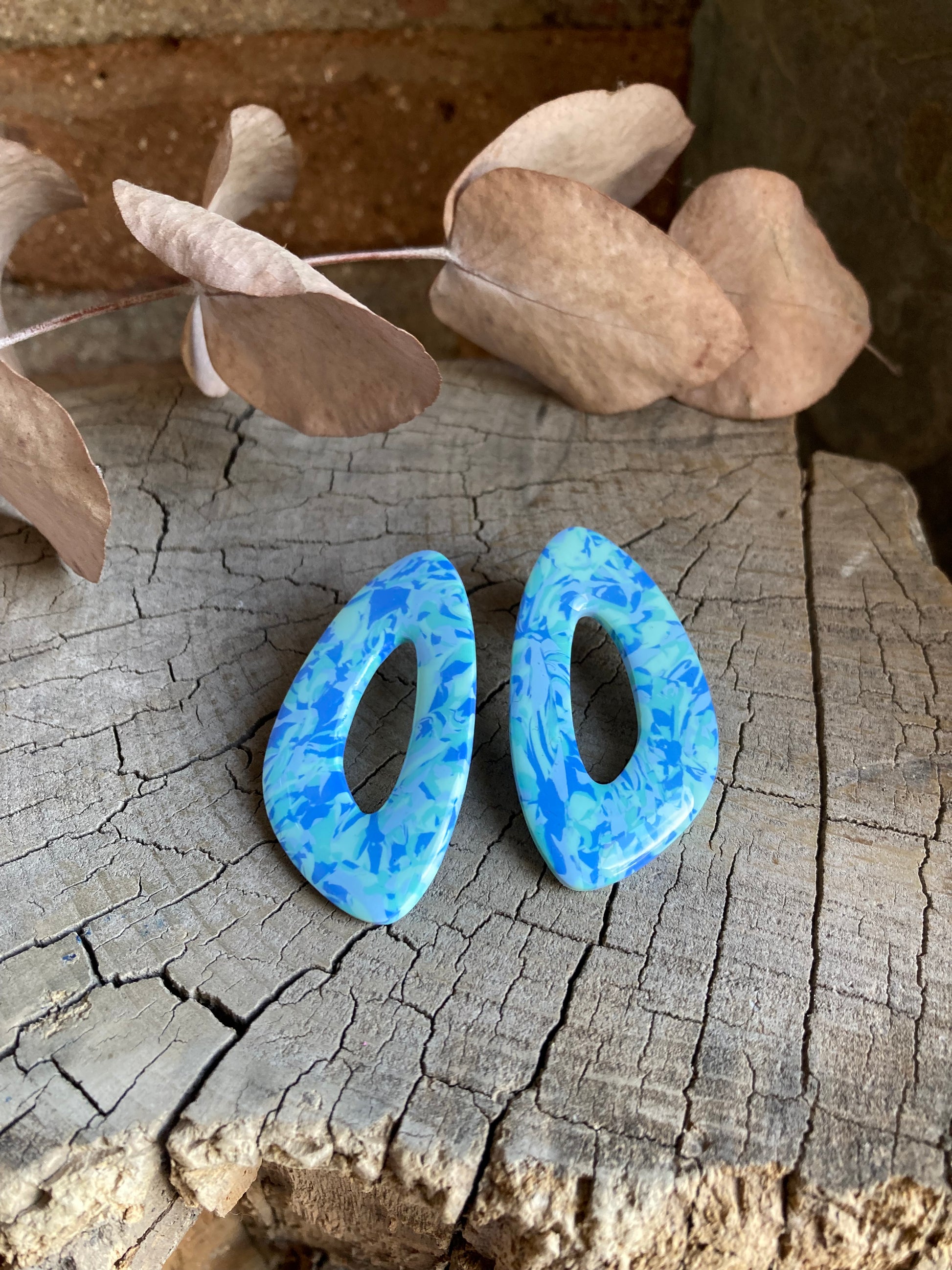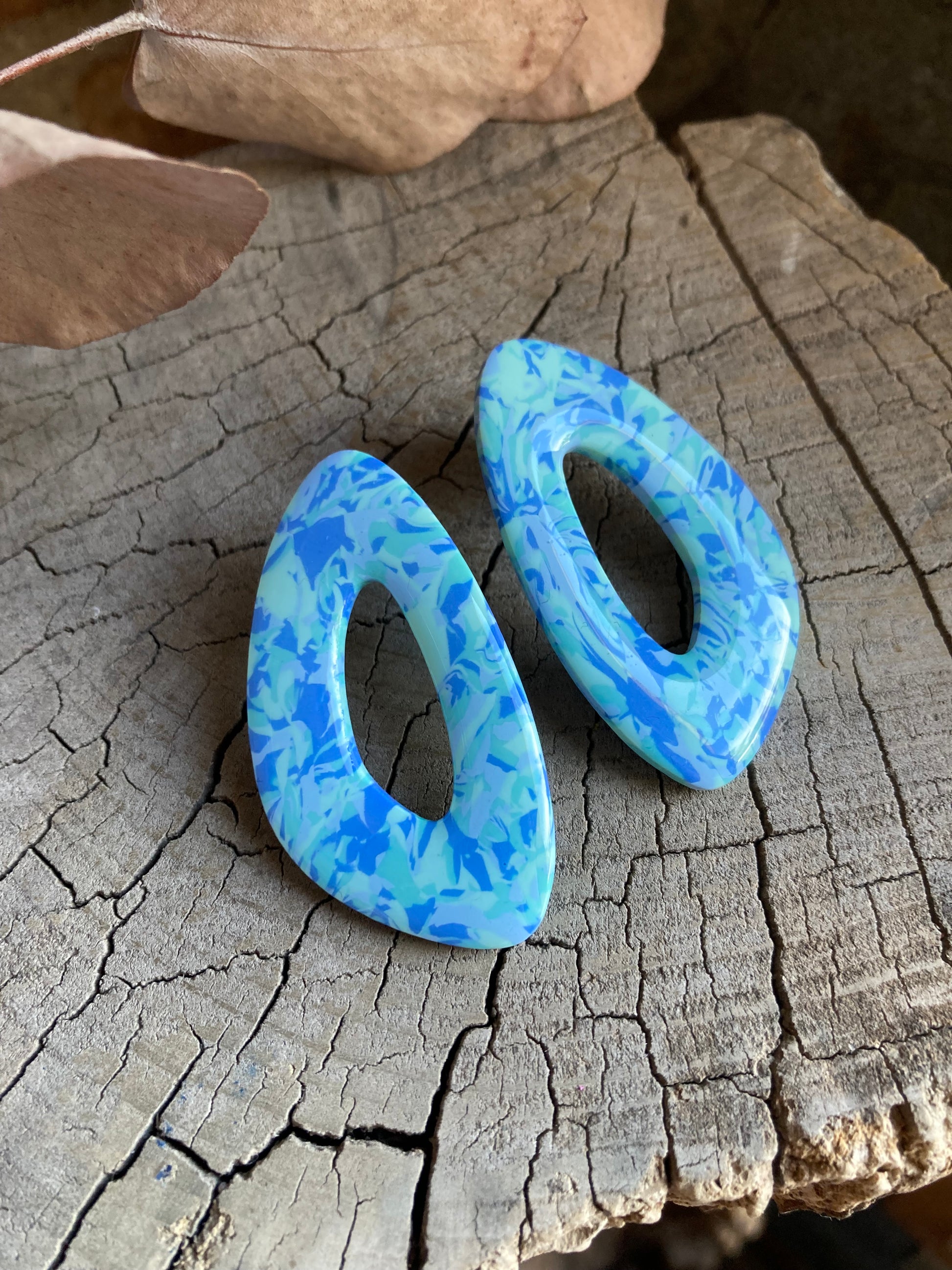 Aros de arcilla polimérica con top coat de resina uv. Miden 5 cms. Palito de acero quirúrgico y tope de goma.