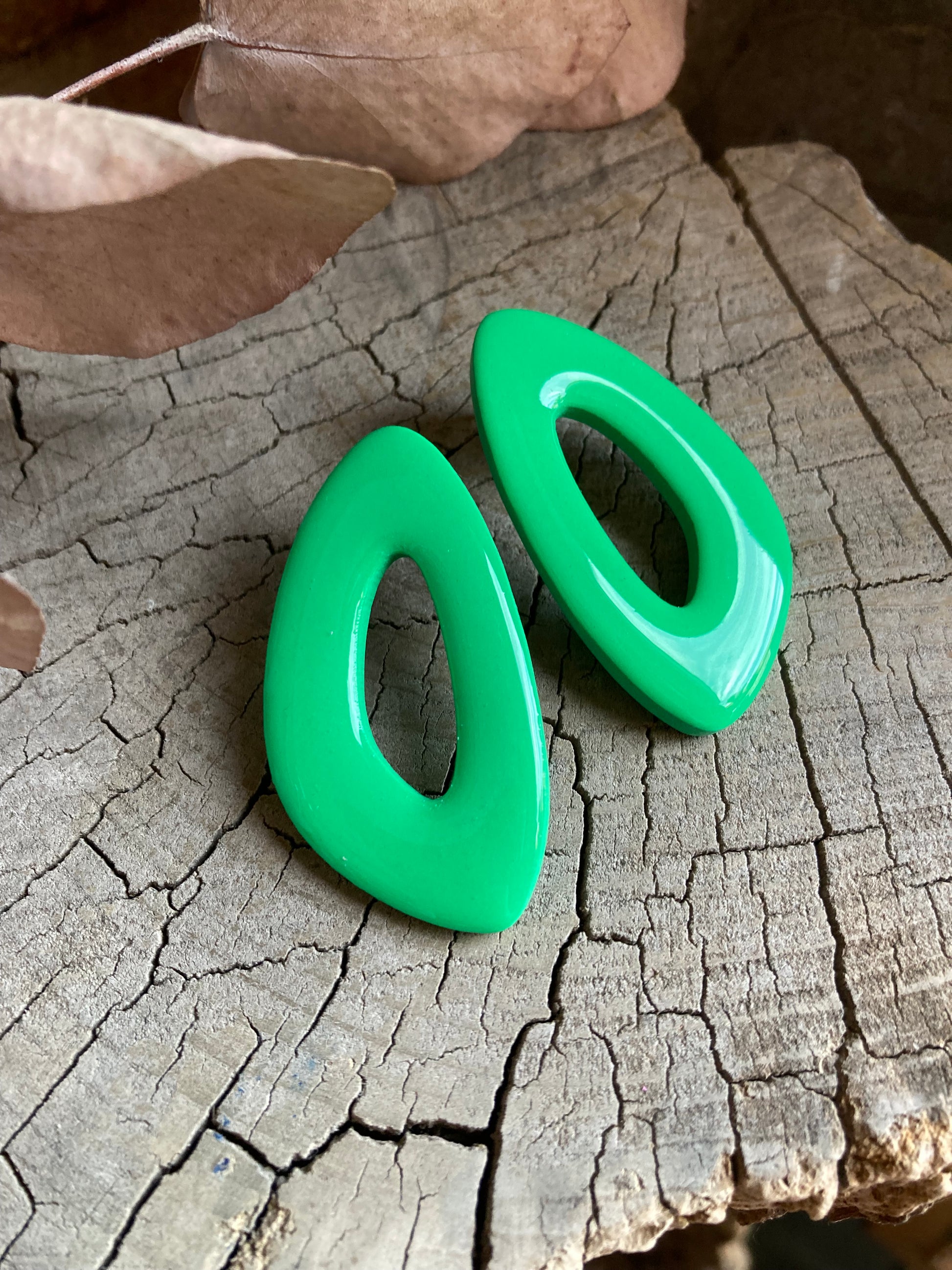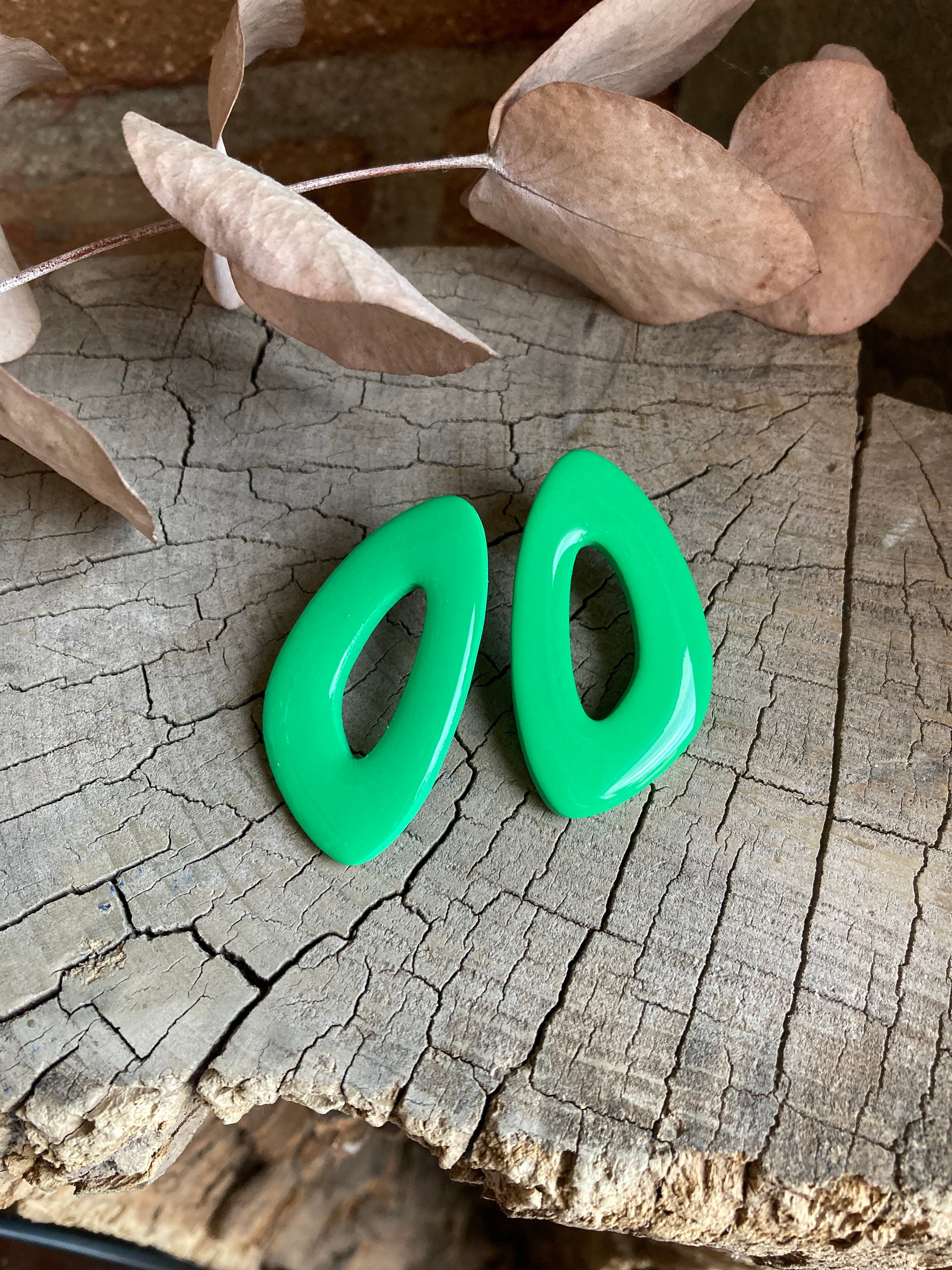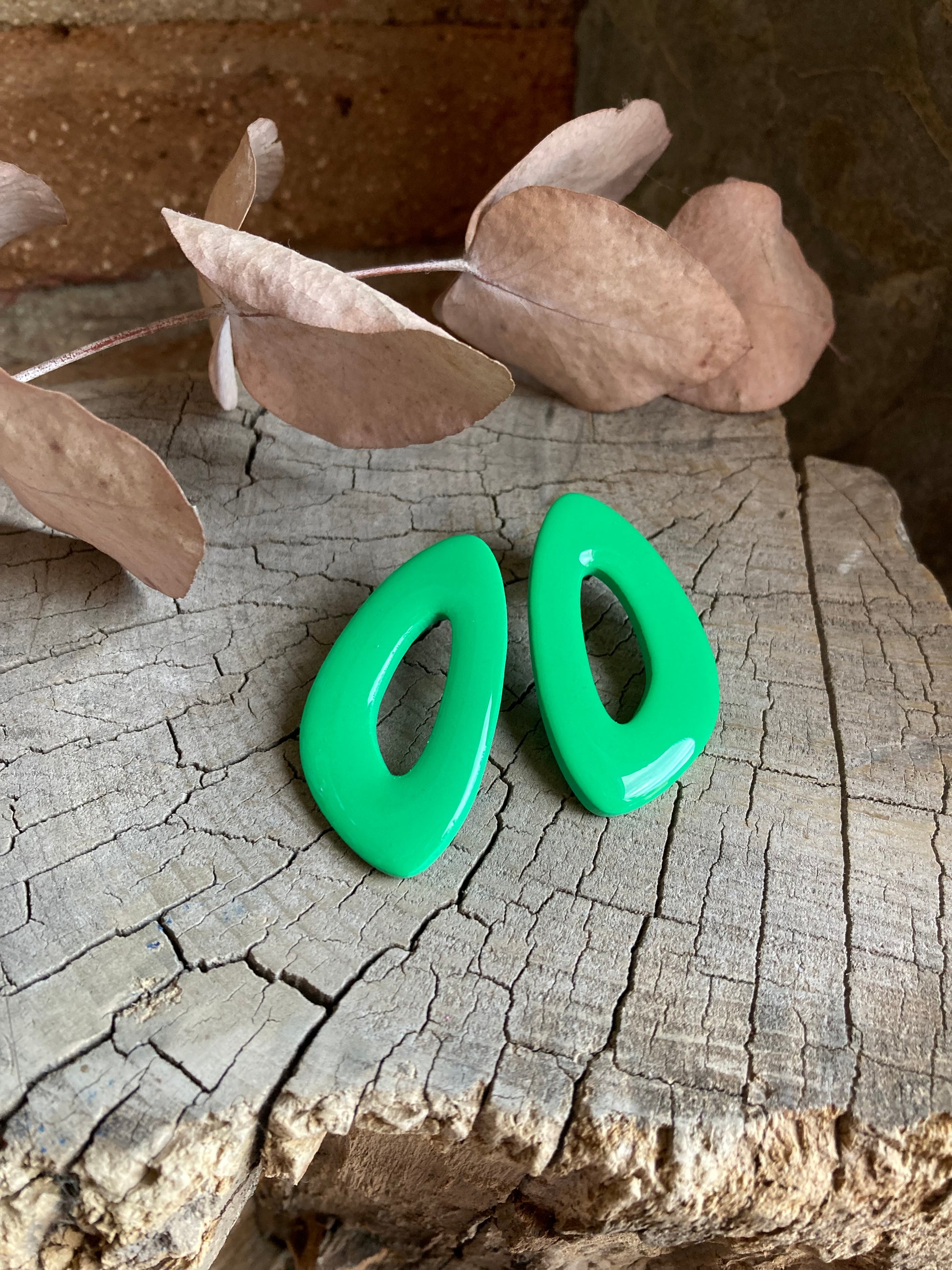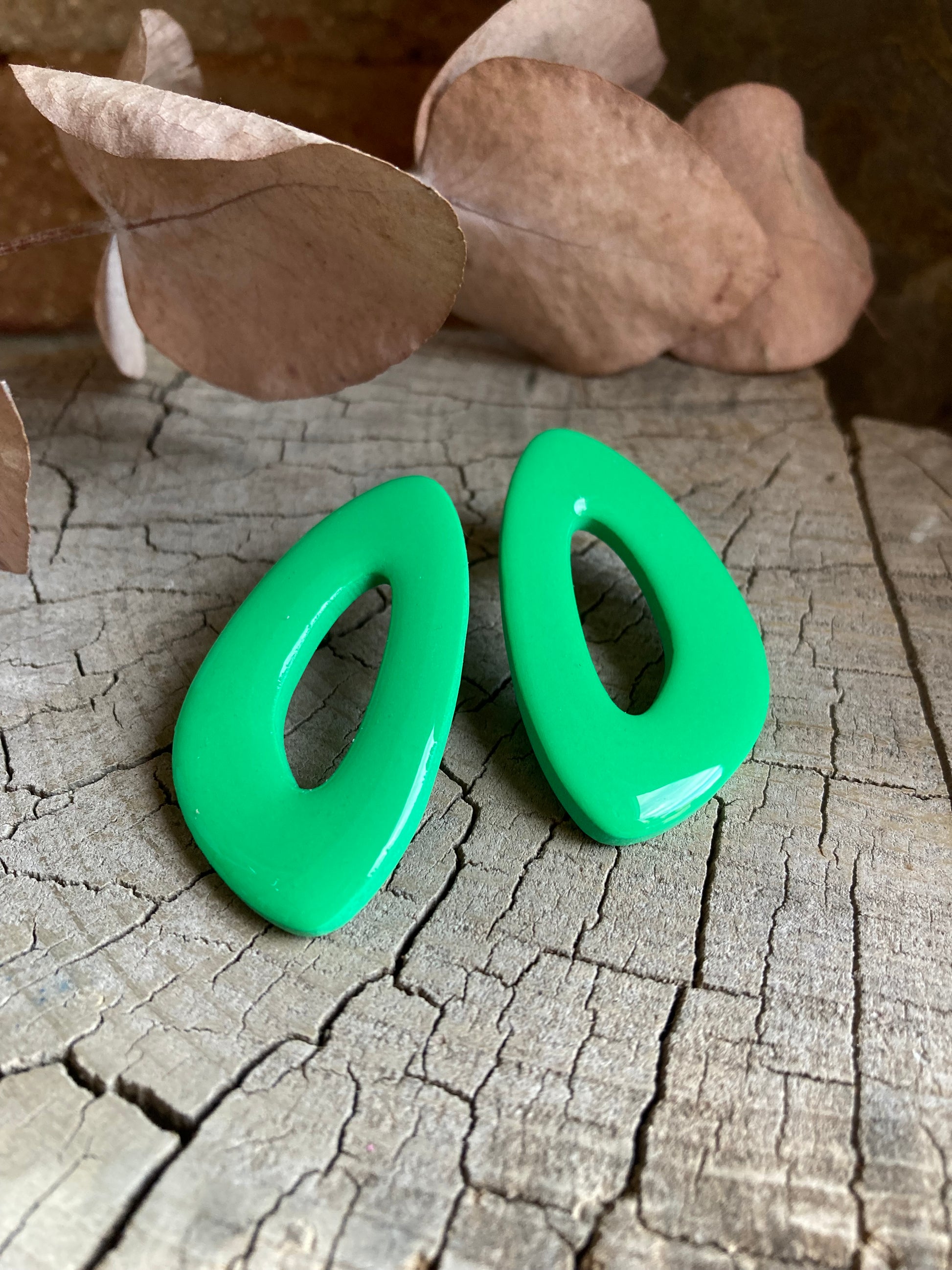 Aros de arcilla polimérica con top coat de resina uv. Miden 5 cms. Palito de acero quirúrgico y tope de goma.