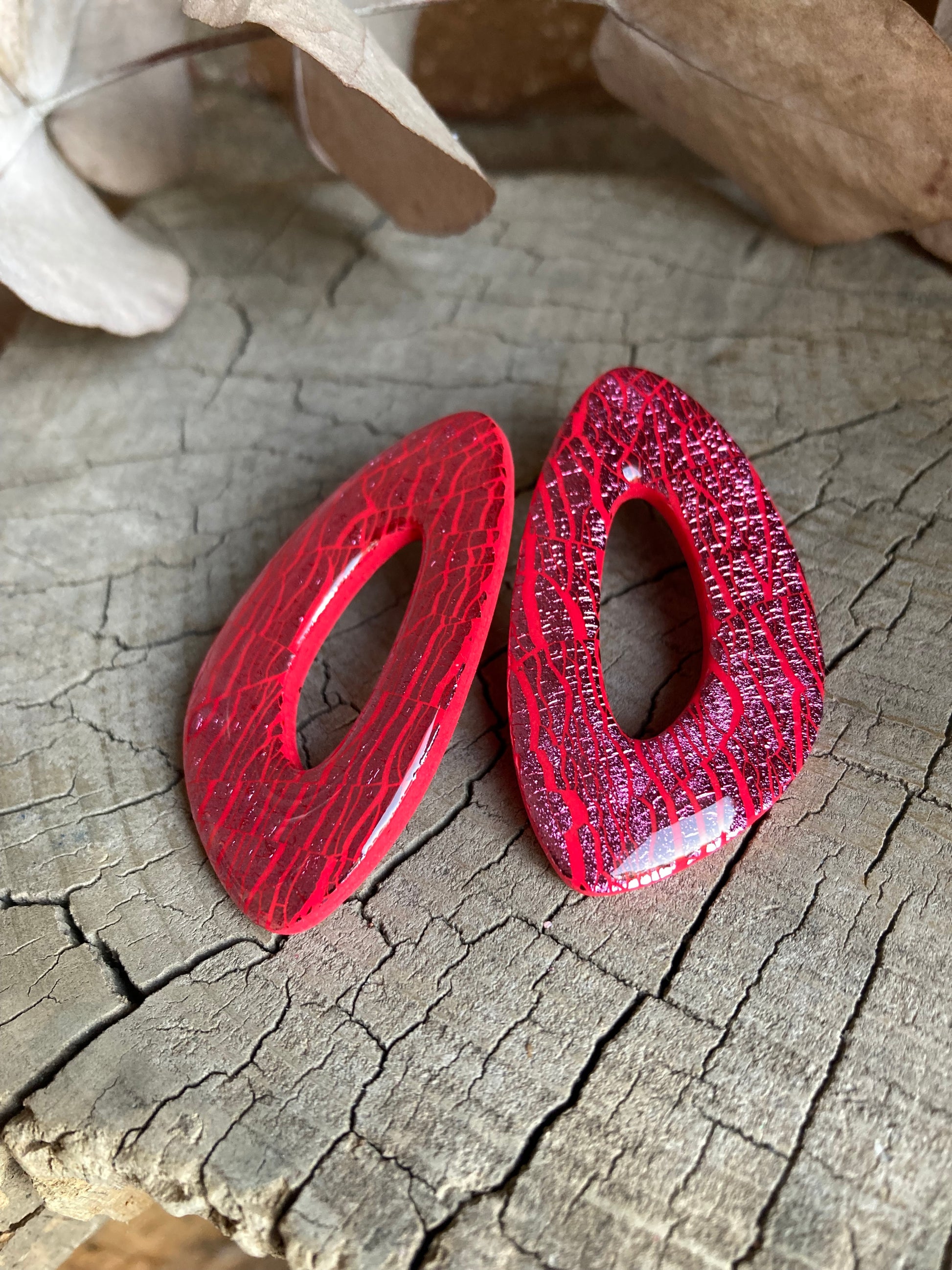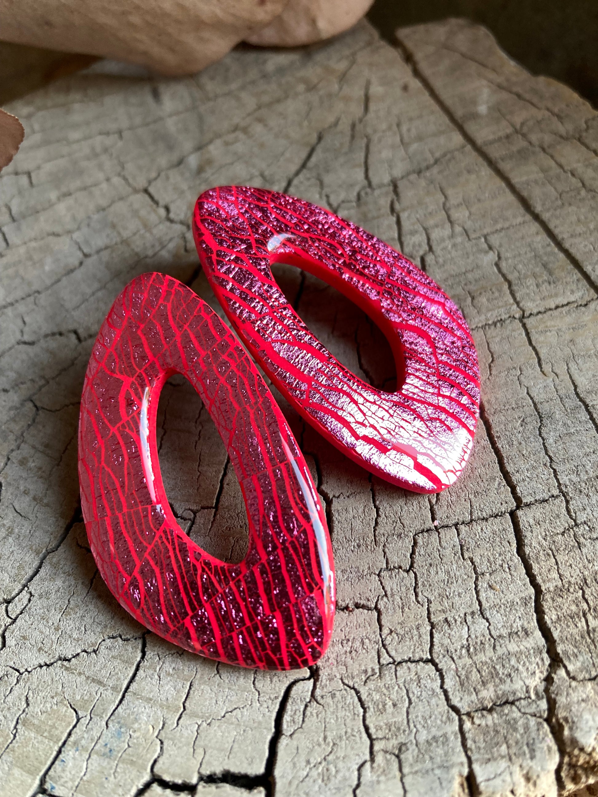 Aros de arcilla polimérica con top coat de resina uv. Miden 5 cms. Palito de acero quirúrgico y tope de goma.