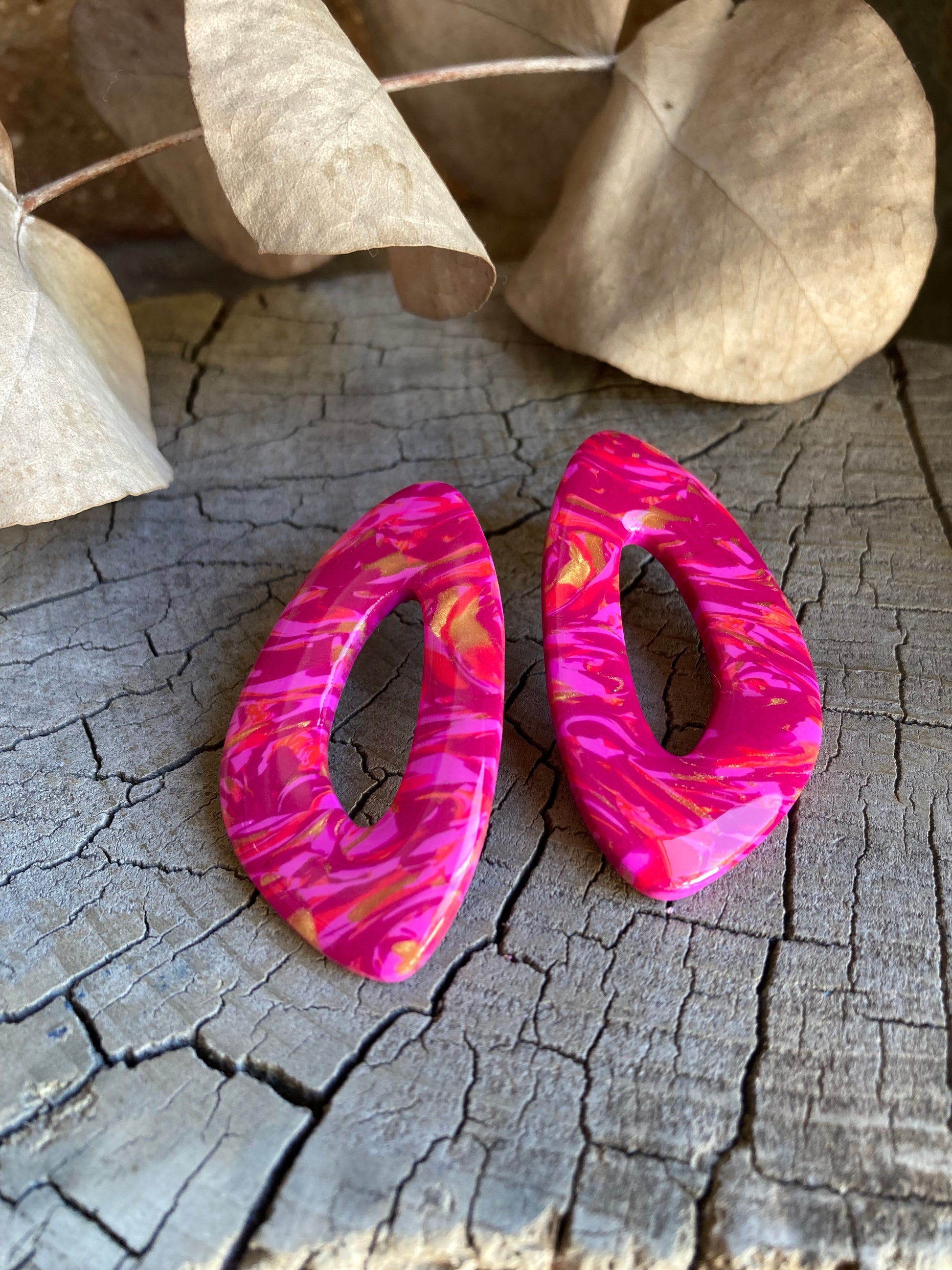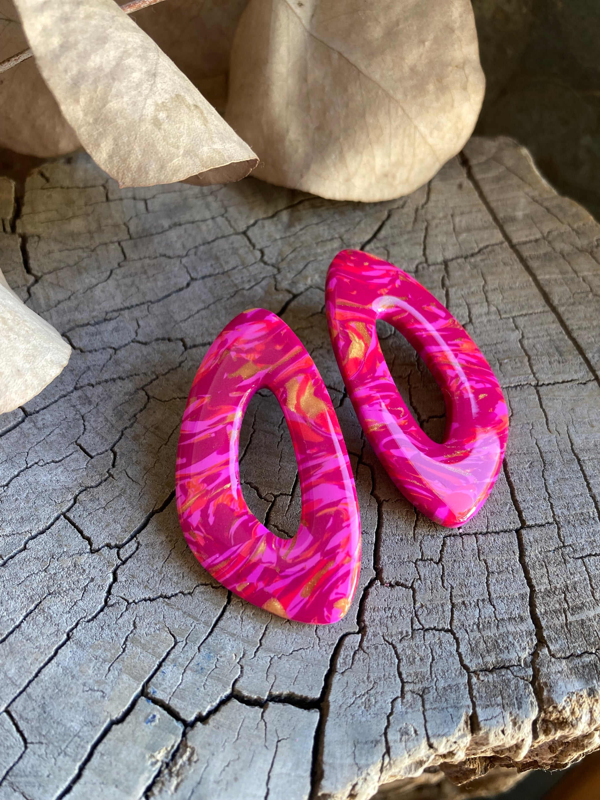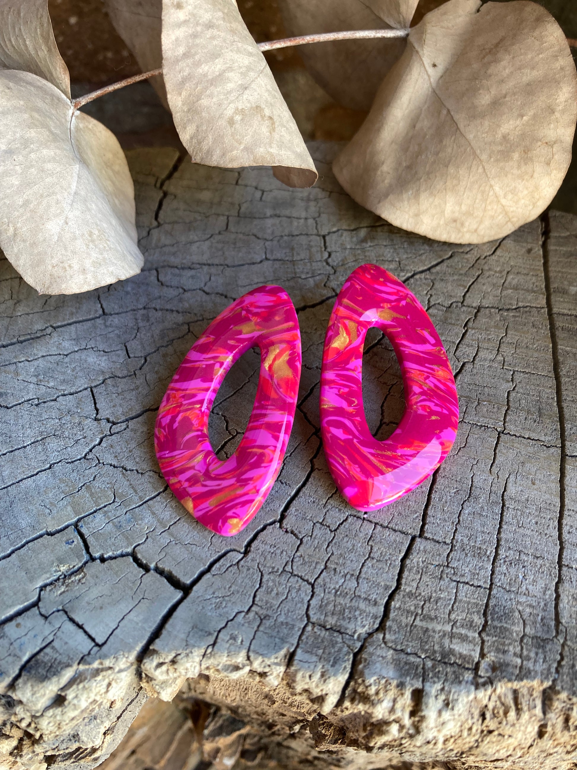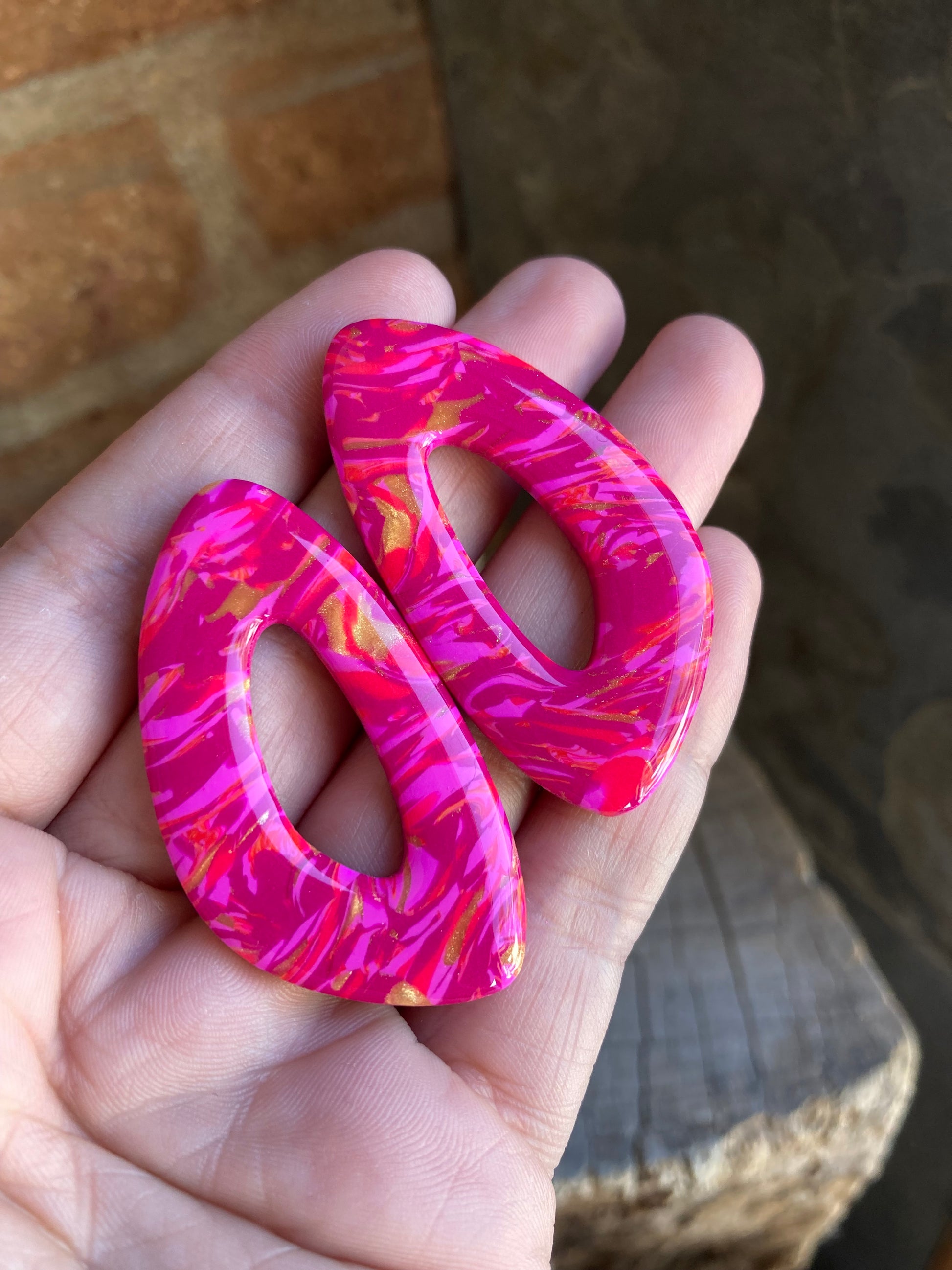 Aros de arcilla polimérica con top coat de resina uv. Miden 5 cms. Palito de acero quirúrgico y tope de goma.