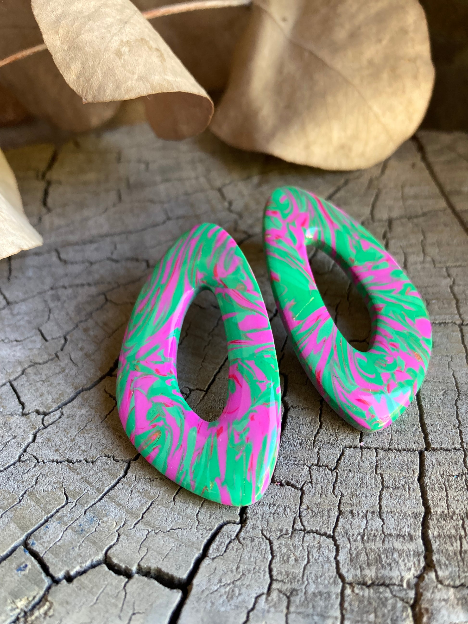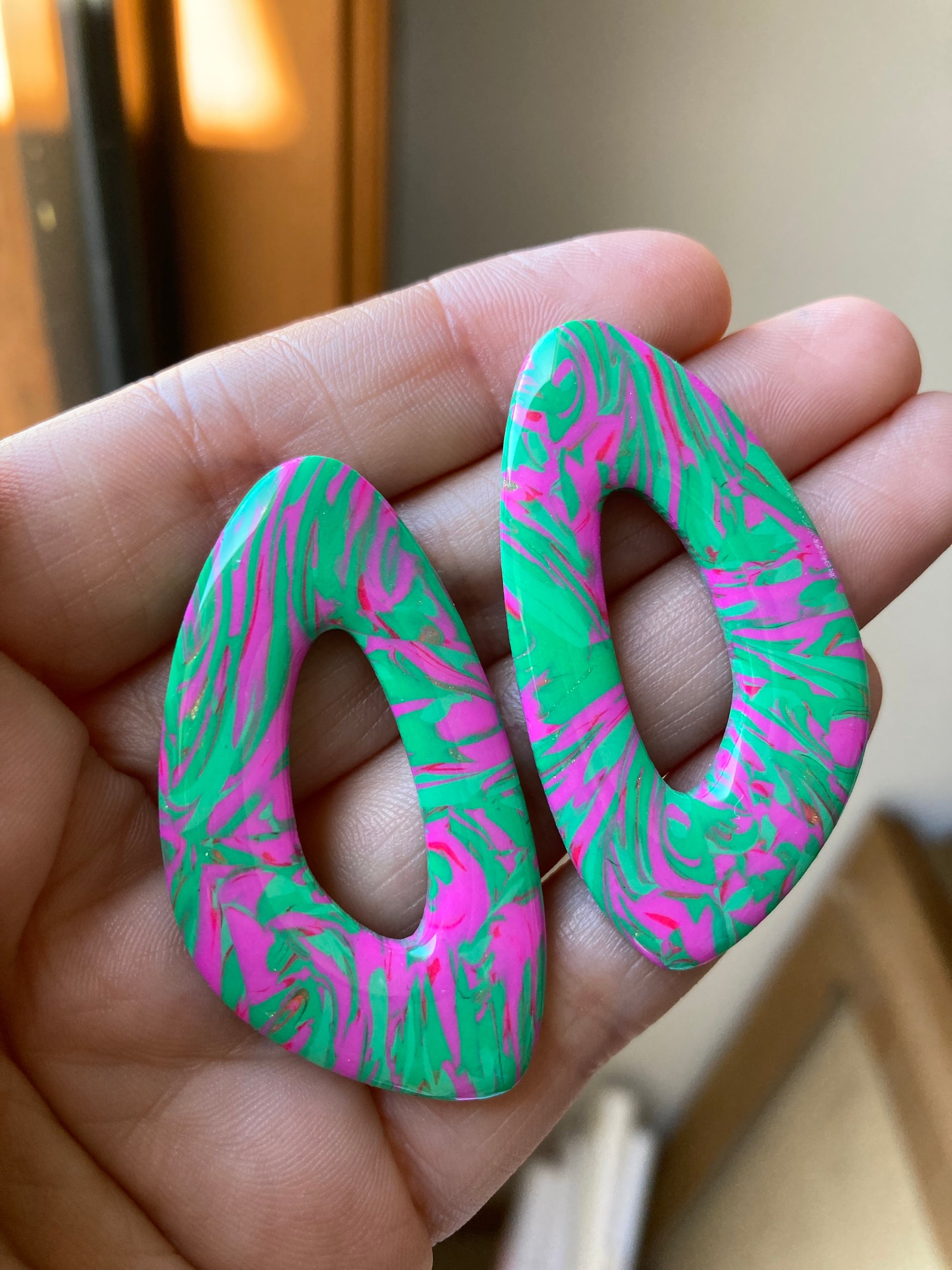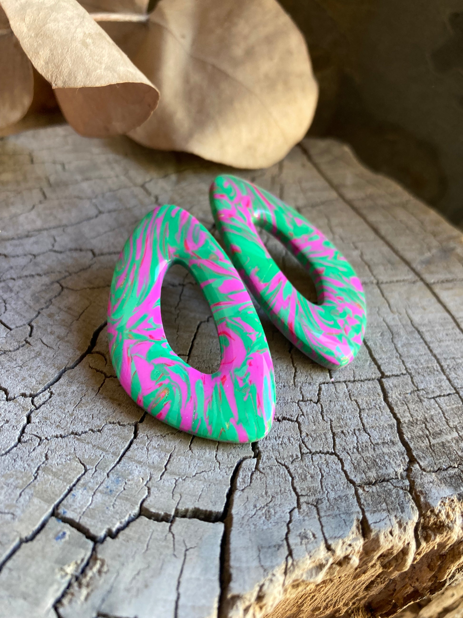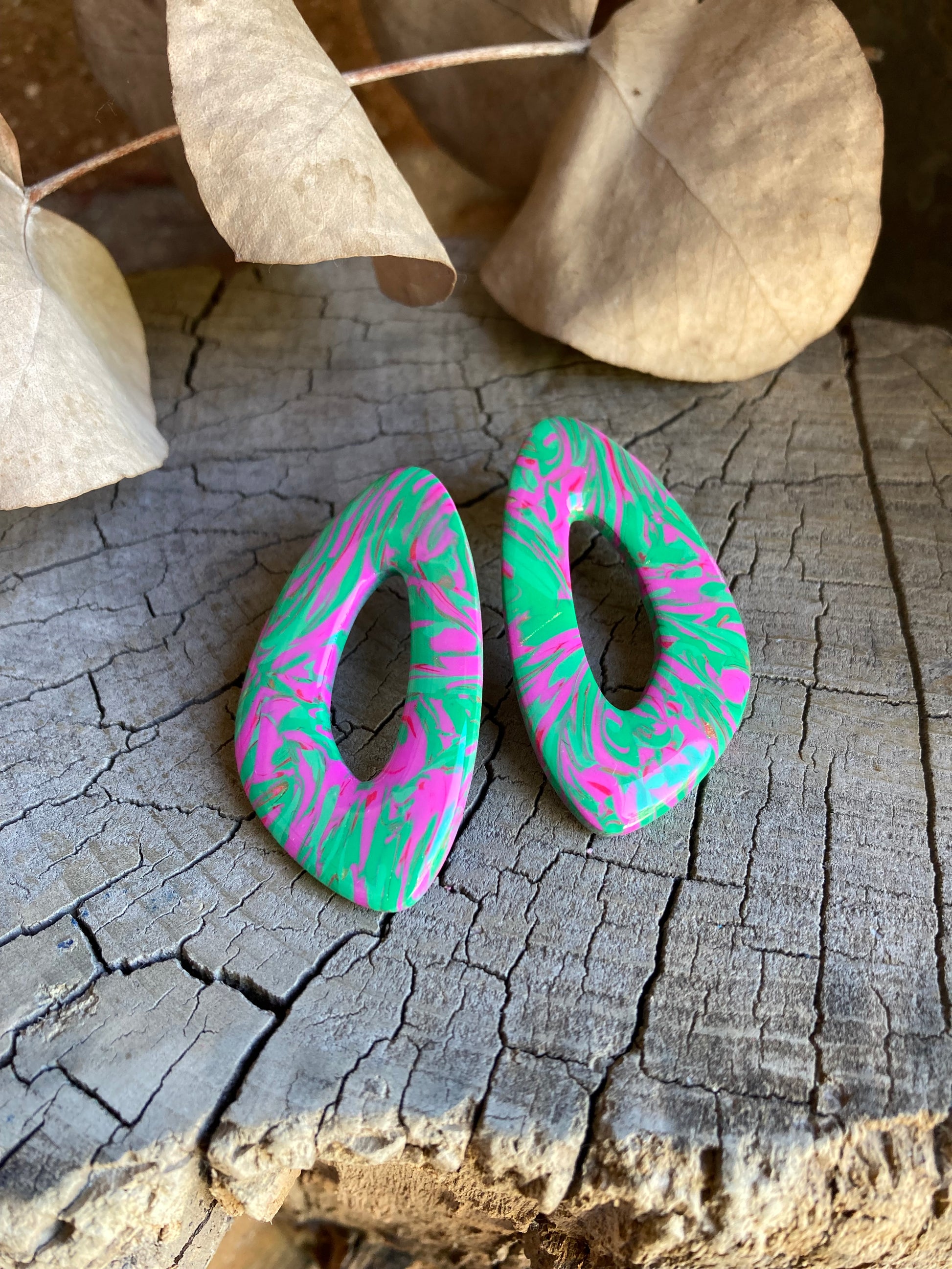 Aros de arcilla polimérica con top coat de resina uv. Miden 5 cms. Palito de acero quirúrgico y tope de goma.