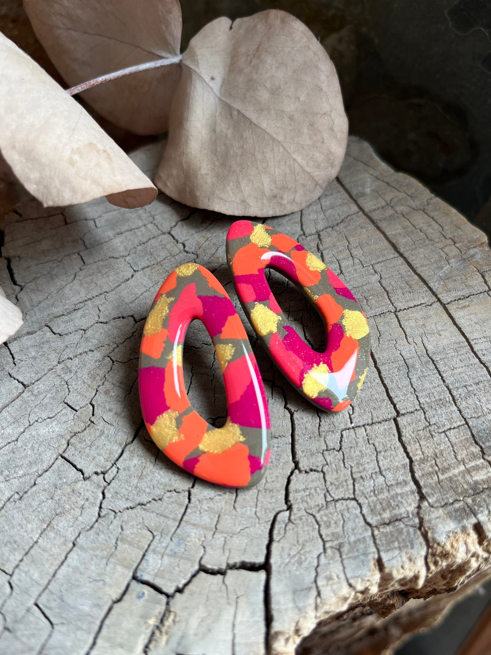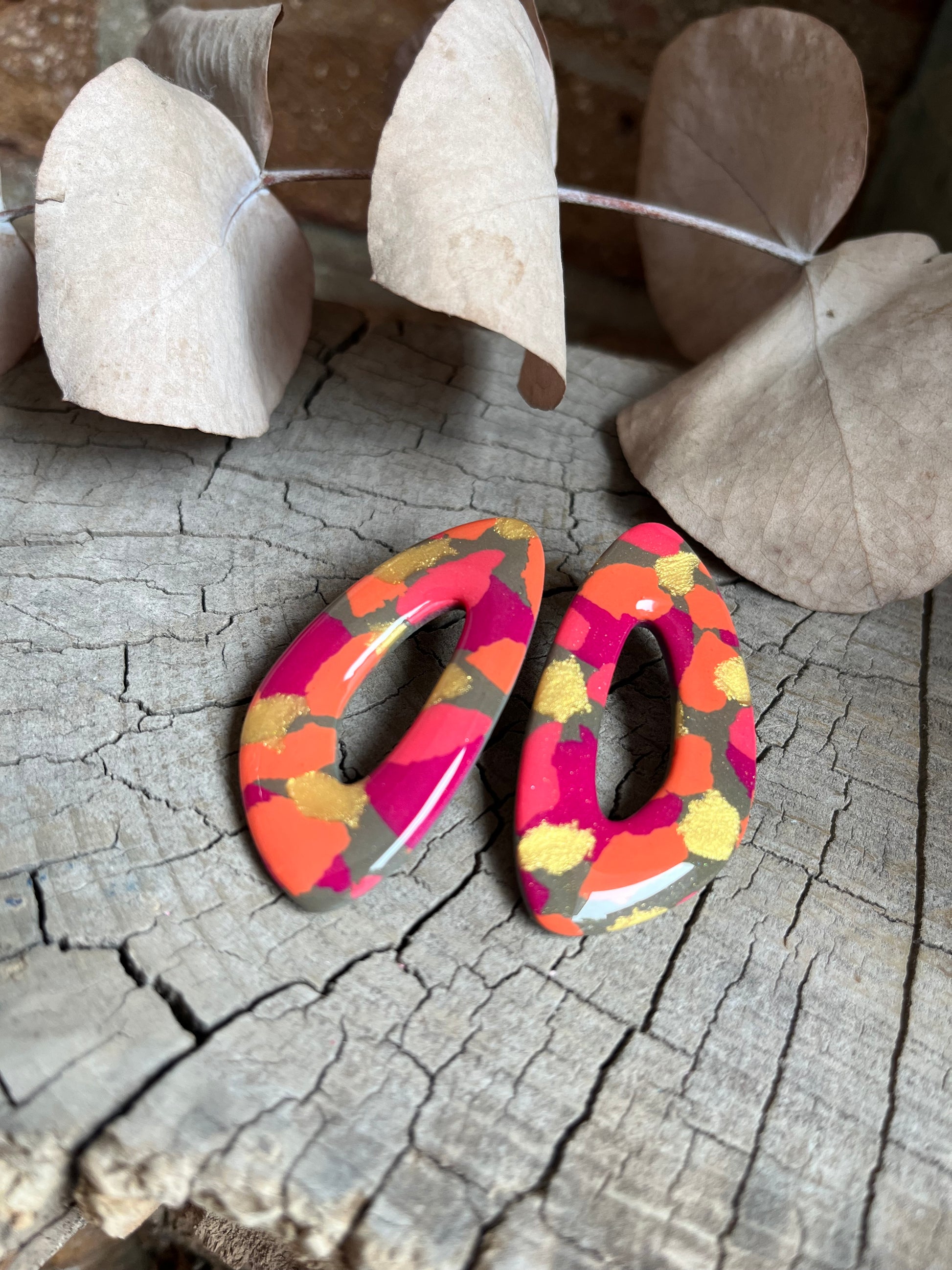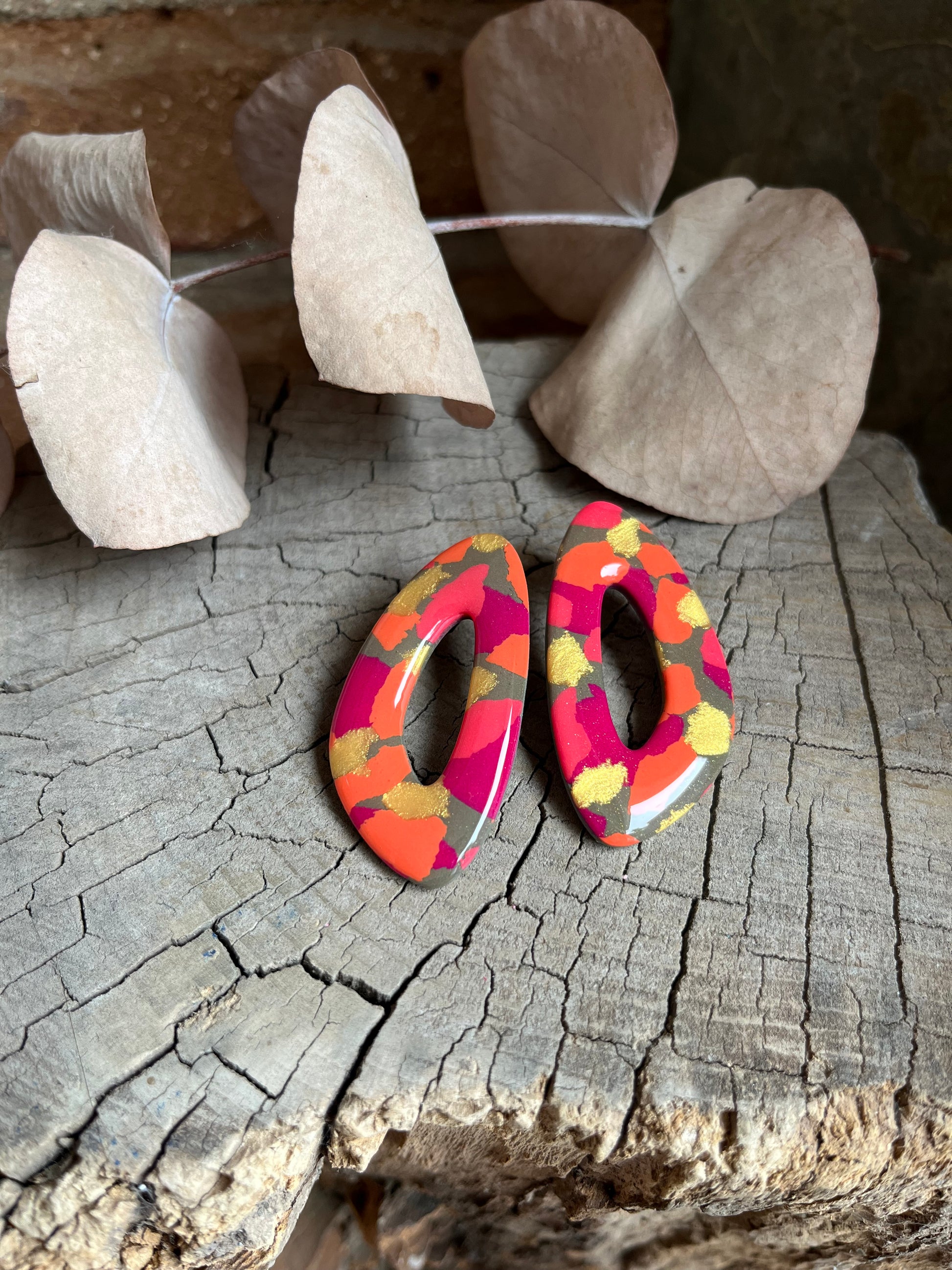 Aros de arcilla polimérica con top coat de resina uv. Miden 5 cms. Palito de acero quirúrgico y tope de goma.