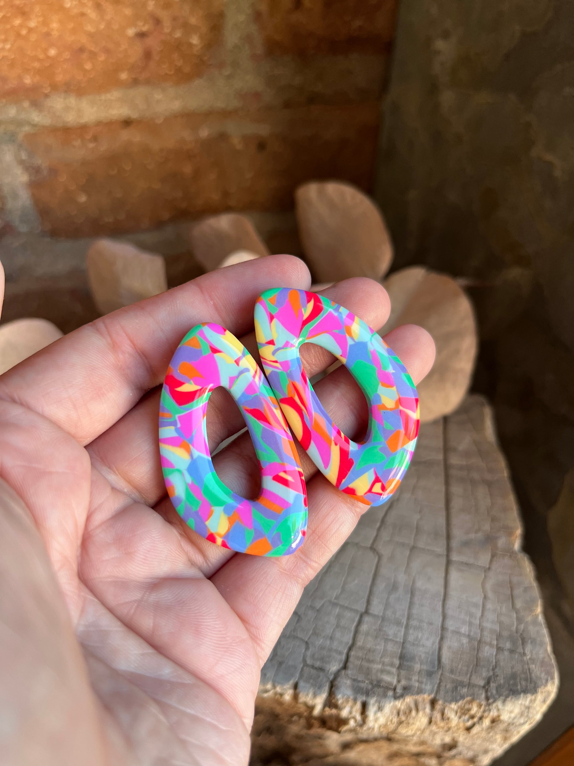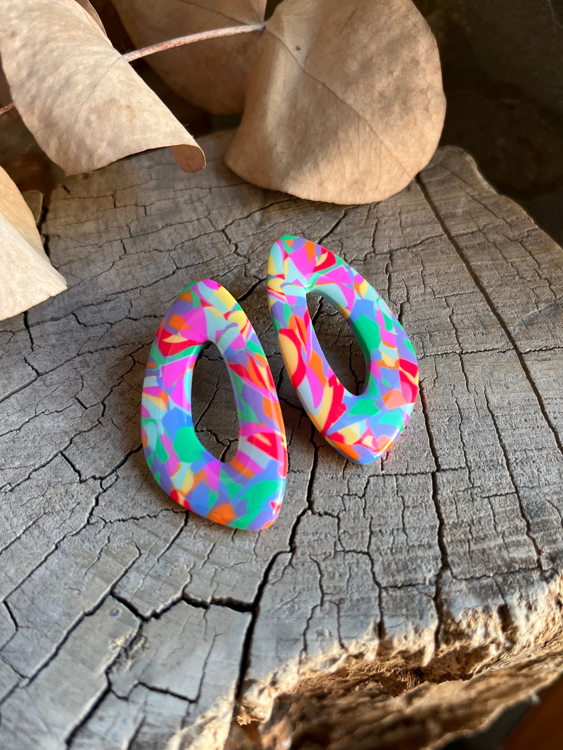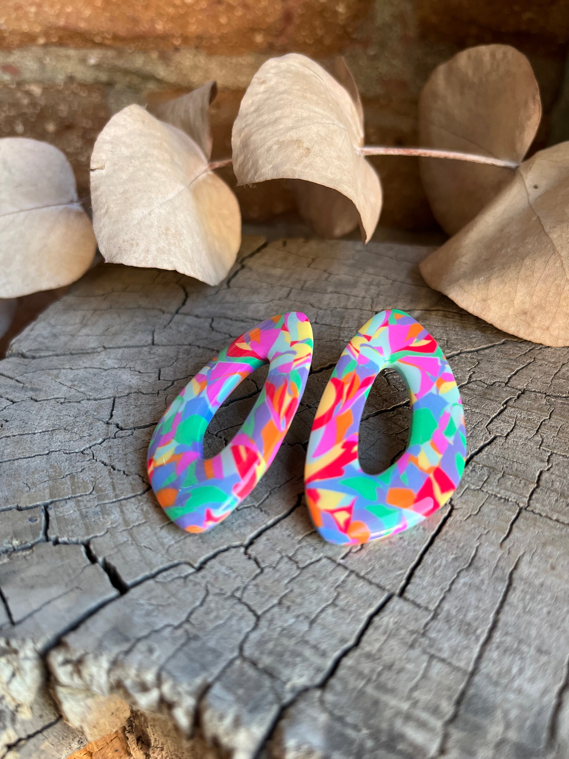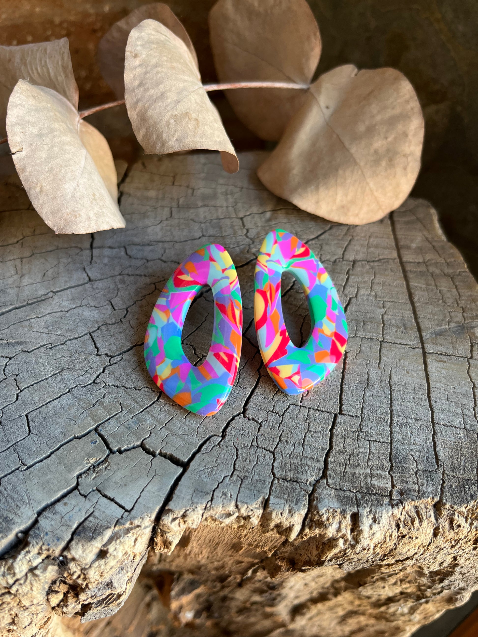Aros de arcilla polimérica con top coat de resina uv. Miden 5 cms. Palito de acero quirúrgico y tope de goma.