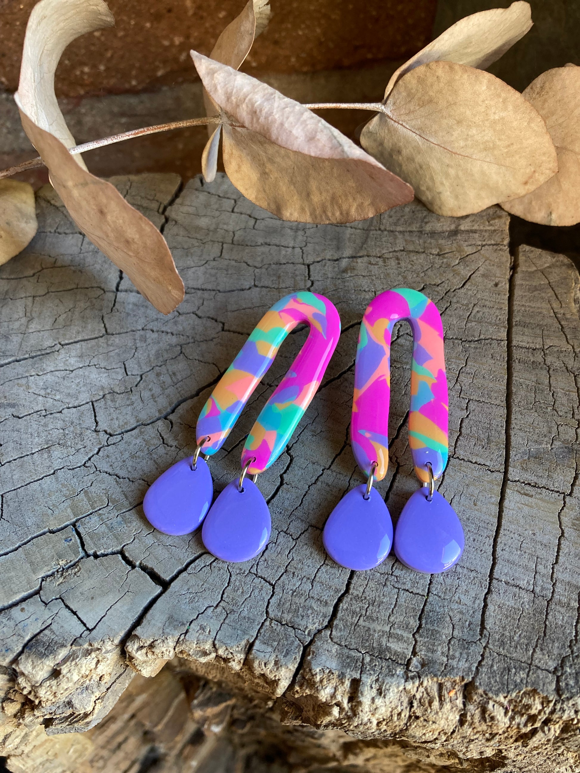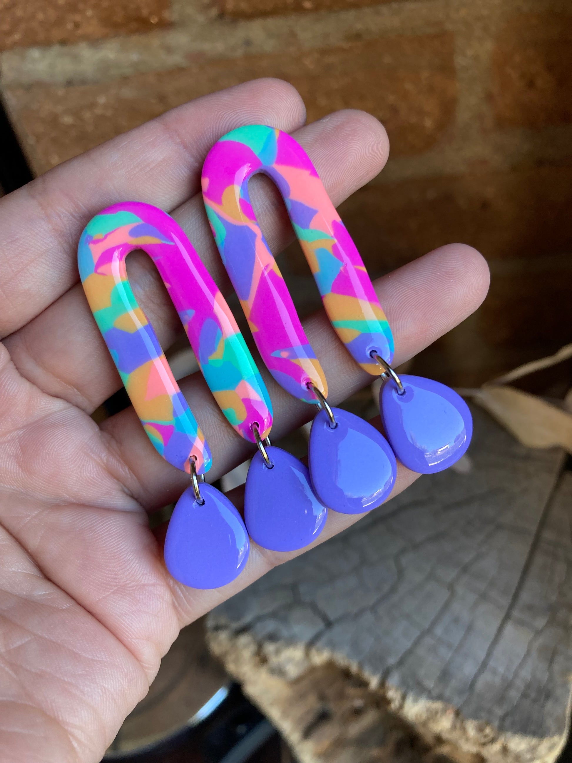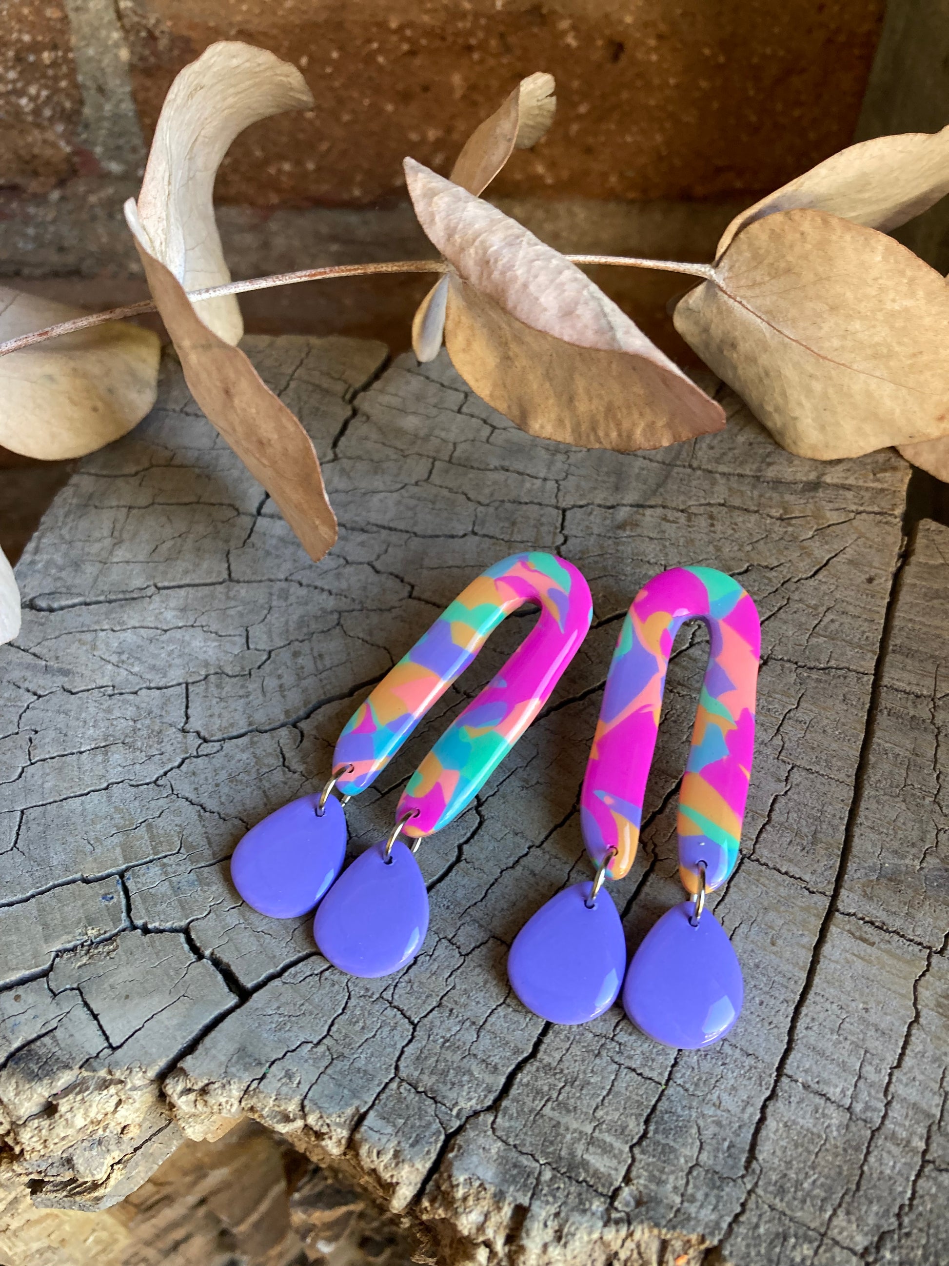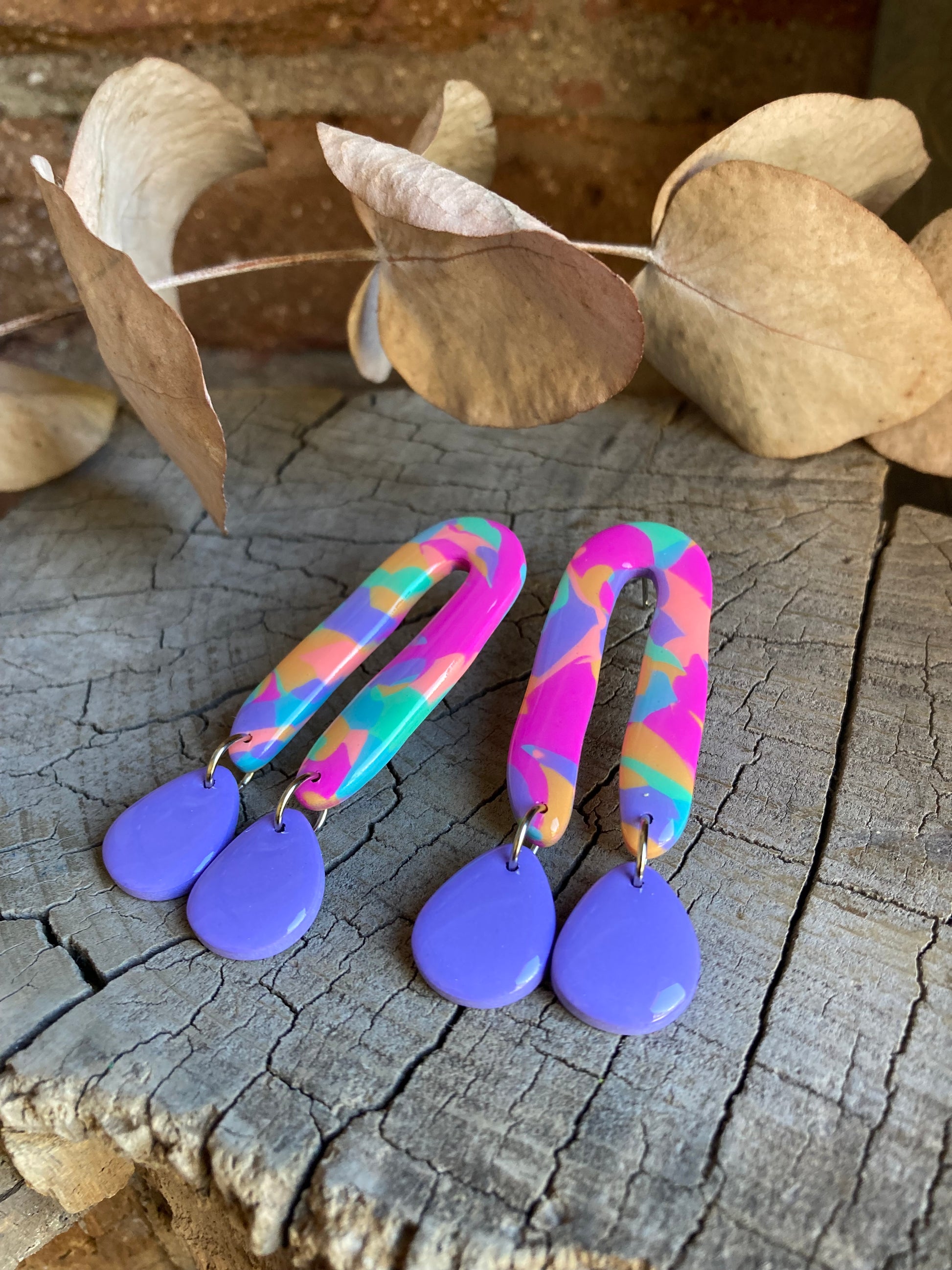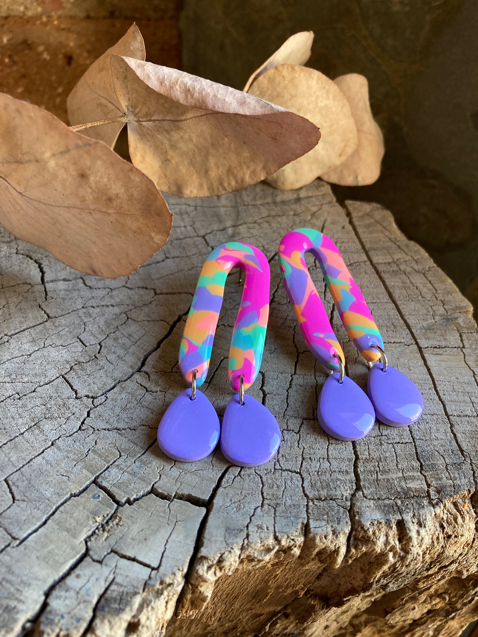 Aros de arcilla polimérica con top coat de resina uv. Miden 6,3 cms. Palito de acero quirúrgico y tope de goma.