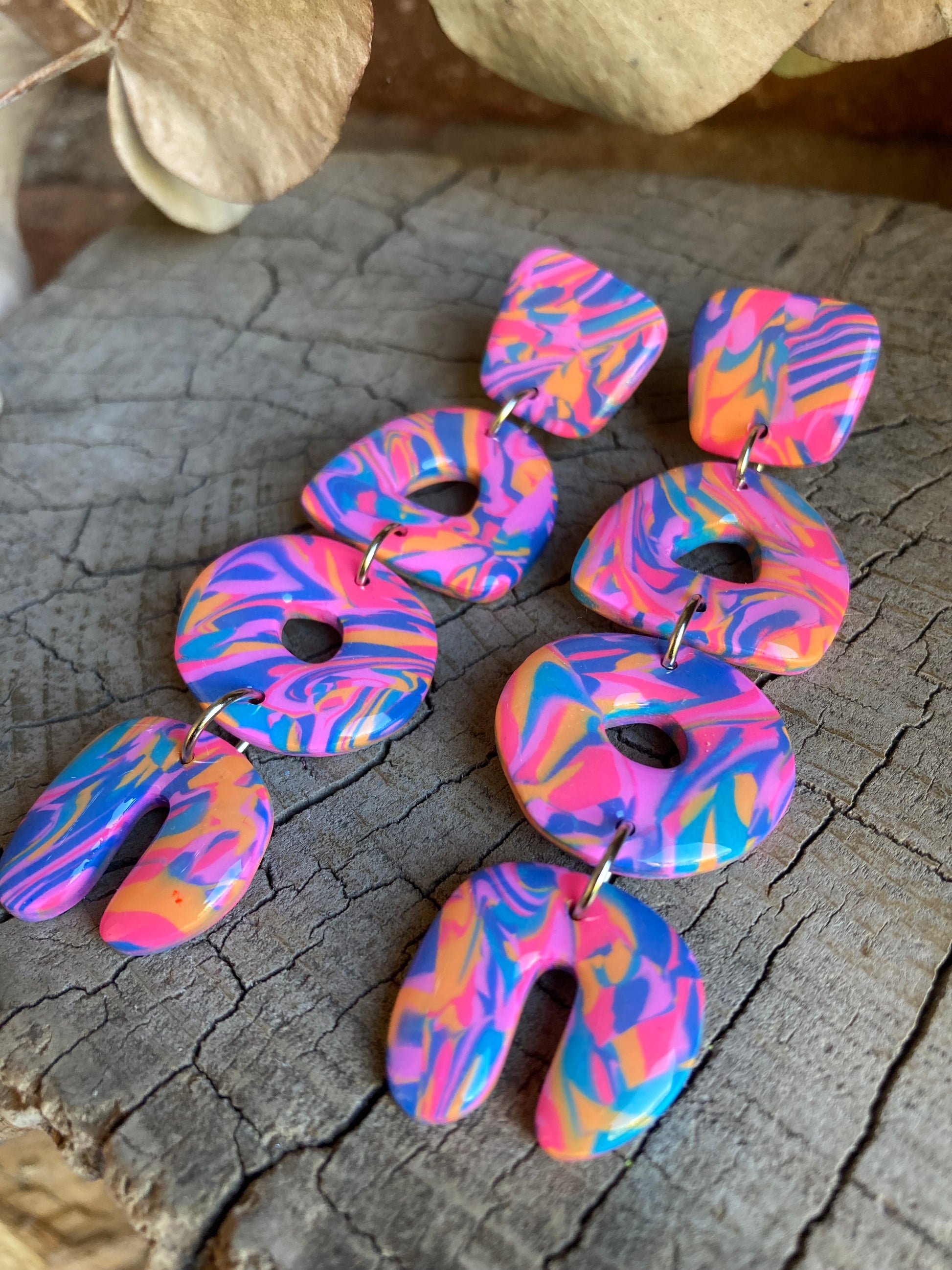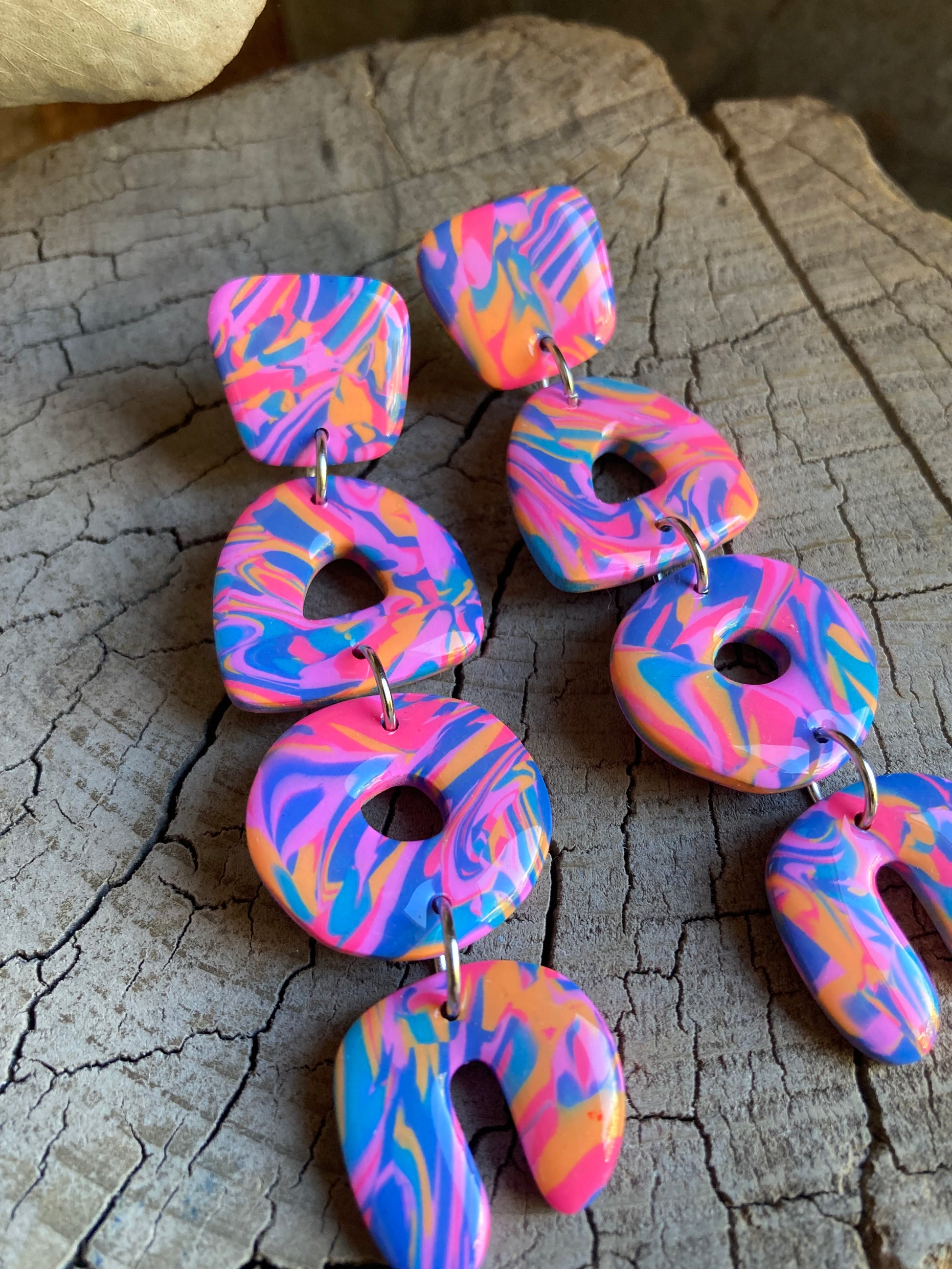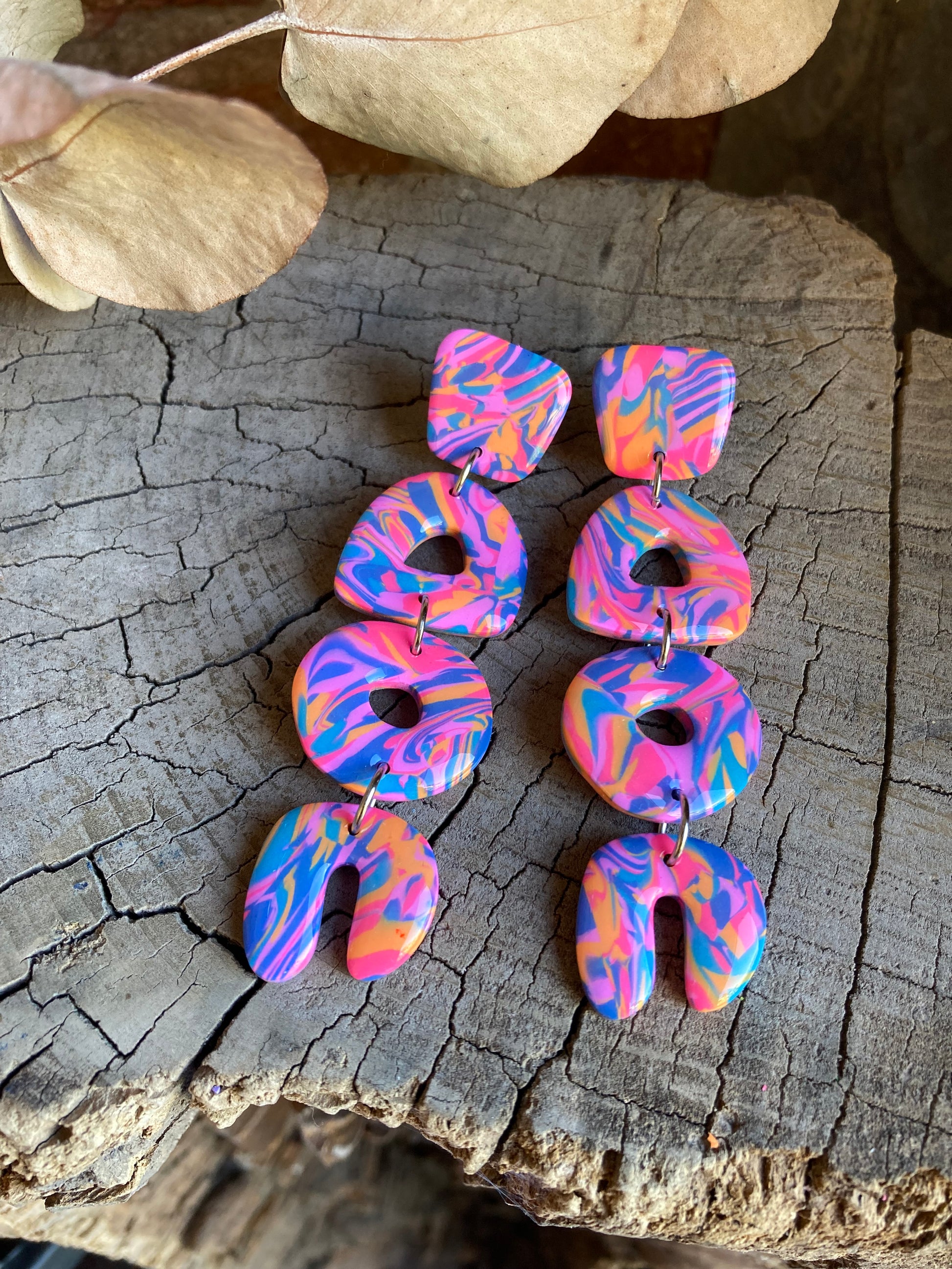 Aros de arcilla polimérica con top coat de resina uv. Miden 8,5 cms. Palito de acero quirúrgico y tope de goma.