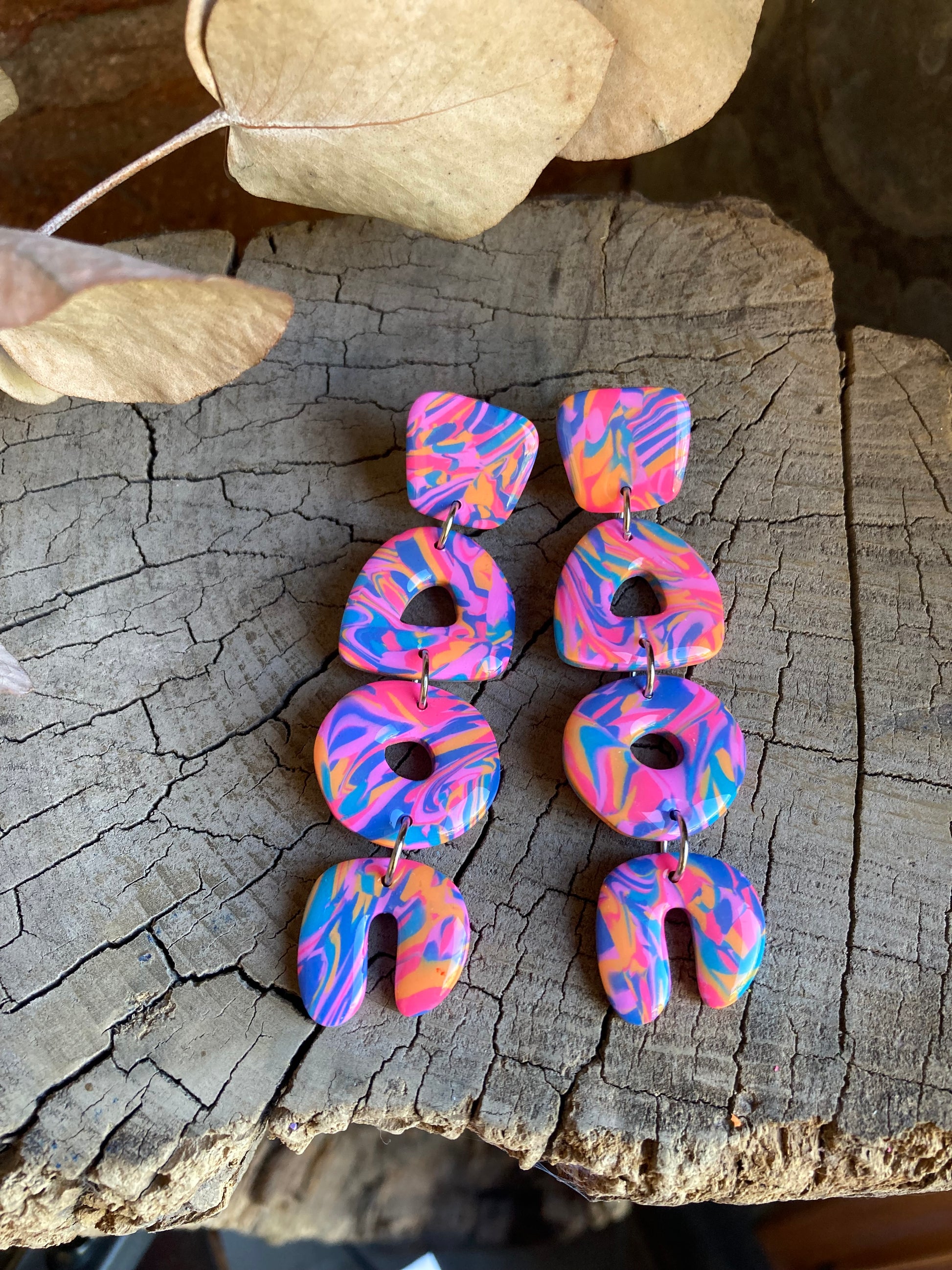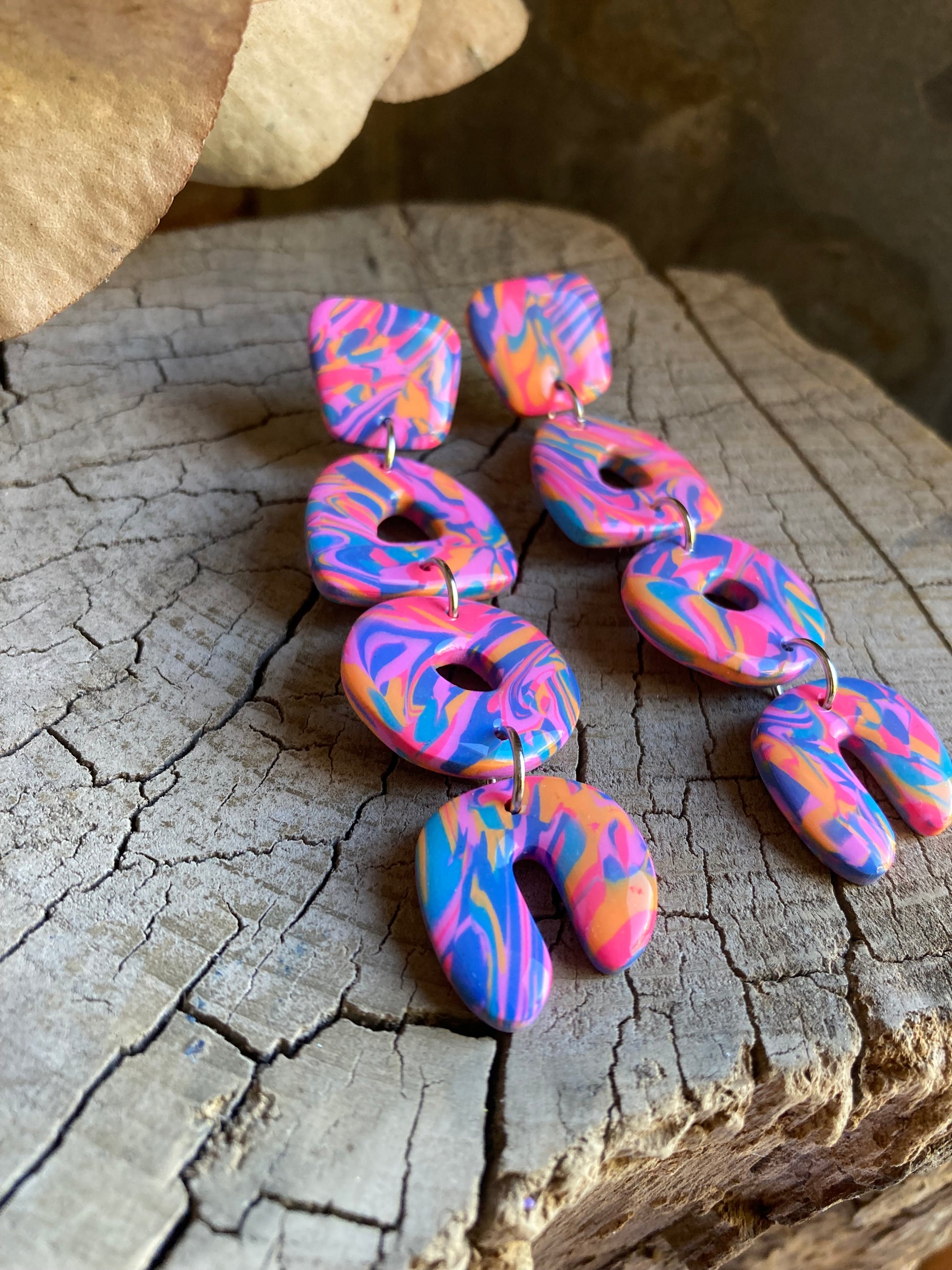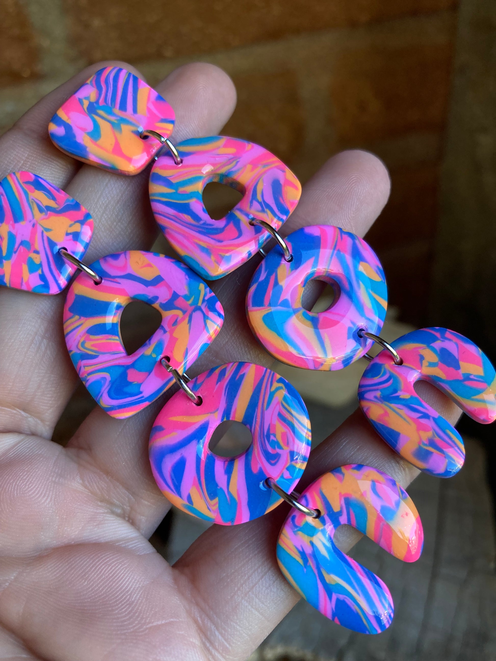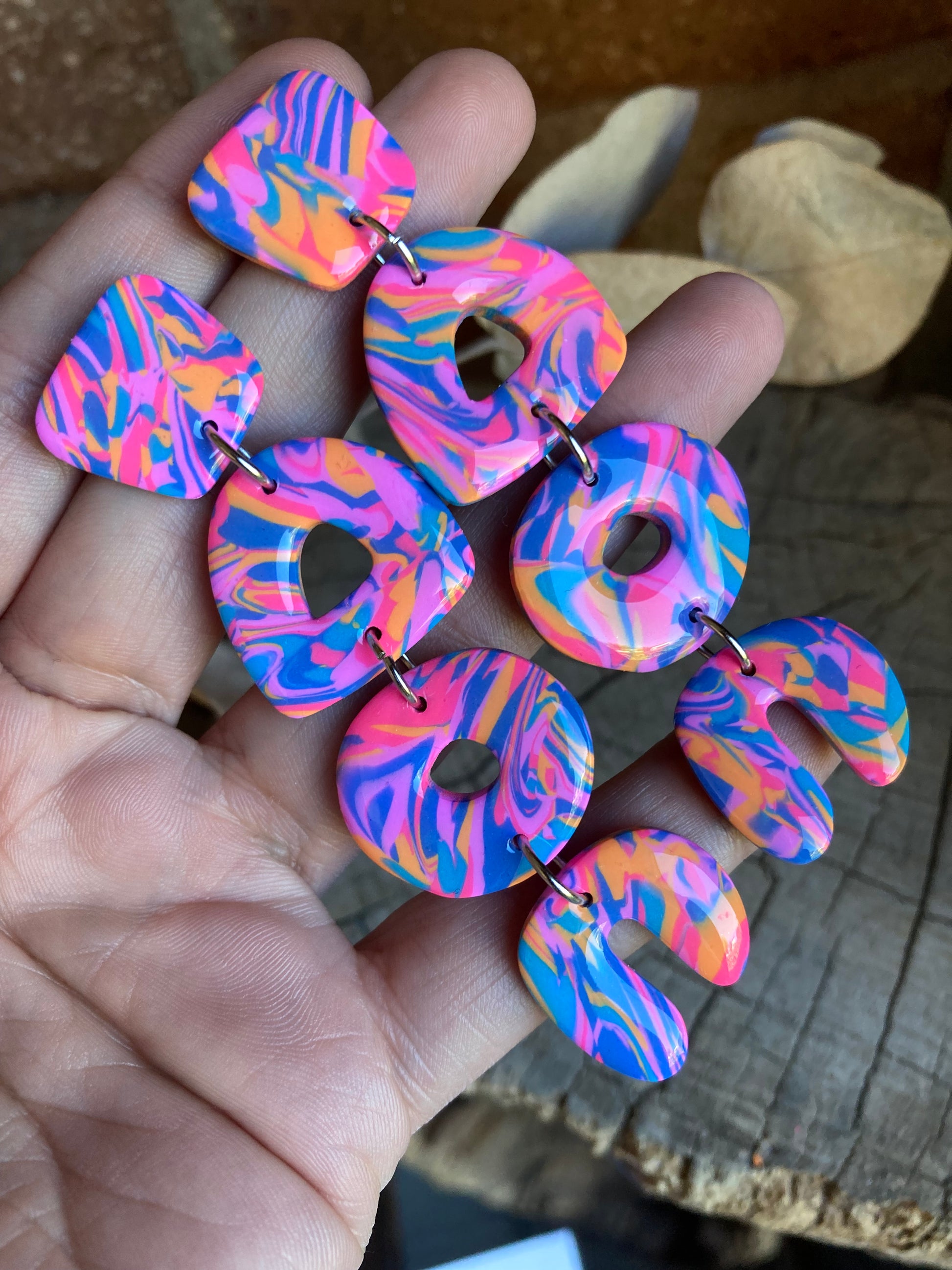 Aros de arcilla polimérica con top coat de resina uv. Miden 8,5 cms. Palito de acero quirúrgico y tope de goma.