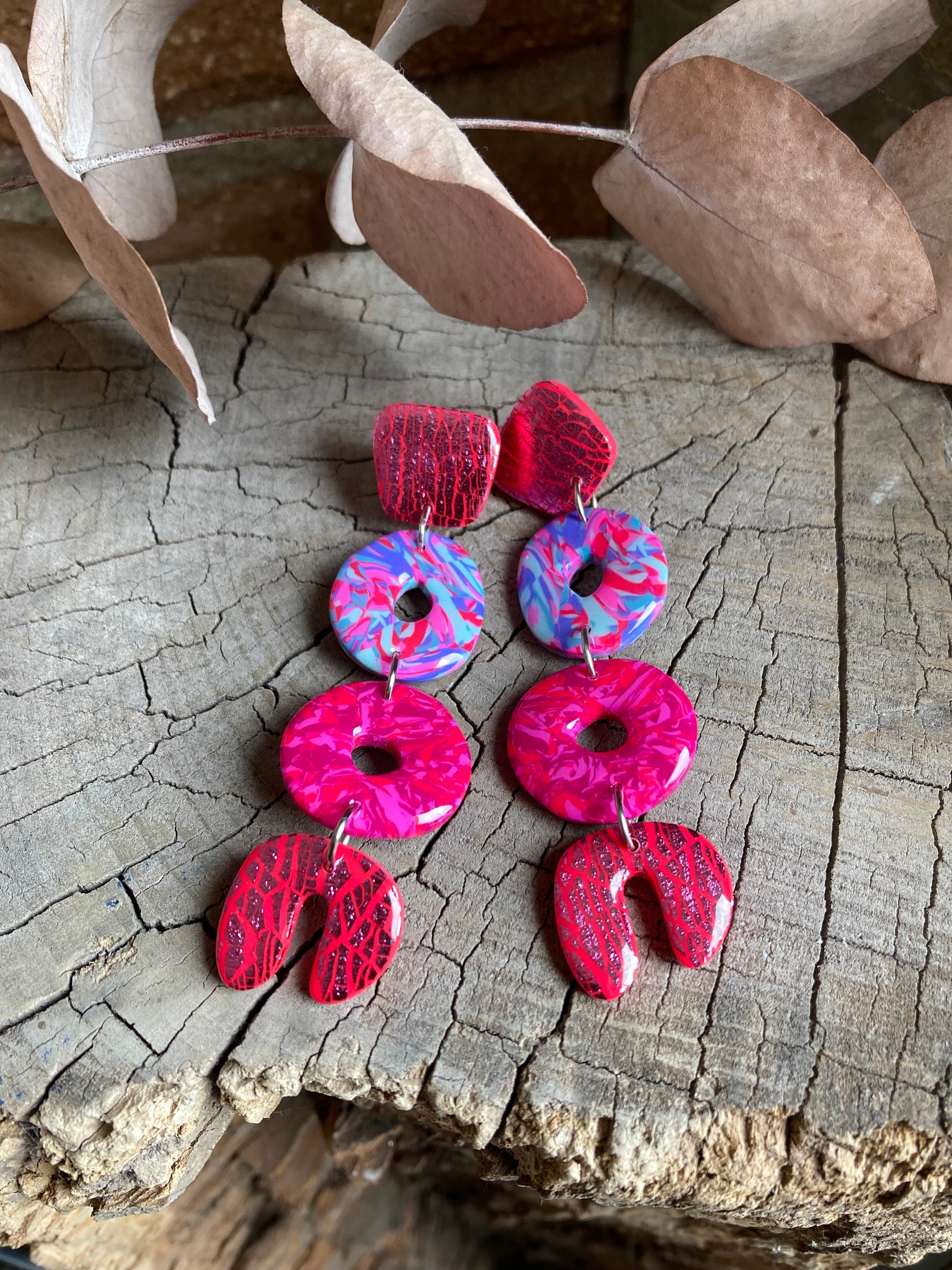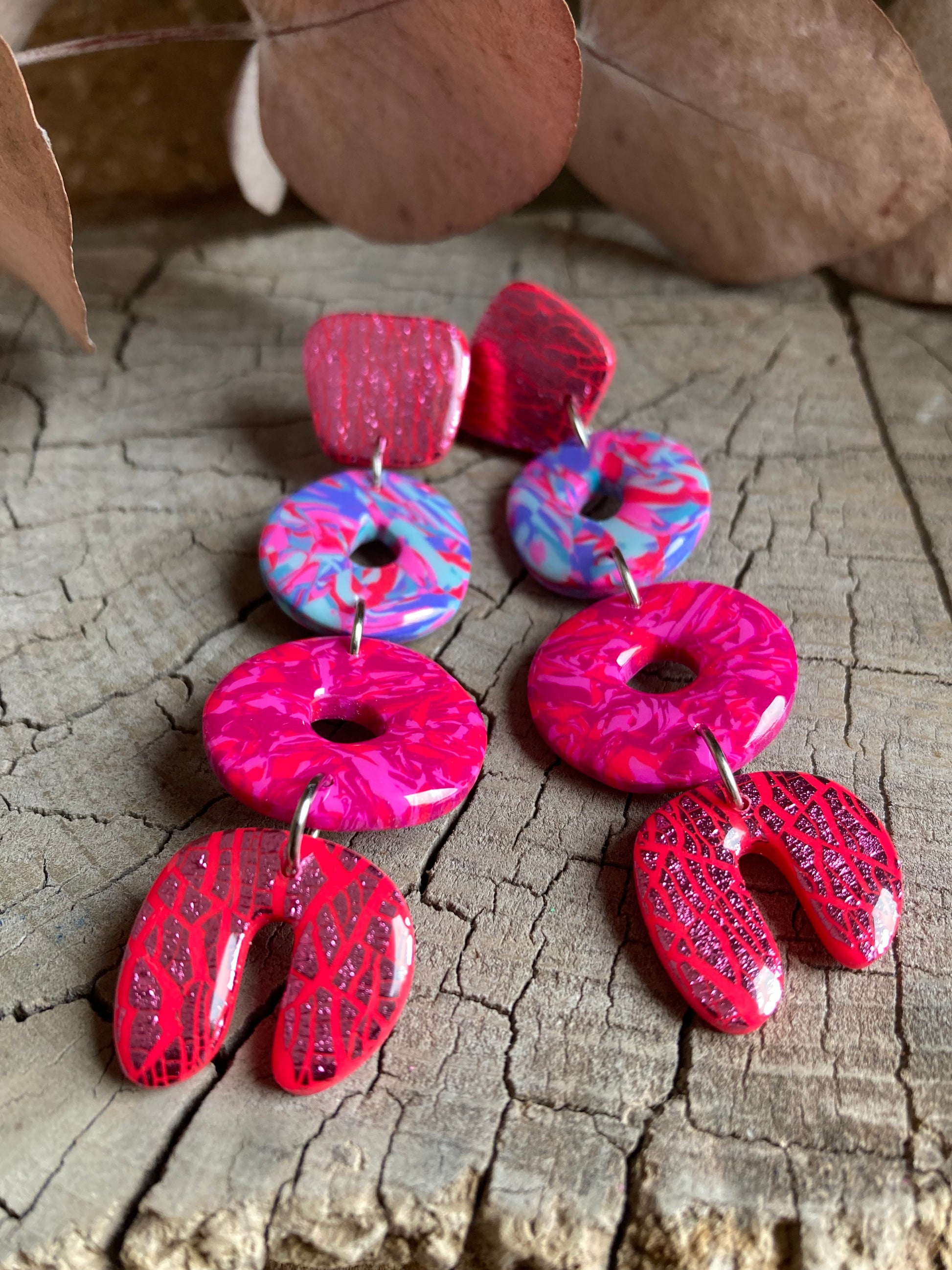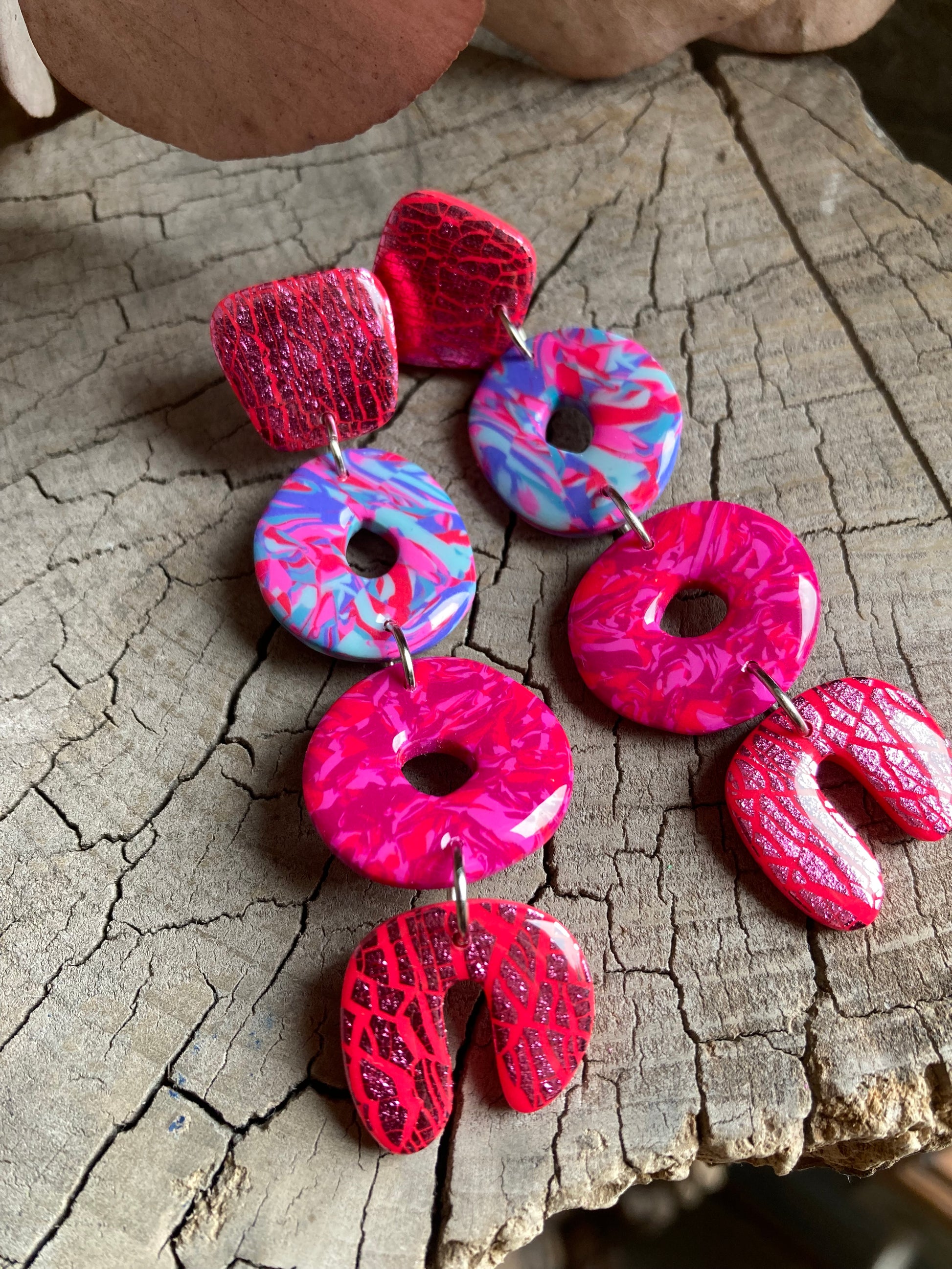 Aros de arcilla polimérica con top coat de resina uv. Miden 8,5 cms. Palito de acero quirúrgico y tope de goma.