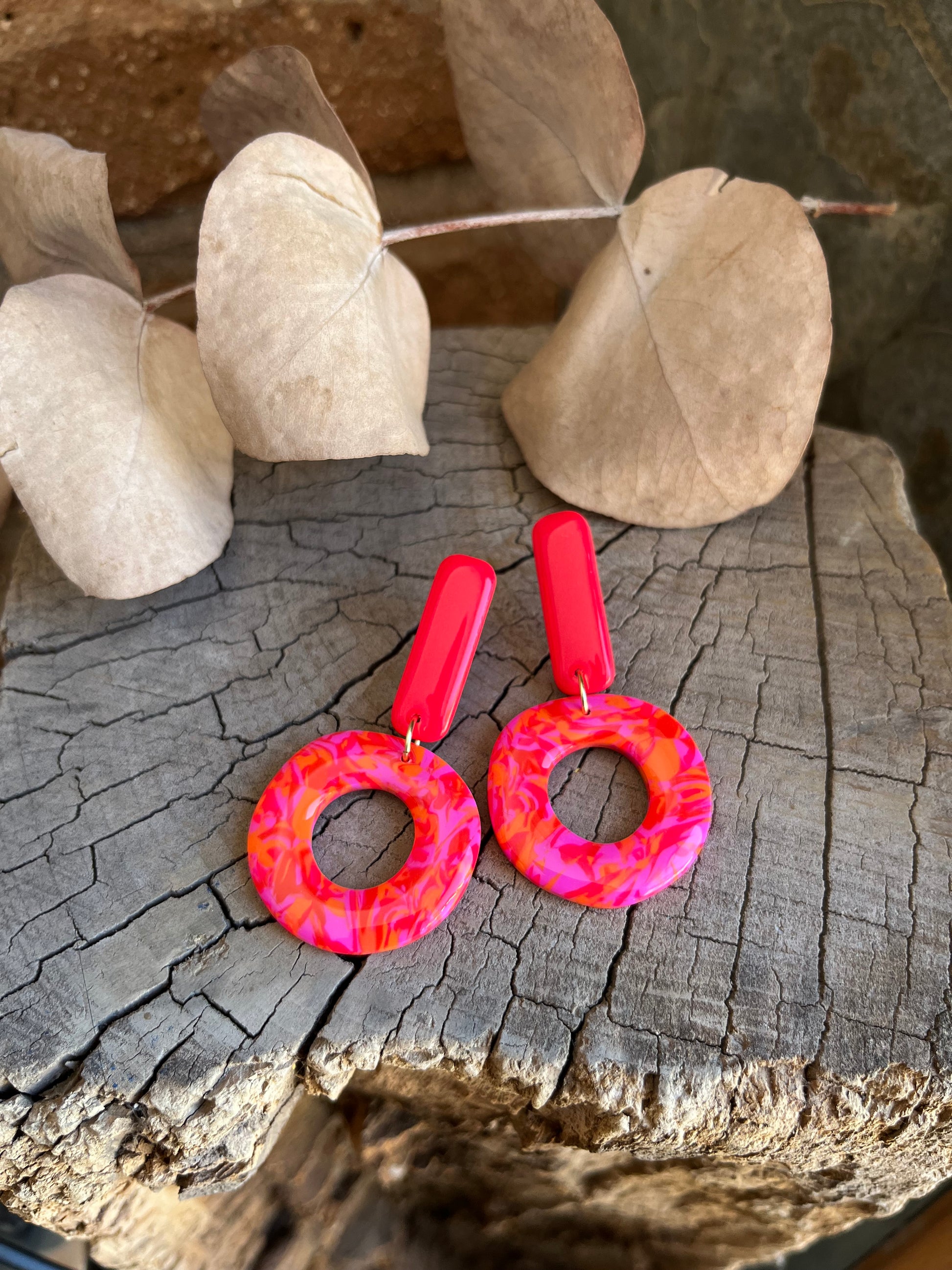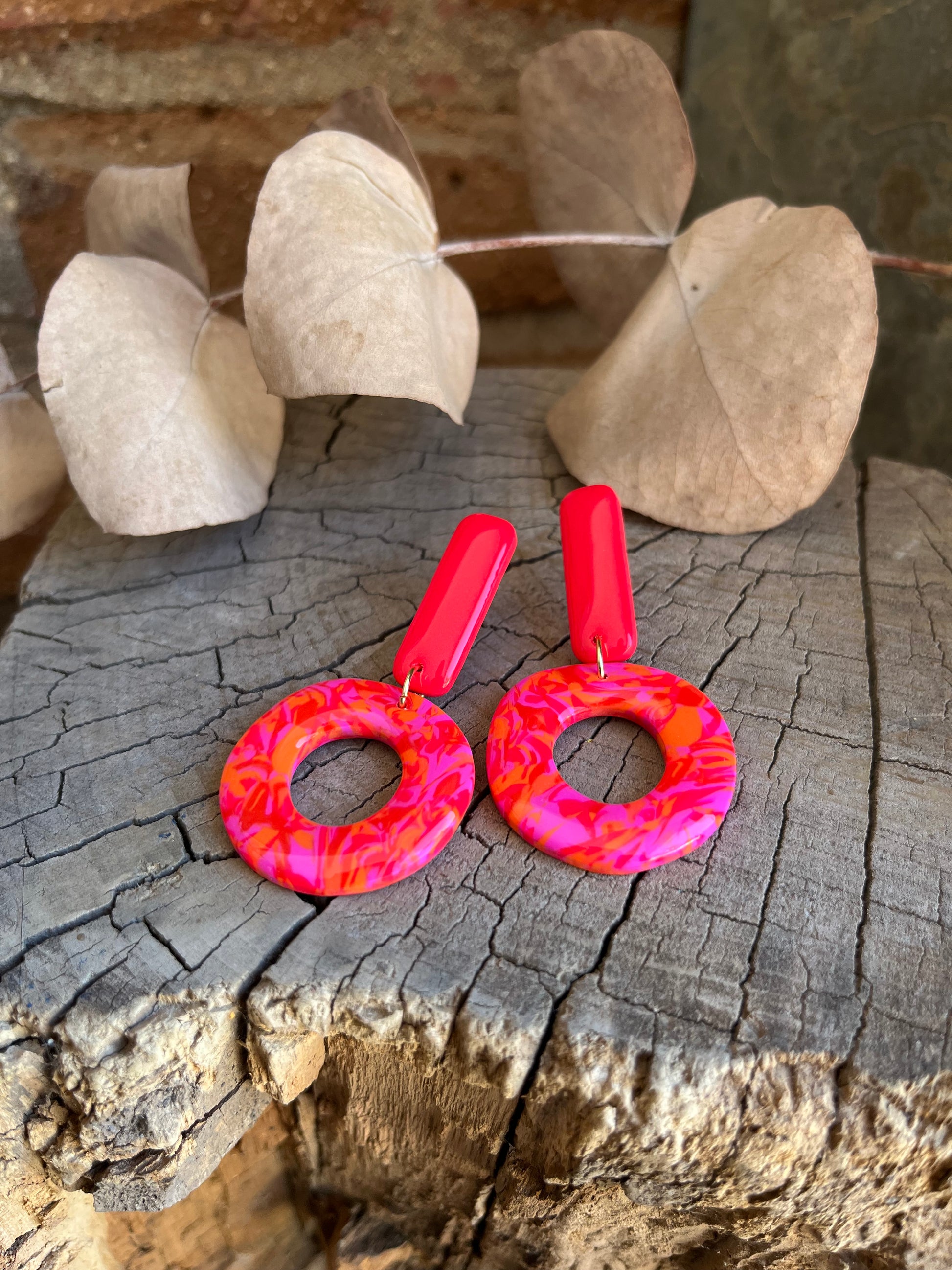 Aros de arcilla polimérica con top coat de resina uv. Miden 6 cms. Palito de acero quirúrgico y tope de goma.