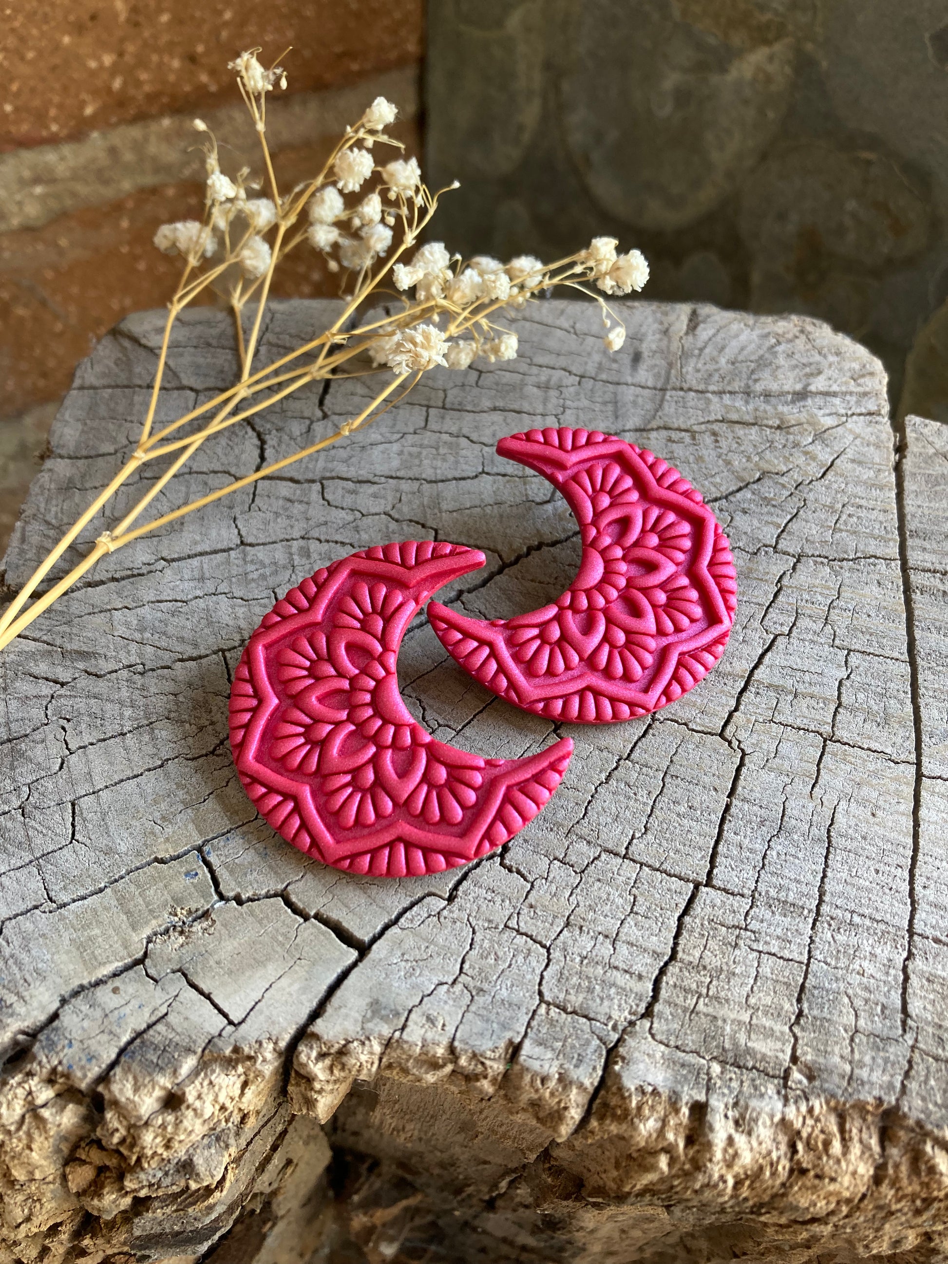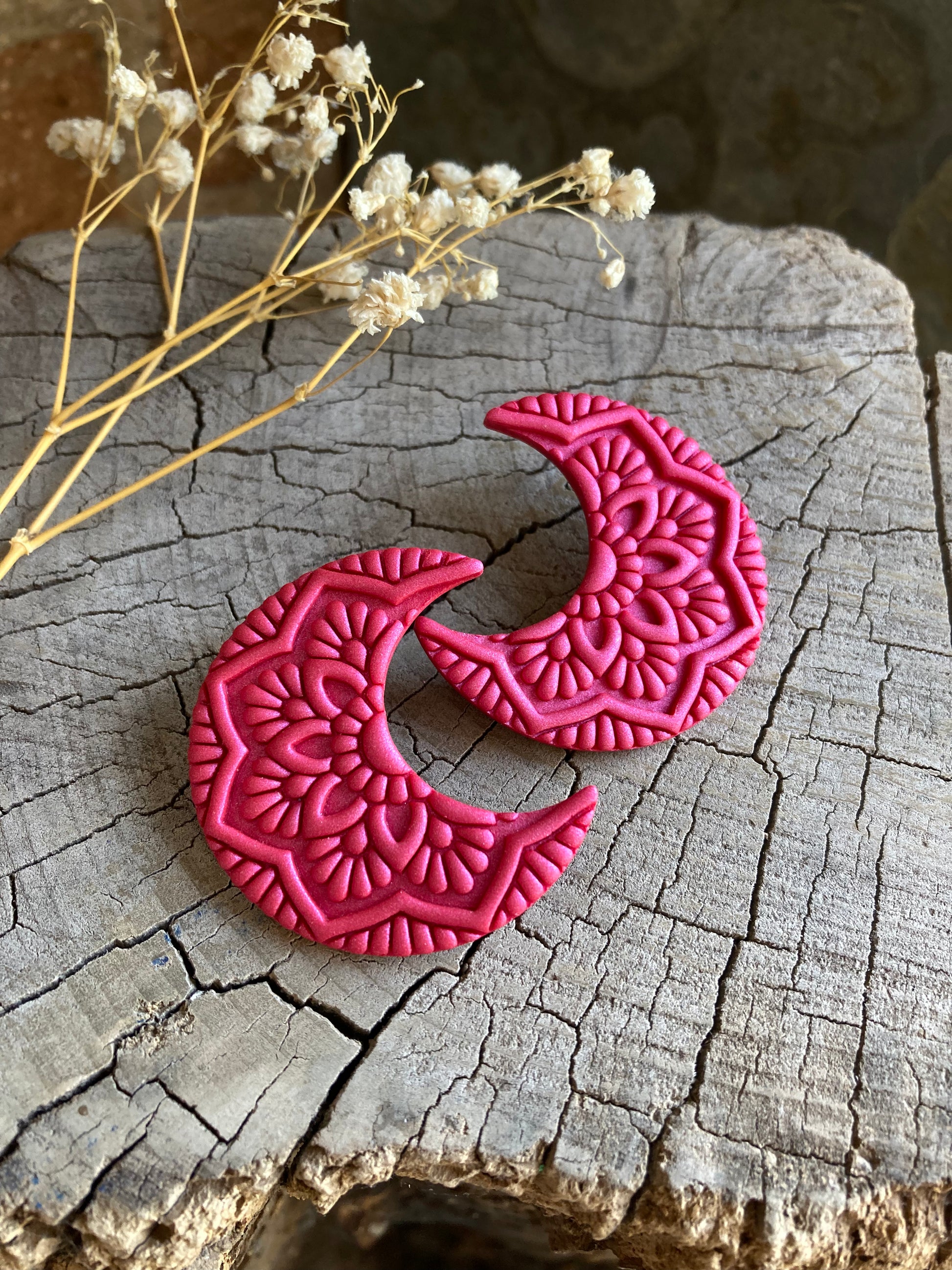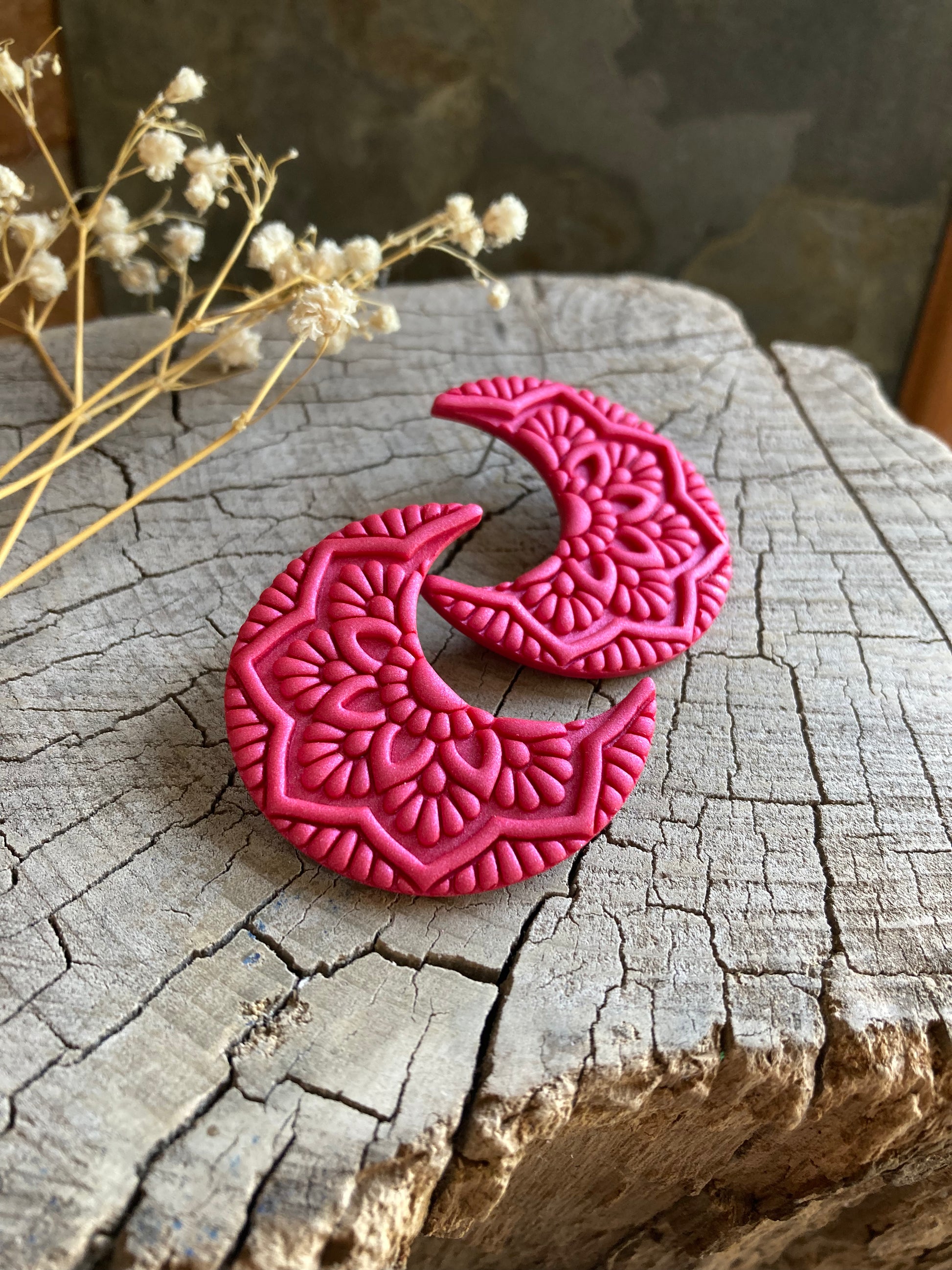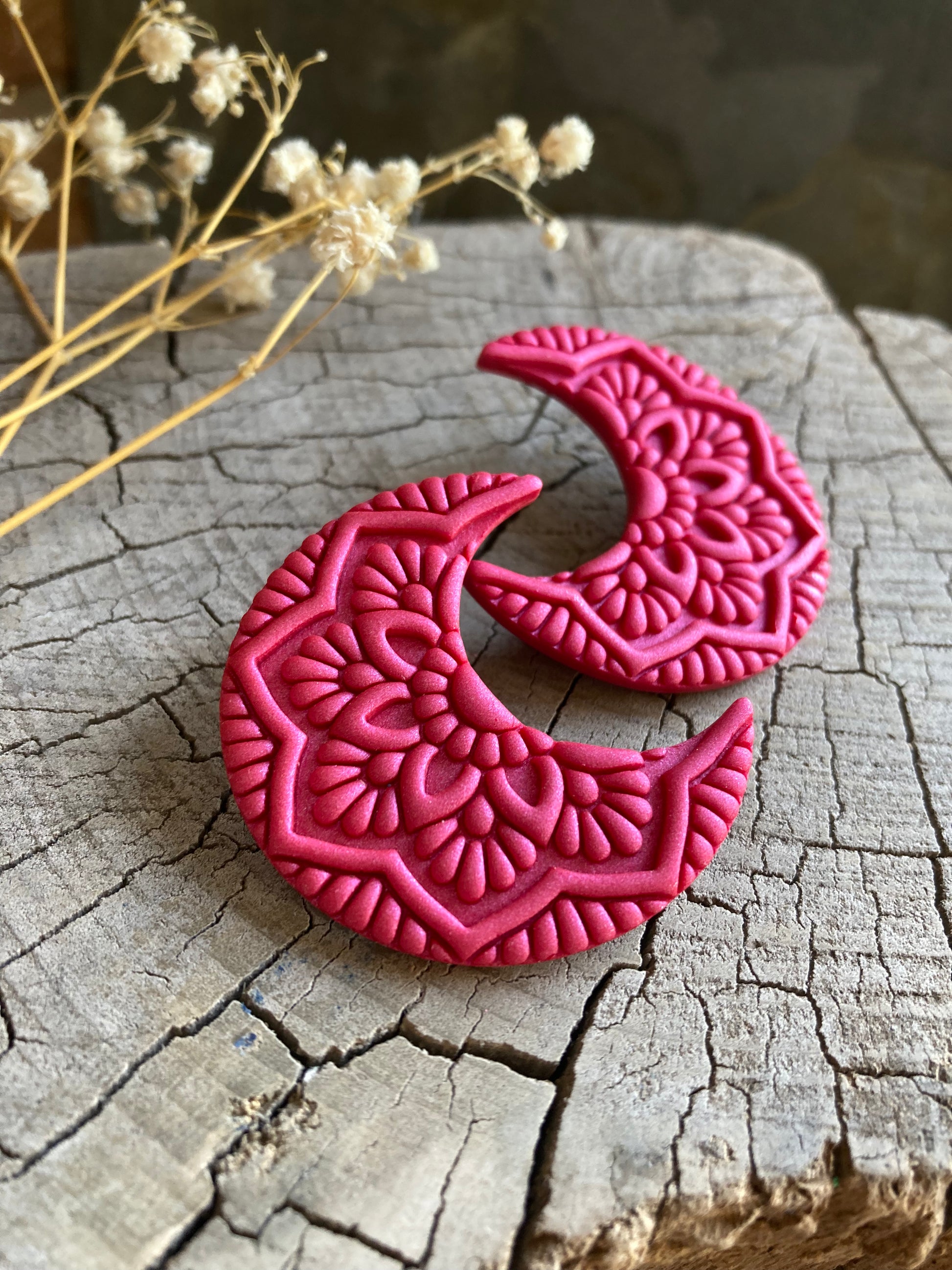 Aros de arcilla polimérica con diseño en relieve. Miden 4,5 cms. Palito de acero quirúrgico y tope de goma.