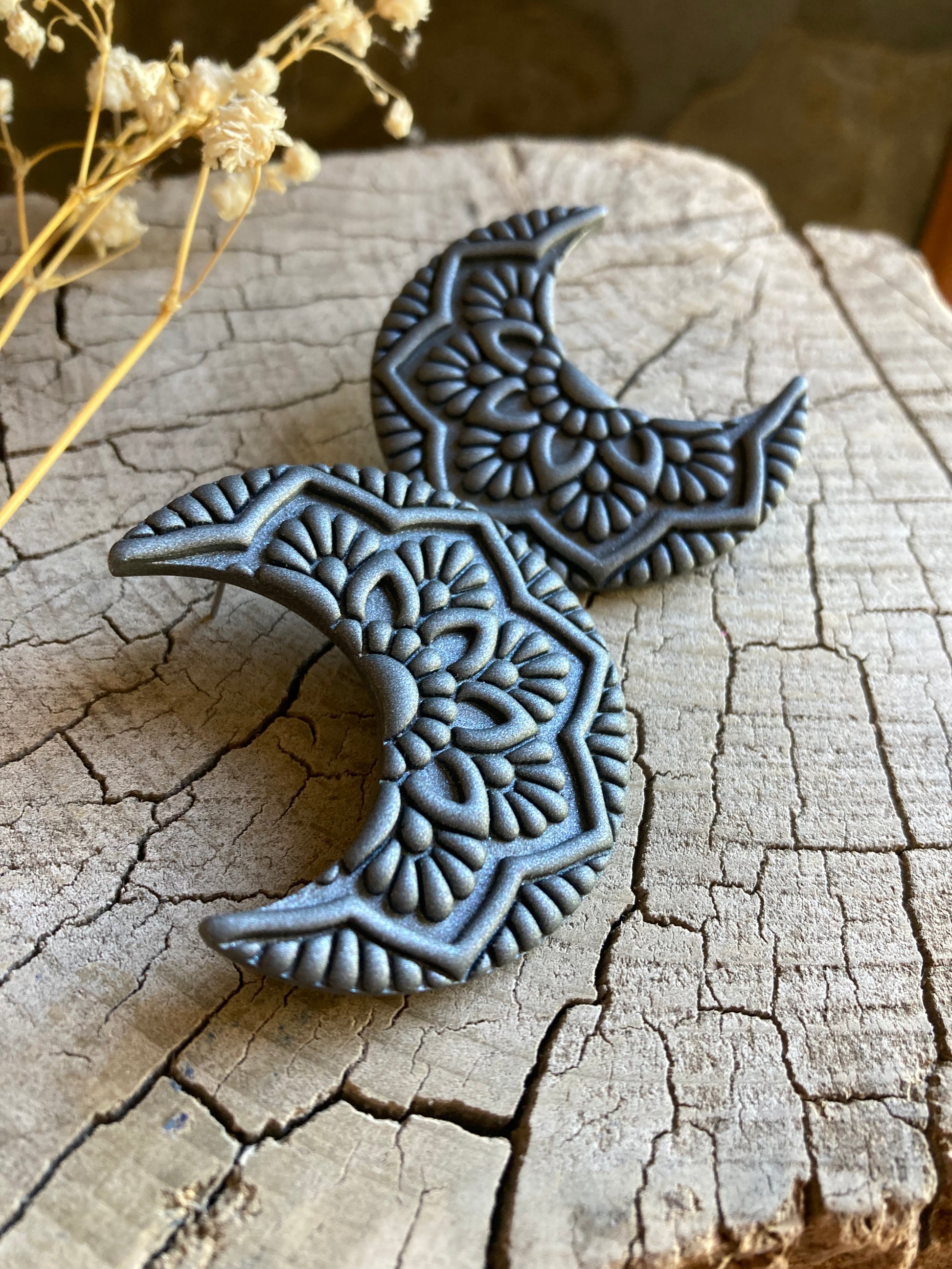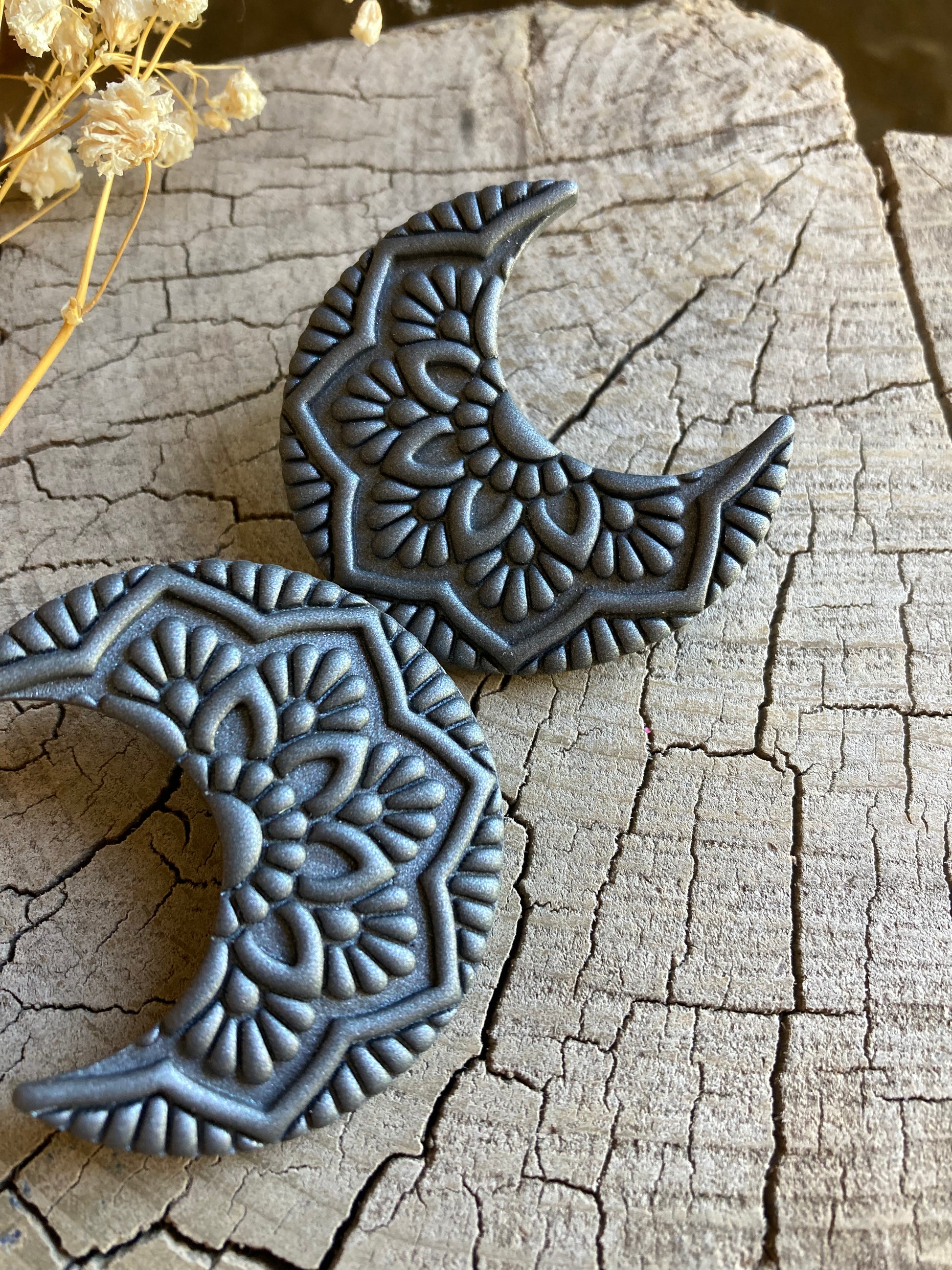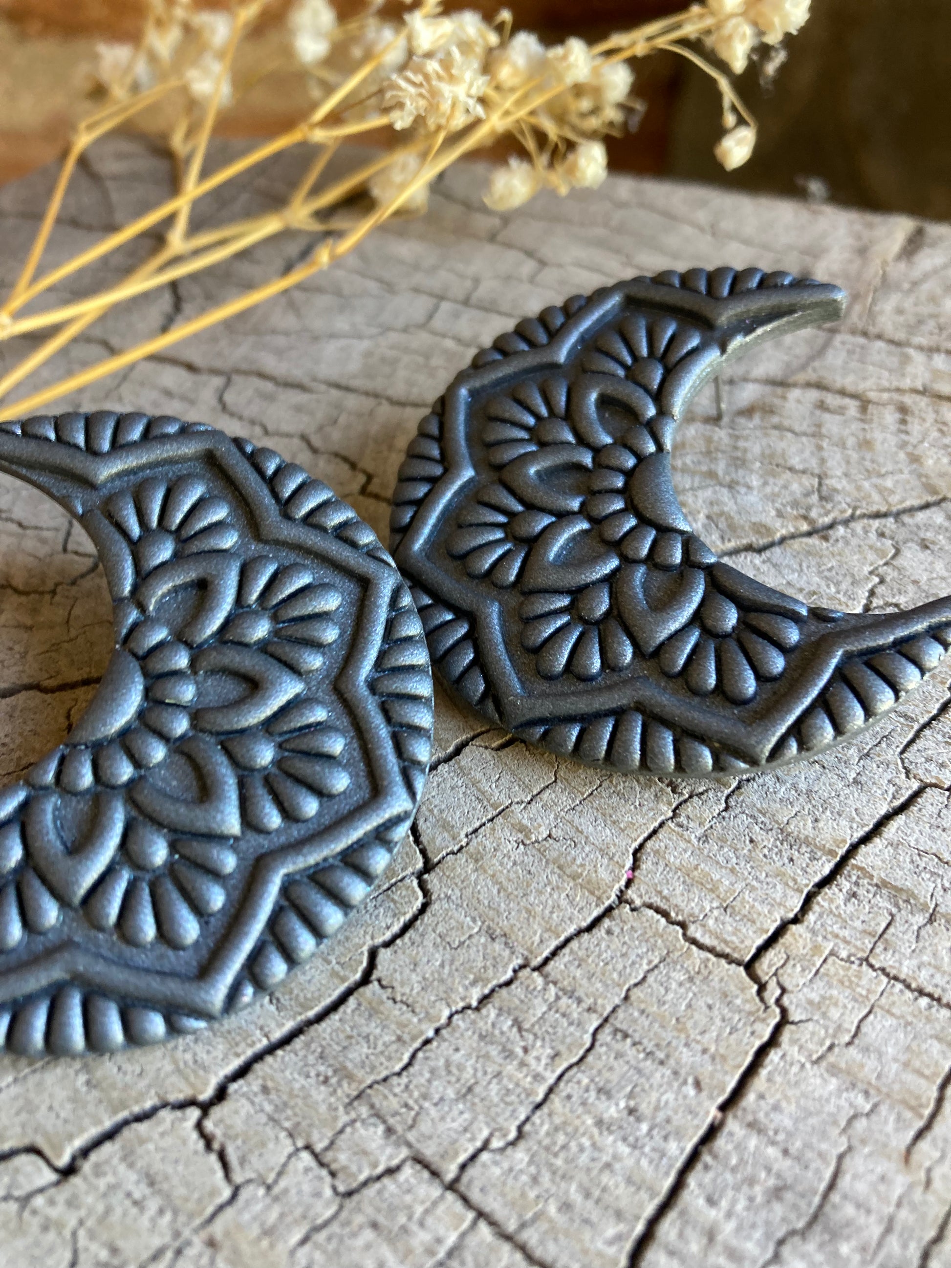 Aros de arcilla polimérica con diseño en relieve. Miden 4,5 cms. Palito de acero quirúrgico y tope de goma.