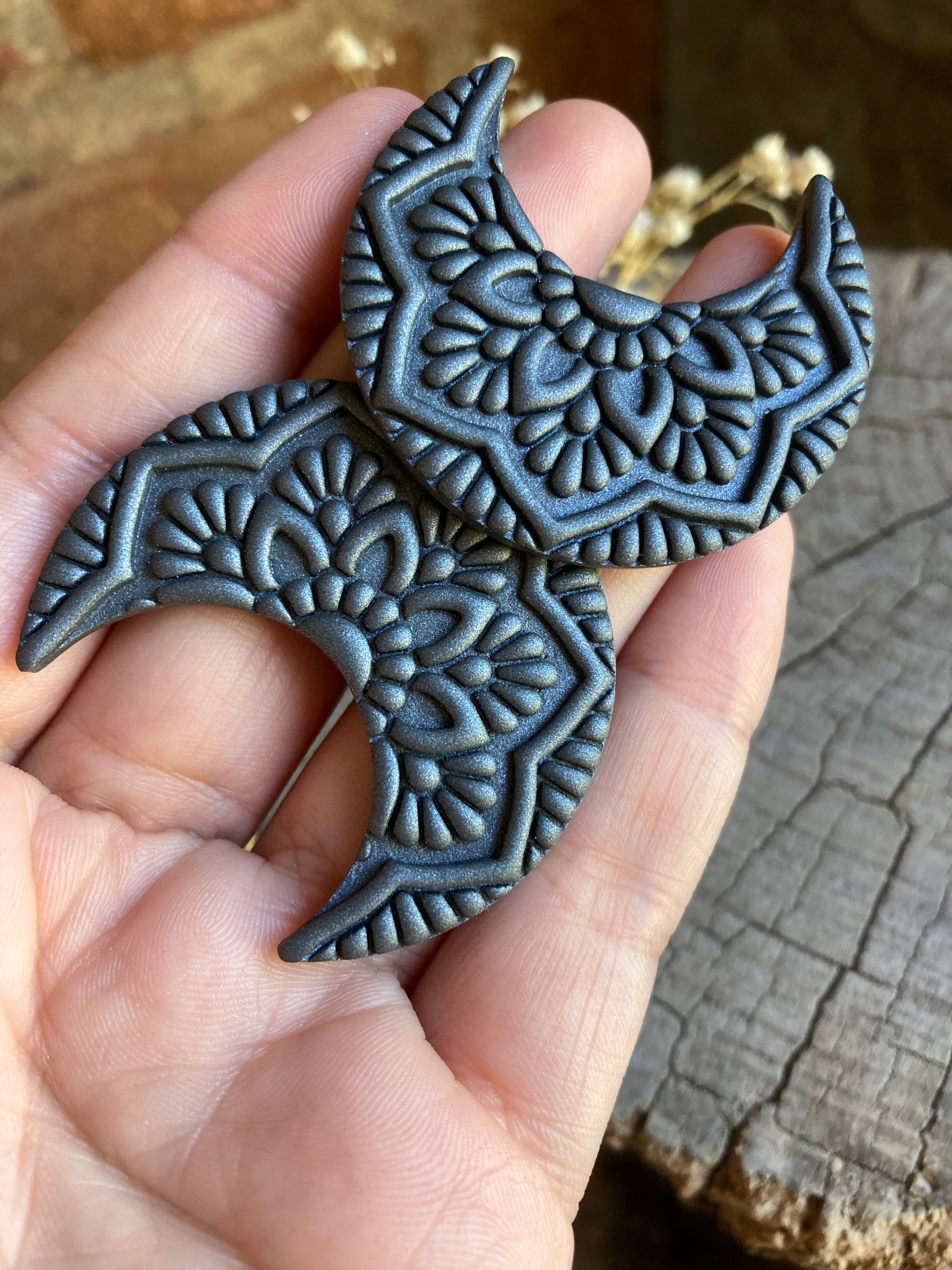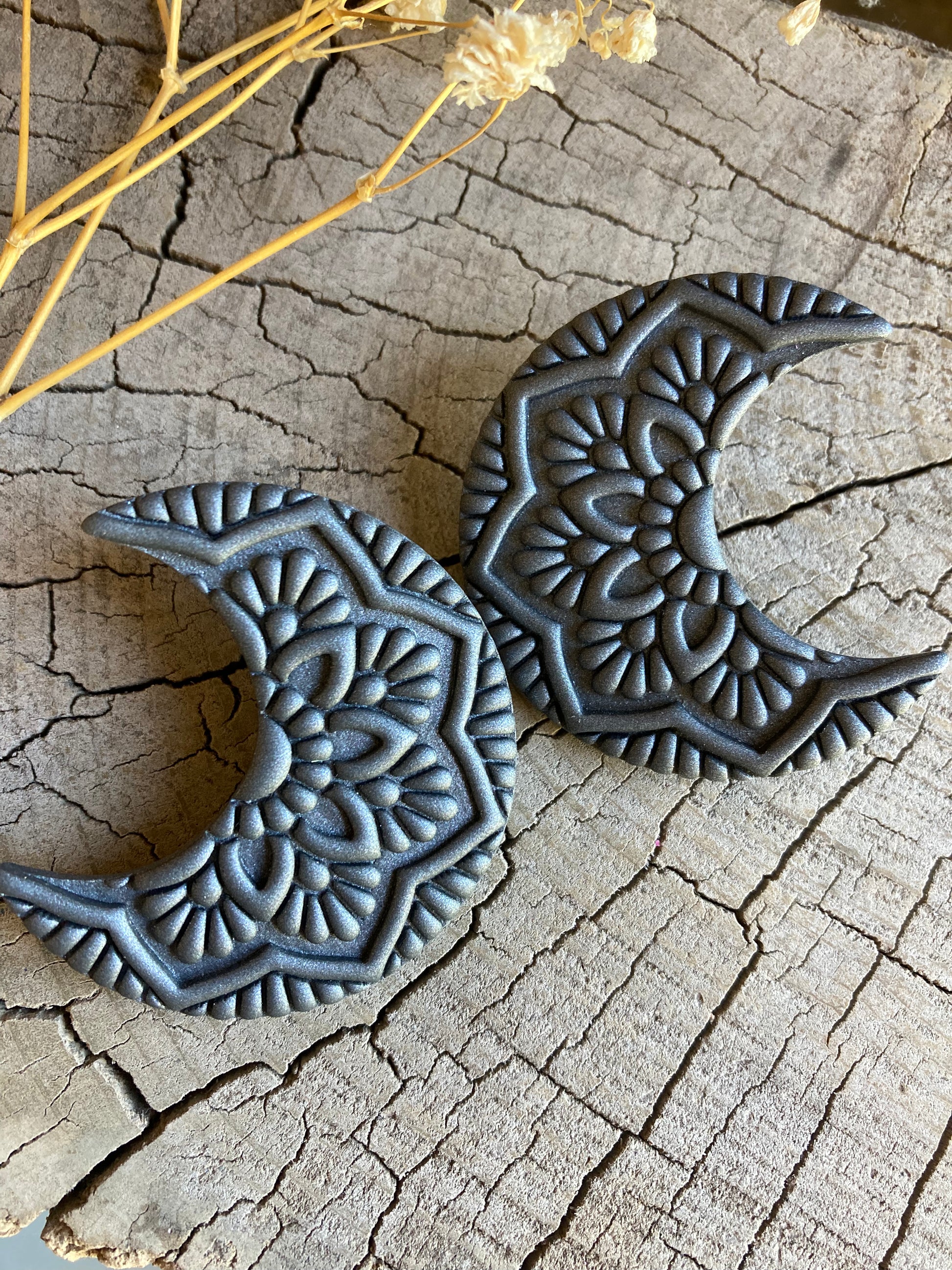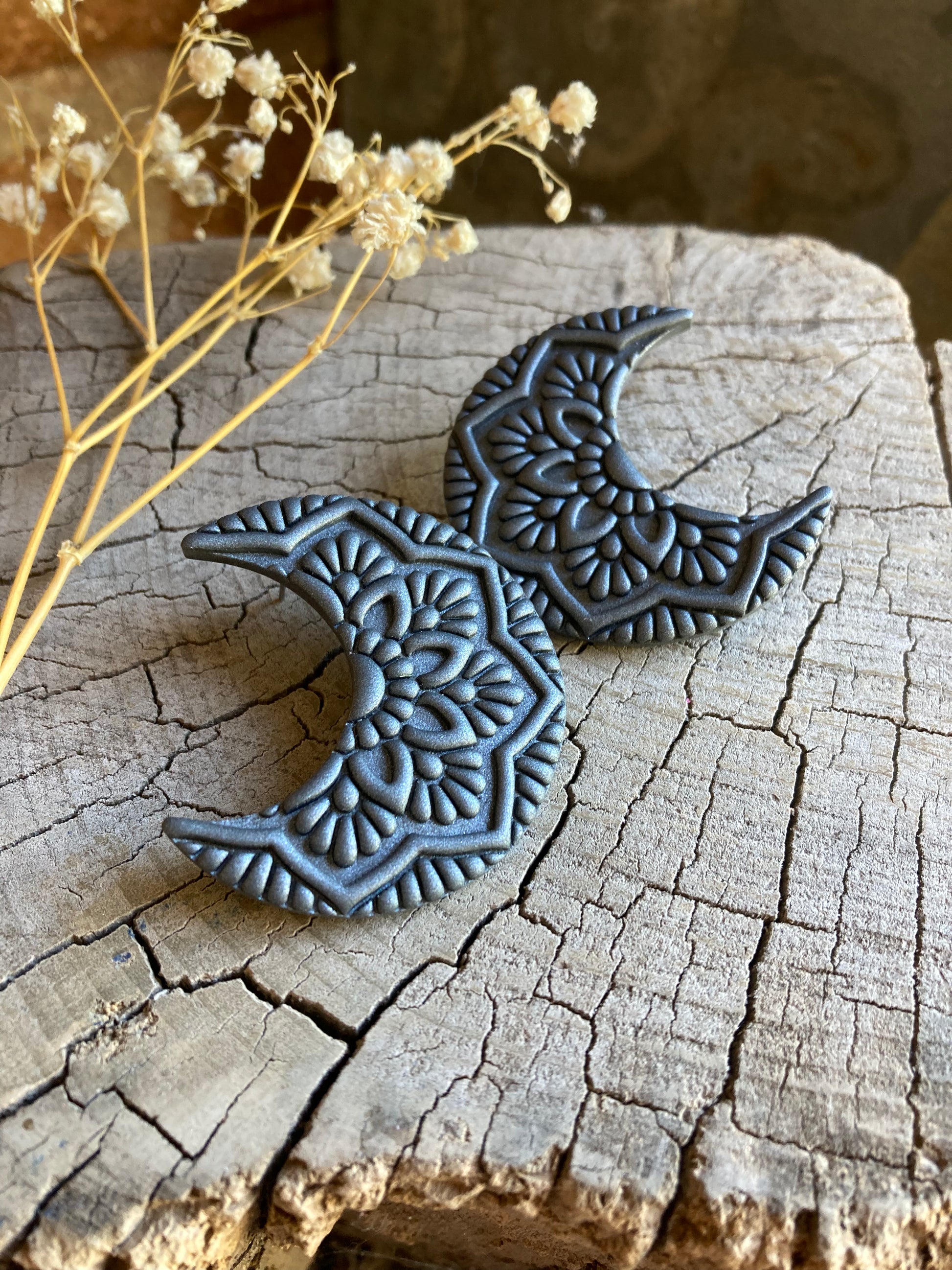 Aros de arcilla polimérica con diseño en relieve. Miden 4,5 cms. Palito de acero quirúrgico y tope de goma.