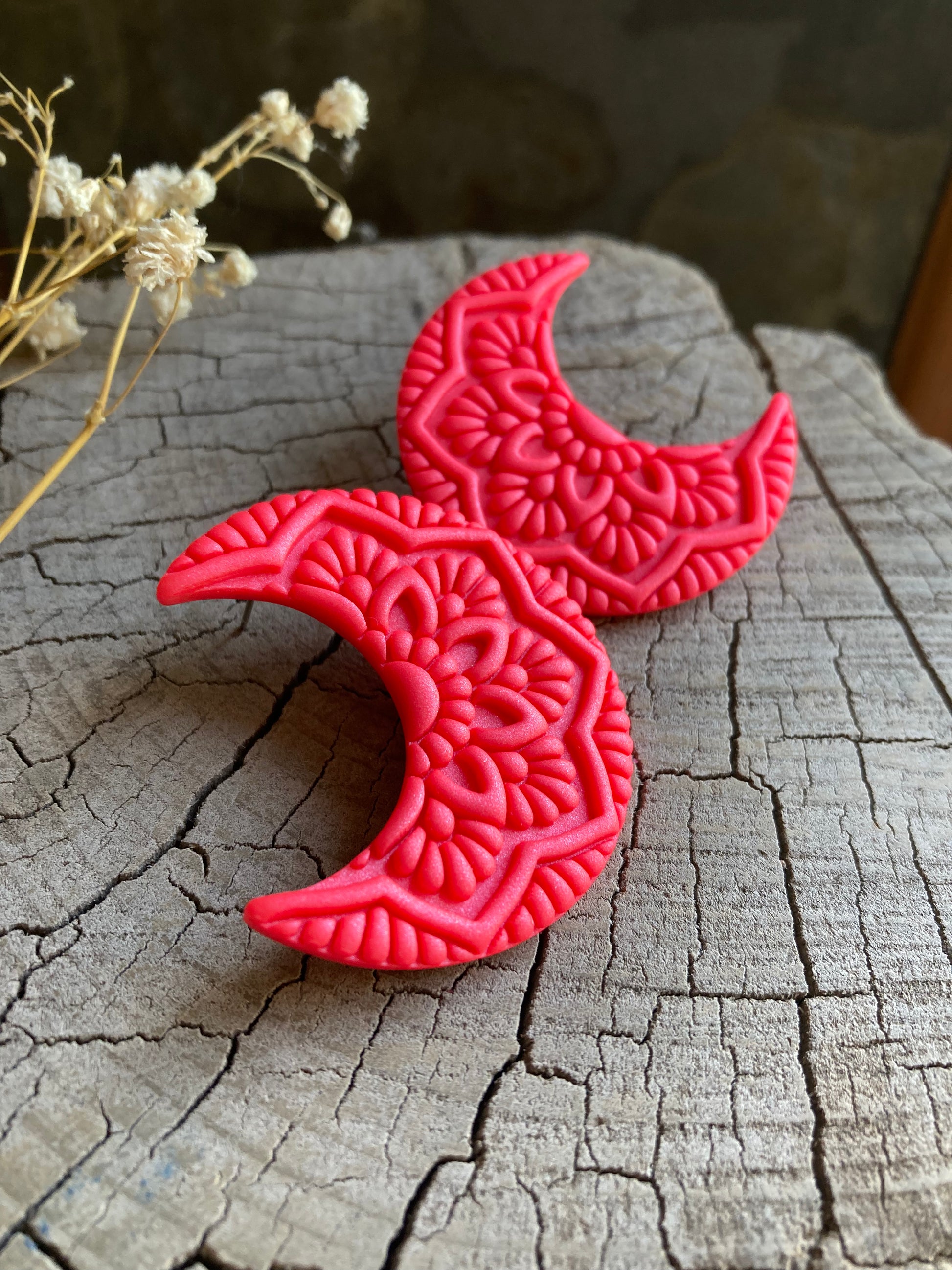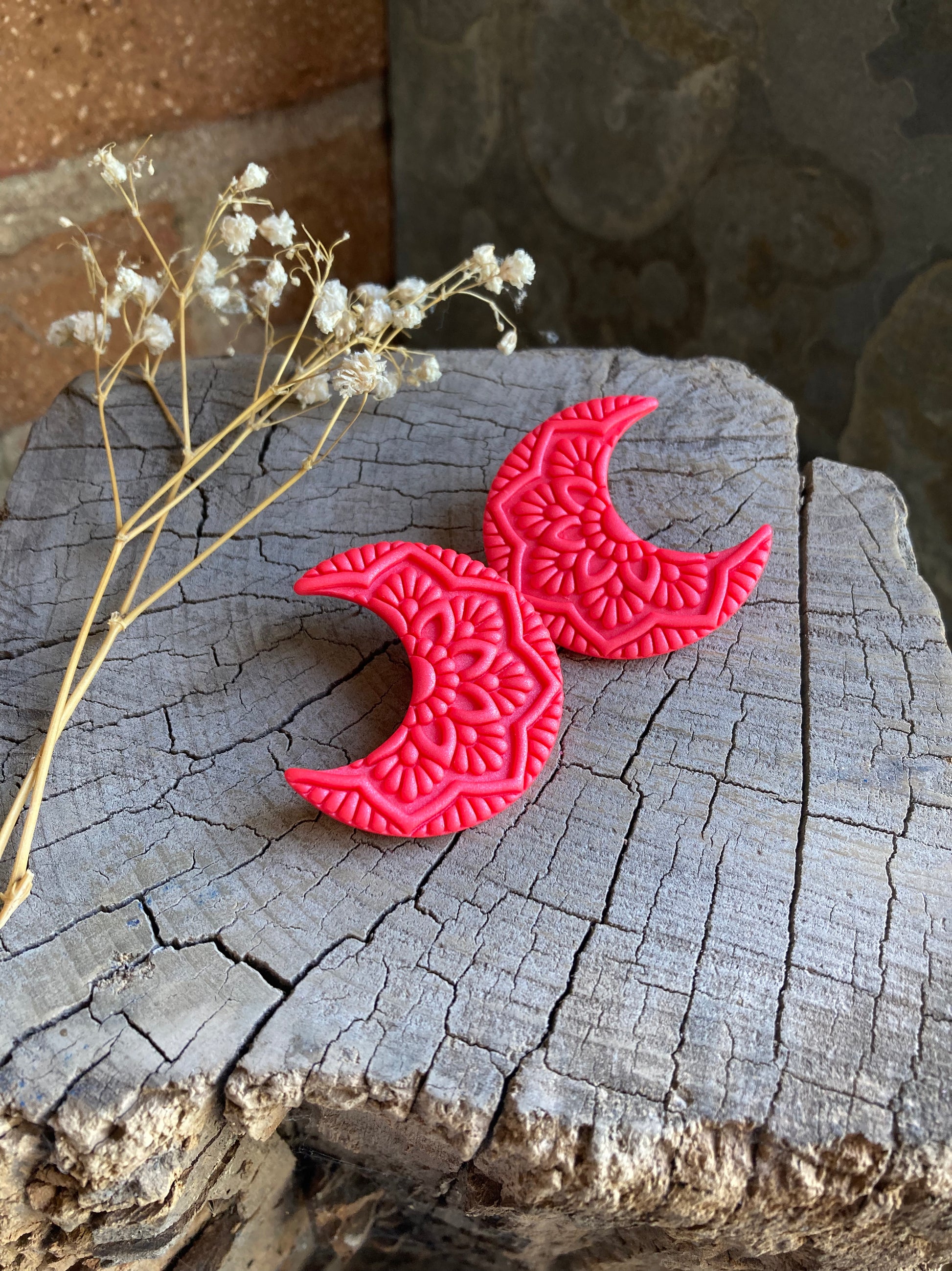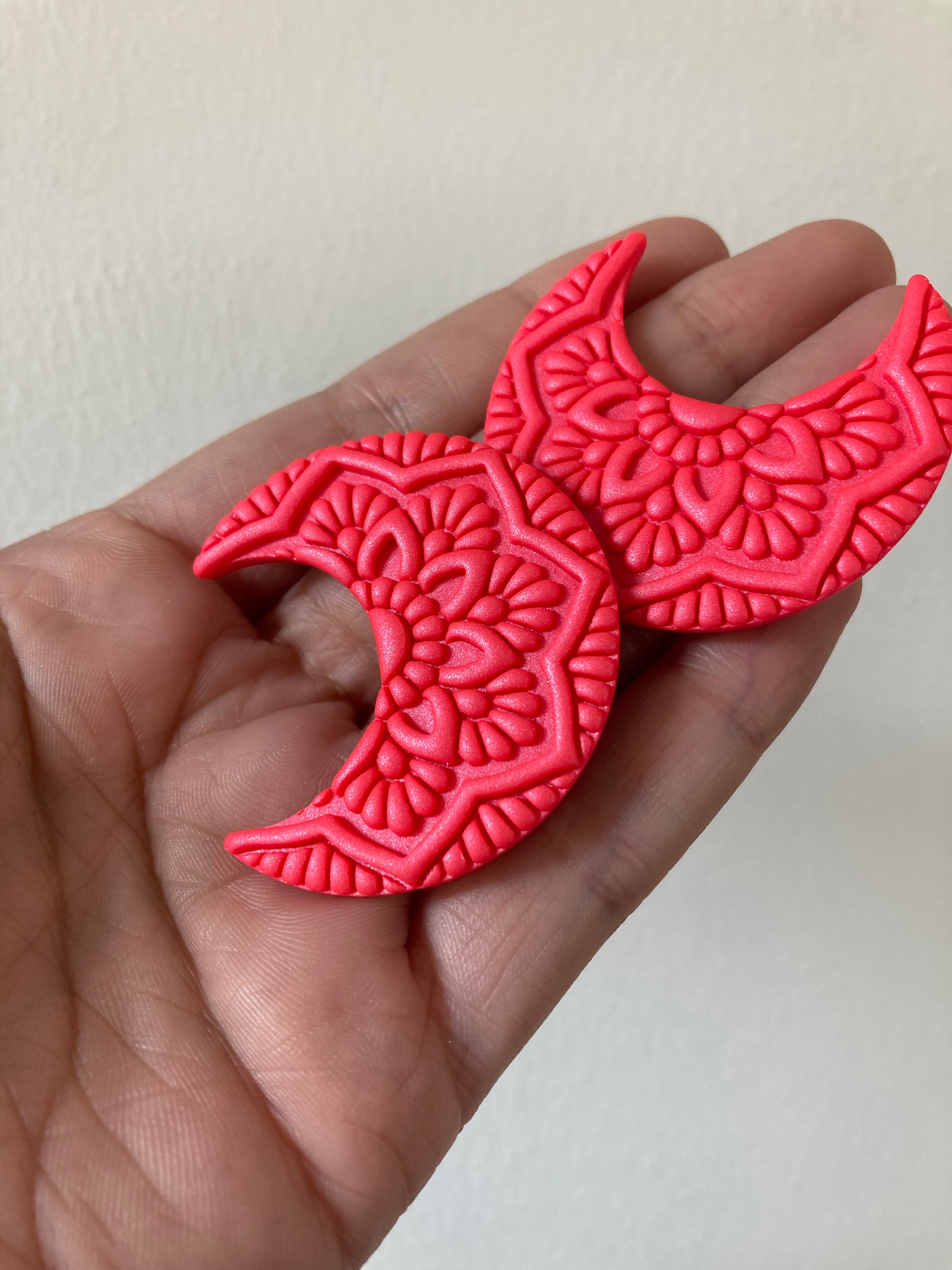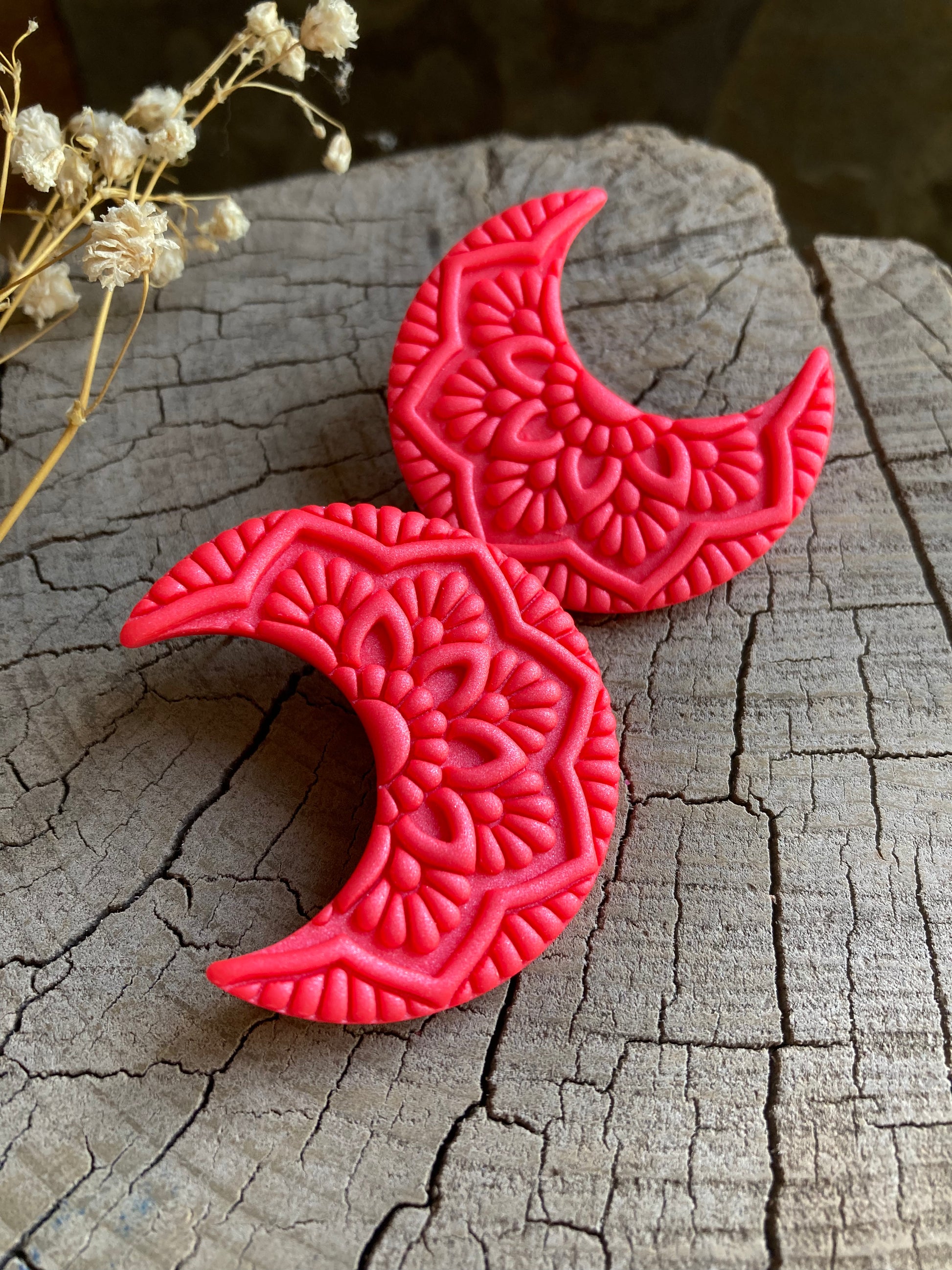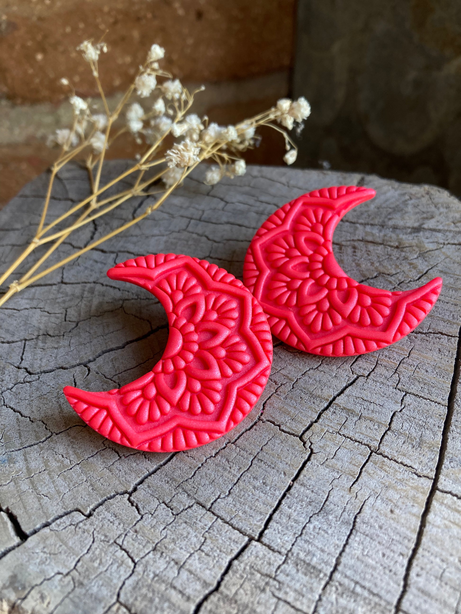 Aros de arcilla polimérica con diseño en relieve. Miden 4,5 cms. Palito de acero quirúrgico y tope de goma.