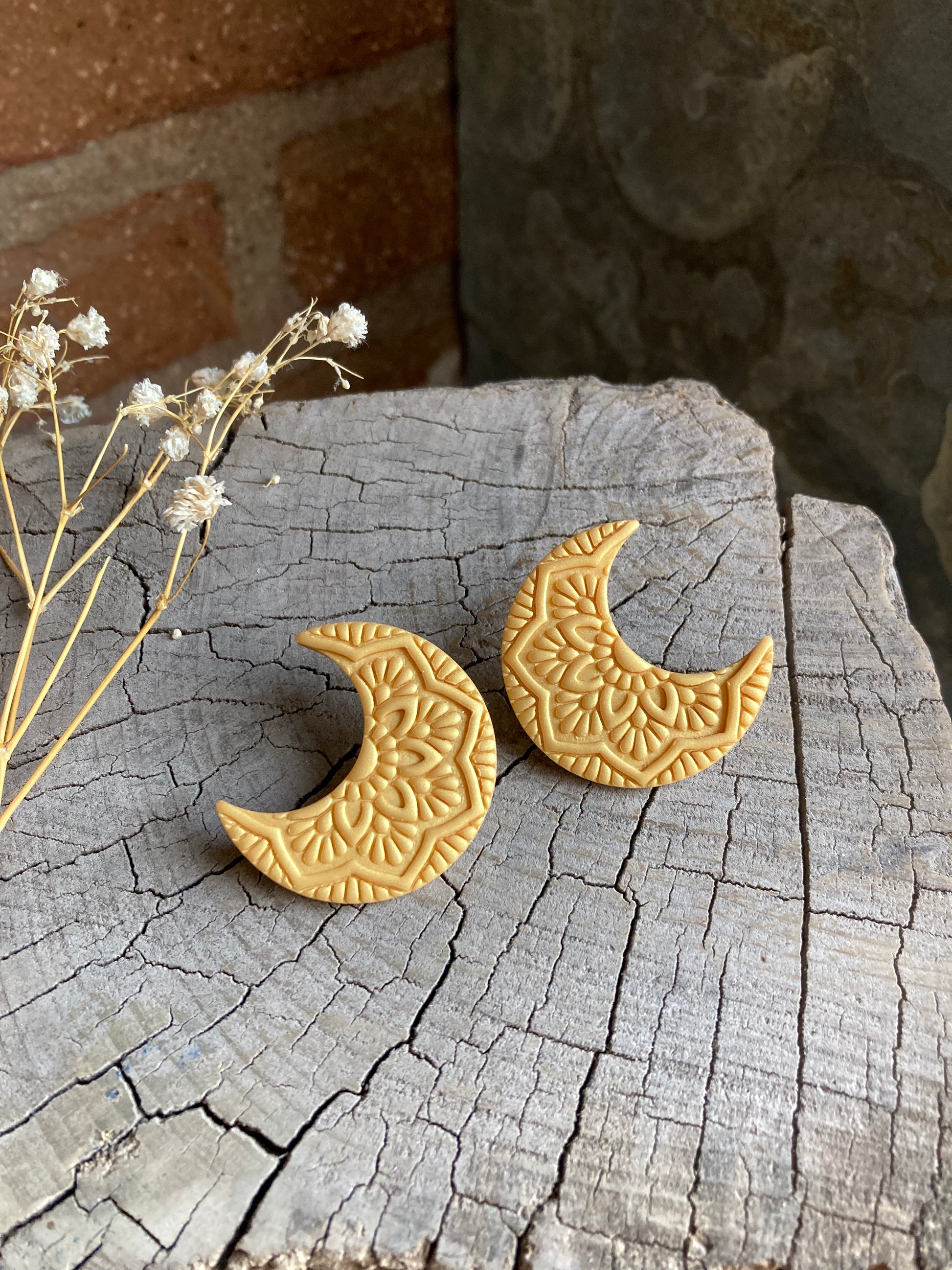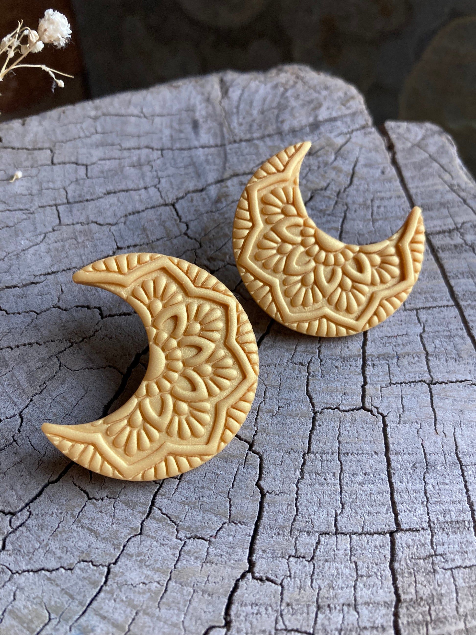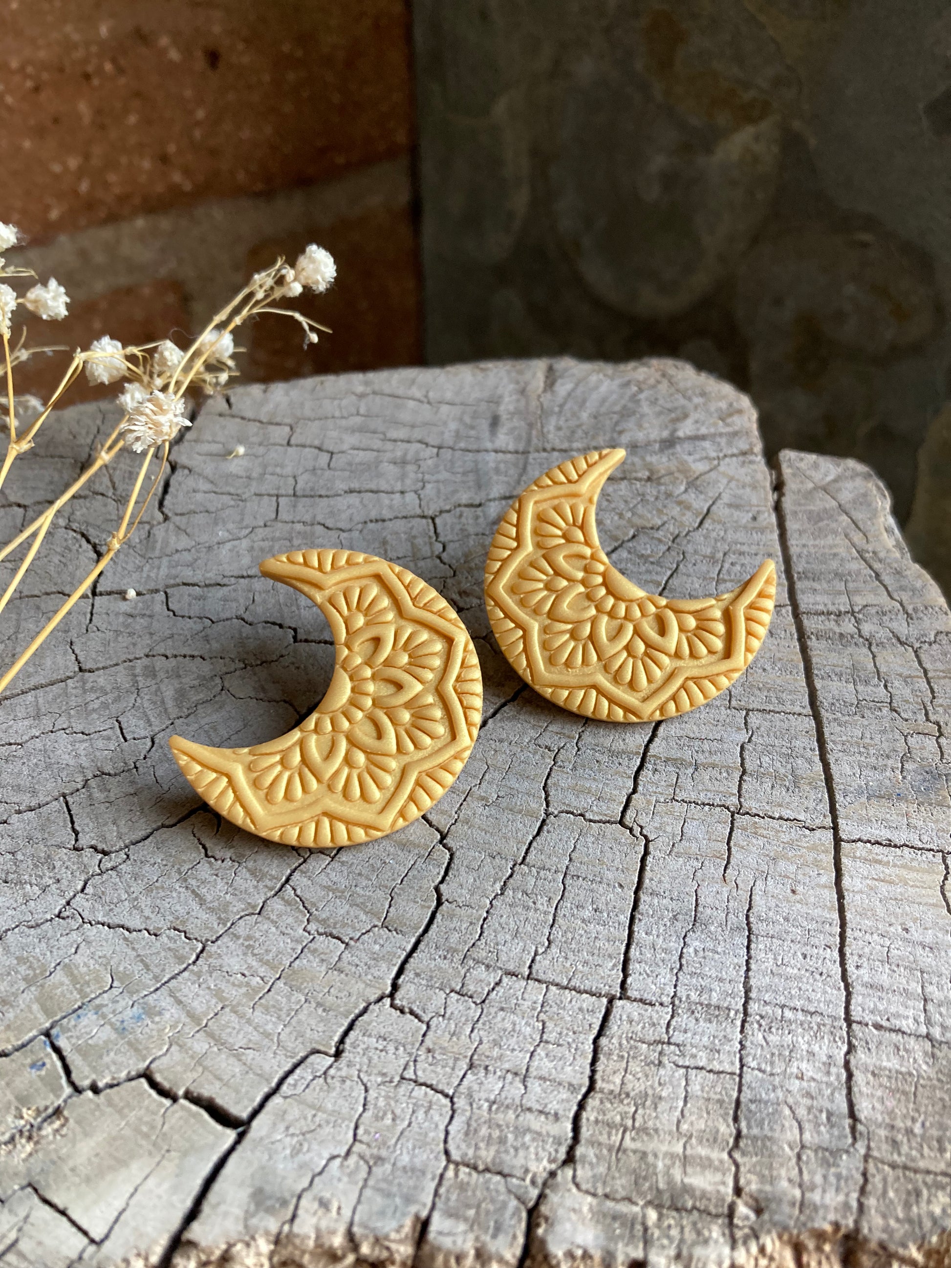 Aros de arcilla polimérica con diseño en relieve. Miden 3,7 cms. Palito de acero quirúrgico y tope de goma.