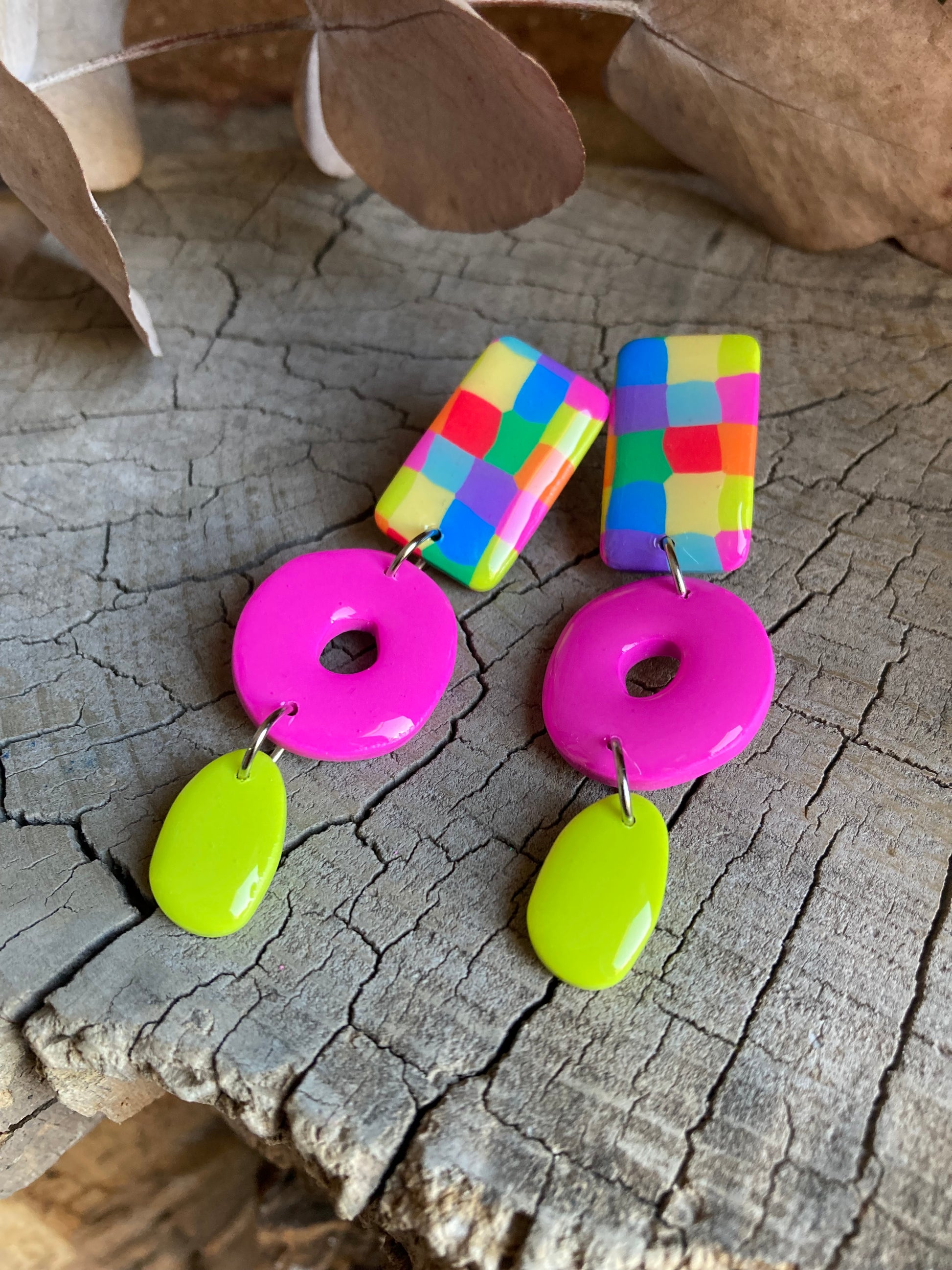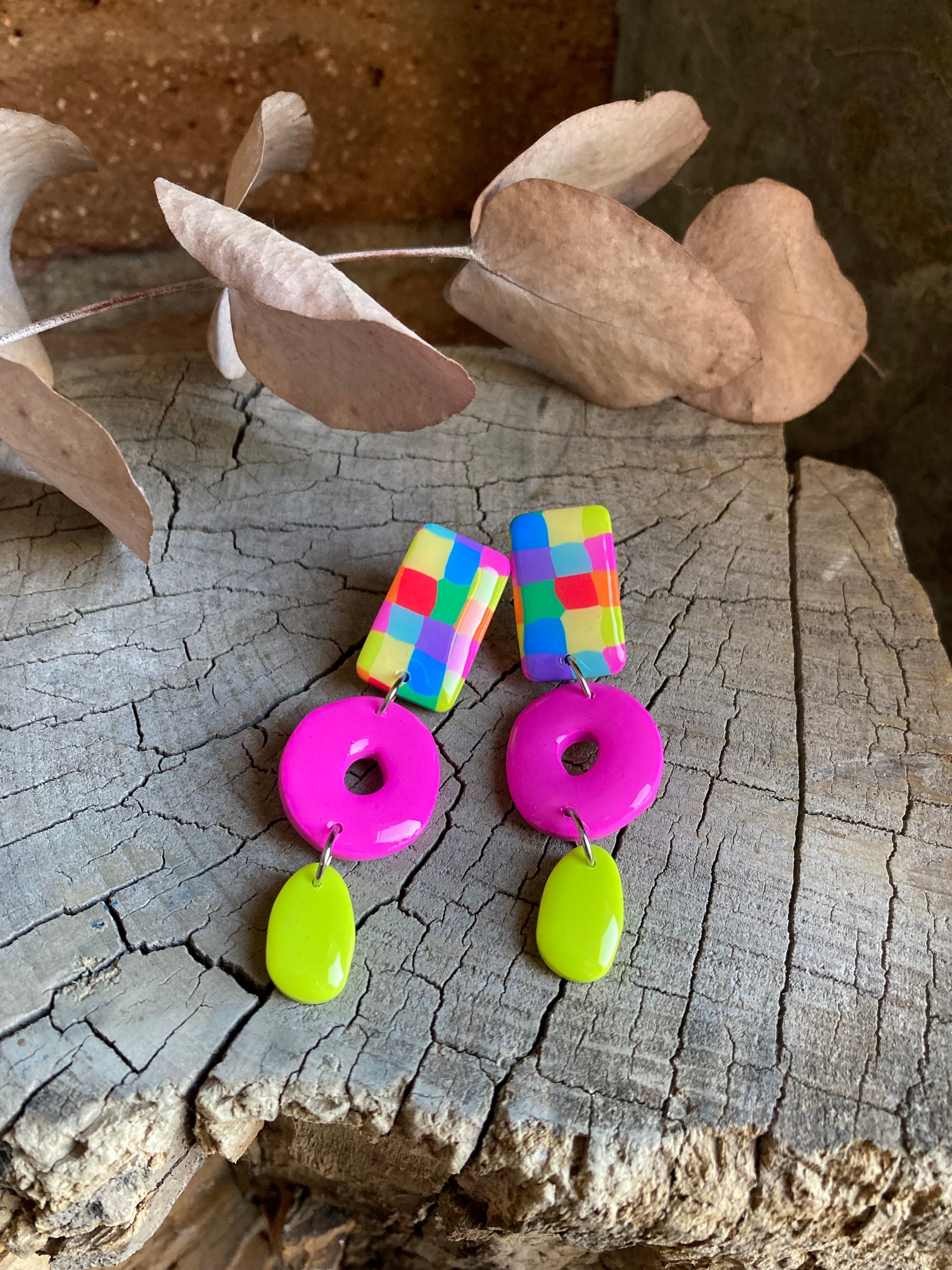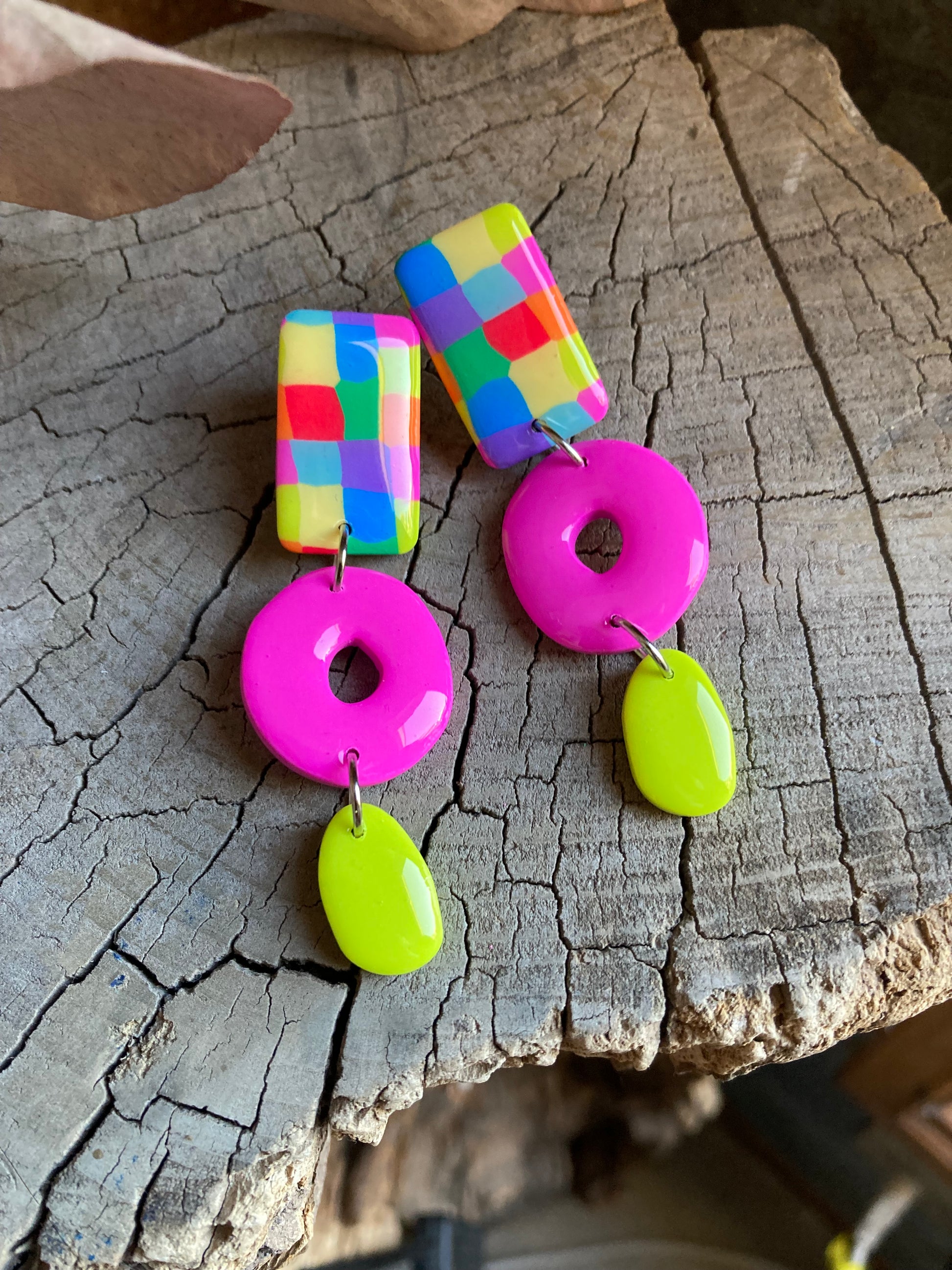 Aros de arcilla polimérica con top coat de resina uv. Miden 6,6 cms. Palito de acero quirúrgico y tope de goma.