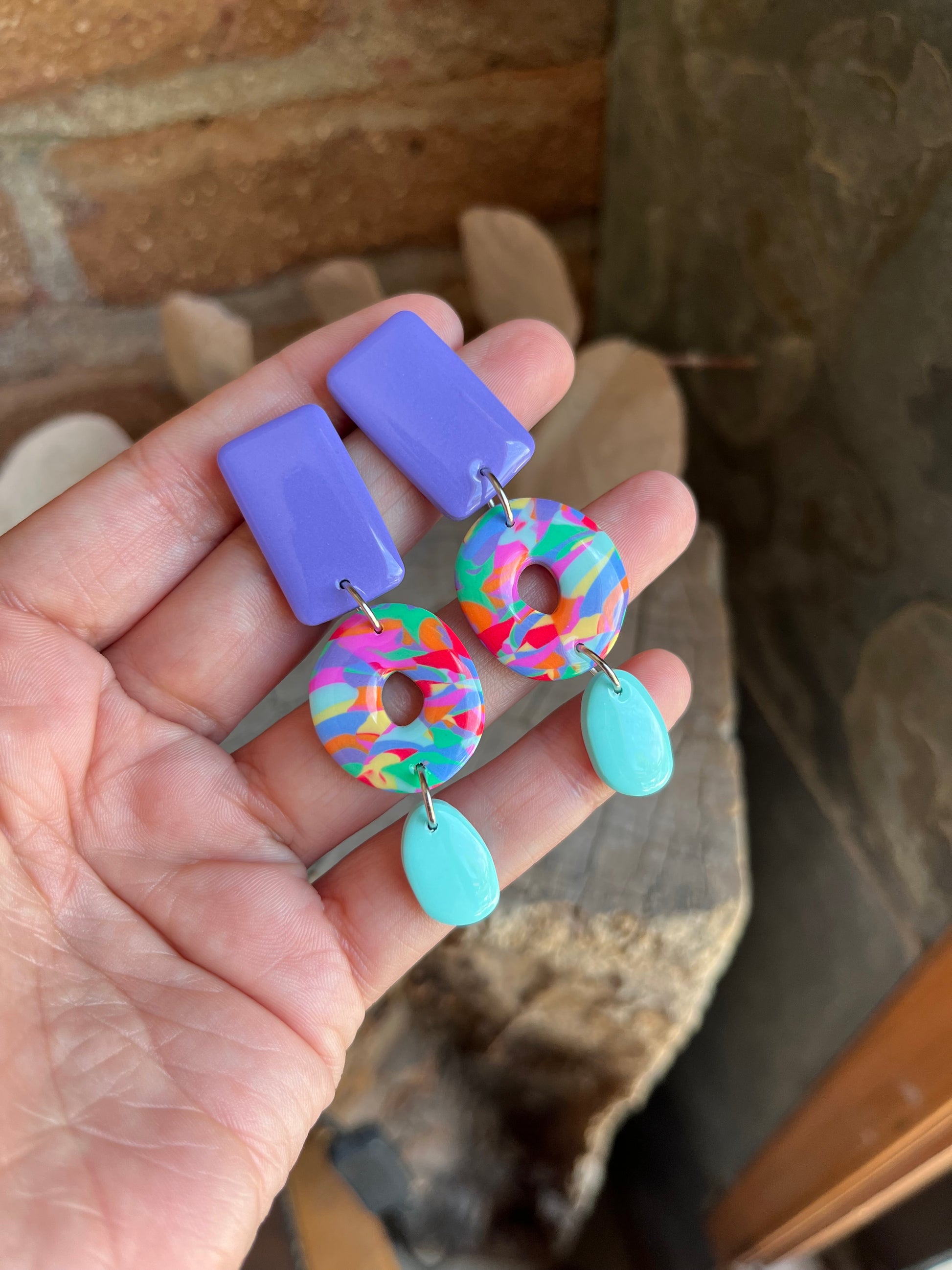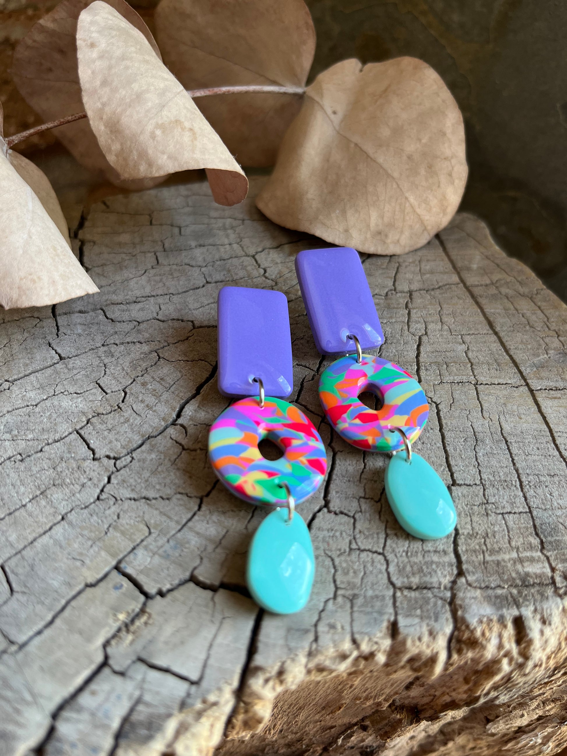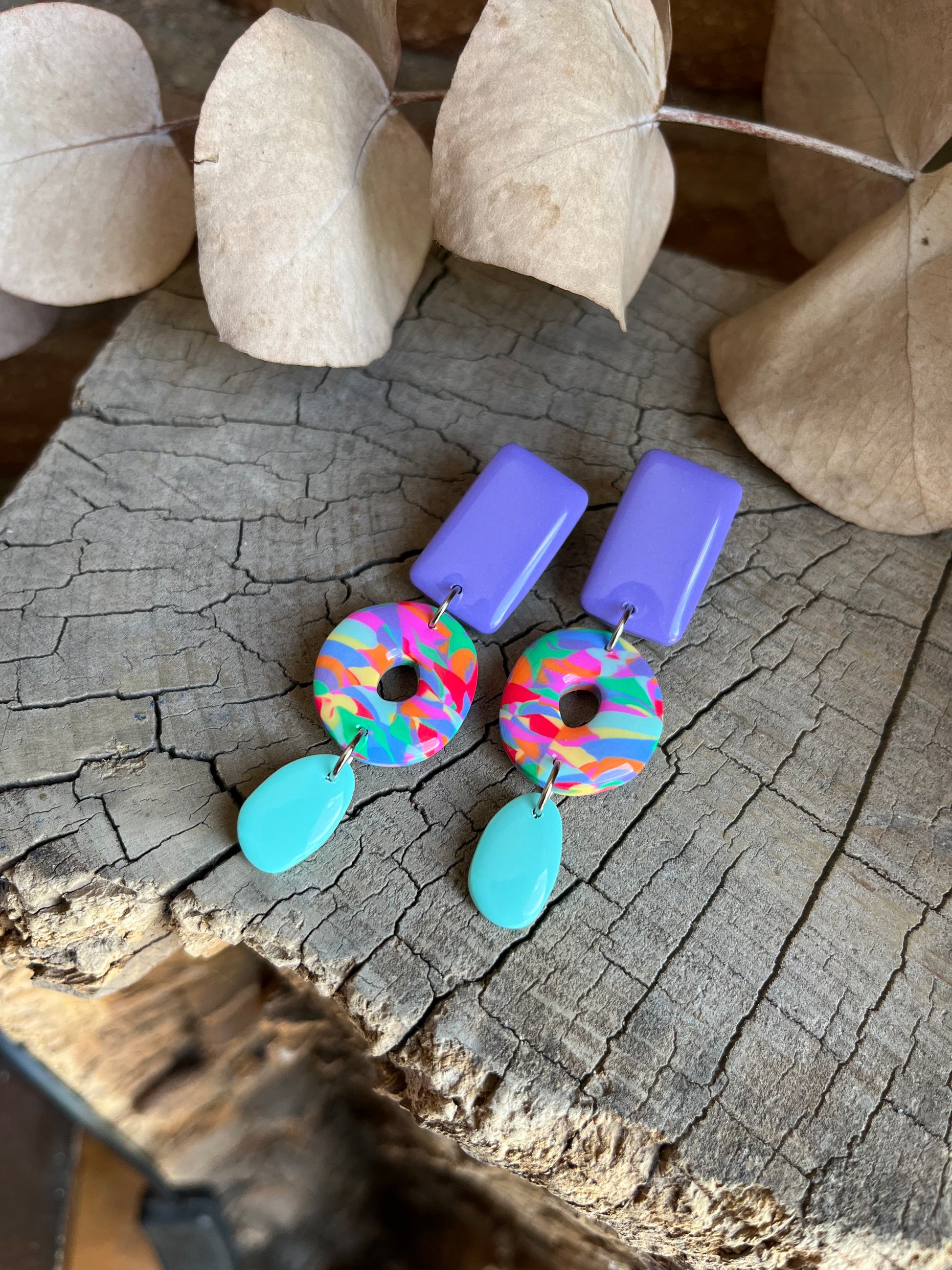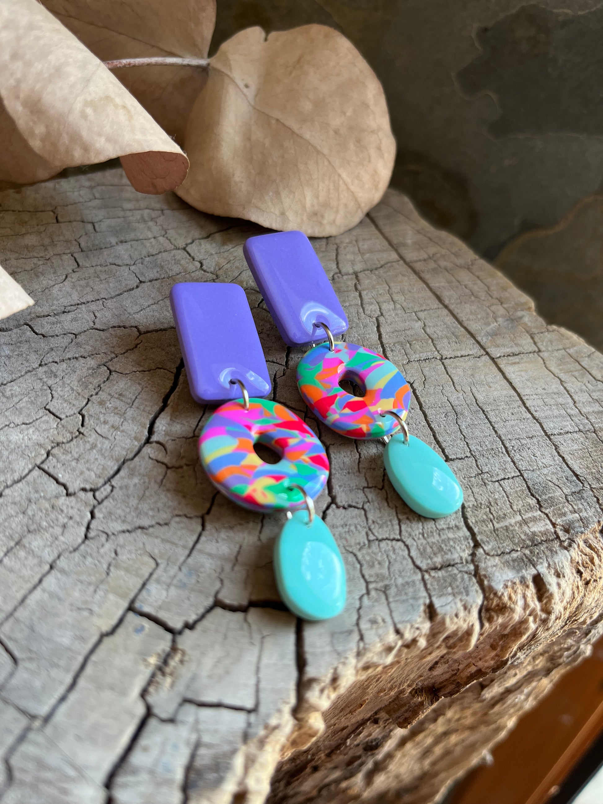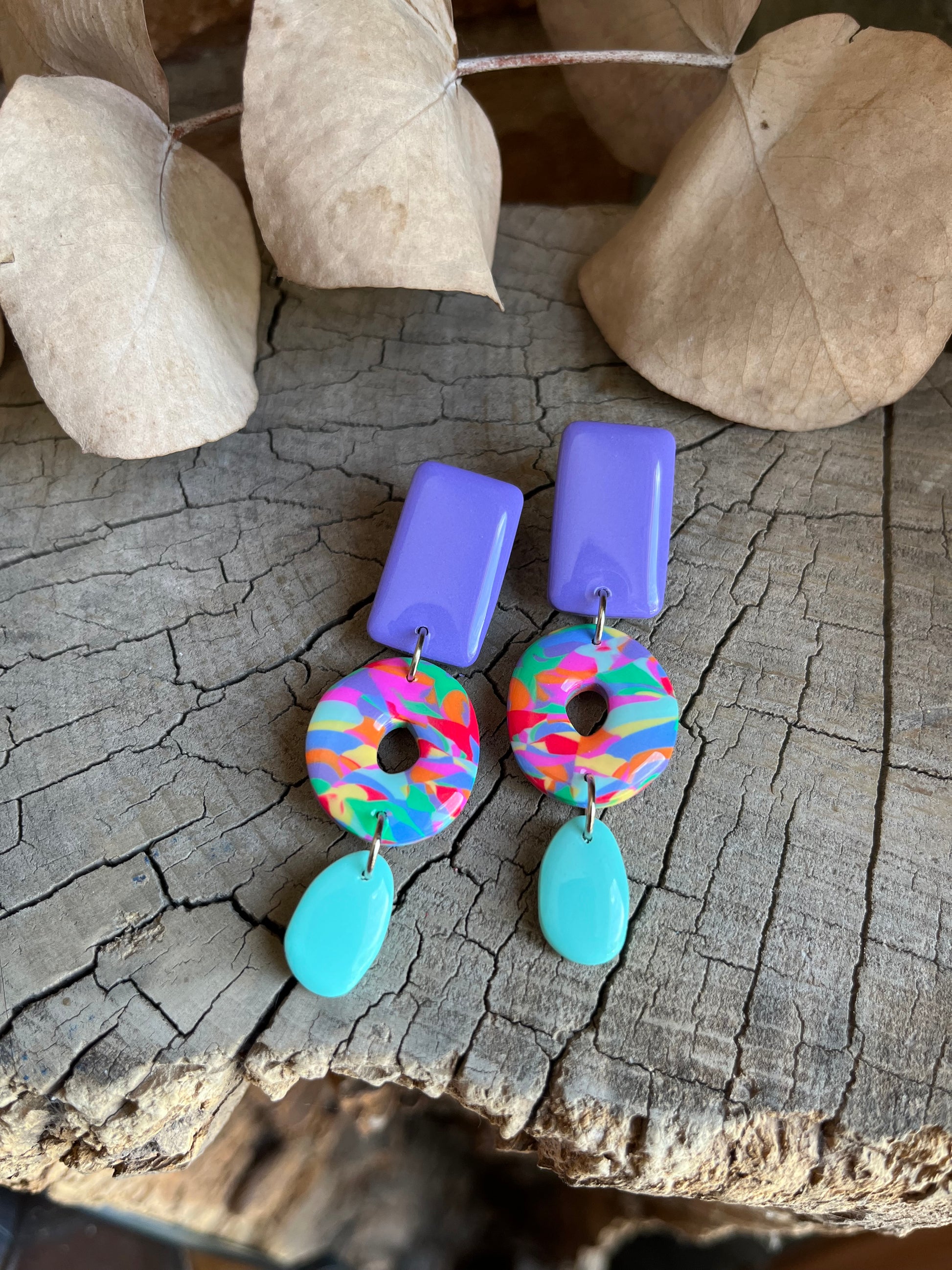 Aros de arcilla polimérica con top coat de resina uv. Miden 6,6 cms. Palito de acero quirúrgico y tope de goma.