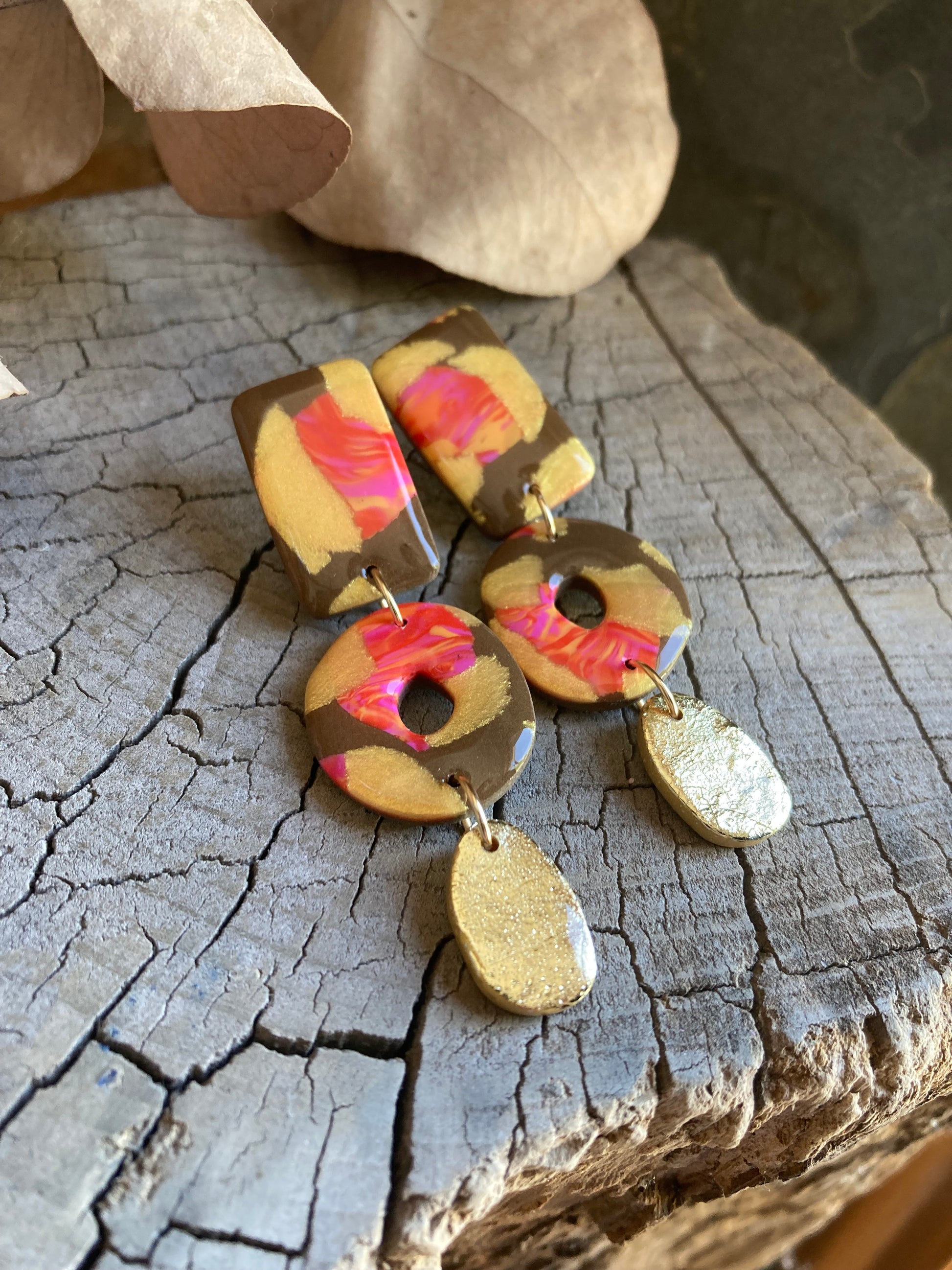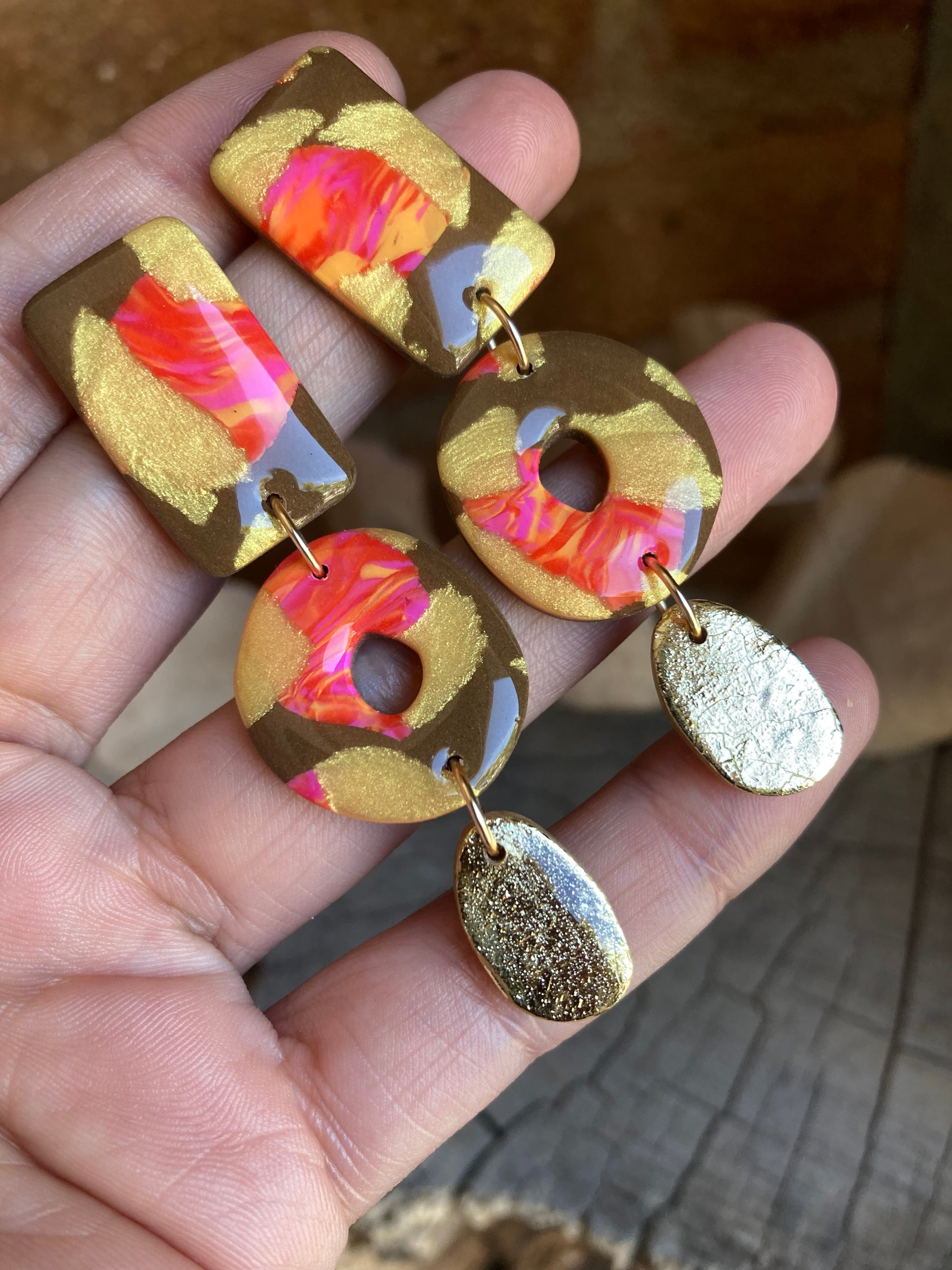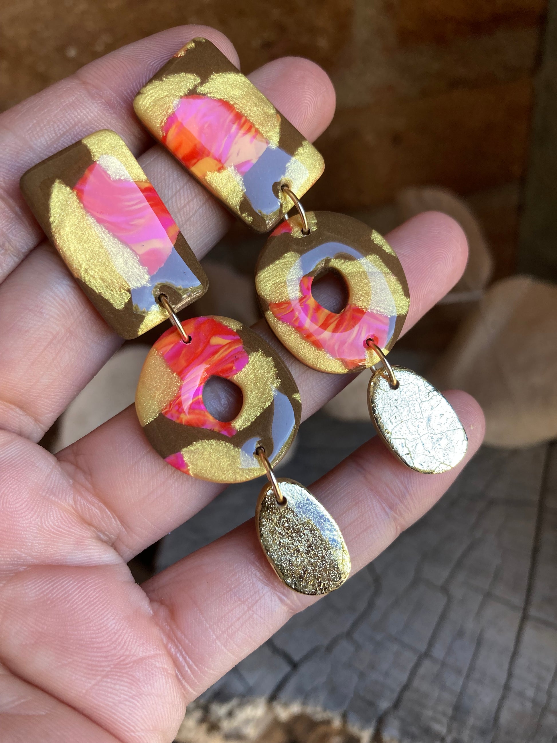 Aros de arcilla polimérica con top coat de resina uv. Miden 6,6 cms. Palito de acero quirúrgico y tope de goma.