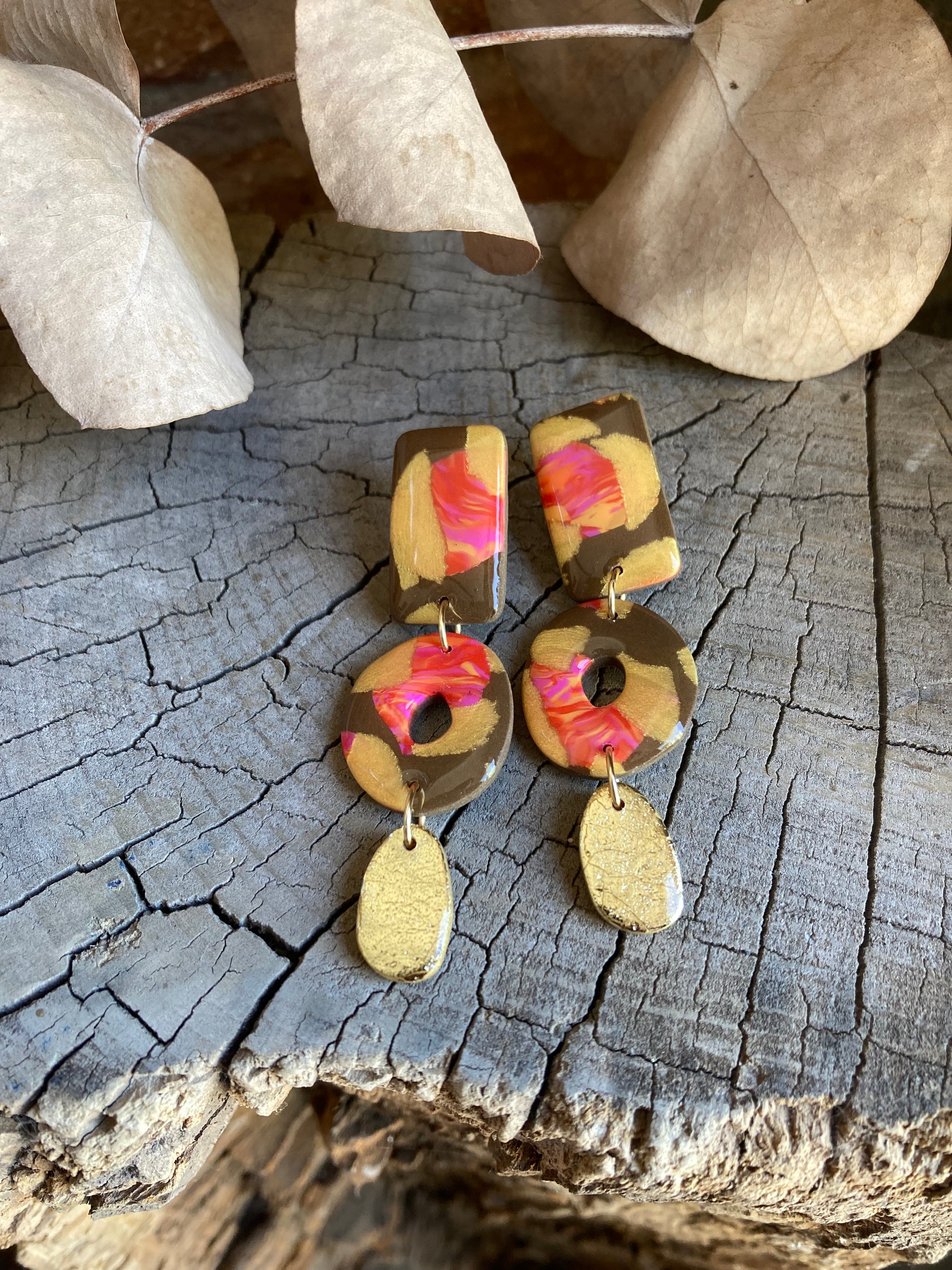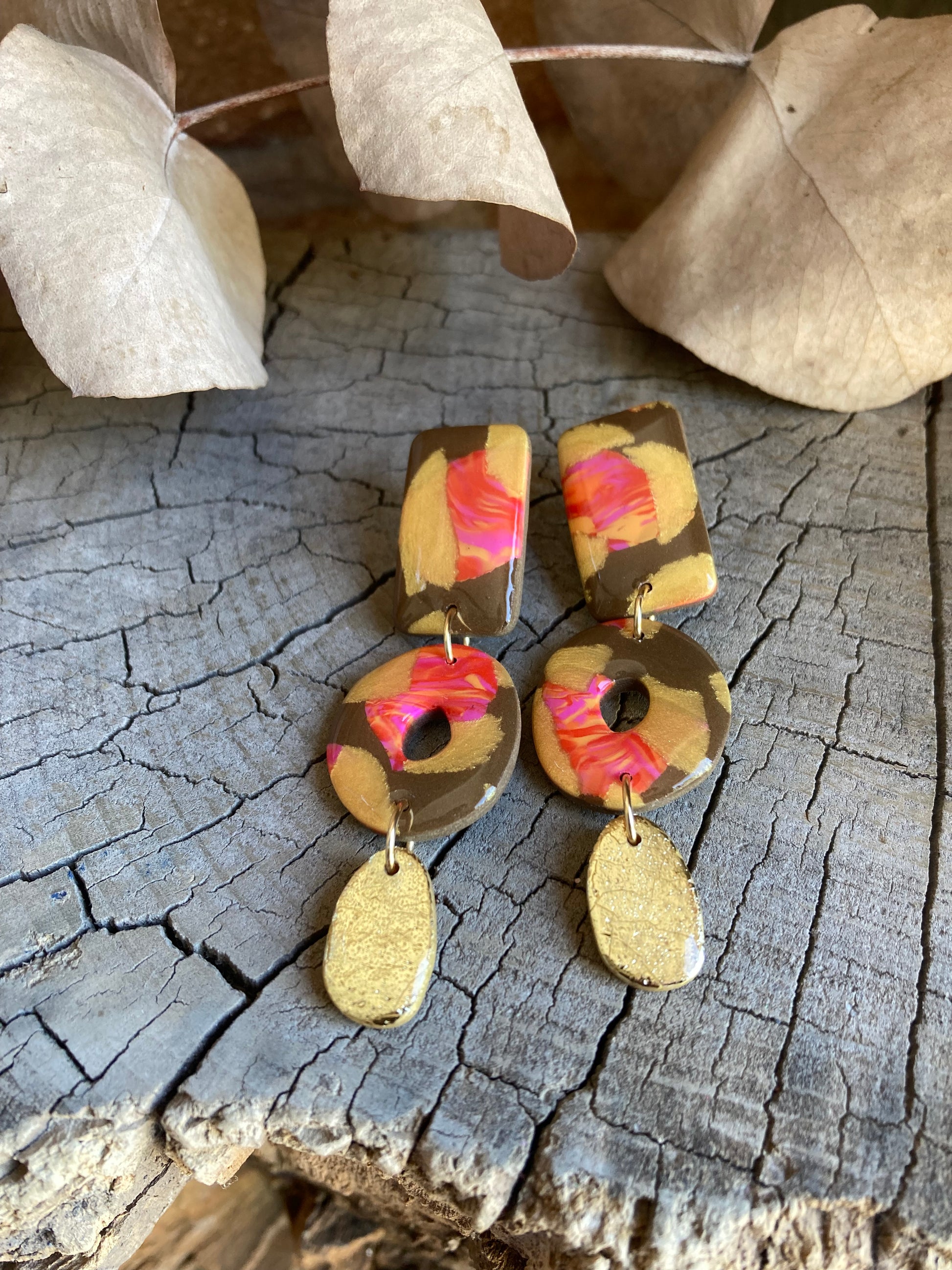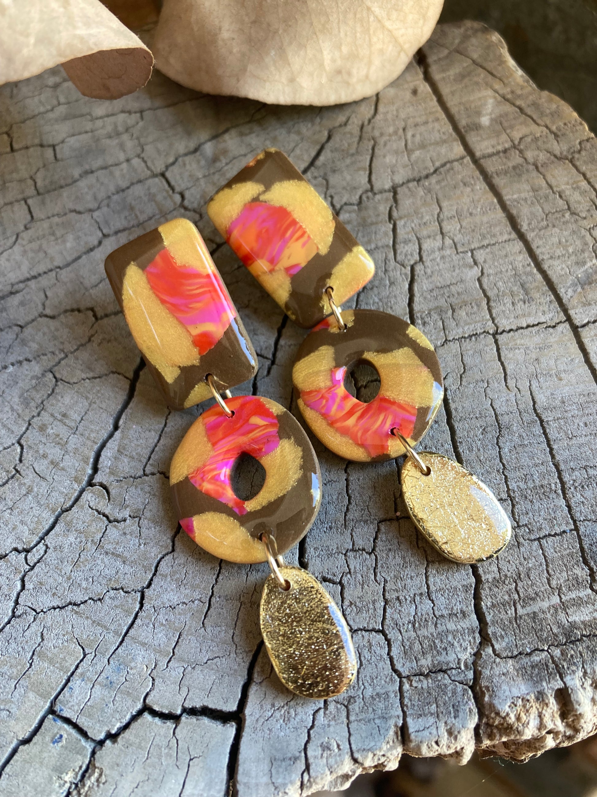 Aros de arcilla polimérica con top coat de resina uv. Miden 6,6 cms. Palito de acero quirúrgico y tope de goma.