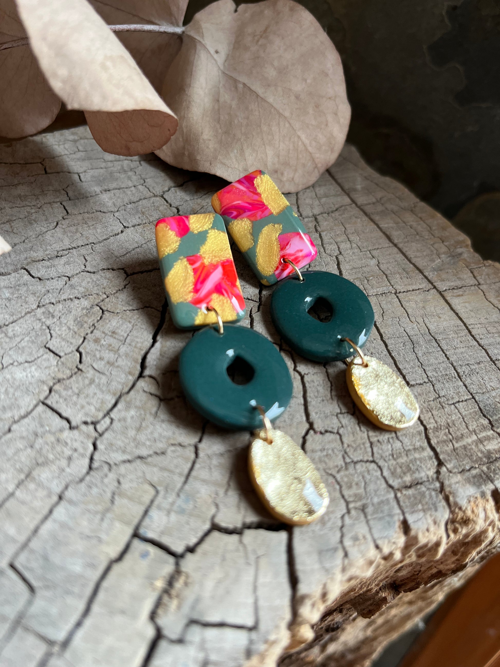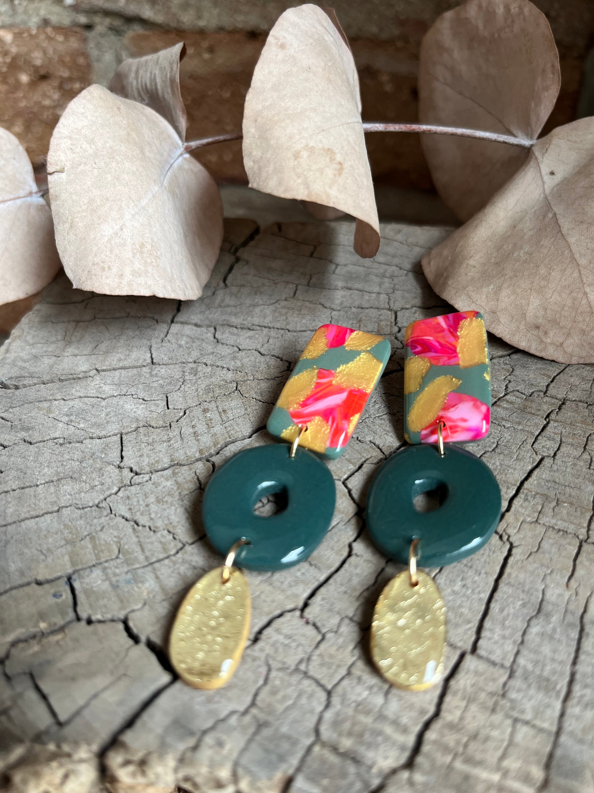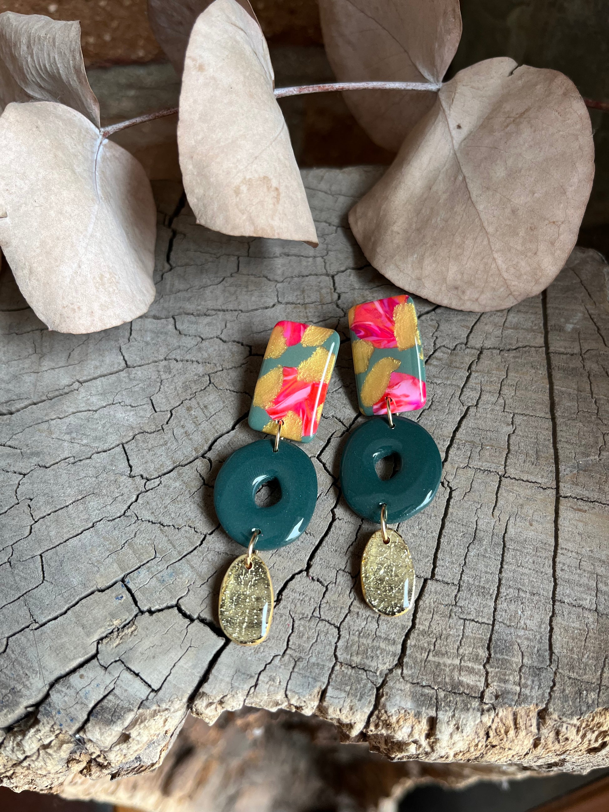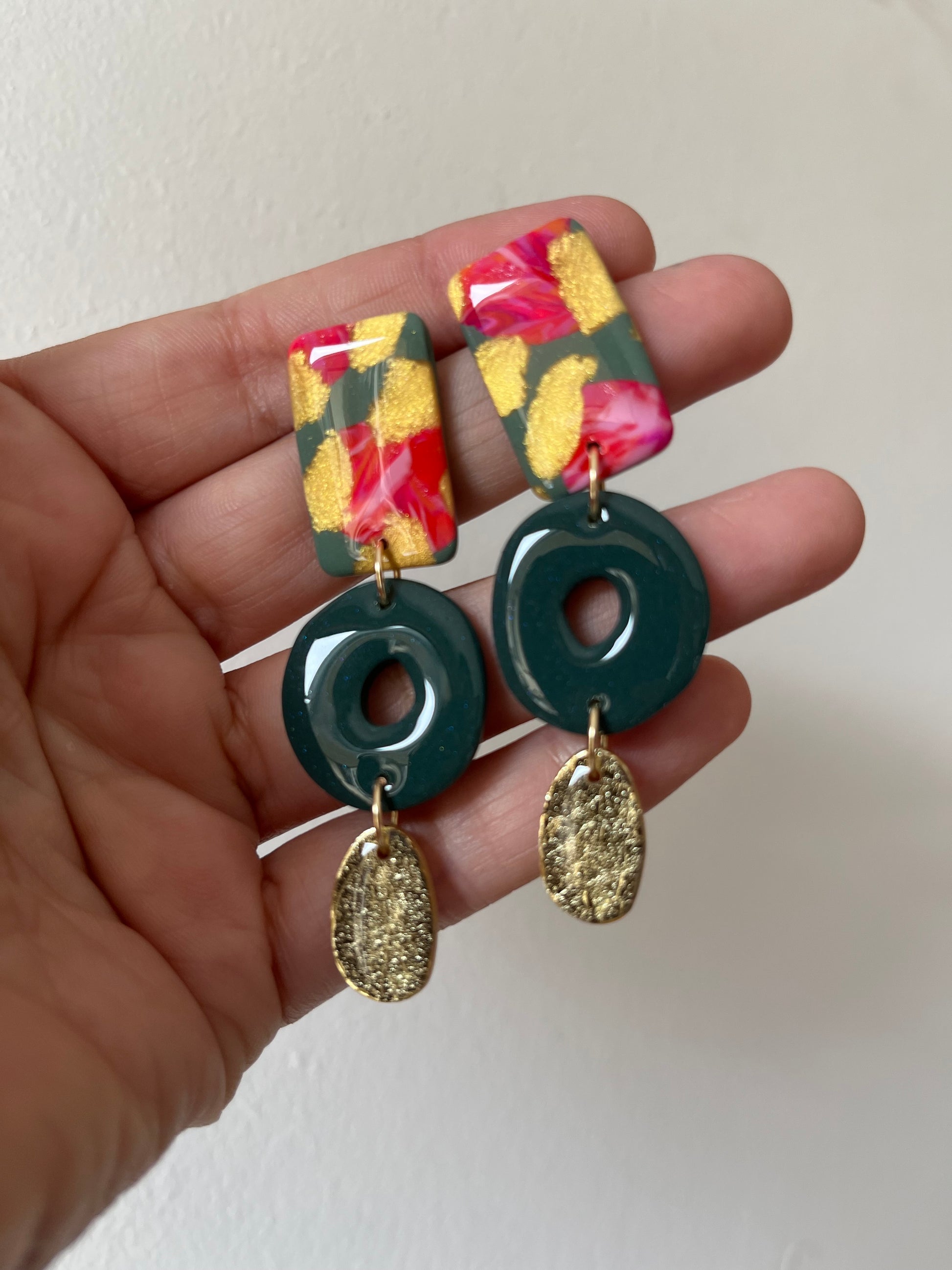 Aros de arcilla polimérica con top coat de resina uv. Miden 6,6 cms. Palito de acero quirúrgico y tope de goma.