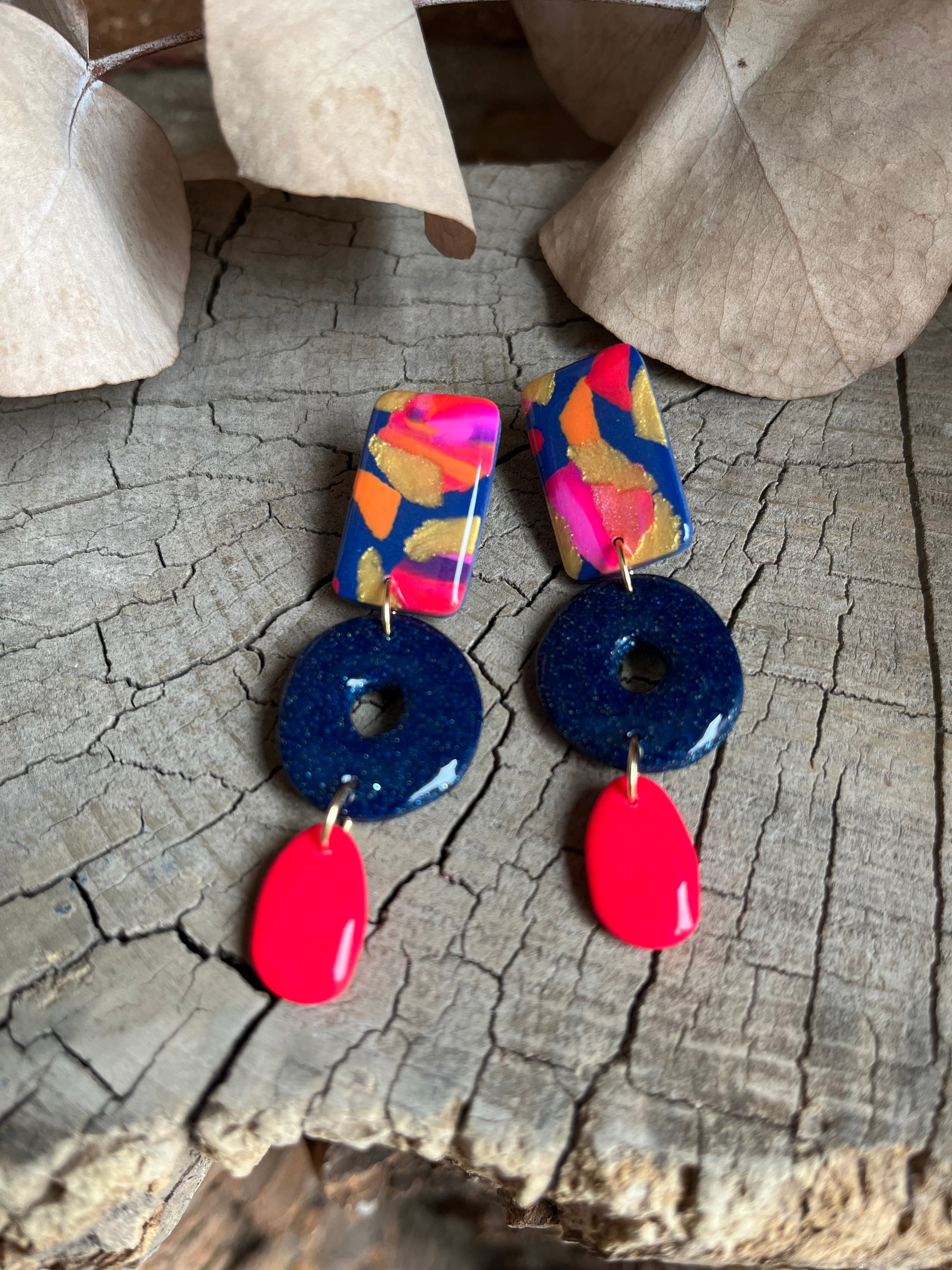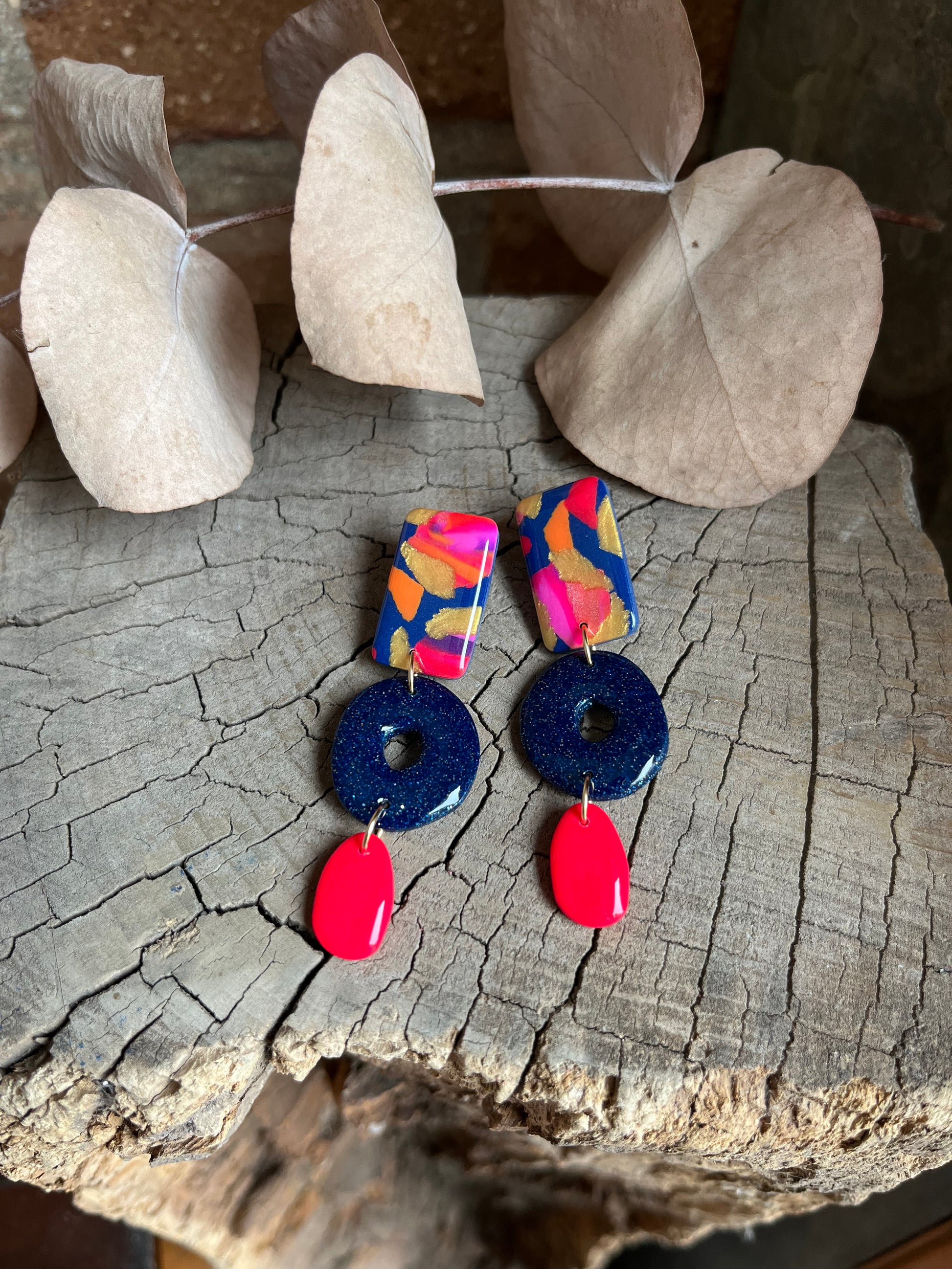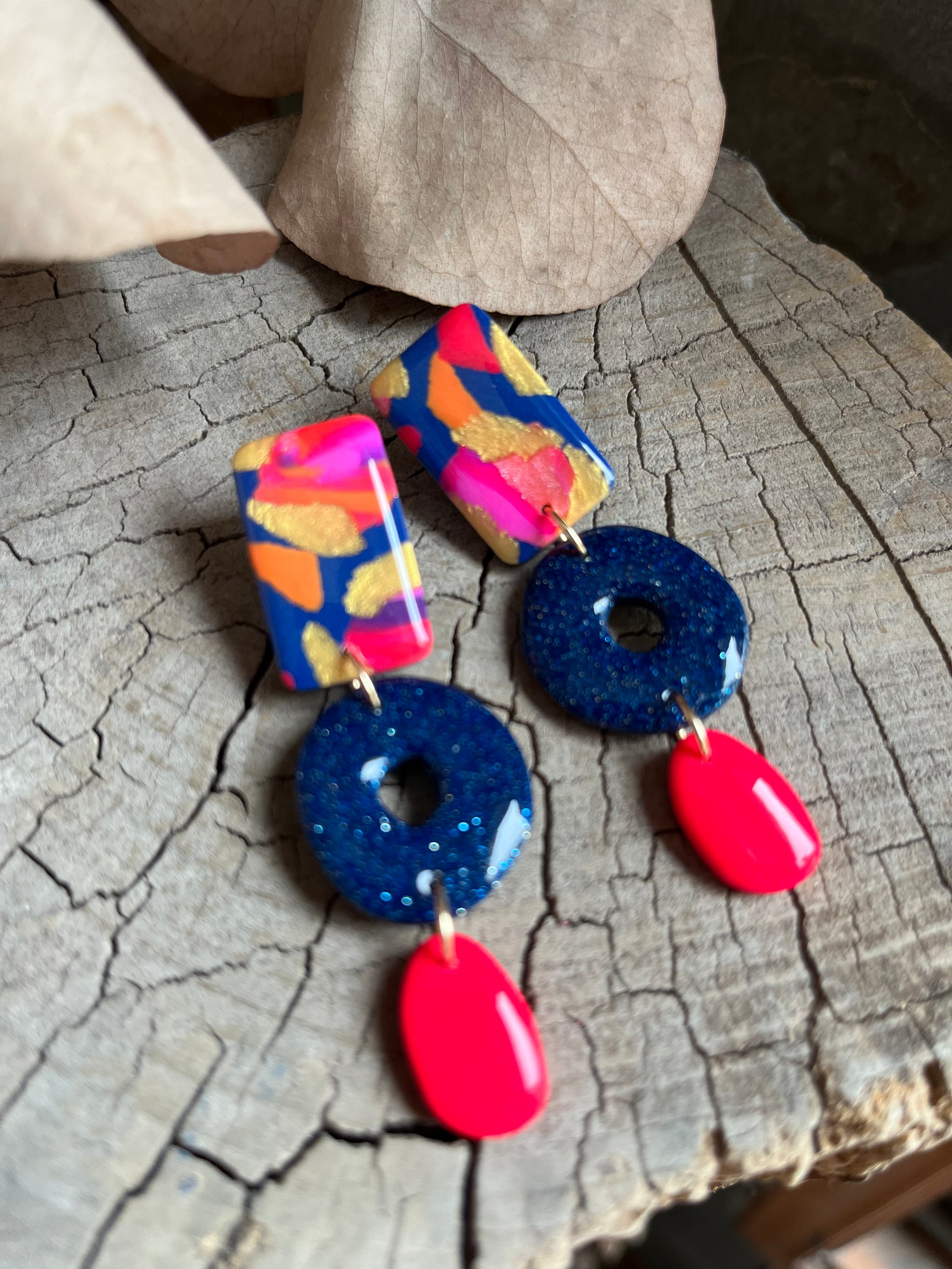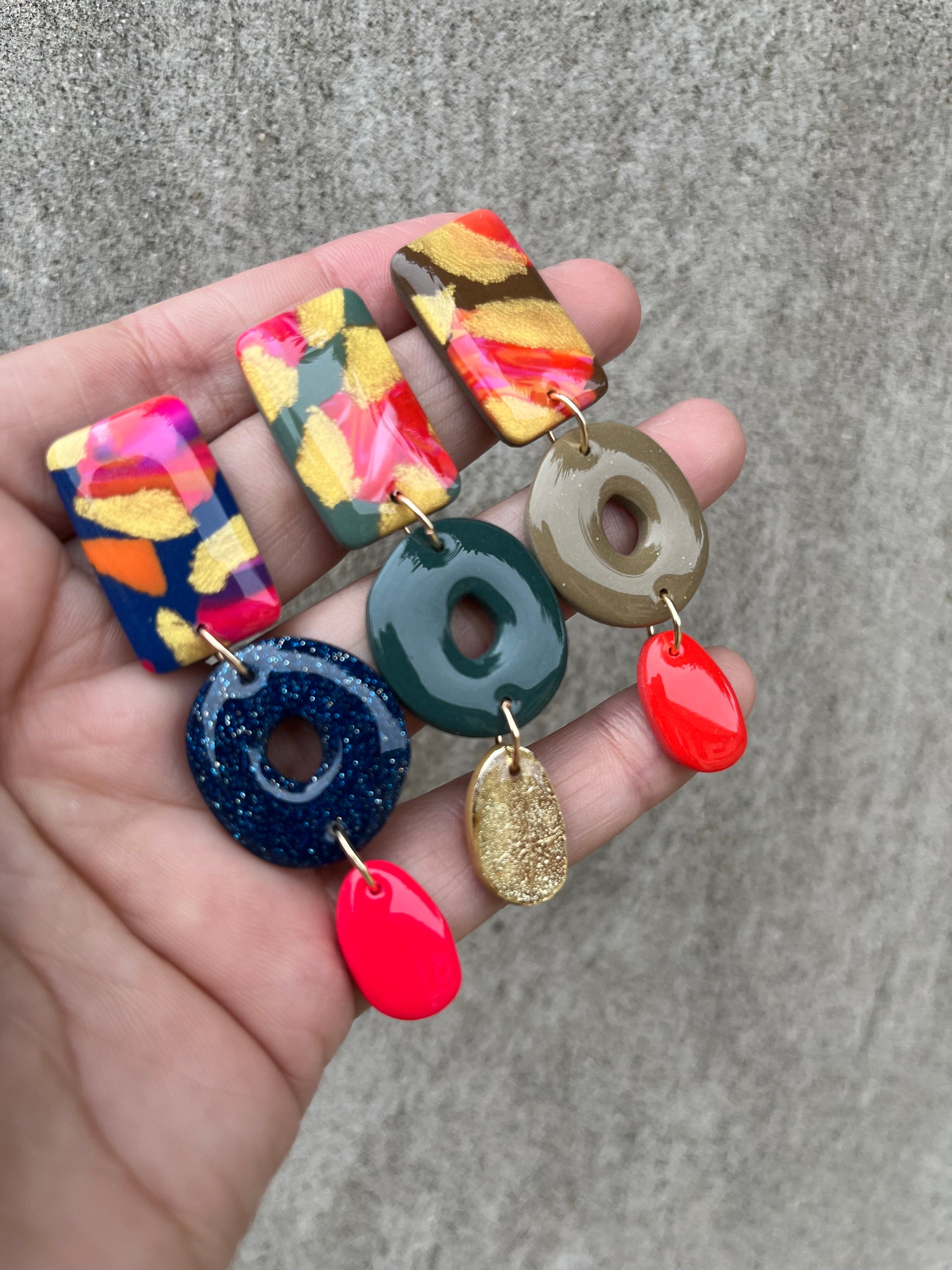 Aros de arcilla polimérica con top coat de resina uv. Miden 6,6 cms. Palito de acero quirúrgico y tope de goma.