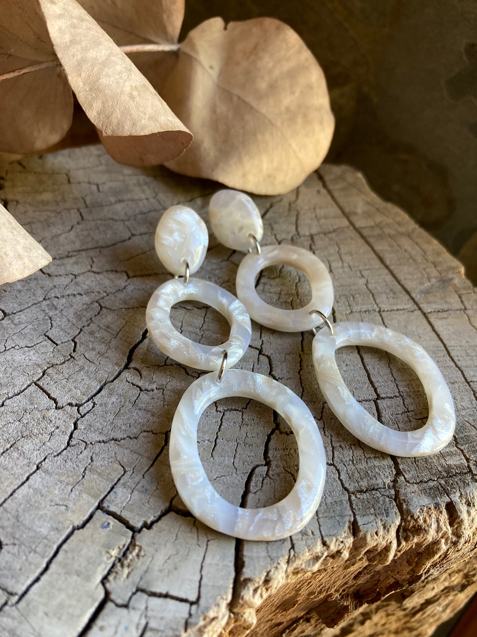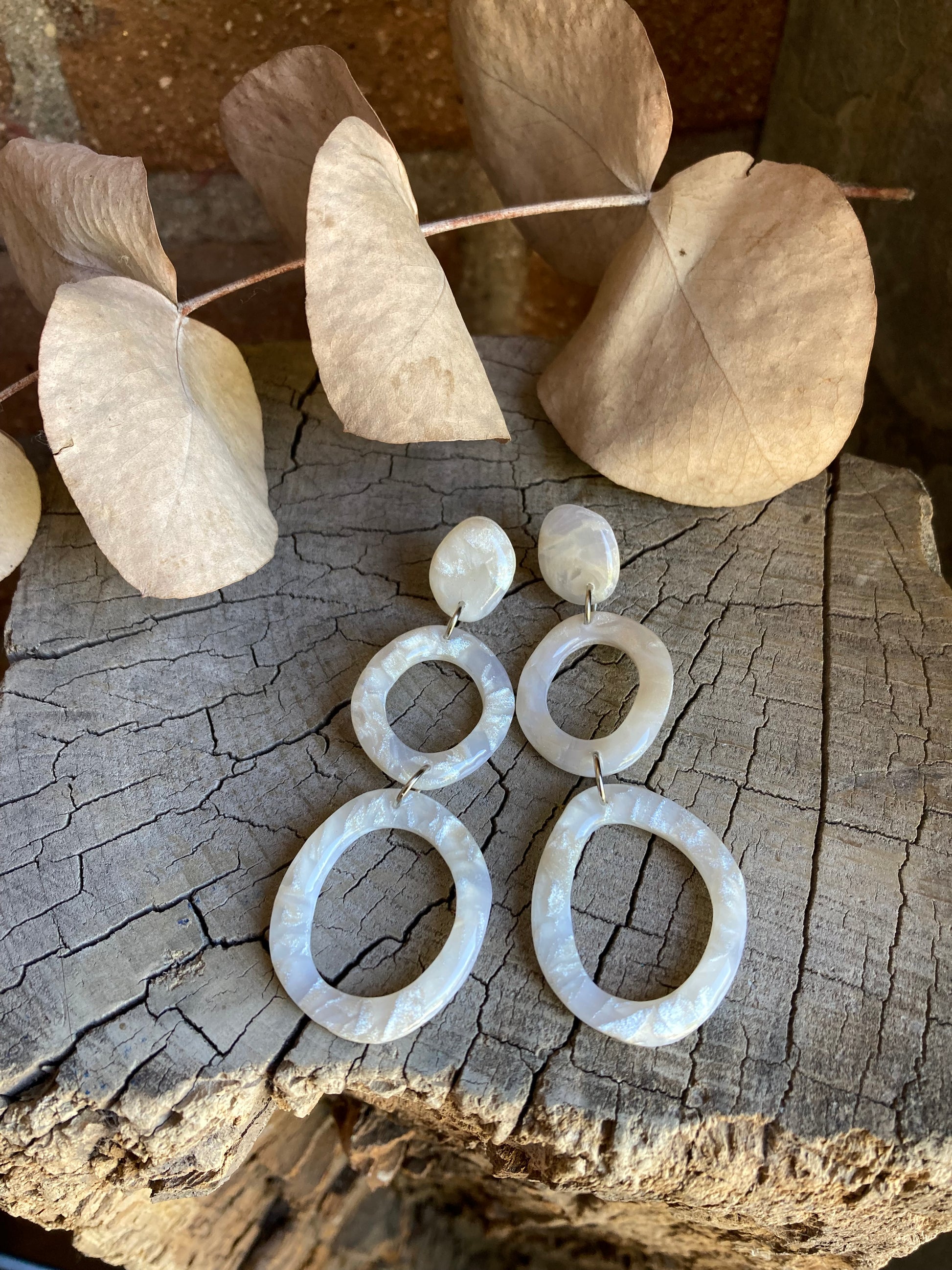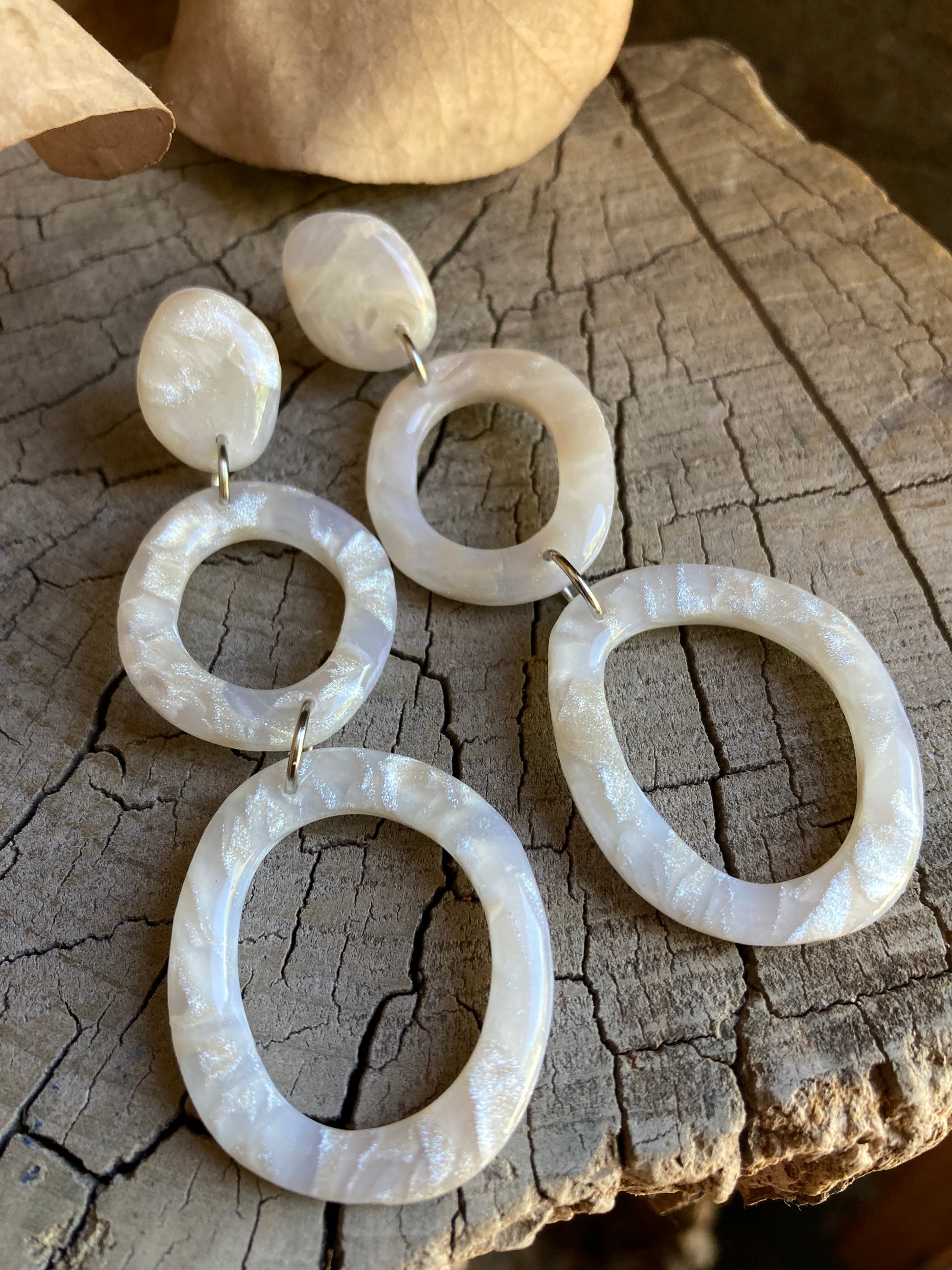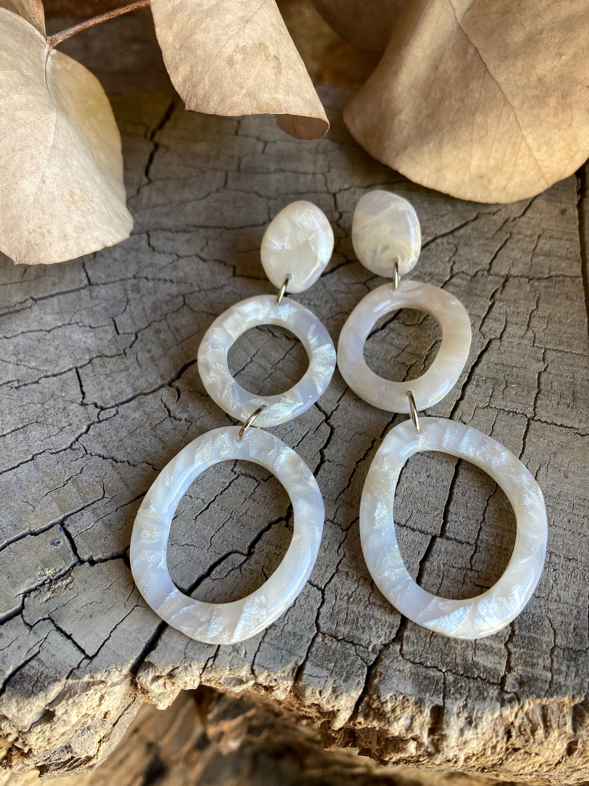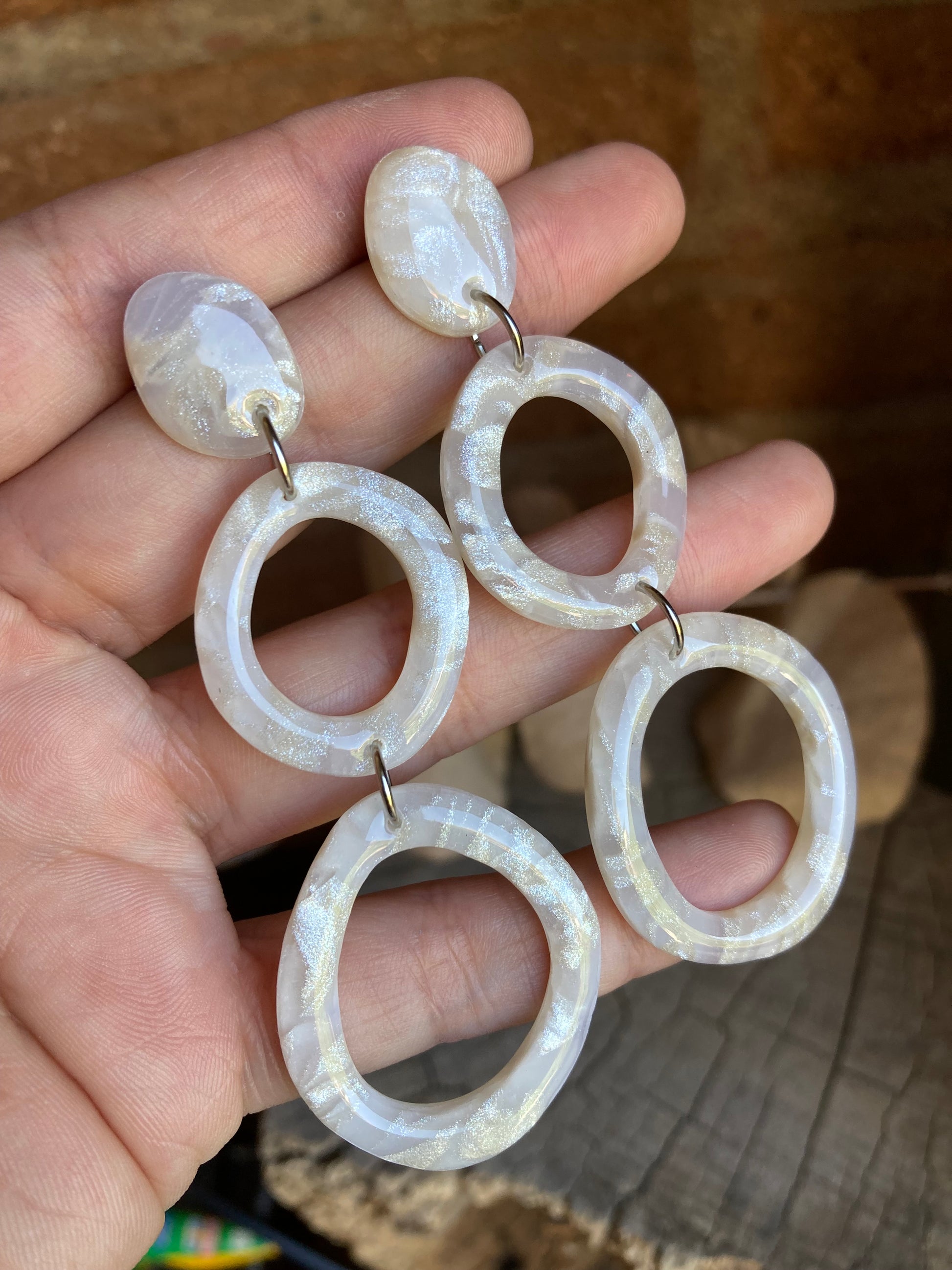 Aros de arcilla polimérica con top coat de resina uv. Miden 7 cms. Palito de acero quirúrgico y tope de goma.