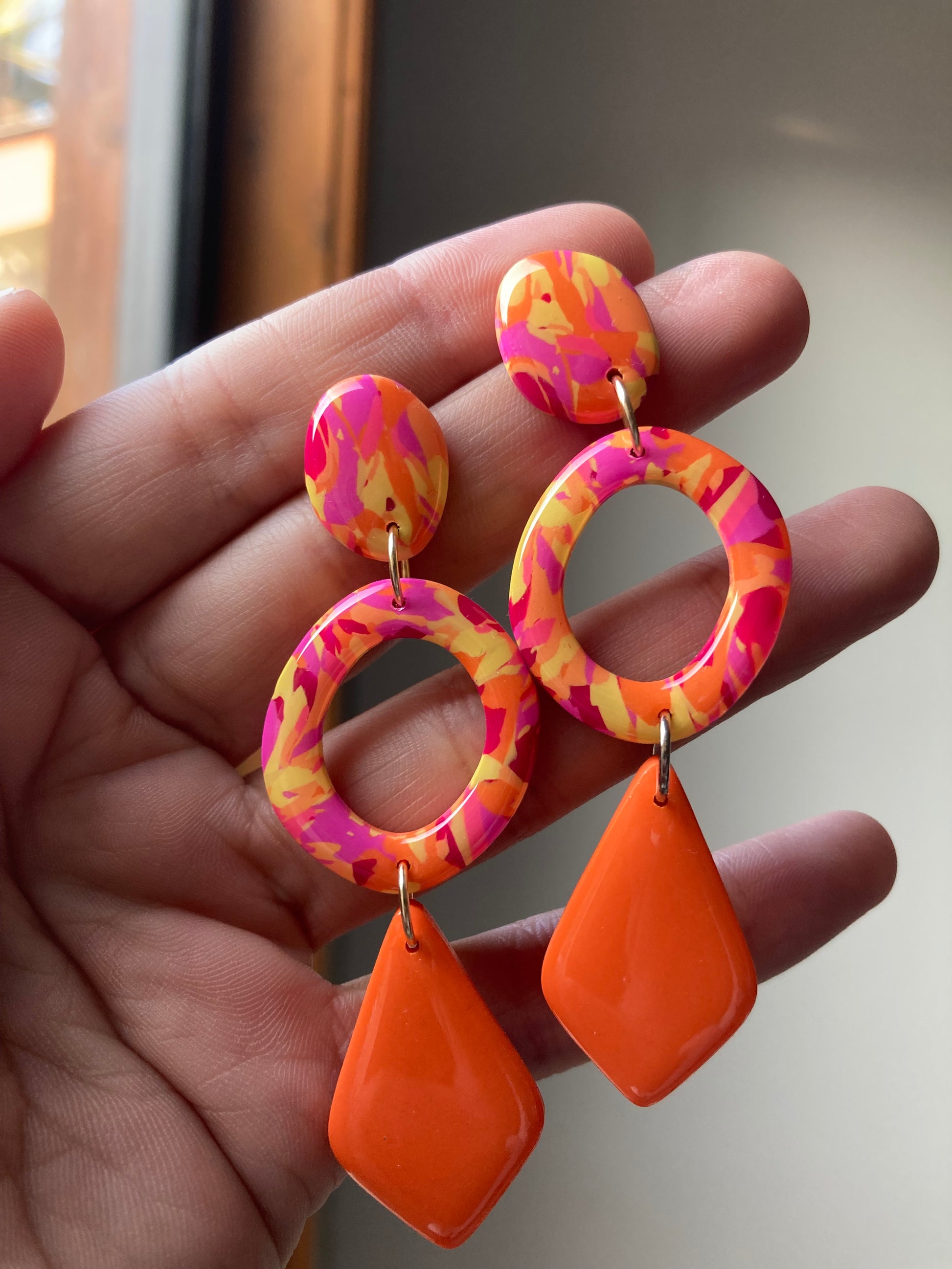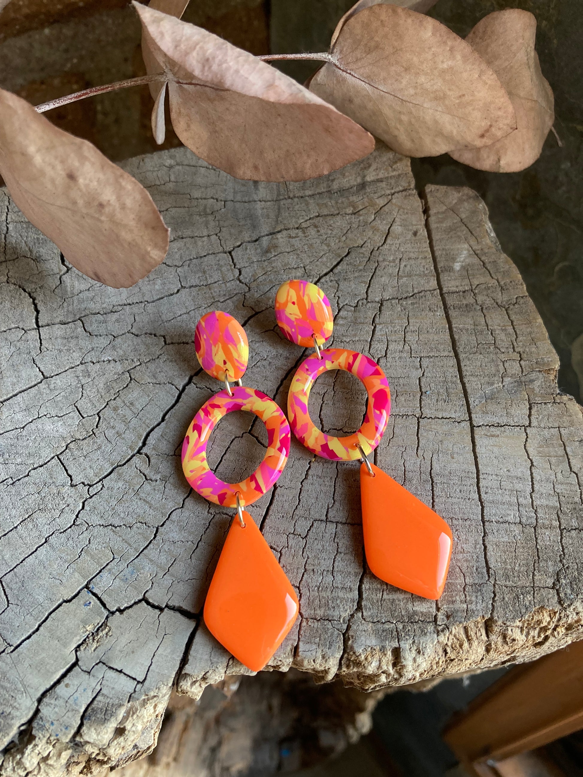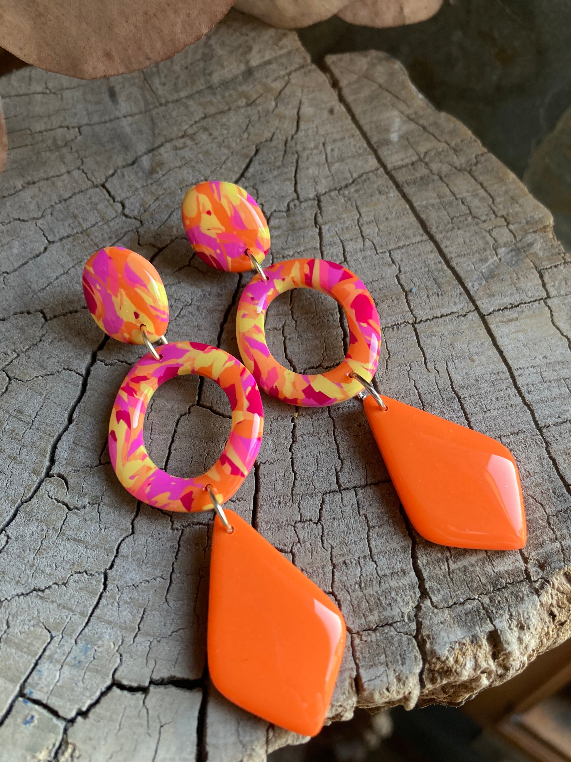 Aros de arcilla polimérica con top coat de resina uv. Miden 7,8 cms. Palito de acero quirúrgico y tope de goma.
