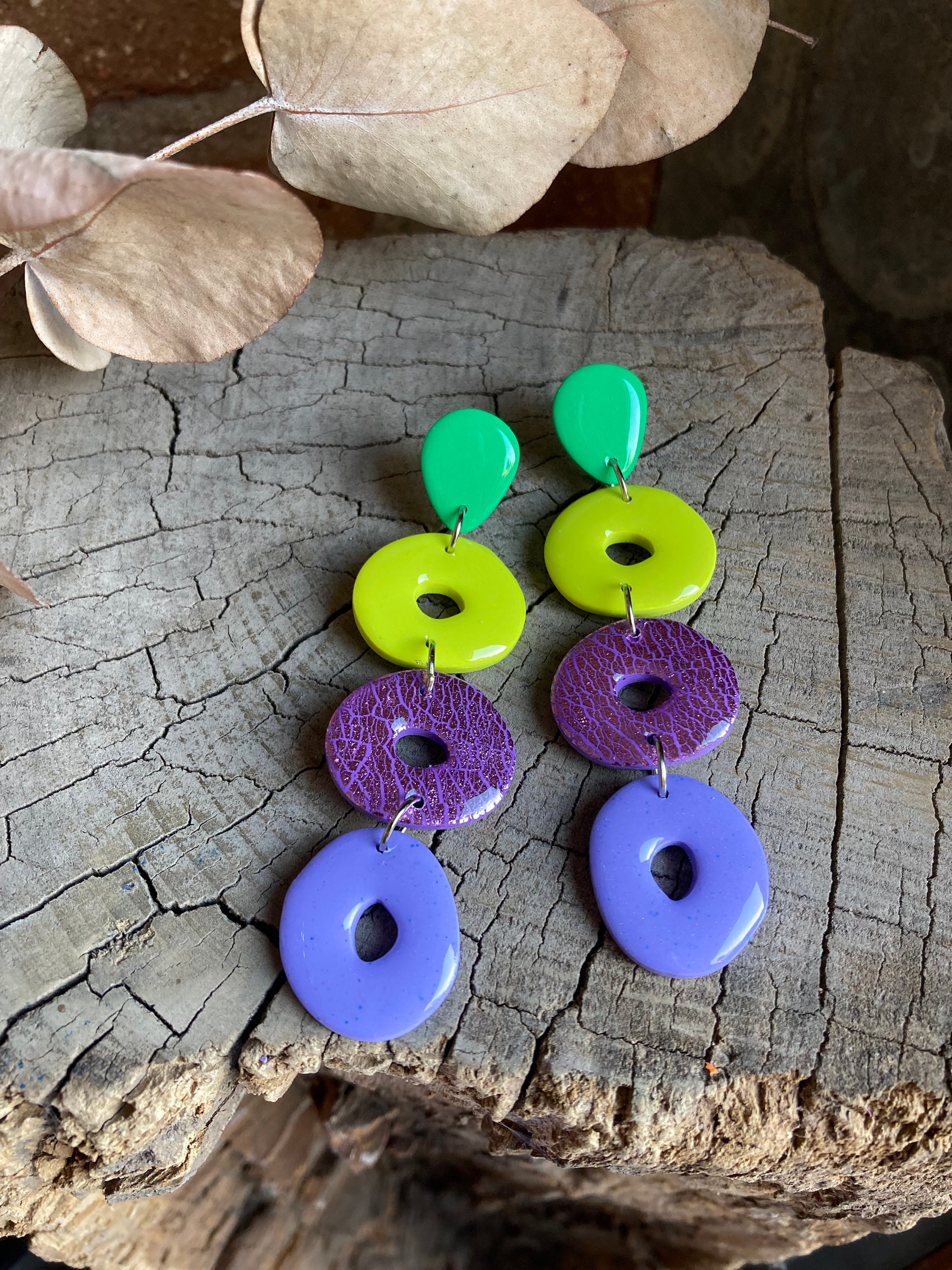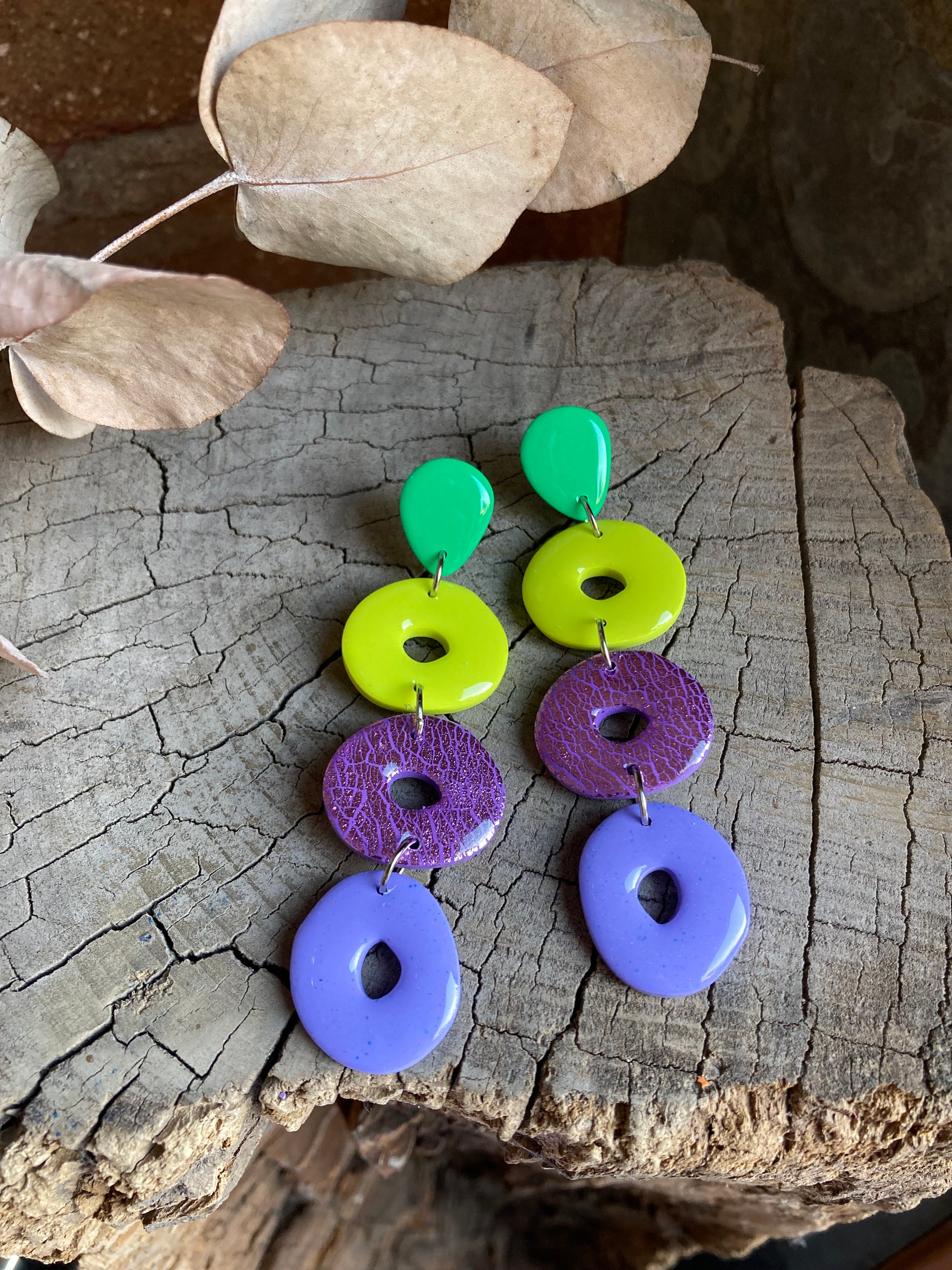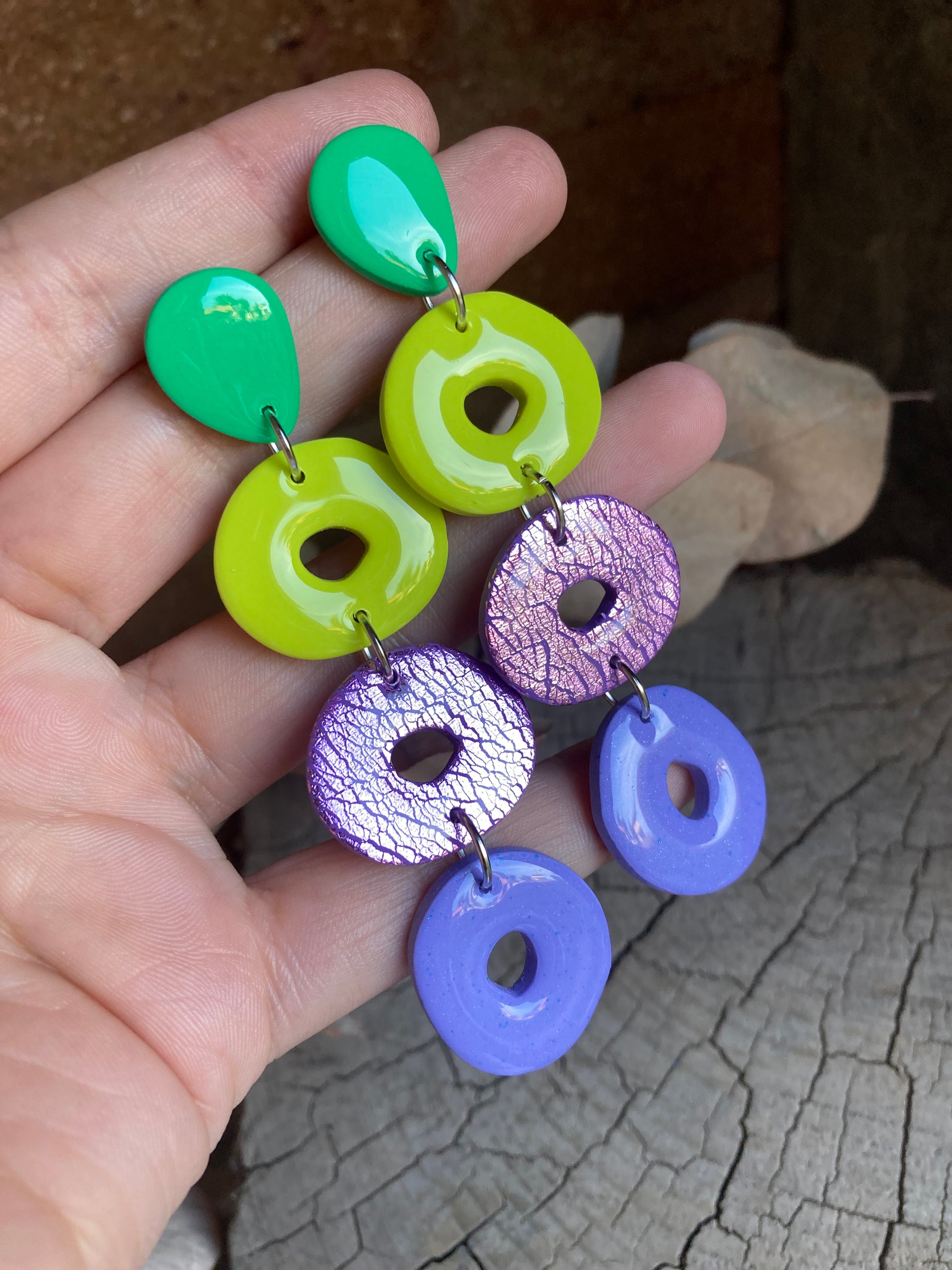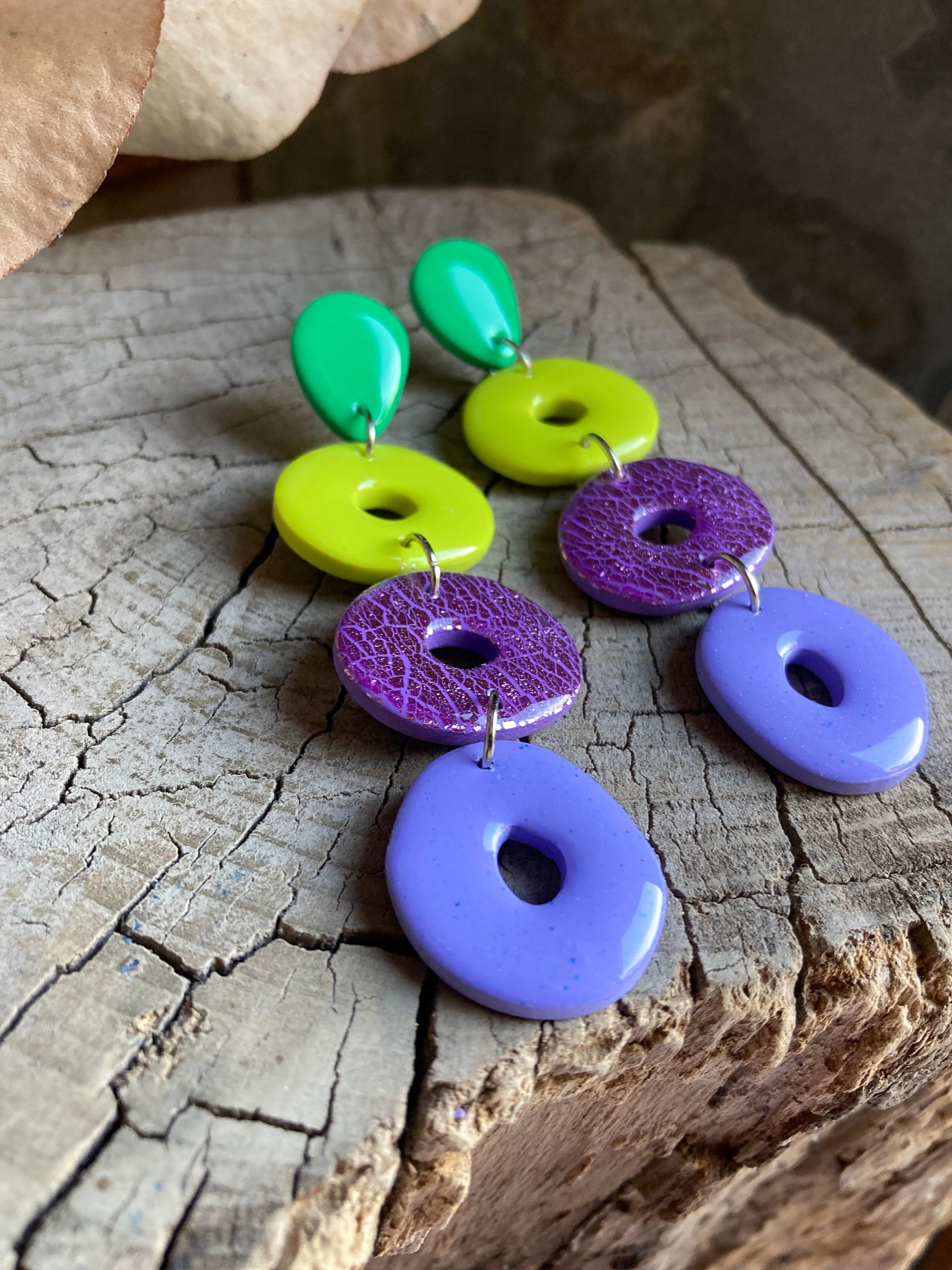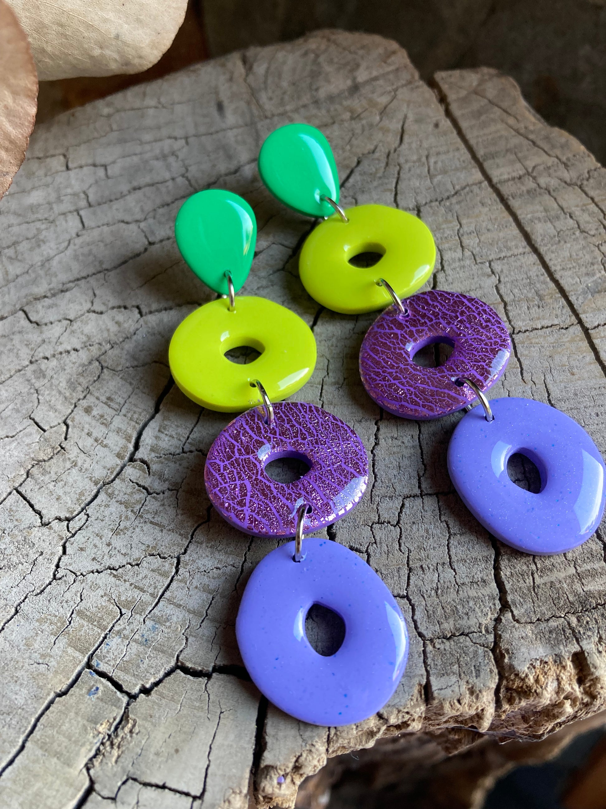 Aros de arcilla polimérica con top coat de resina uv. Miden 8,6 cms. Palito de acero quirúrgico y tope de goma.