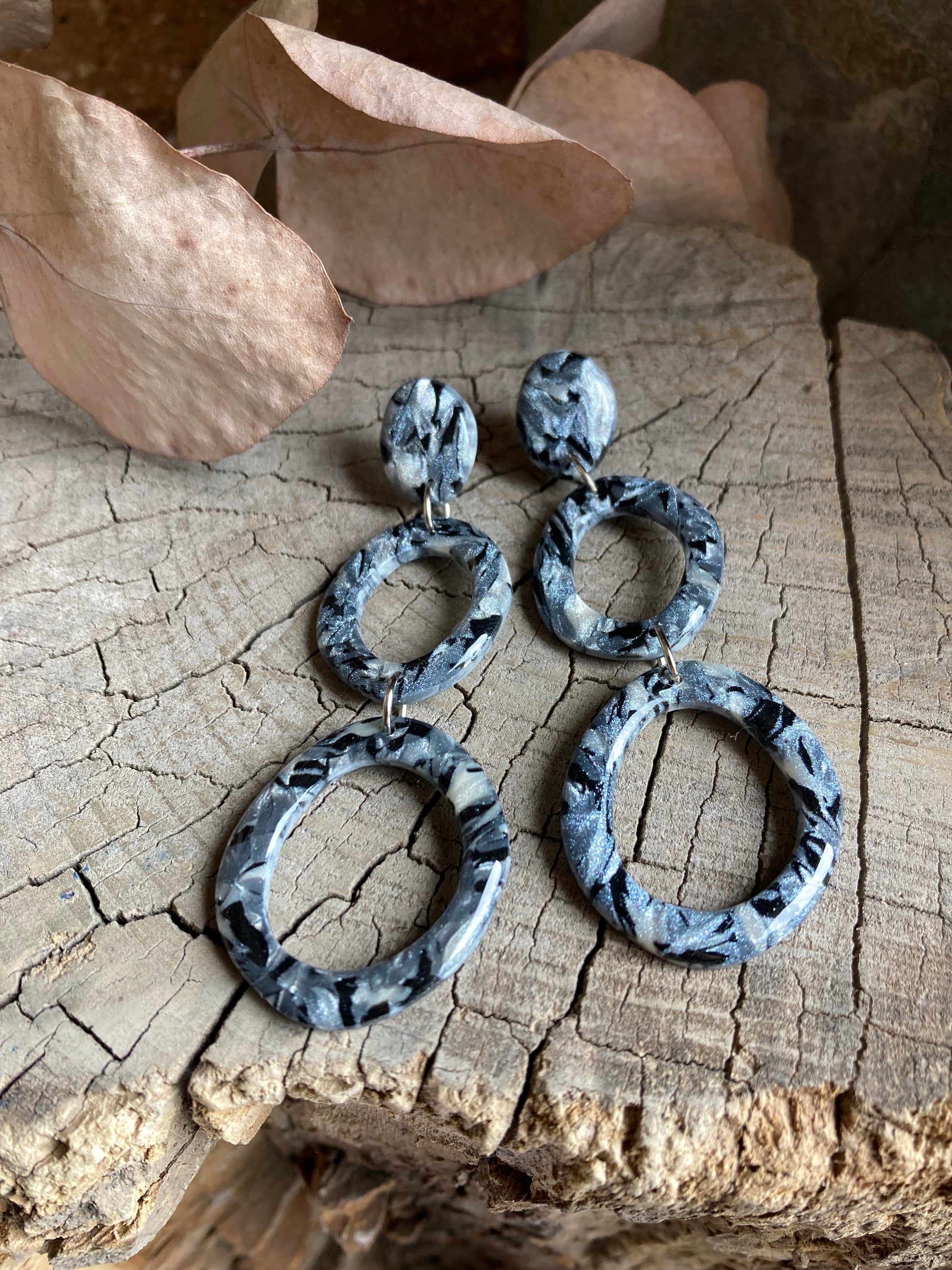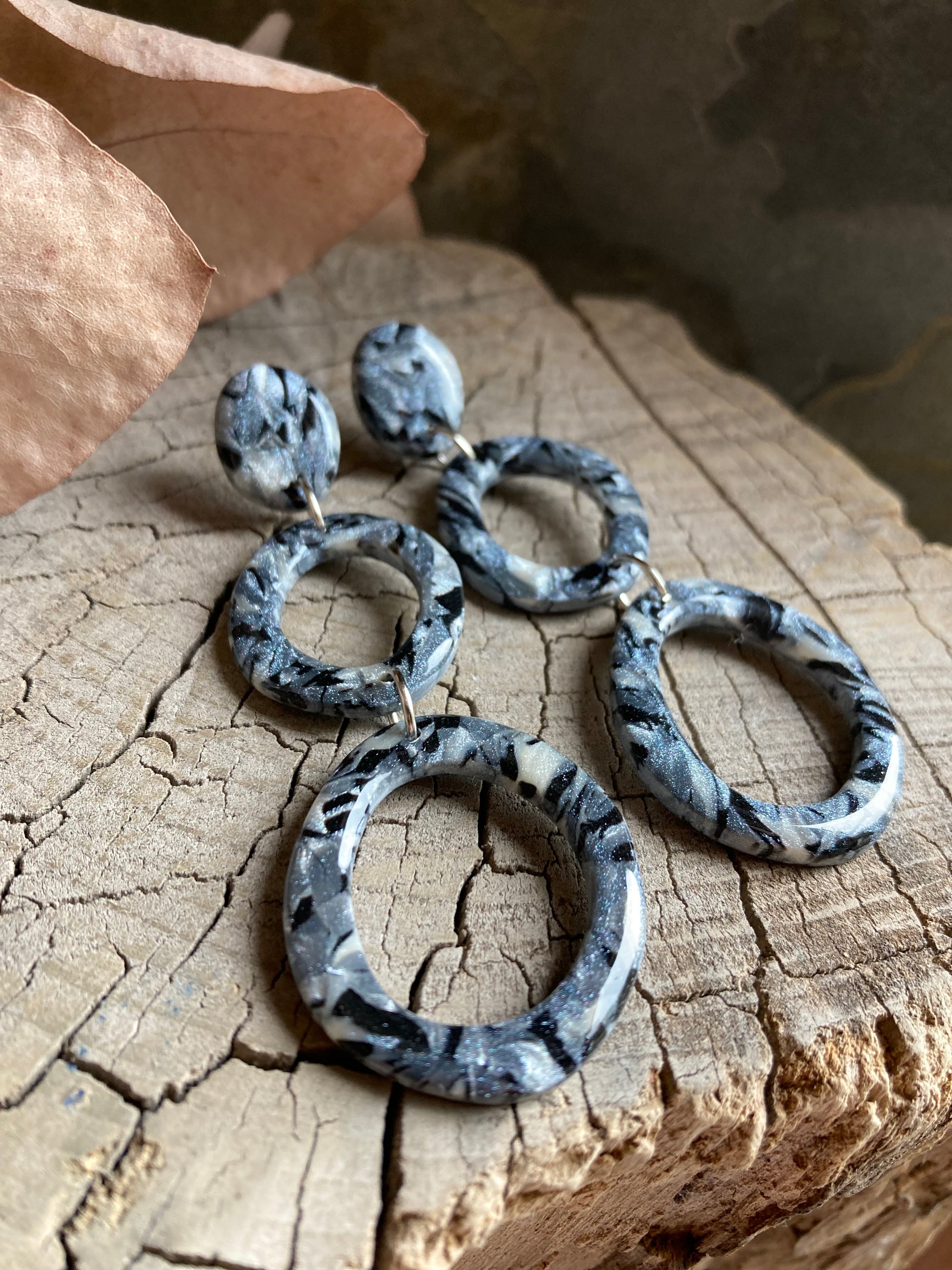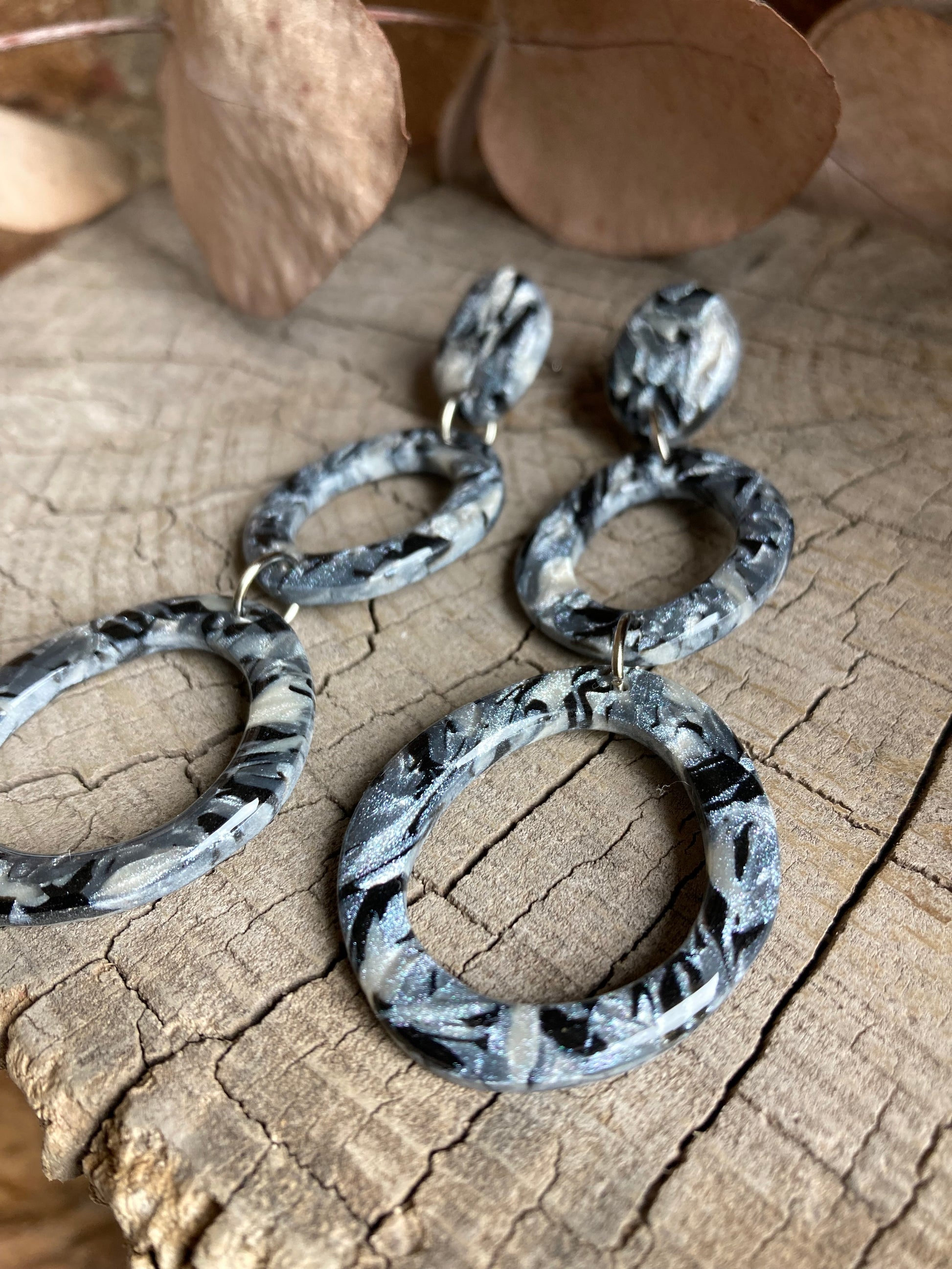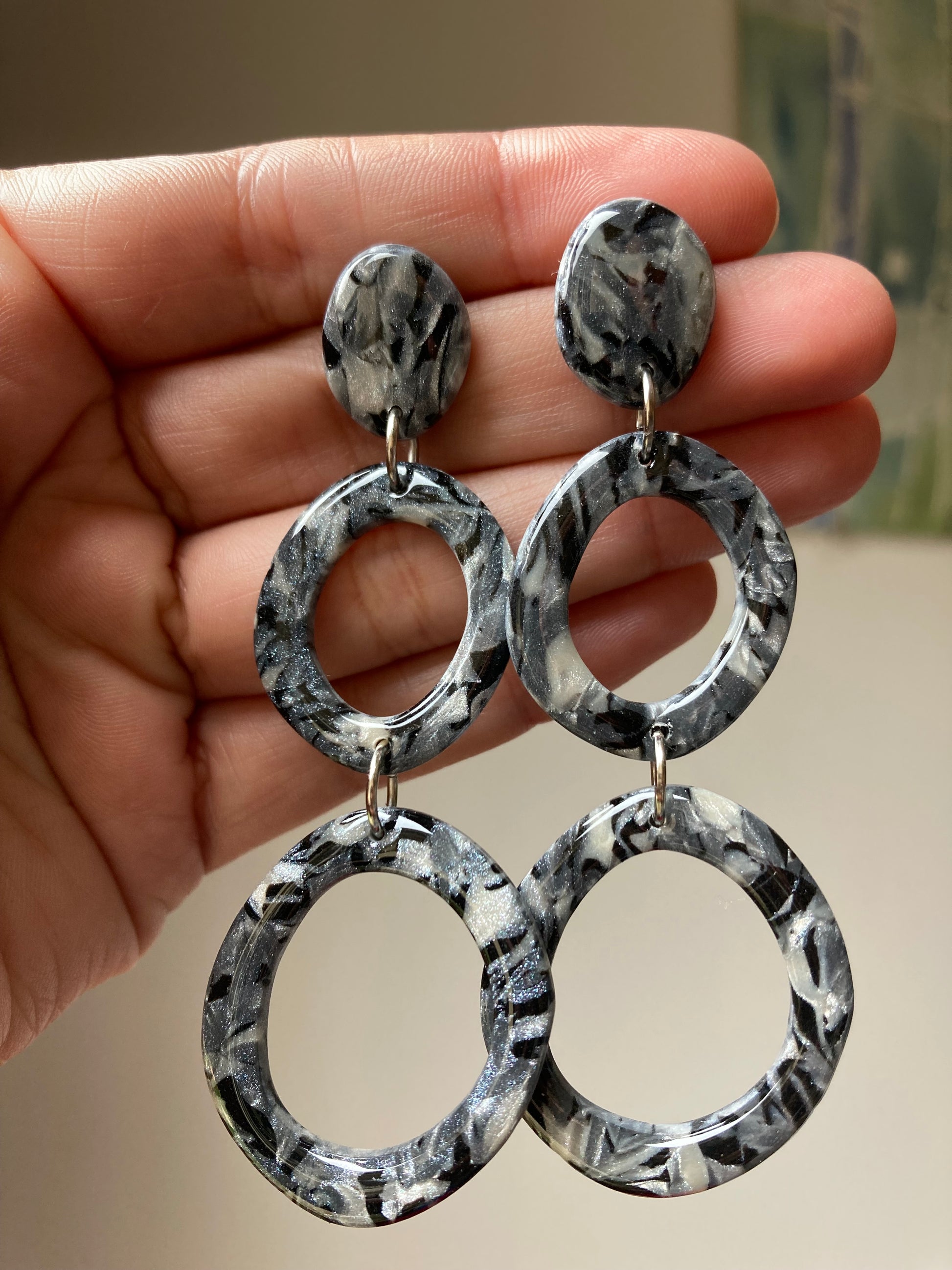 Aros de arcilla polimérica con top coat de resina uv. Miden 8 cms. Palito de acero quirúrgico y tope de goma.