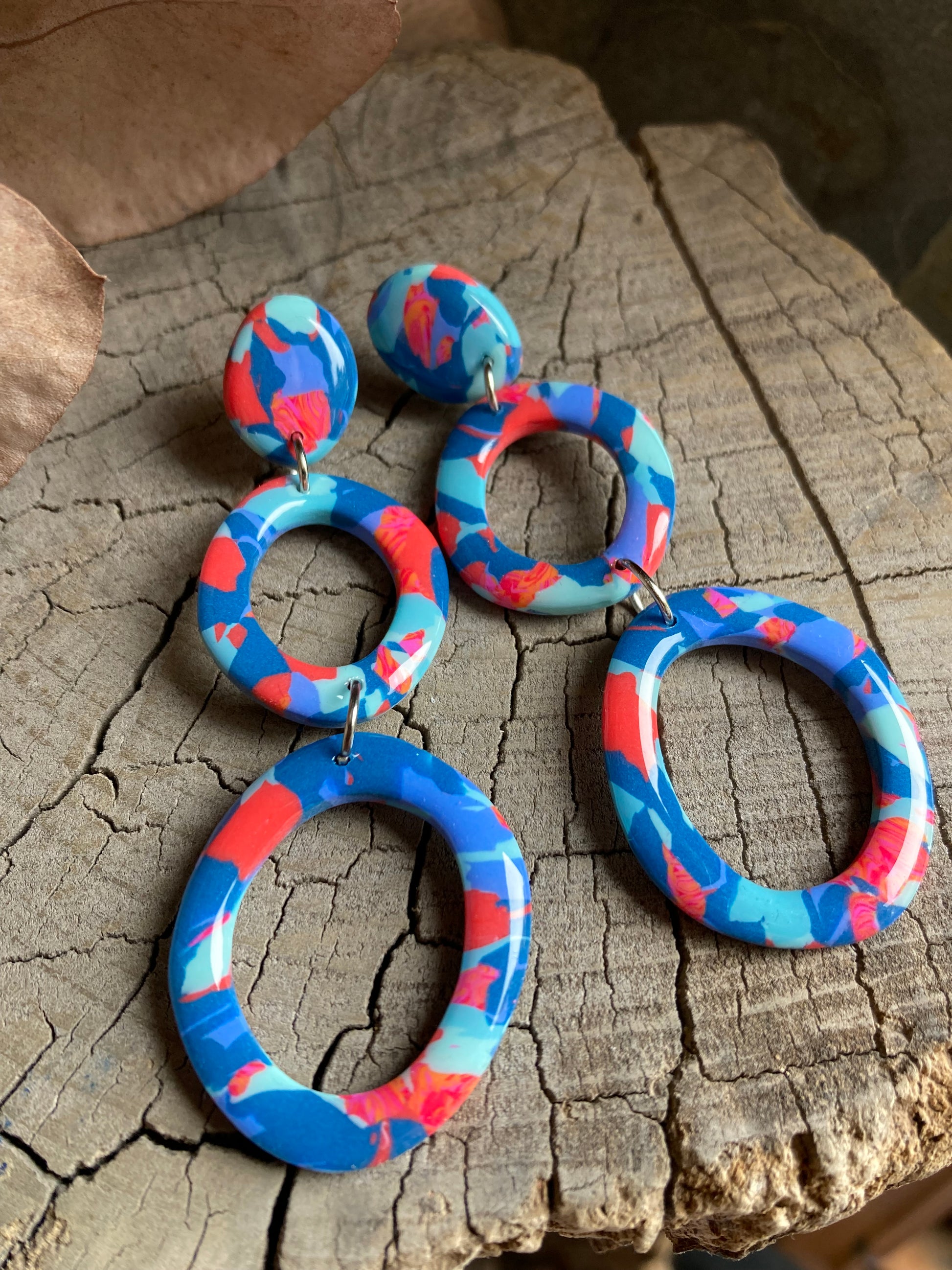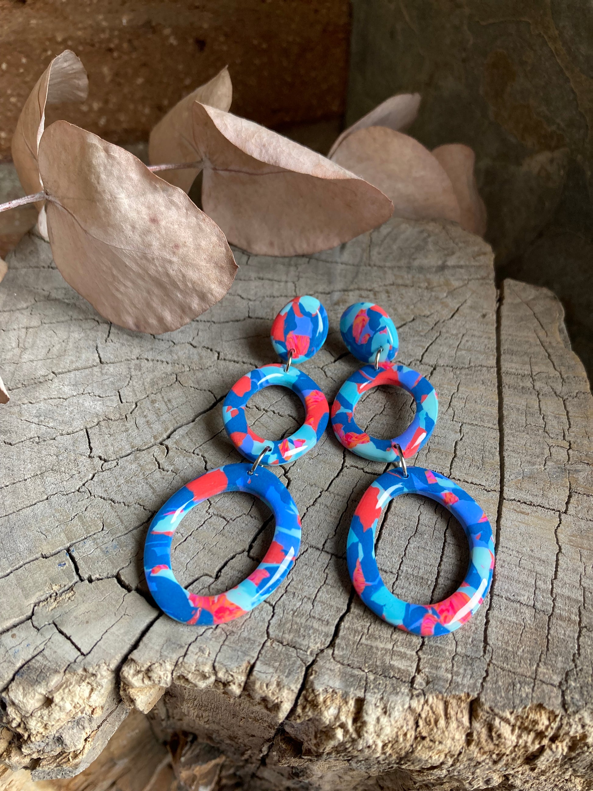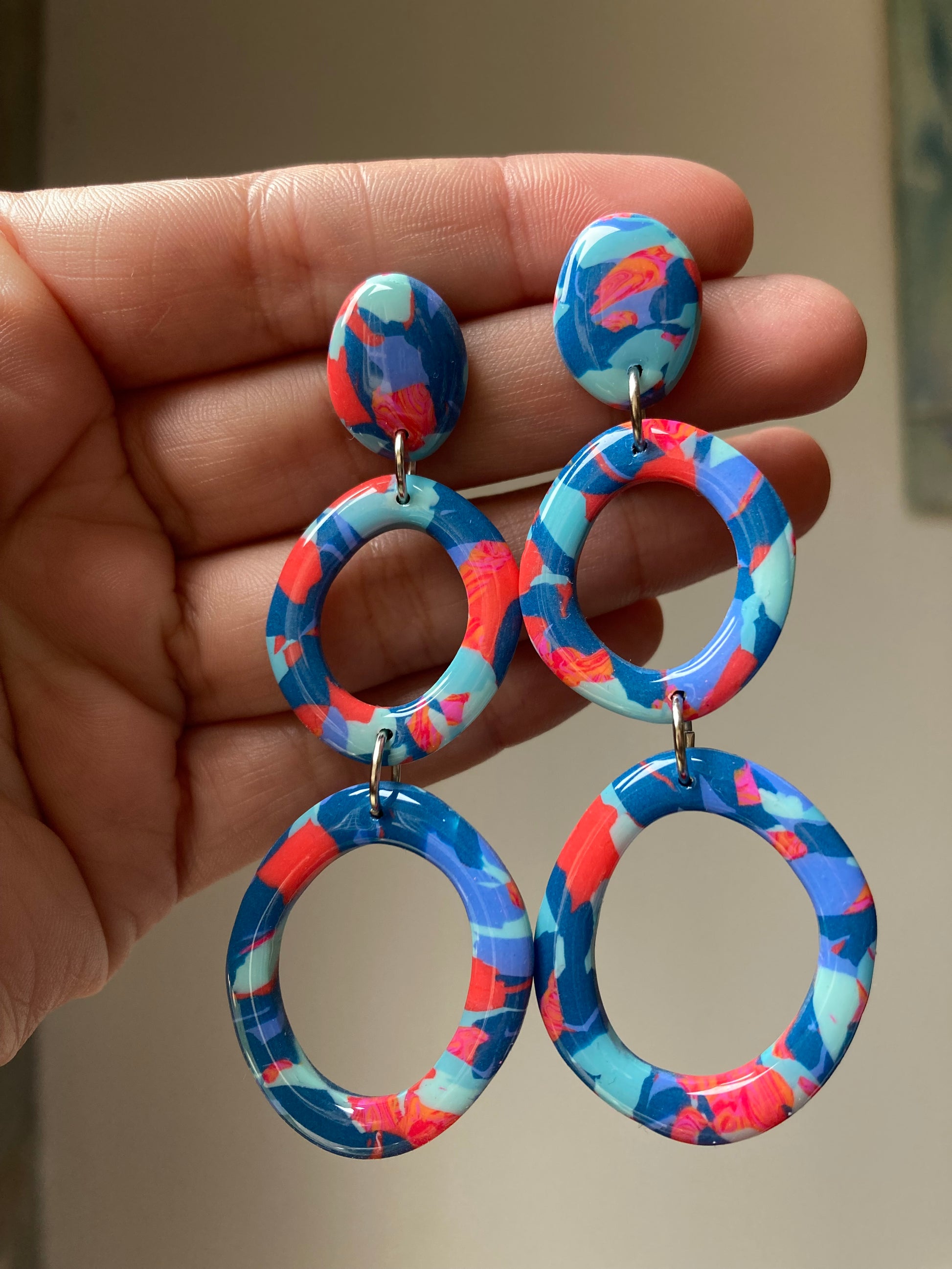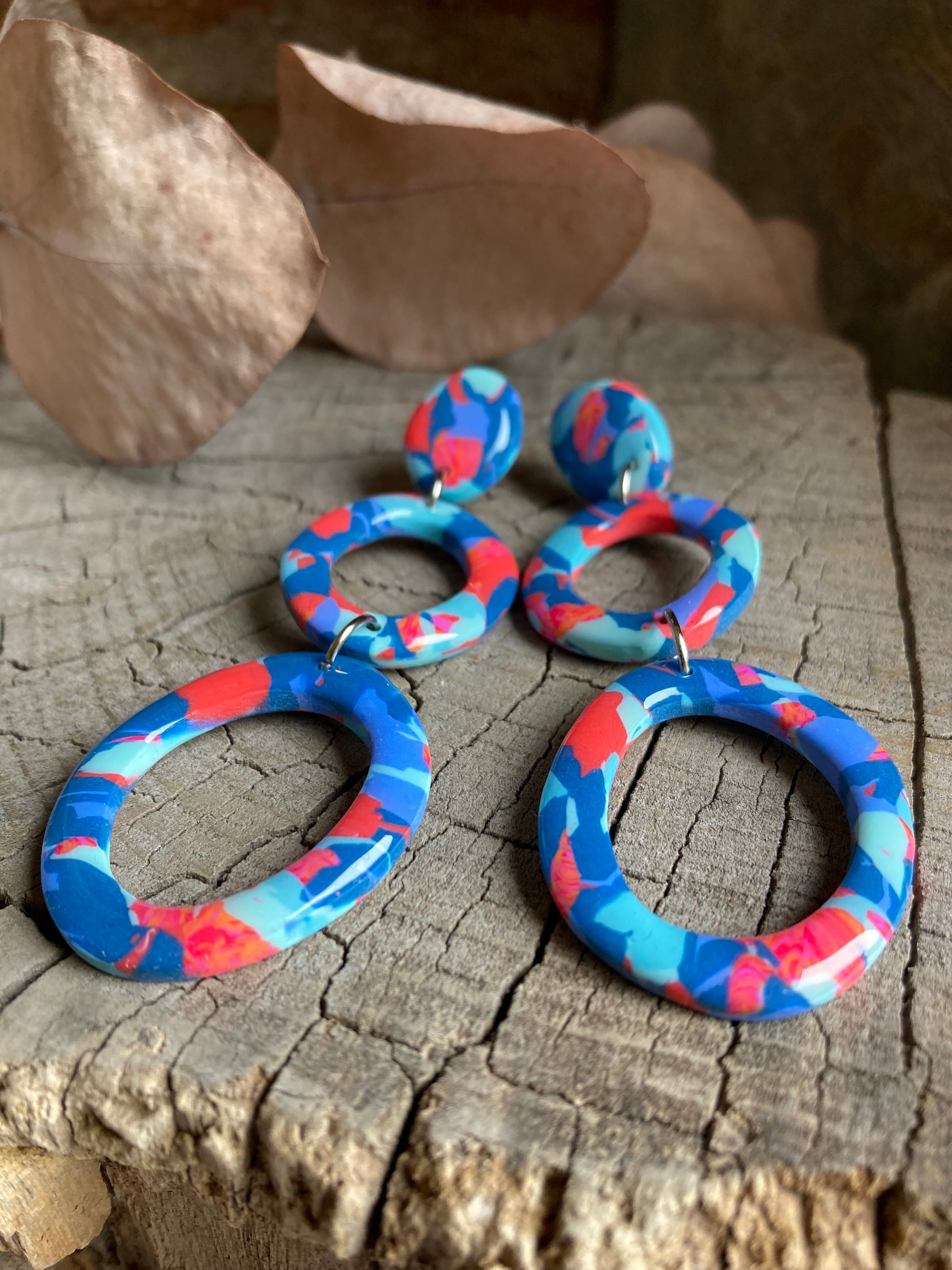 Aros de arcilla polimérica con top coat de resina uv. Miden 8 cms. Palito de acero quirúrgico y tope de goma.
