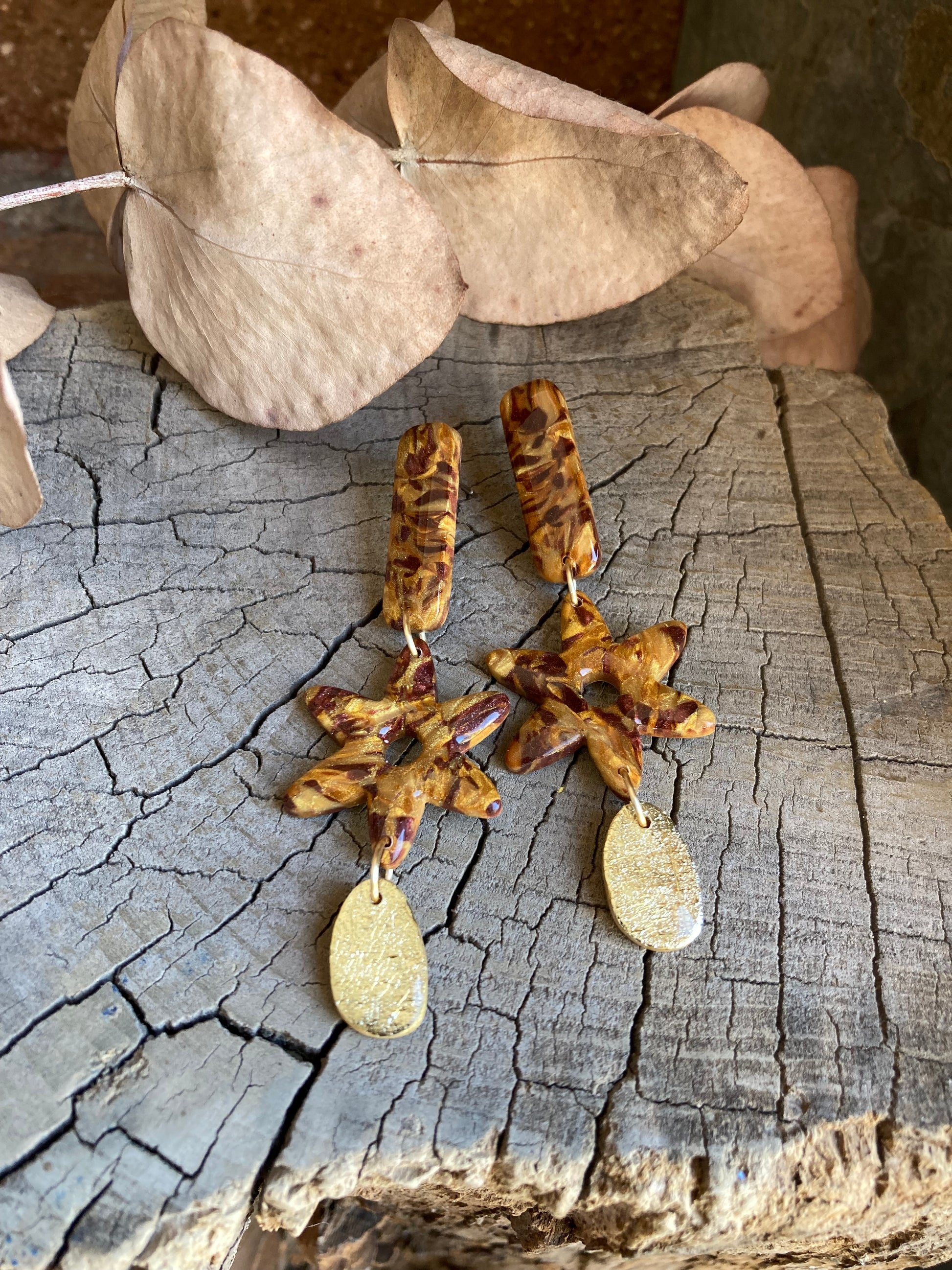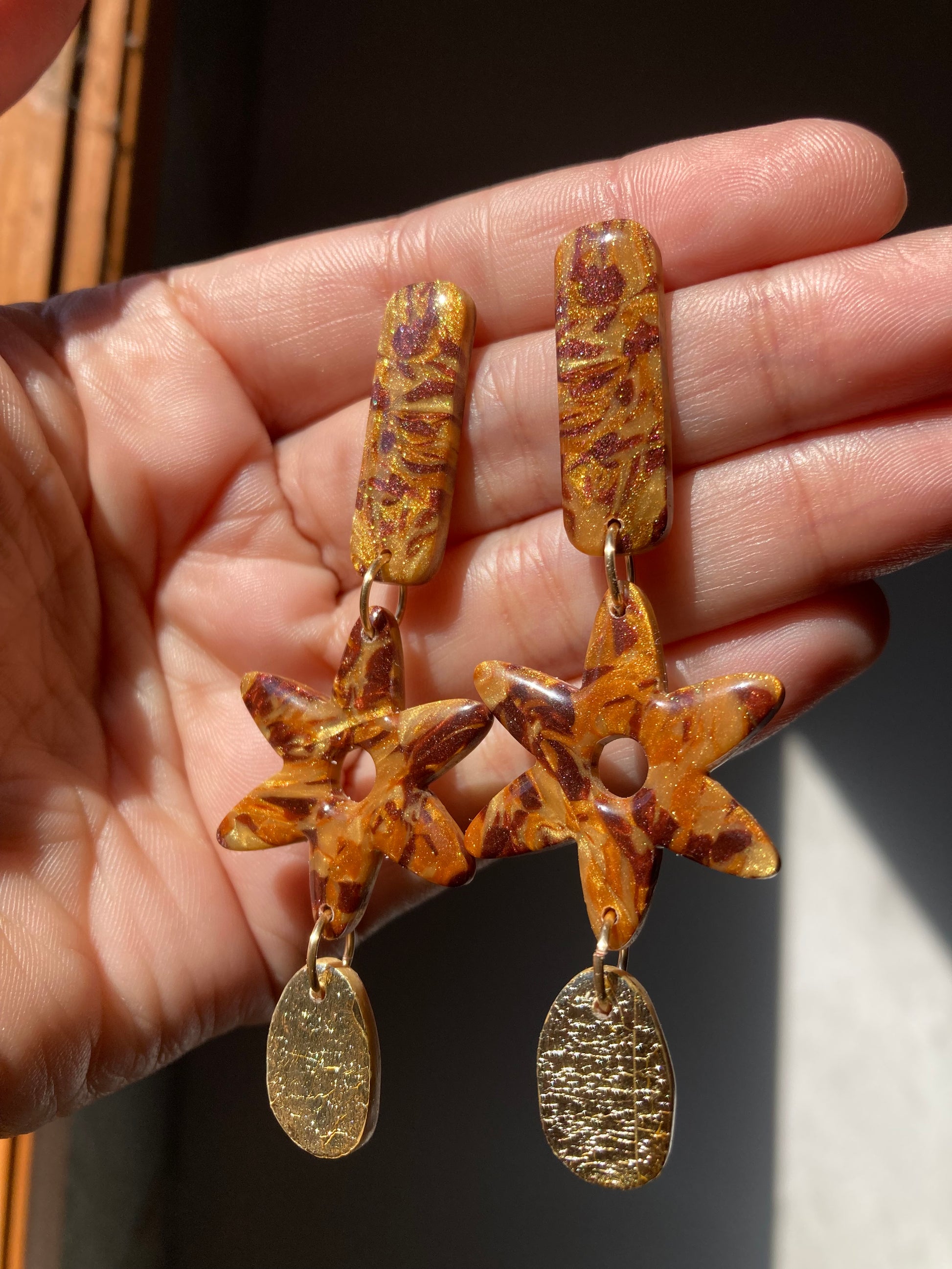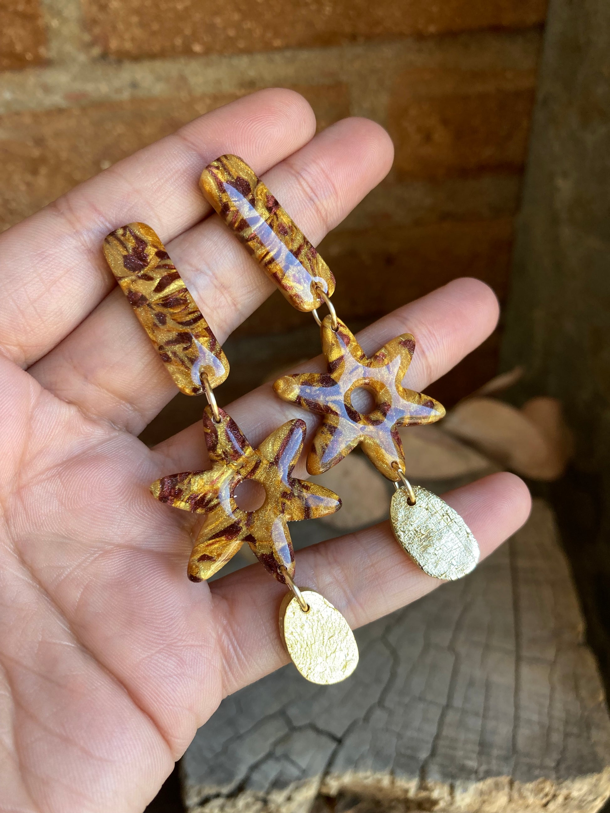 Aros de arcilla polimérica con top coat de resina uv. Miden 7,7 cms. Palito de acero quirúrgico y tope de goma.