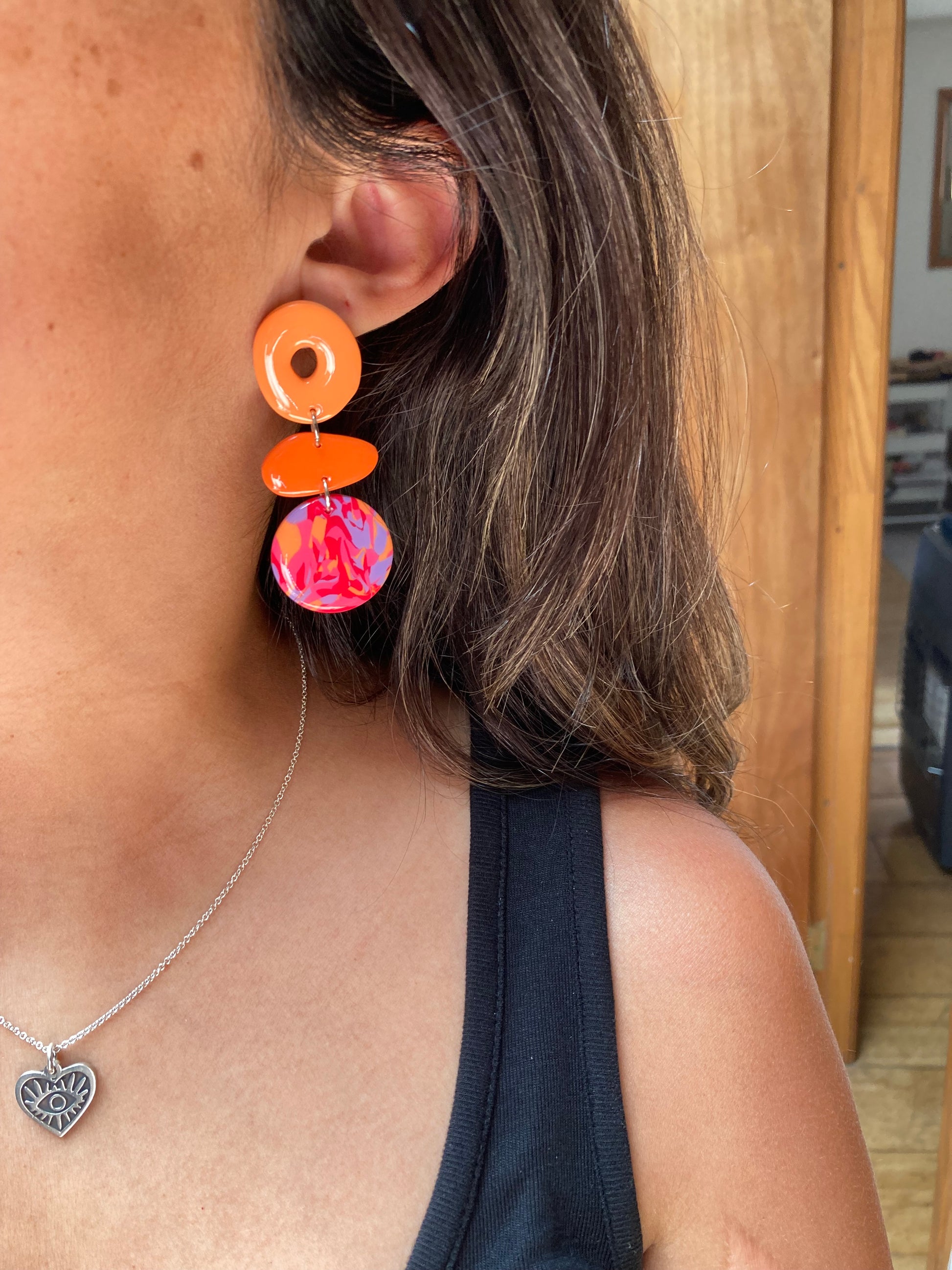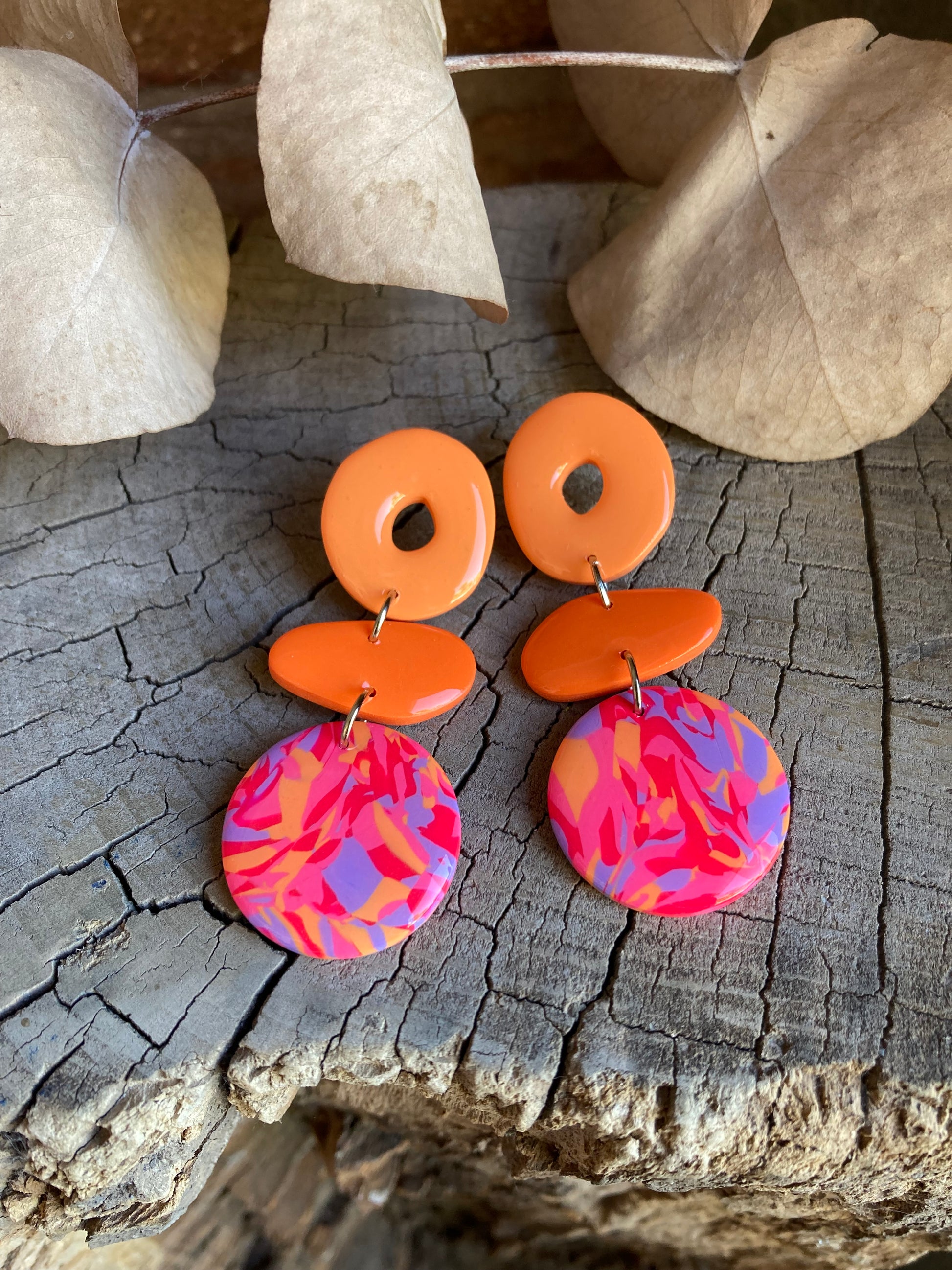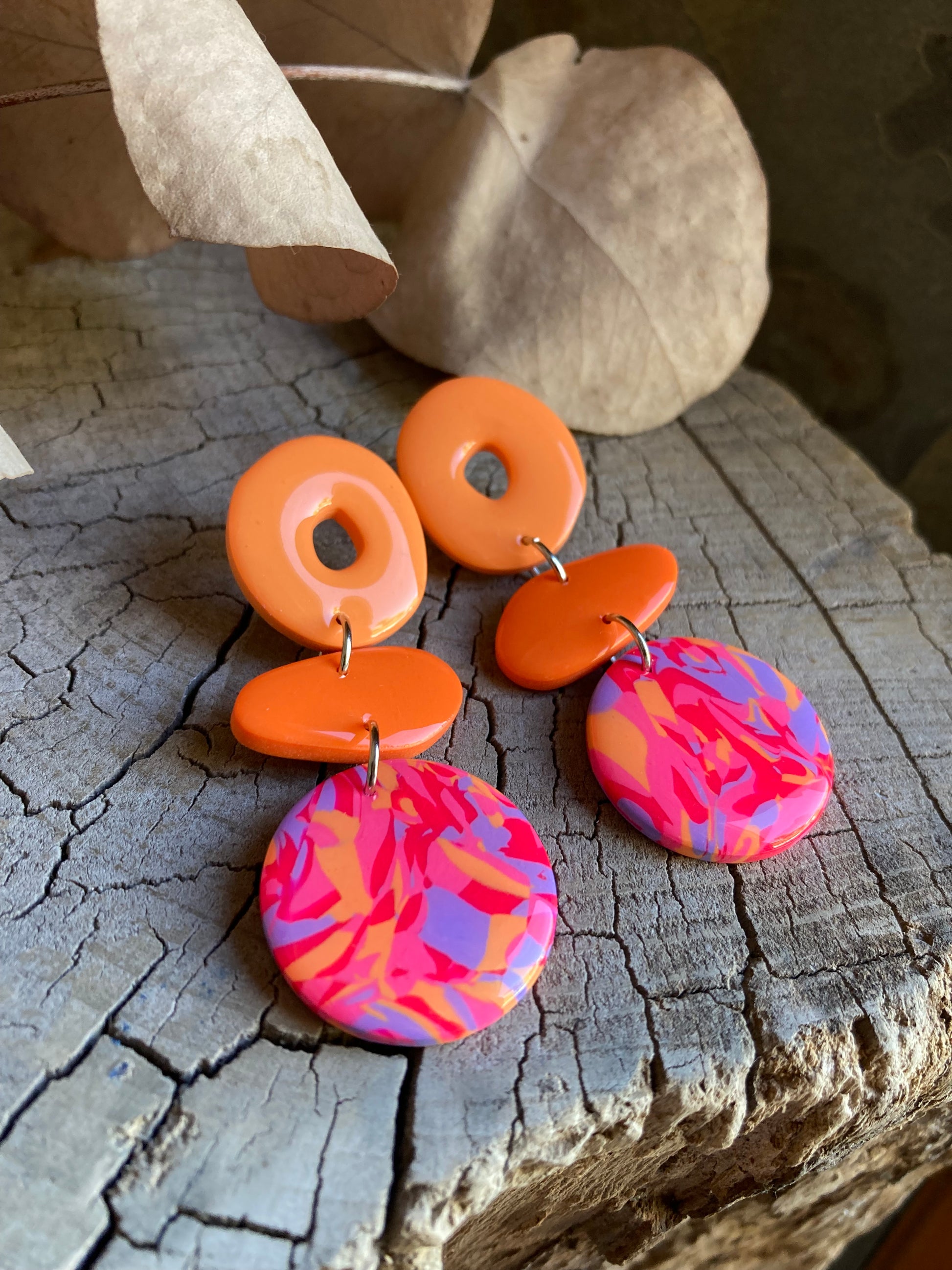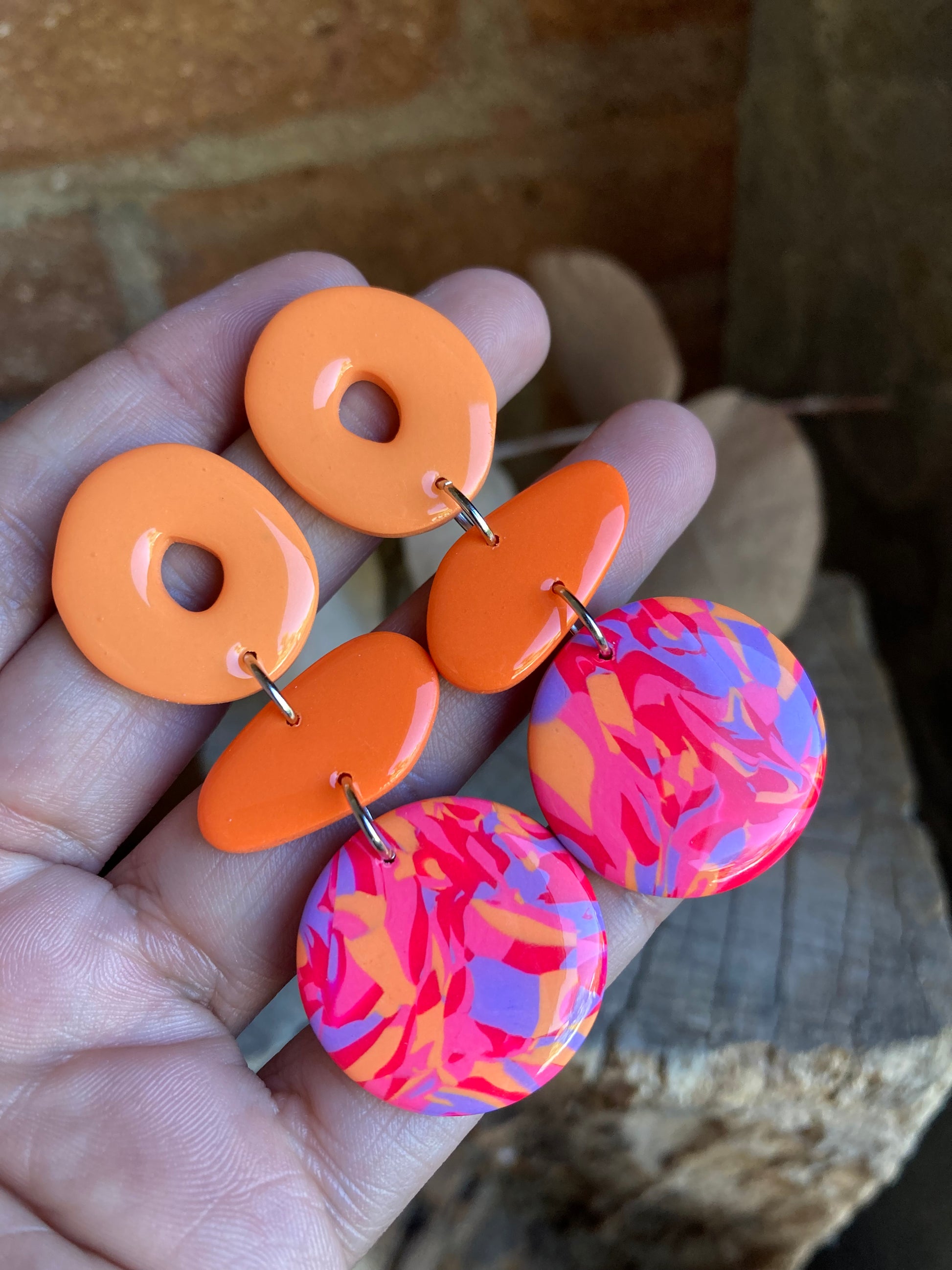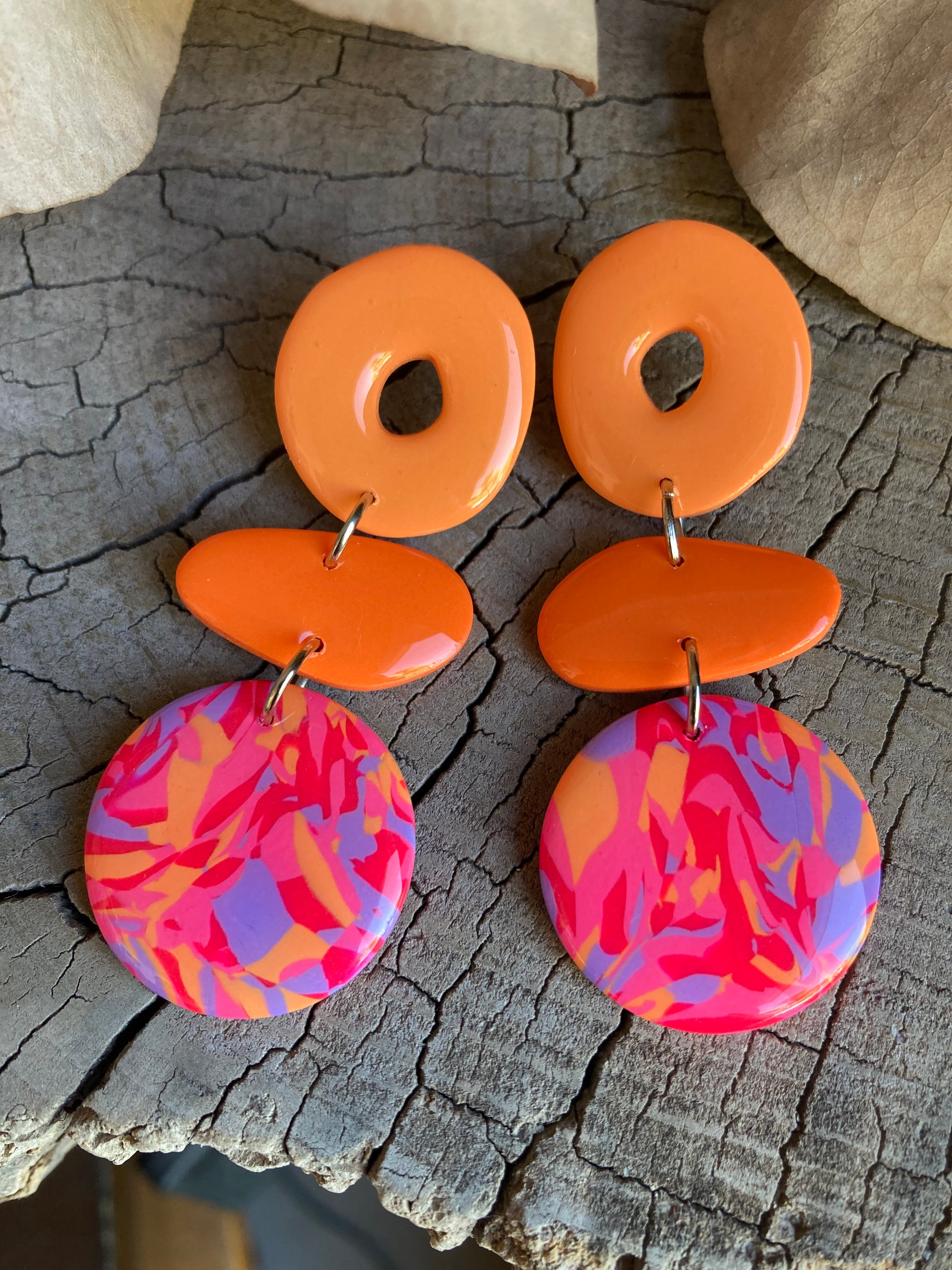 Aros de arcilla polimérica con top coat de resina uv. Miden 6,5 cms. Palito de acero quirúrgico y tope de goma.