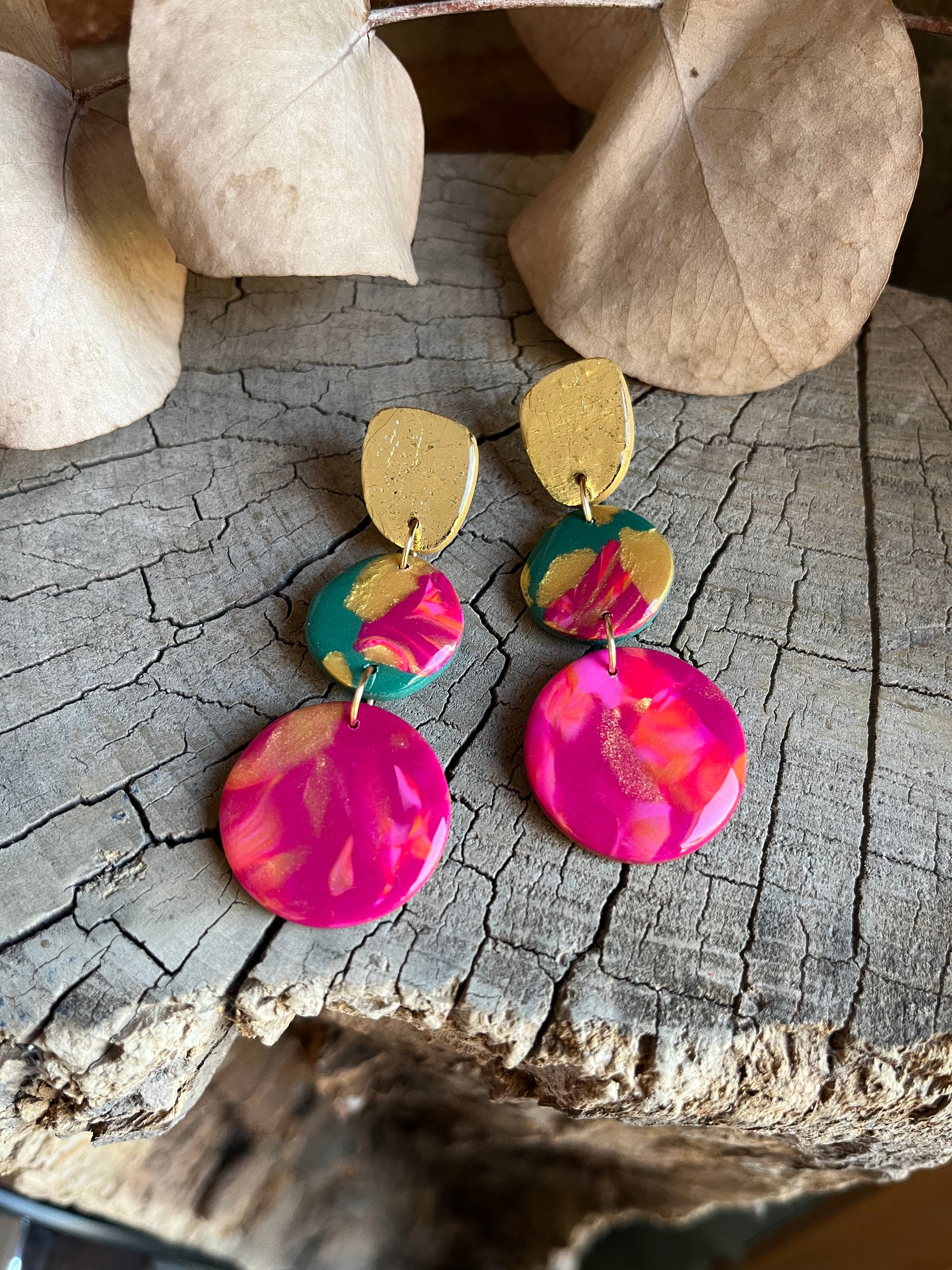 Aros de arcilla polimérica con top coat de resina uv. Miden 6,5 cms. Palito de acero quirúrgico y tope de goma.