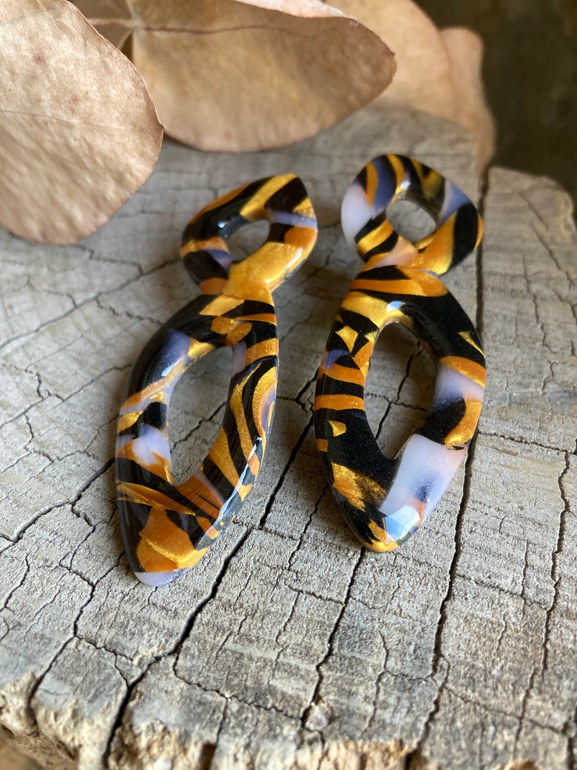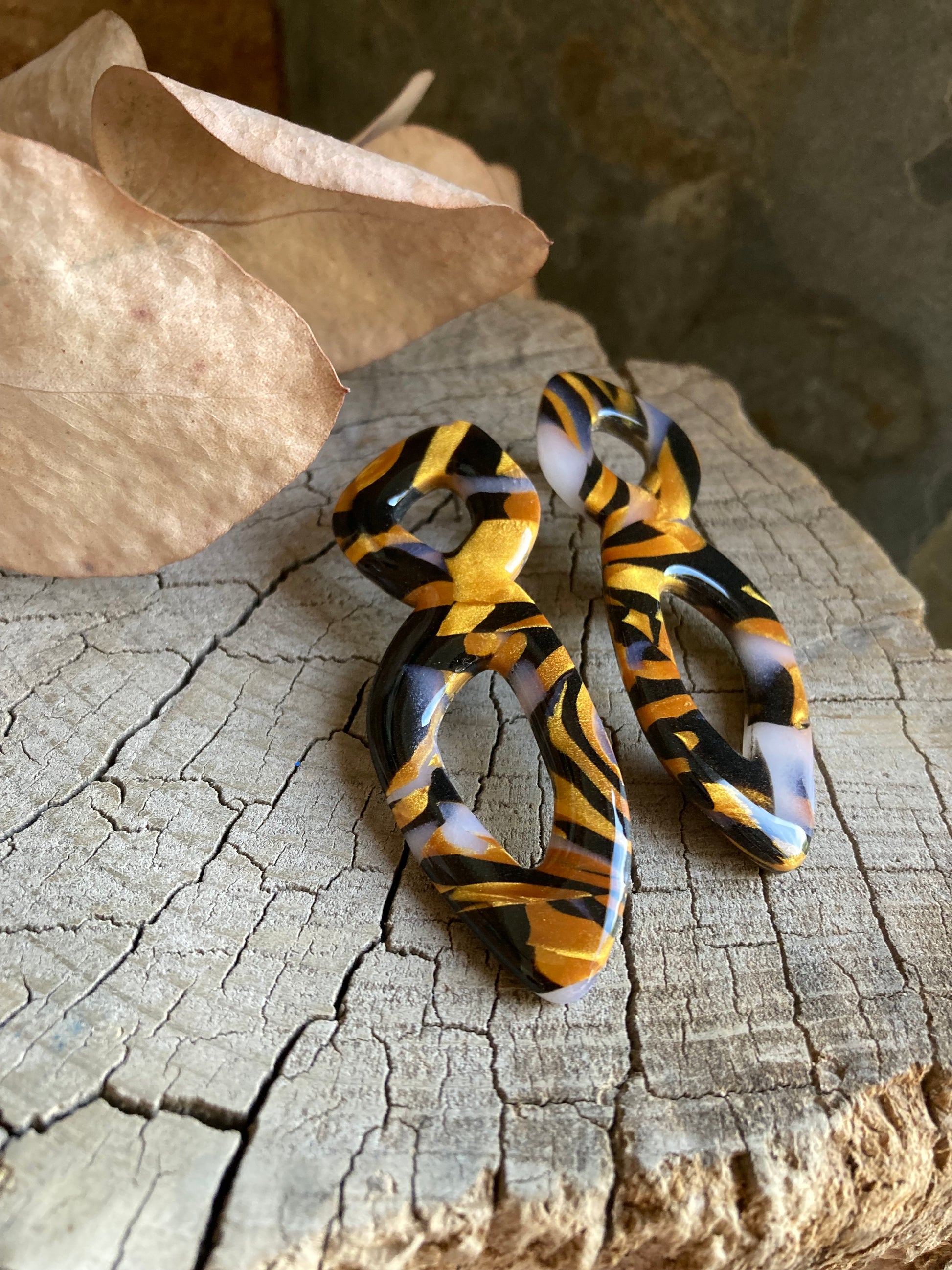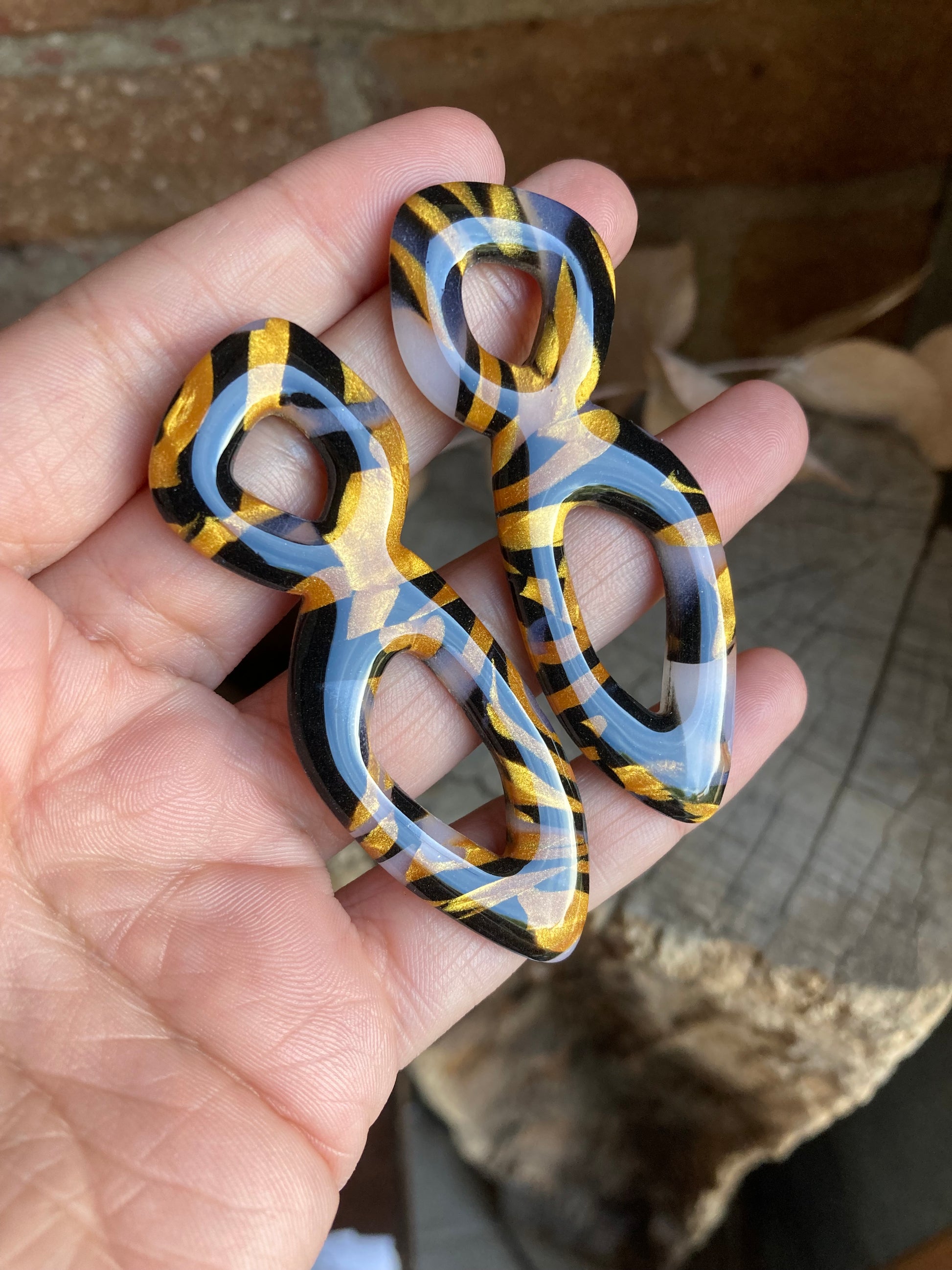 Aros de arcilla polimérica con top coat de resina uv. Miden 7 cms. Palito de acero quirúrgico y tope de goma.