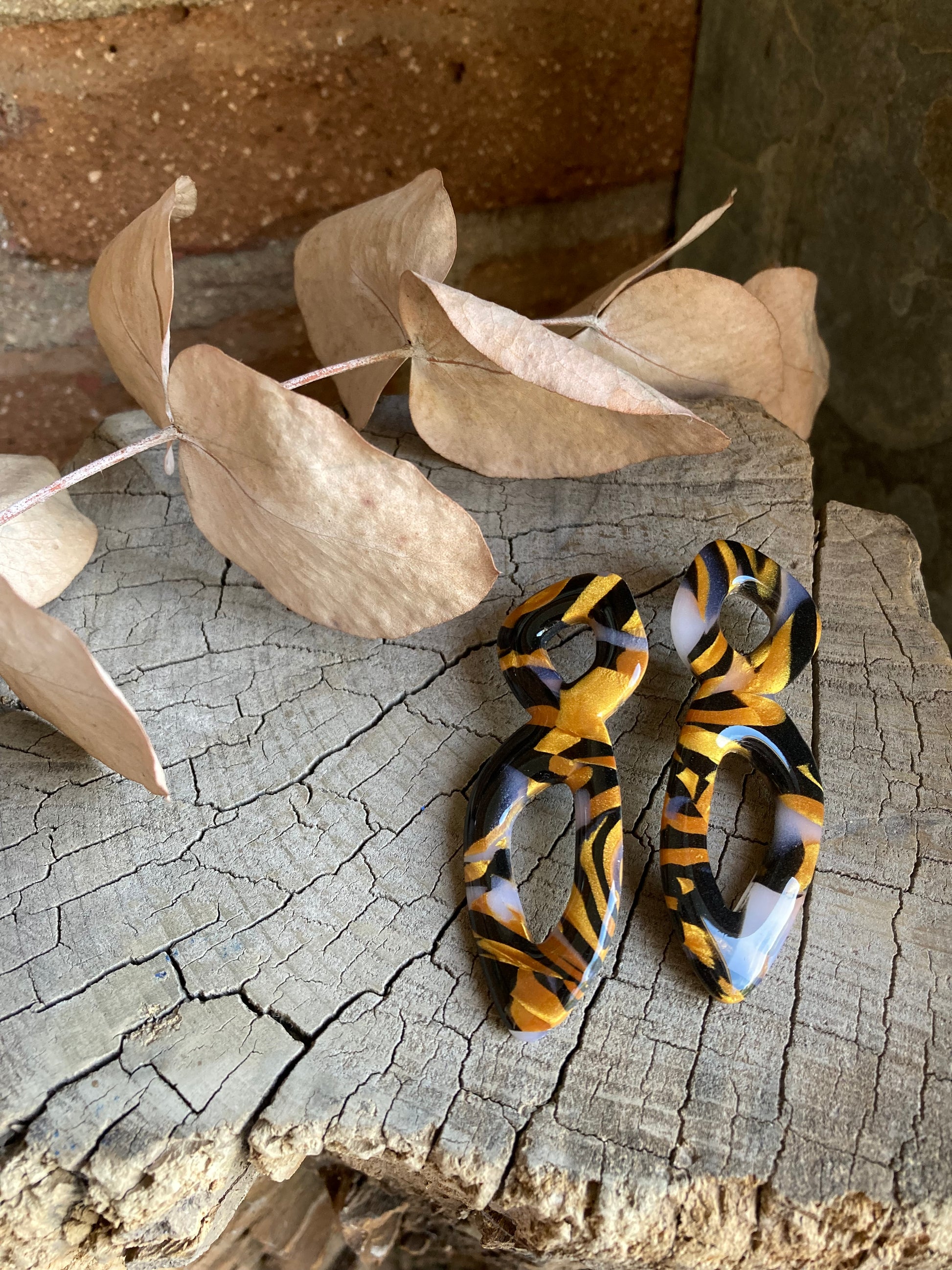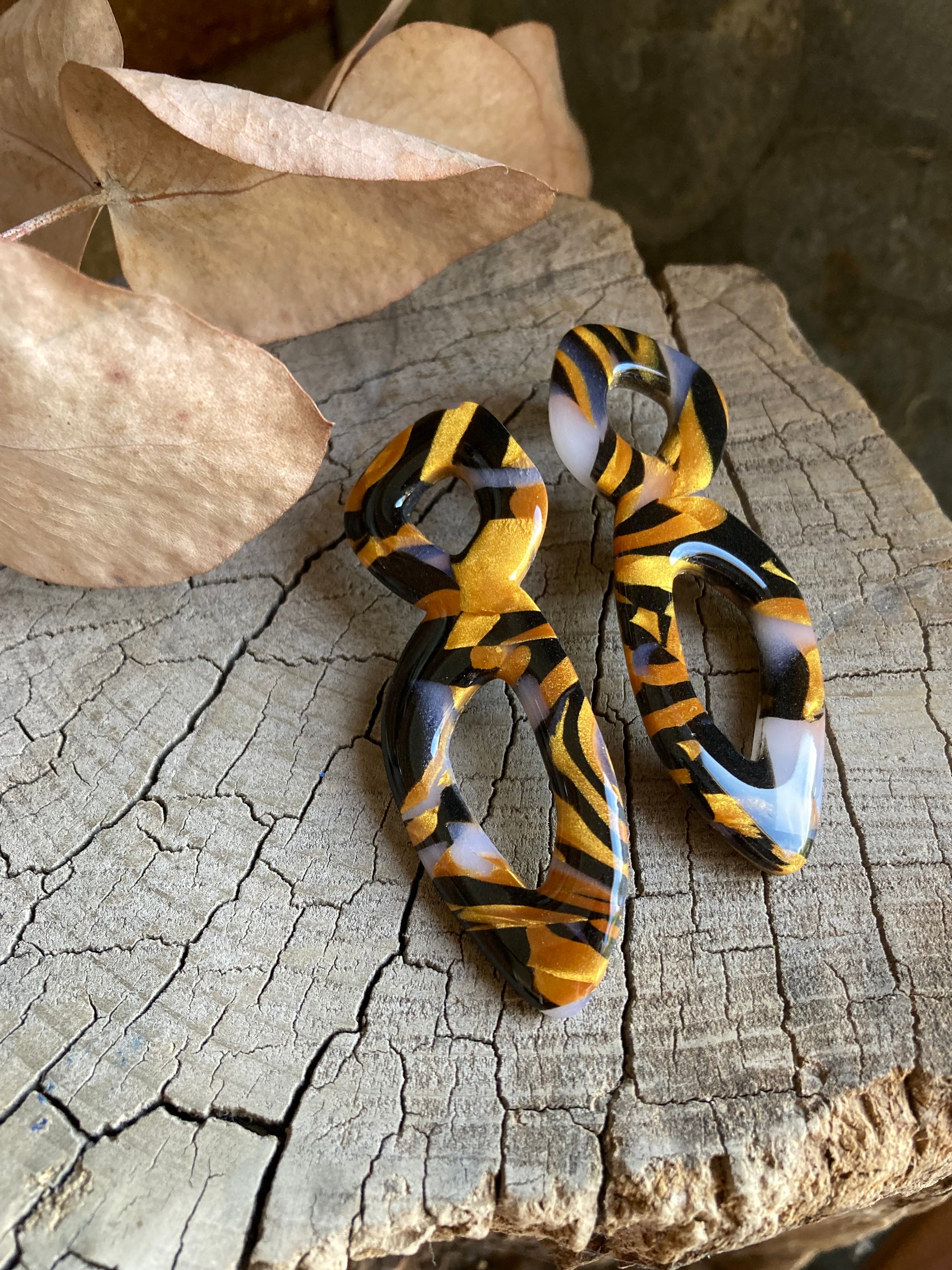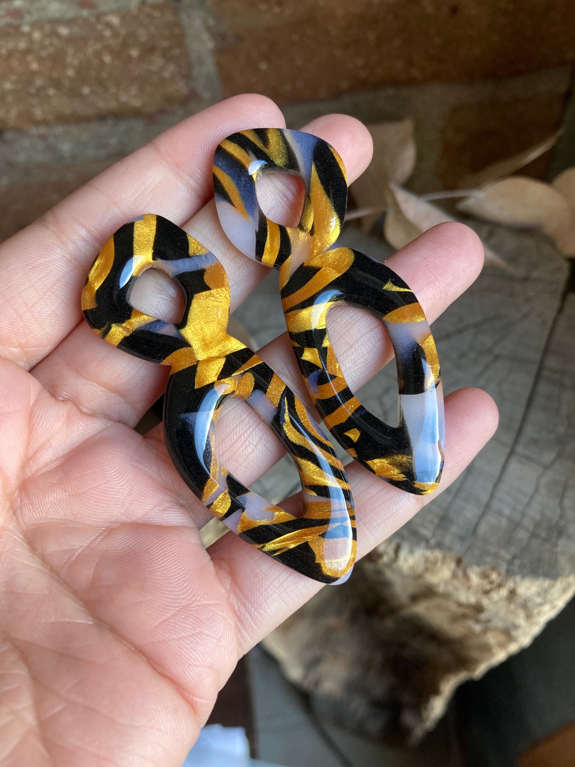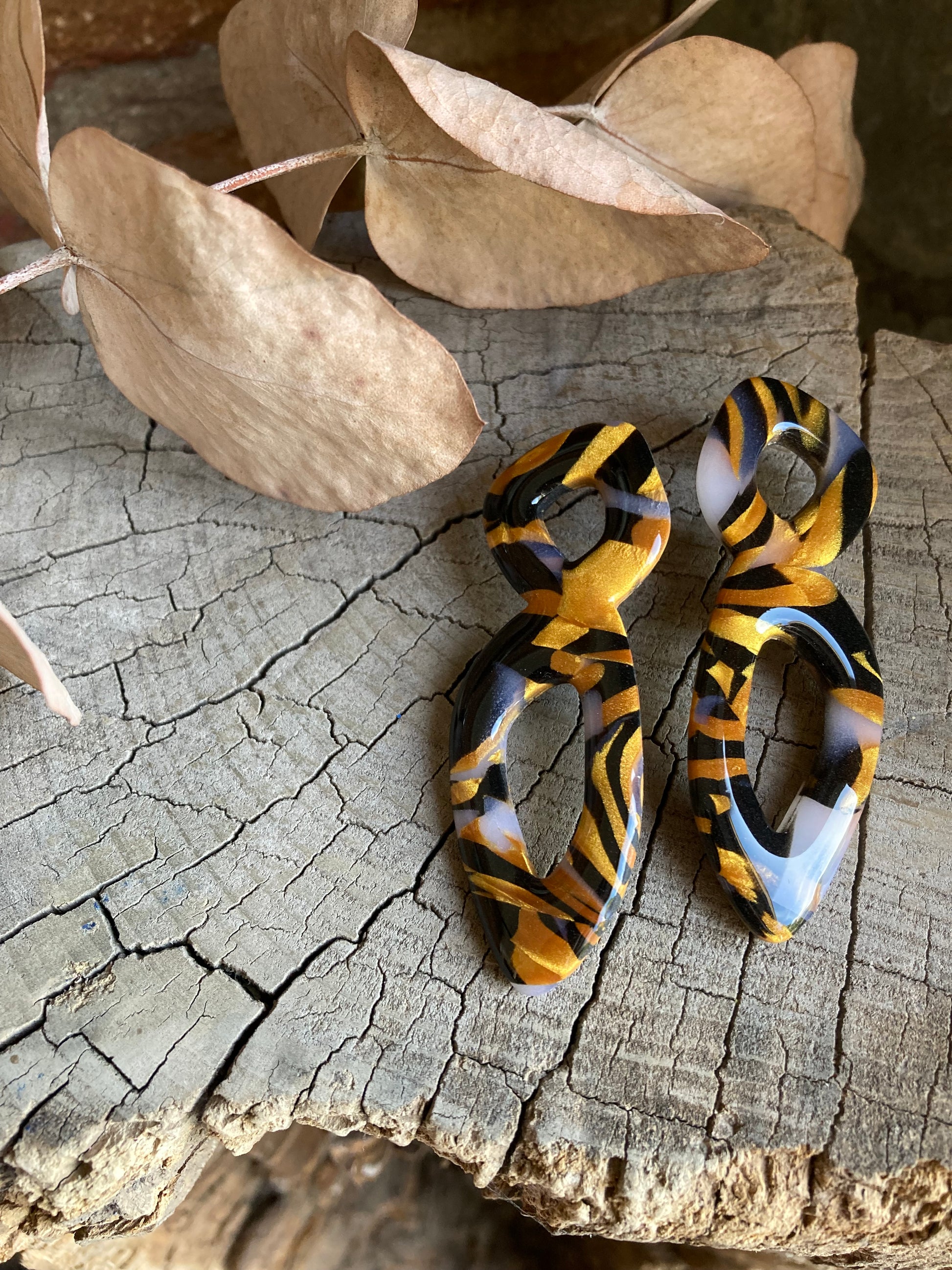 Aros de arcilla polimérica con top coat de resina uv. Miden 7 cms. Palito de acero quirúrgico y tope de goma.