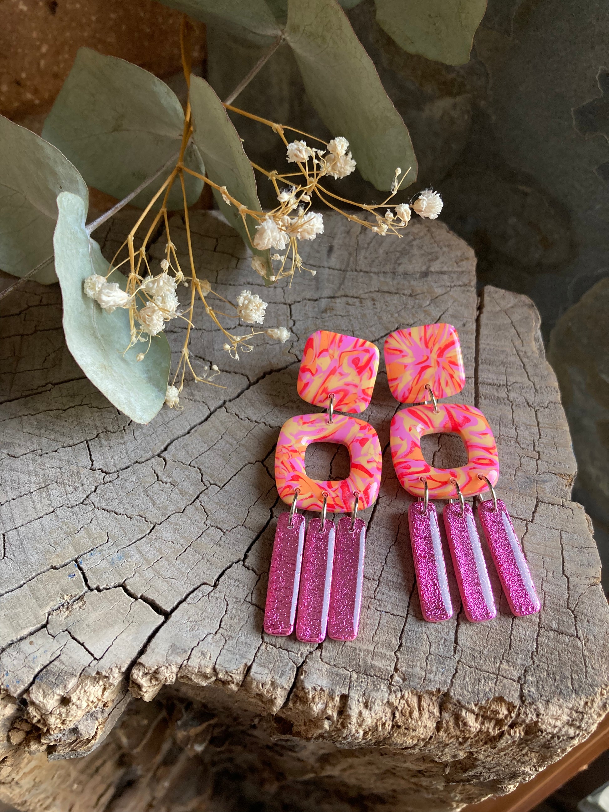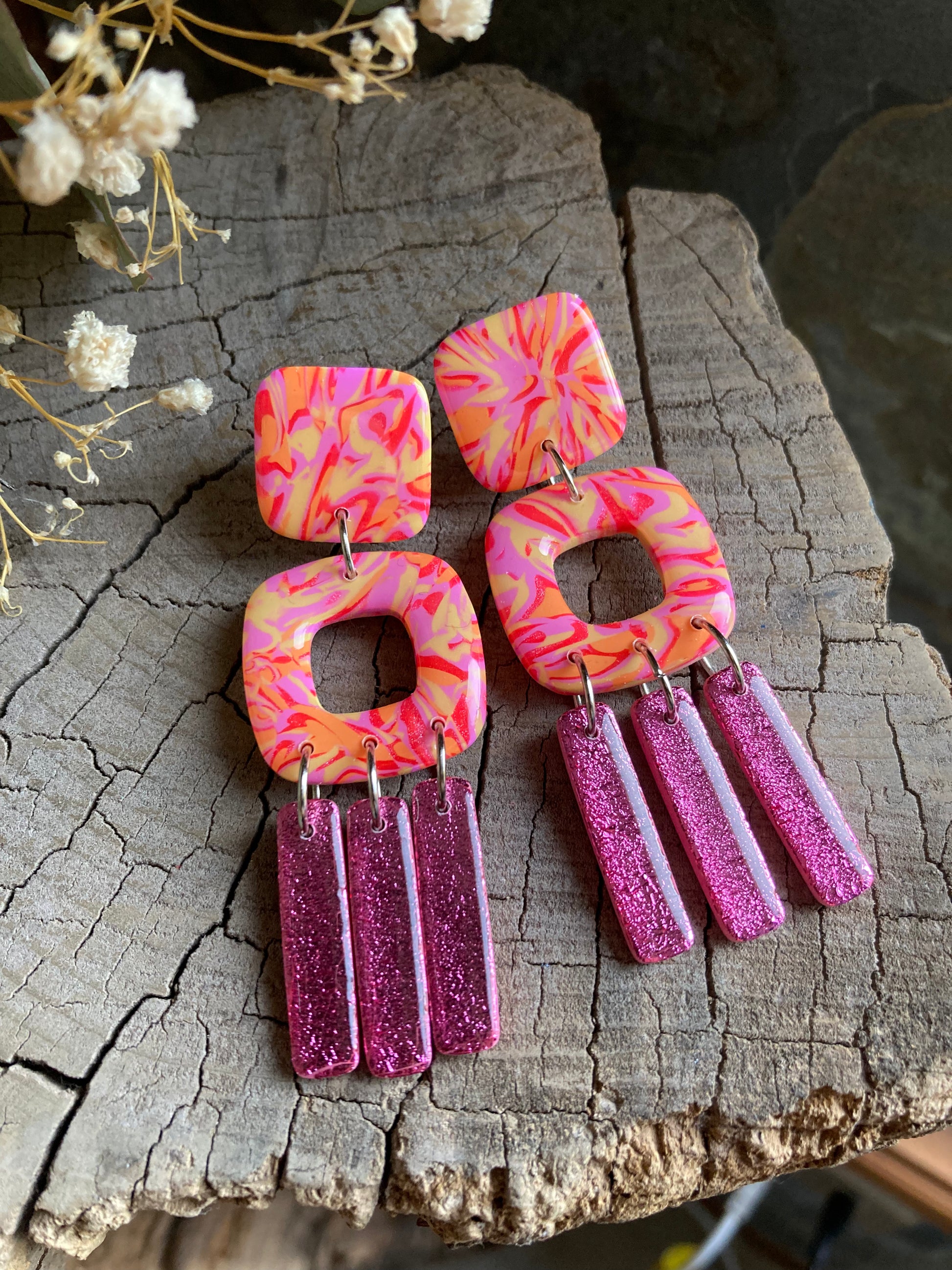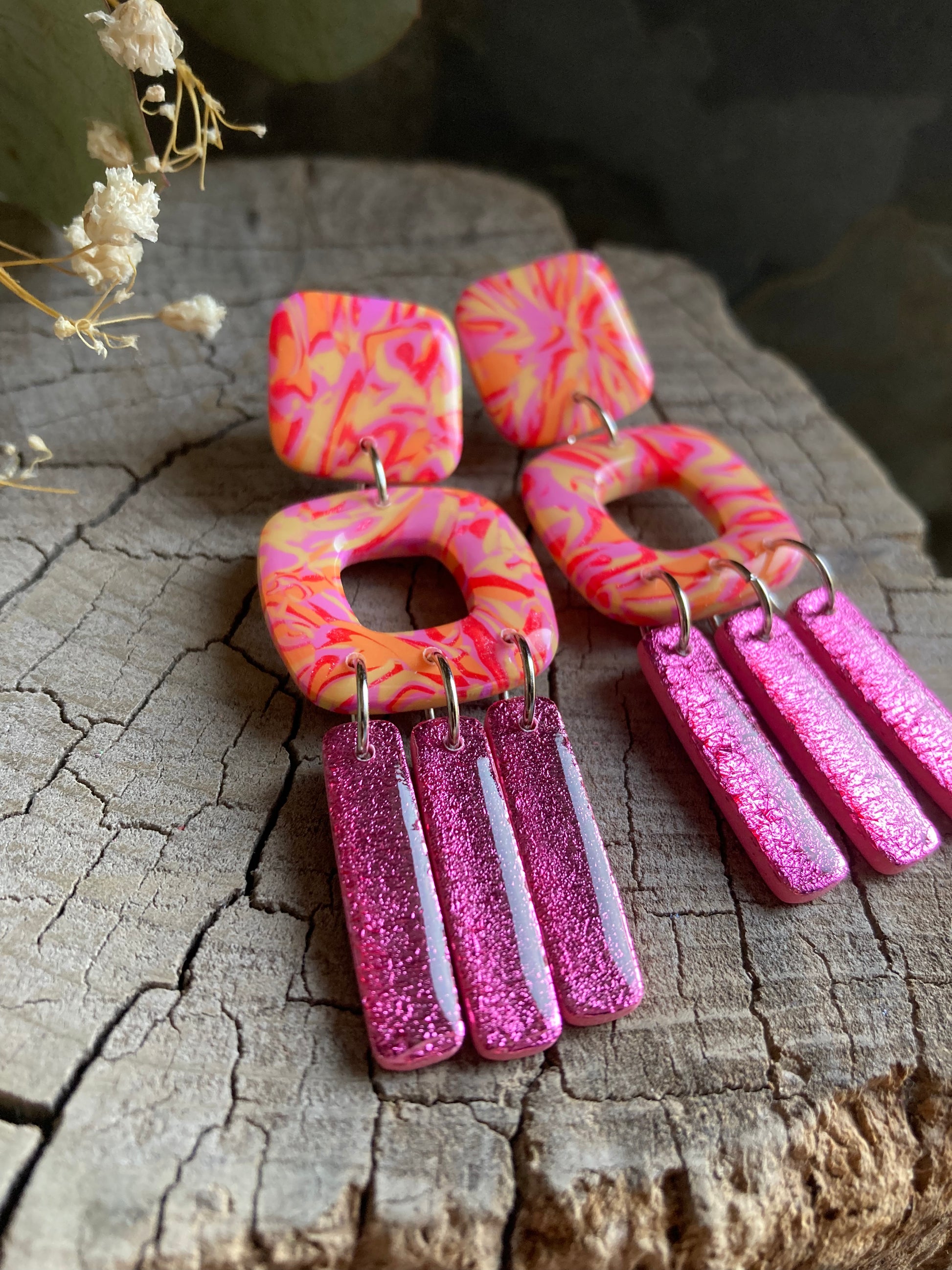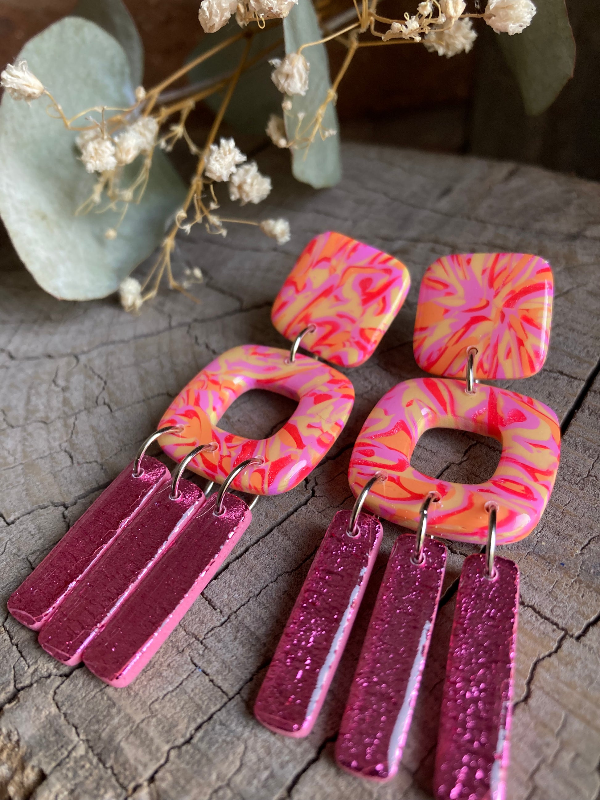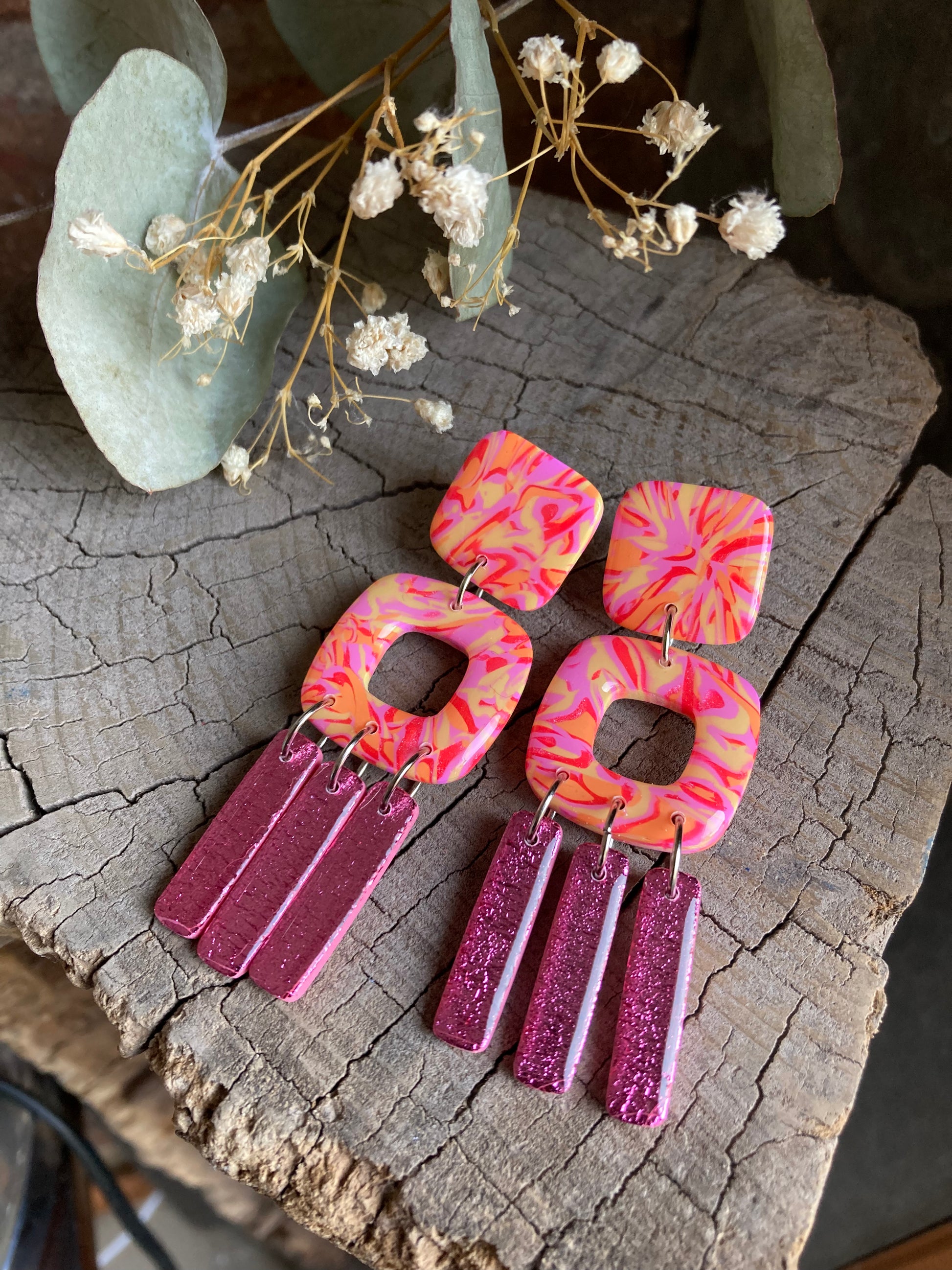 Aros de arcilla polimérica con top coat de resina uv. Miden 7,4 cms. Palito de acero quirúrgico y tope de goma.