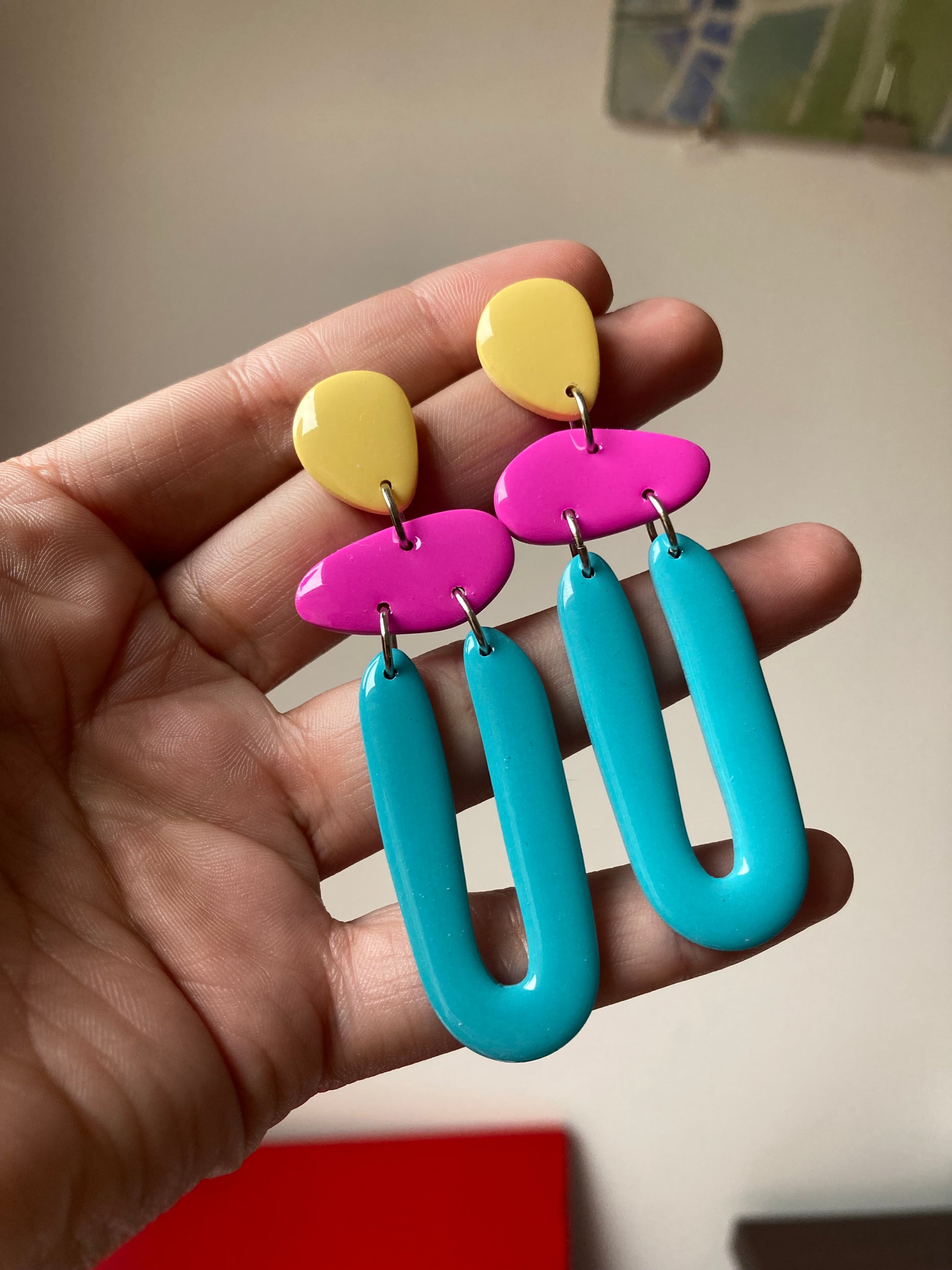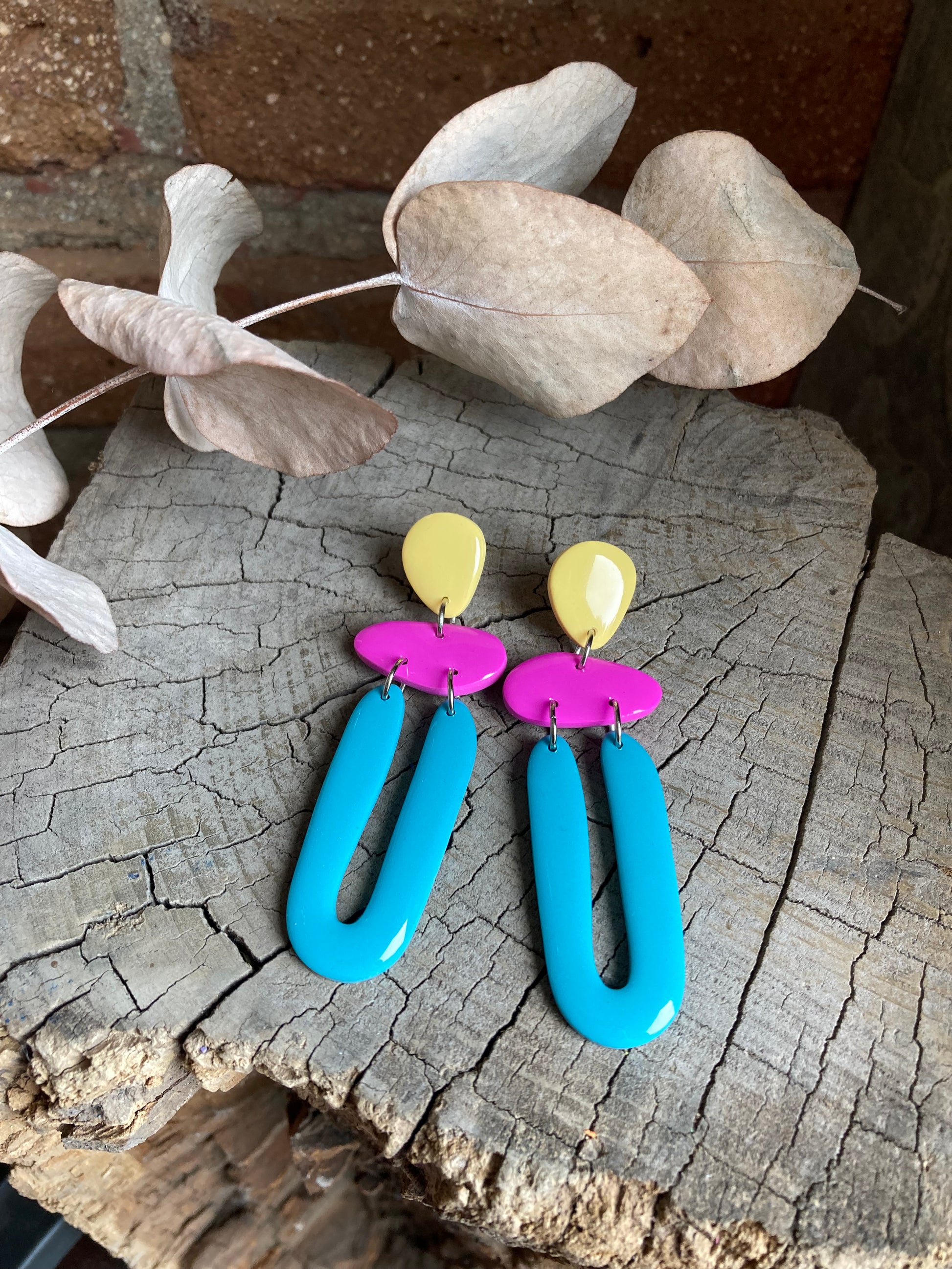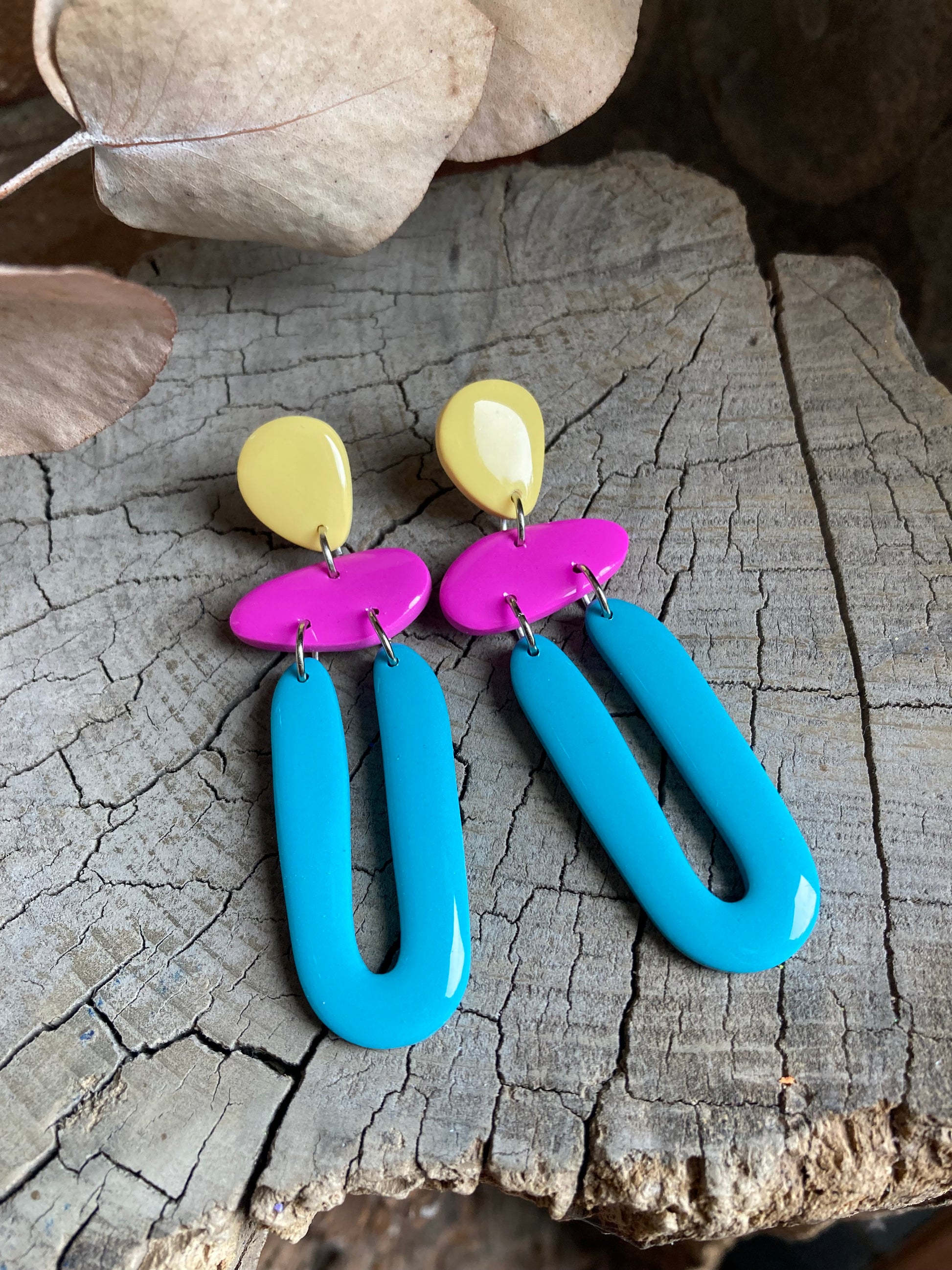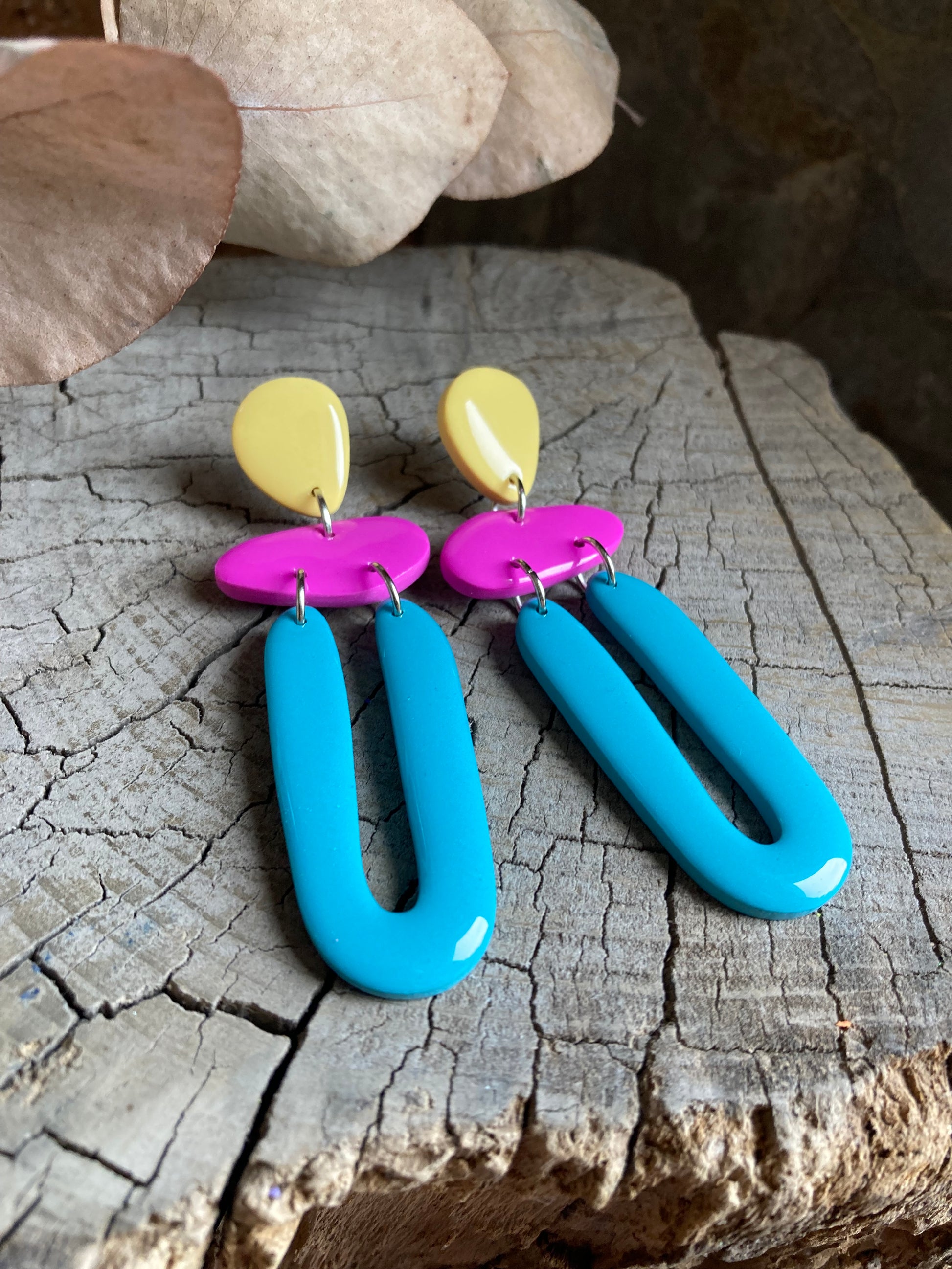 Aros de arcilla polimérica con top coat de resina uv. Miden 7,5 cms. Palito de acero quirúrgico y tope de goma.