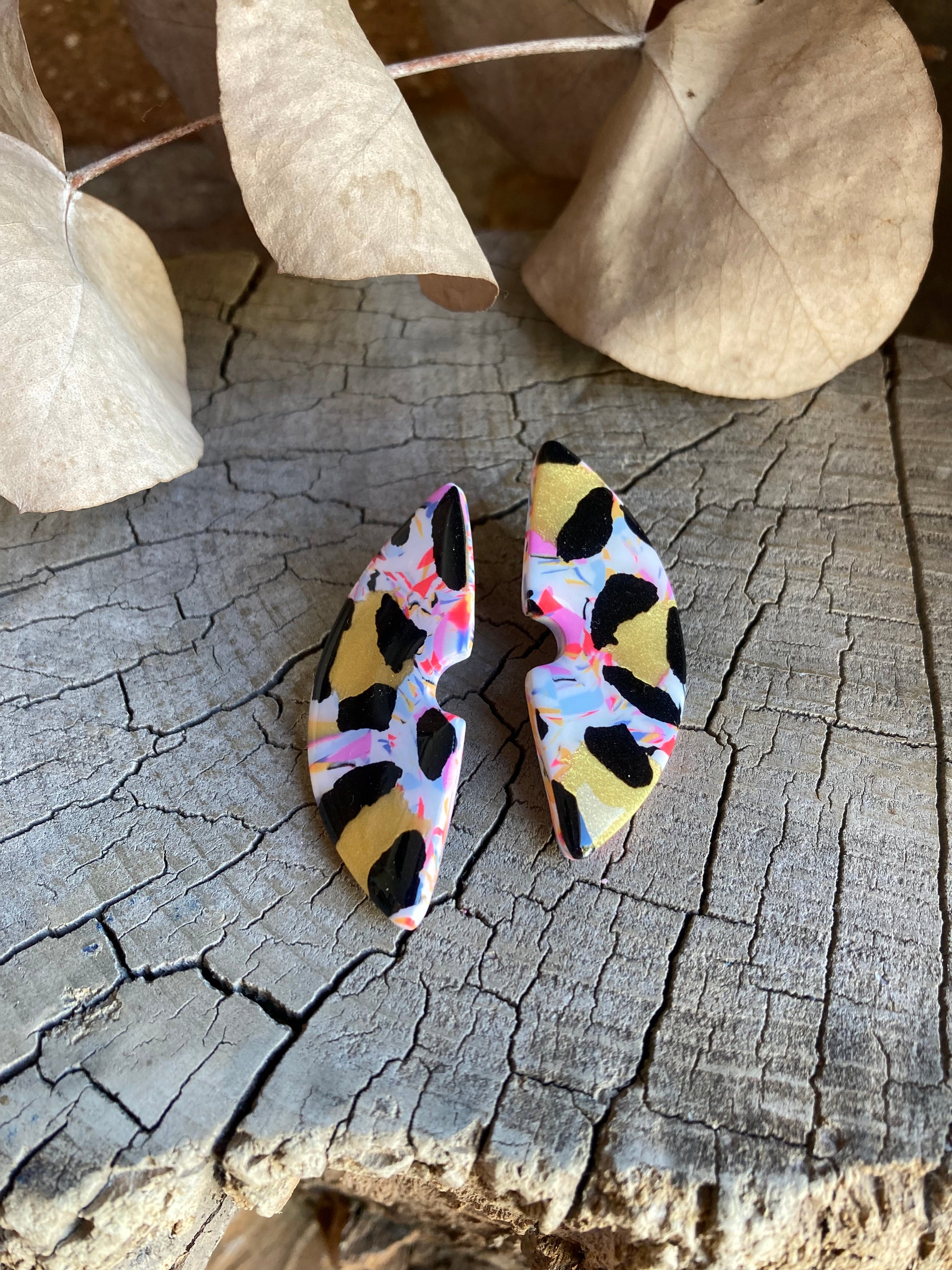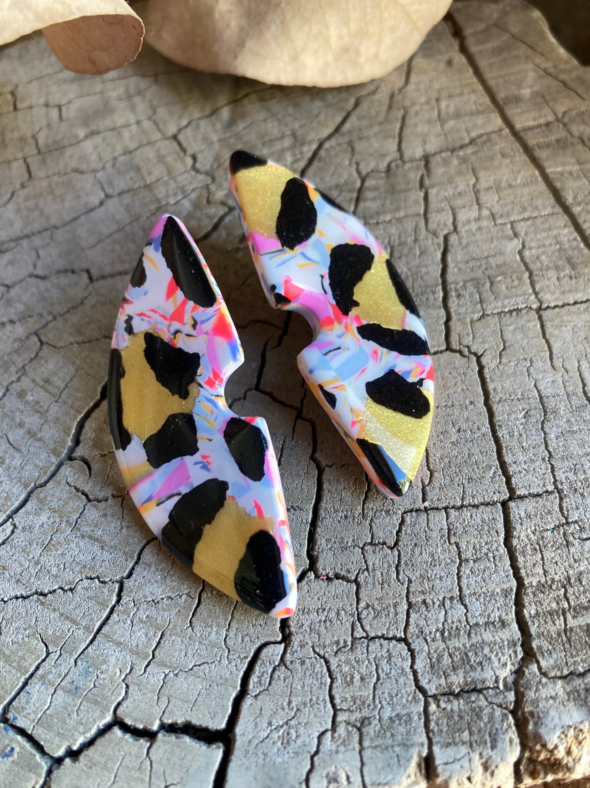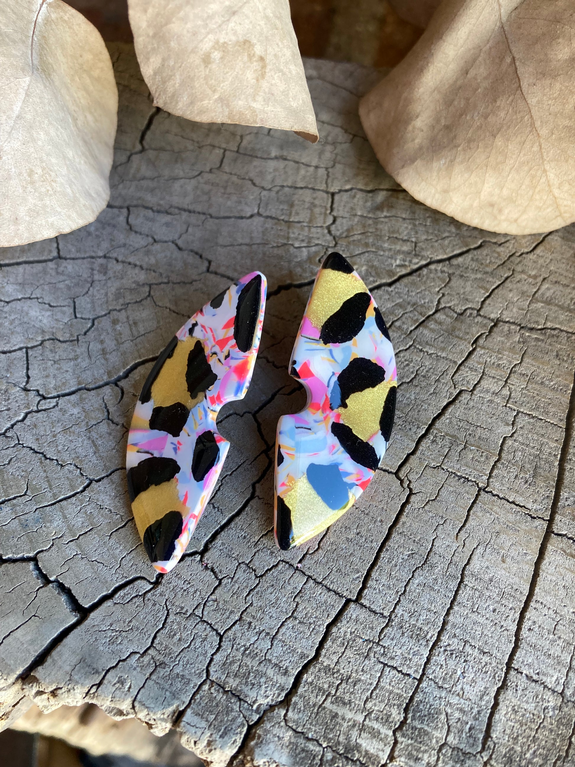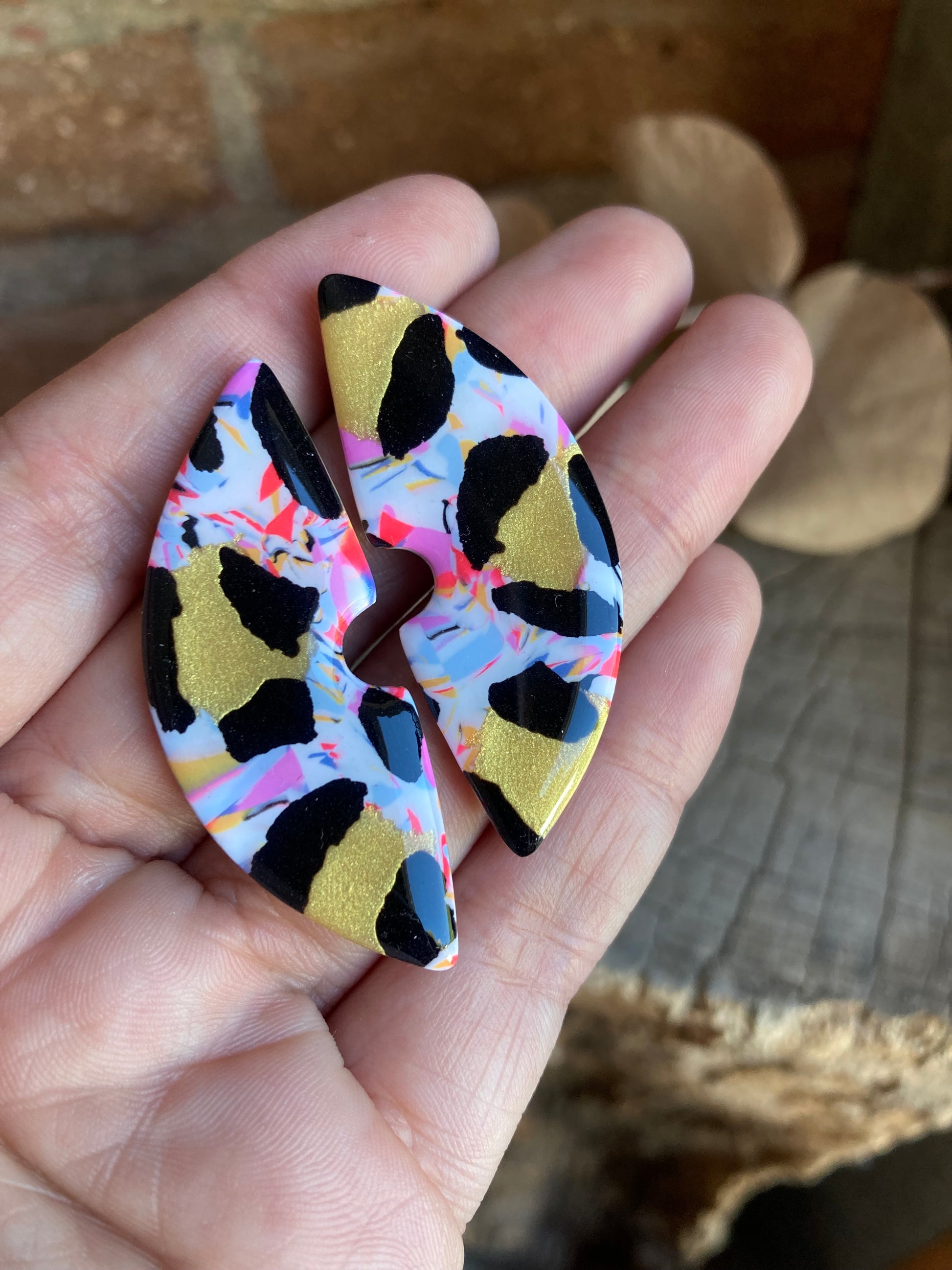 Aros de arcilla polimérica con top coat de resina uv. Miden 5 cms. Palito de acero quirúrgico y tope de goma.