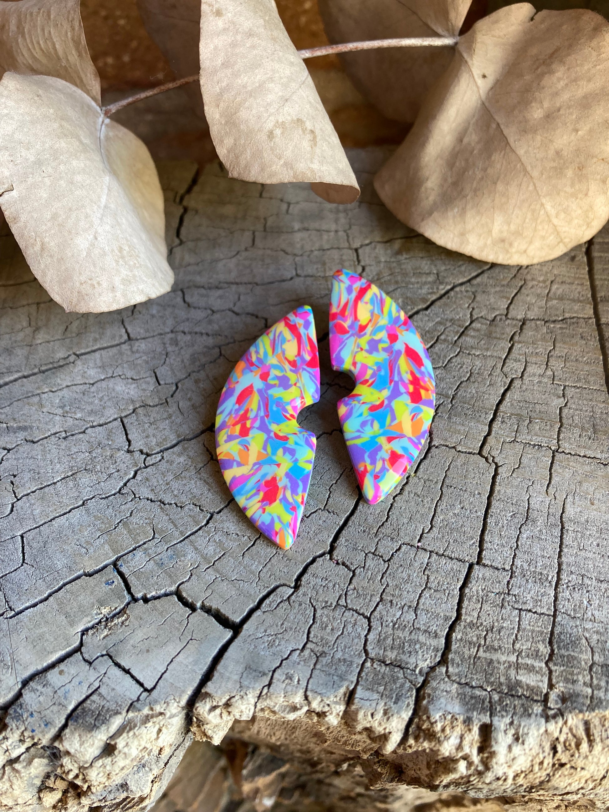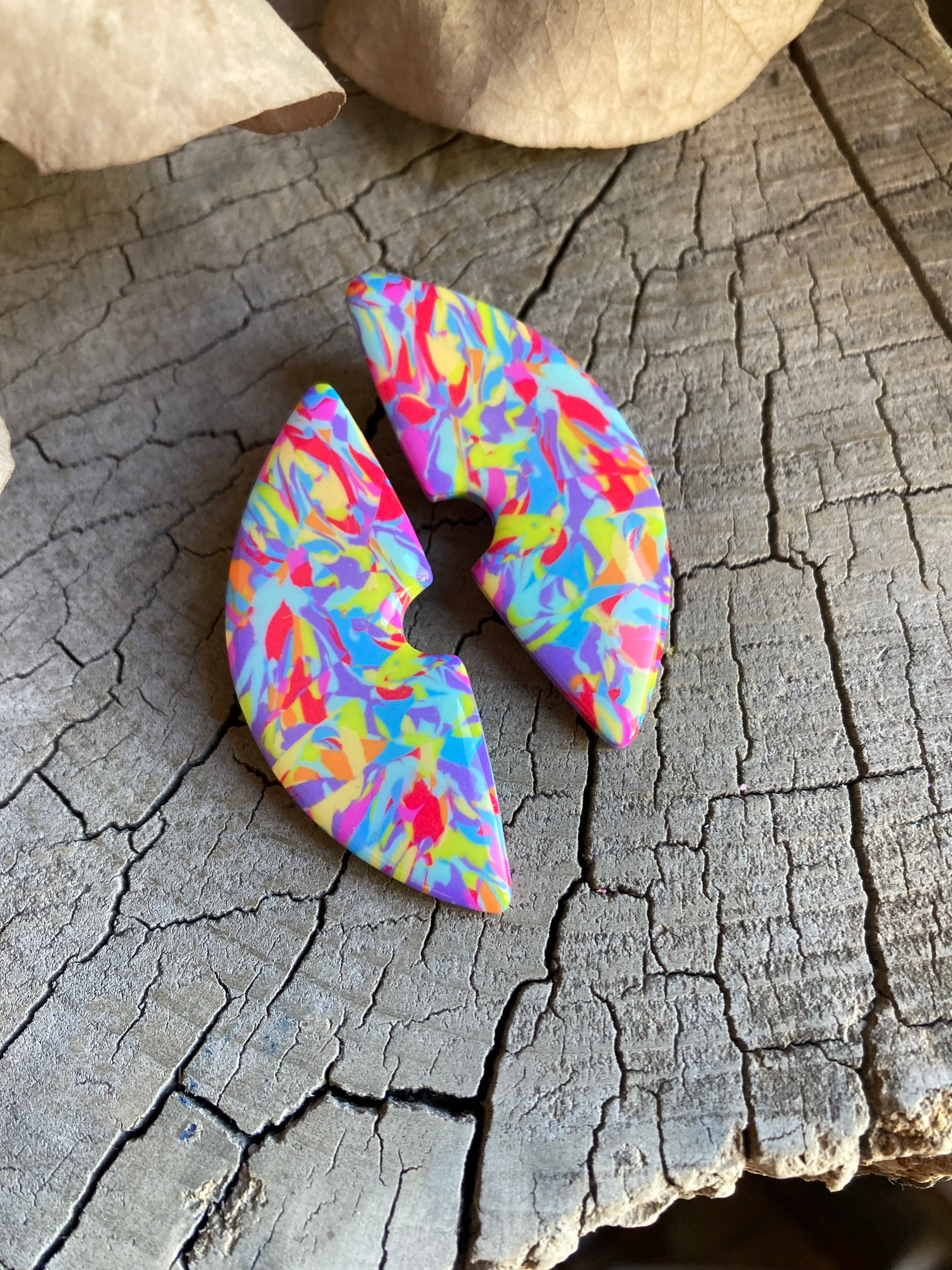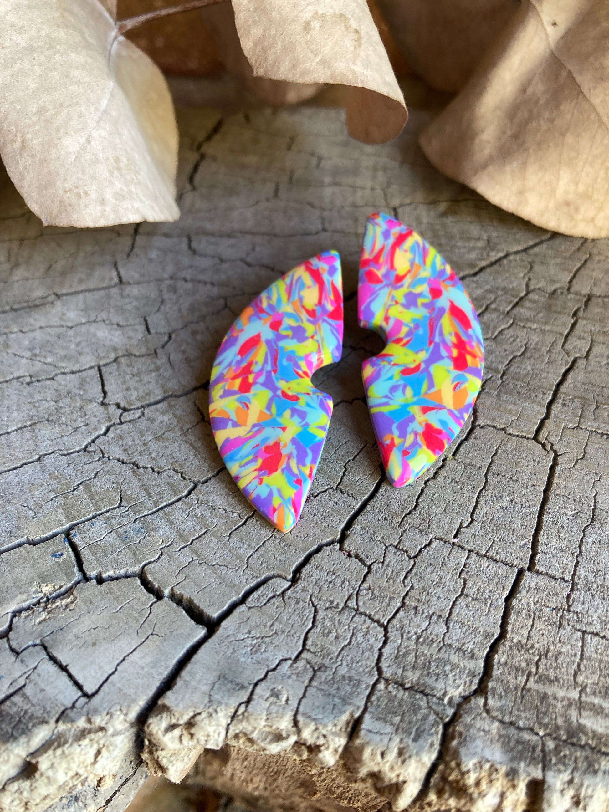 Aros de arcilla polimérica con top coat de resina uv. Miden 5 cms. Palito de acero quirúrgico y tope de goma.