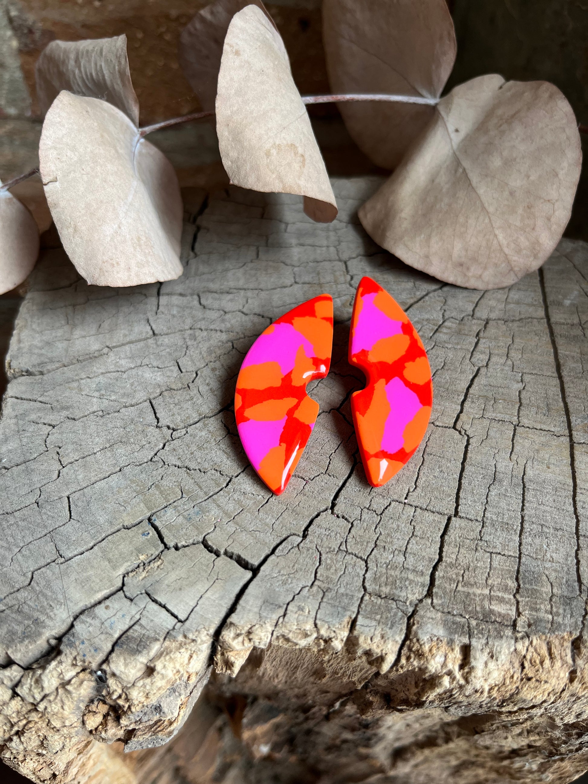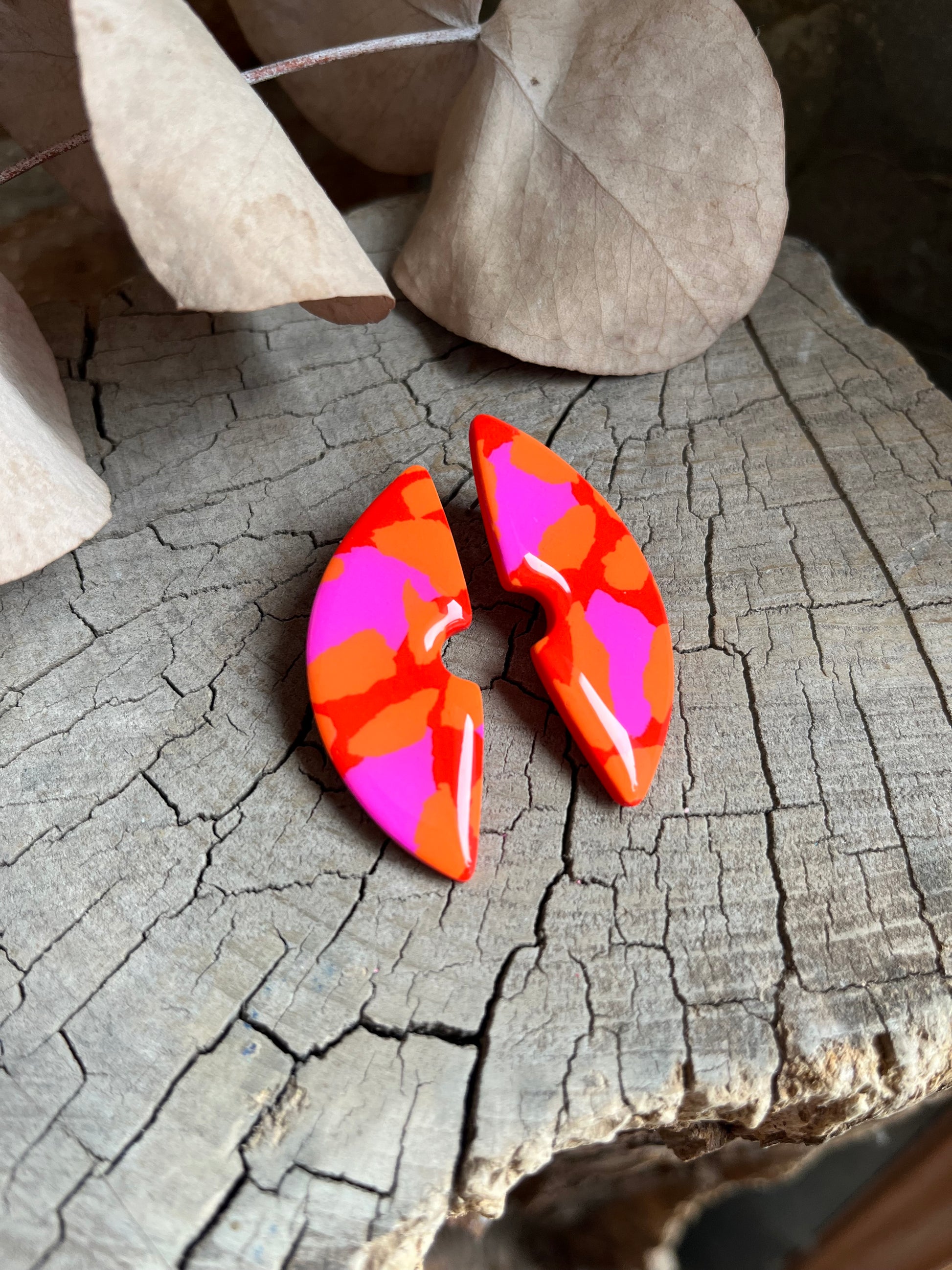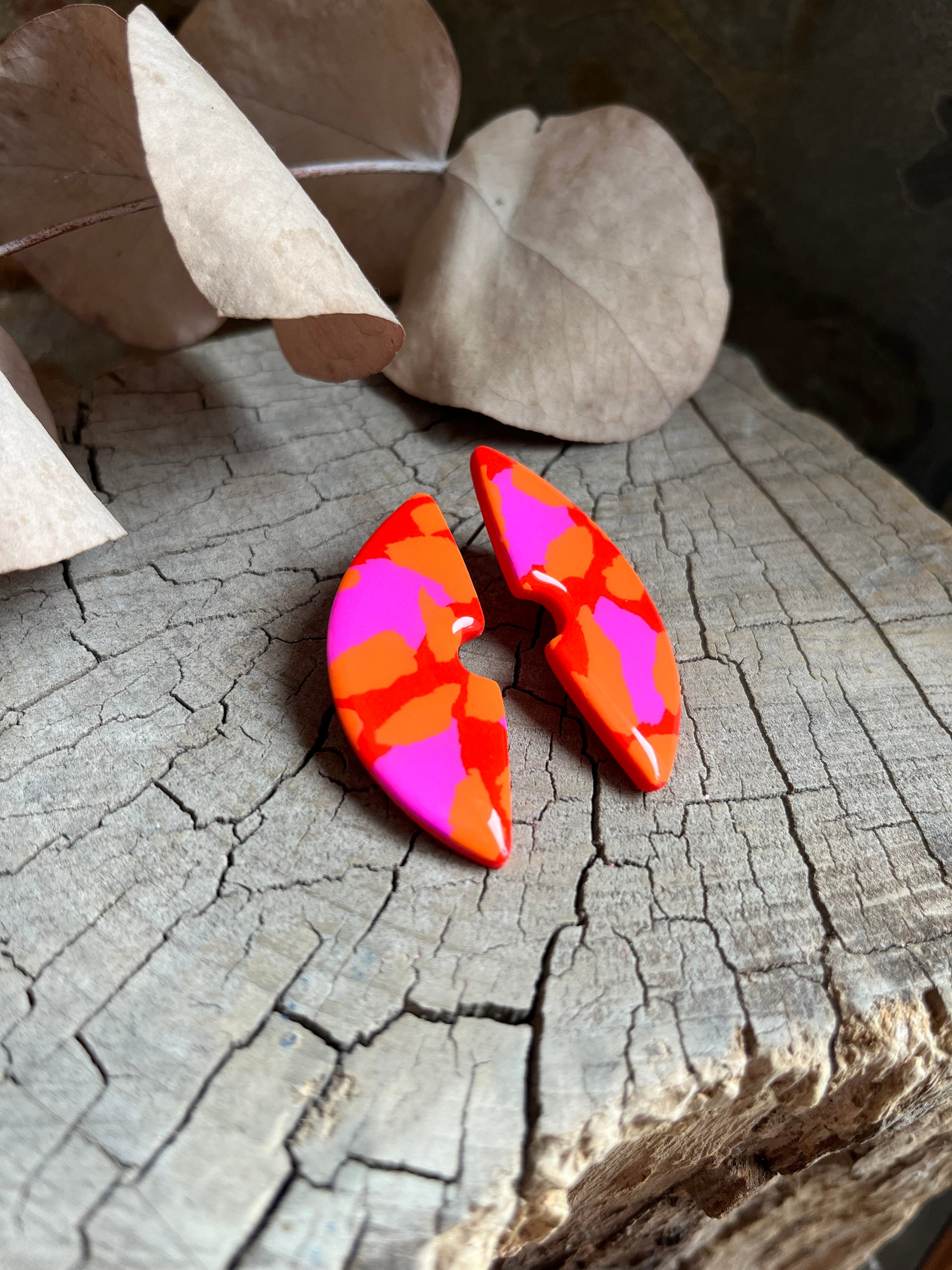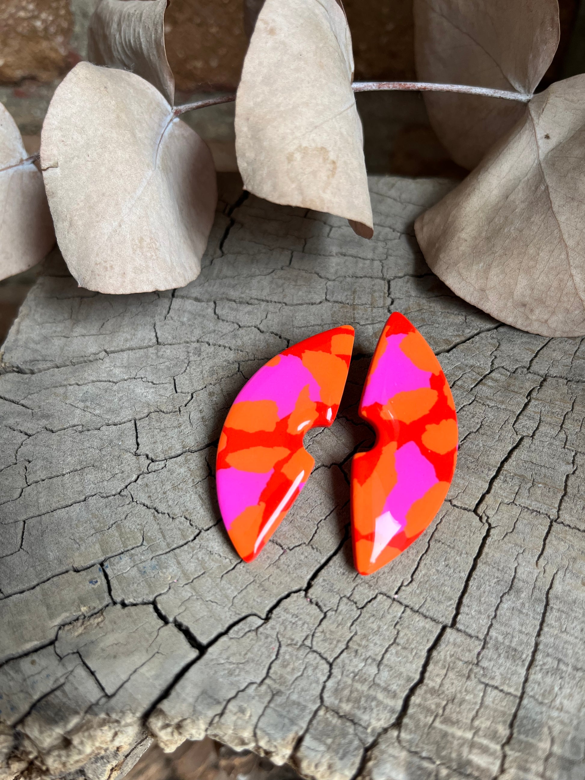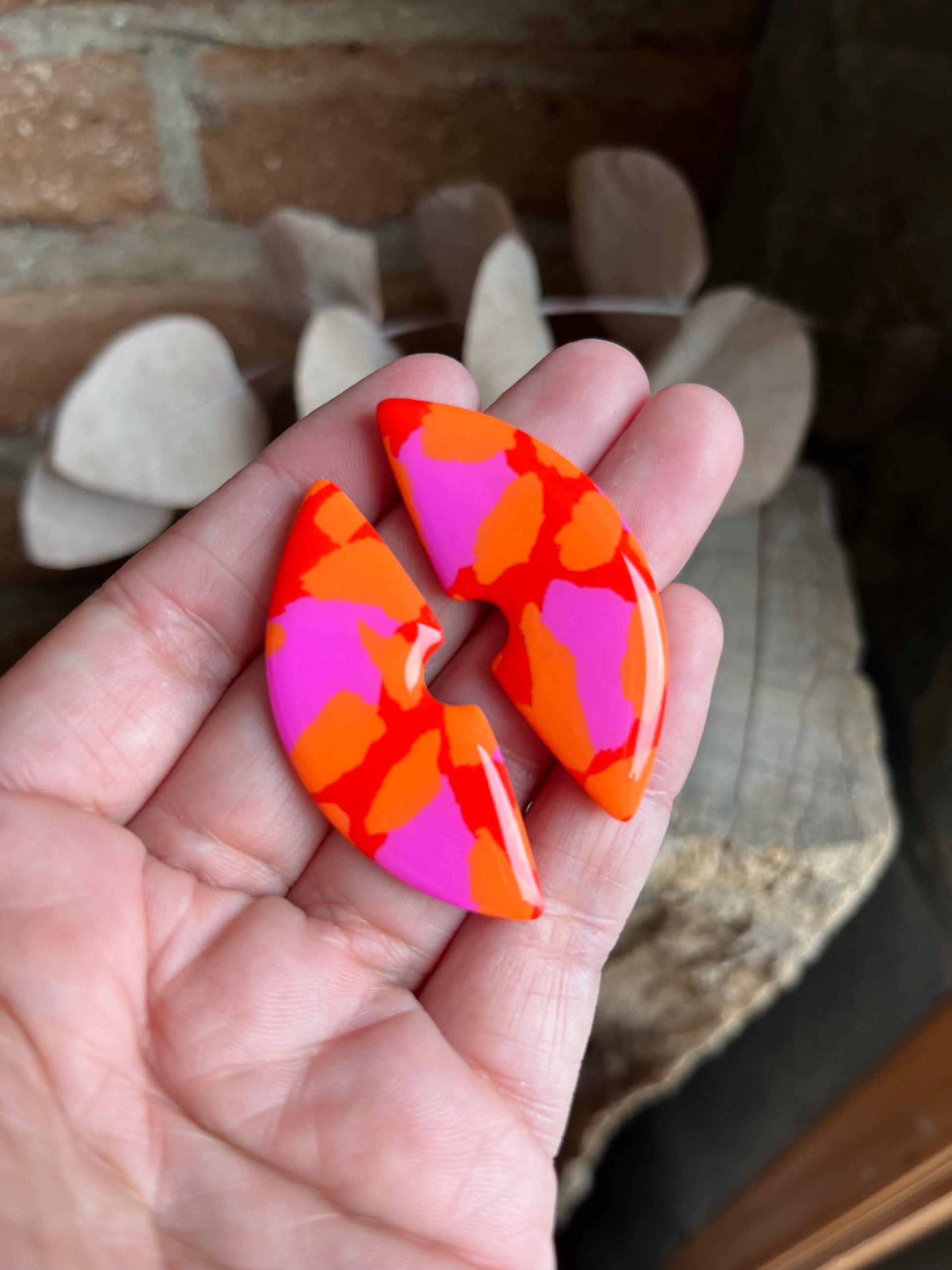 Aros de arcilla polimérica con top coat de resina uv. Miden 5 cms. Palito de acero quirúrgico y tope de goma.