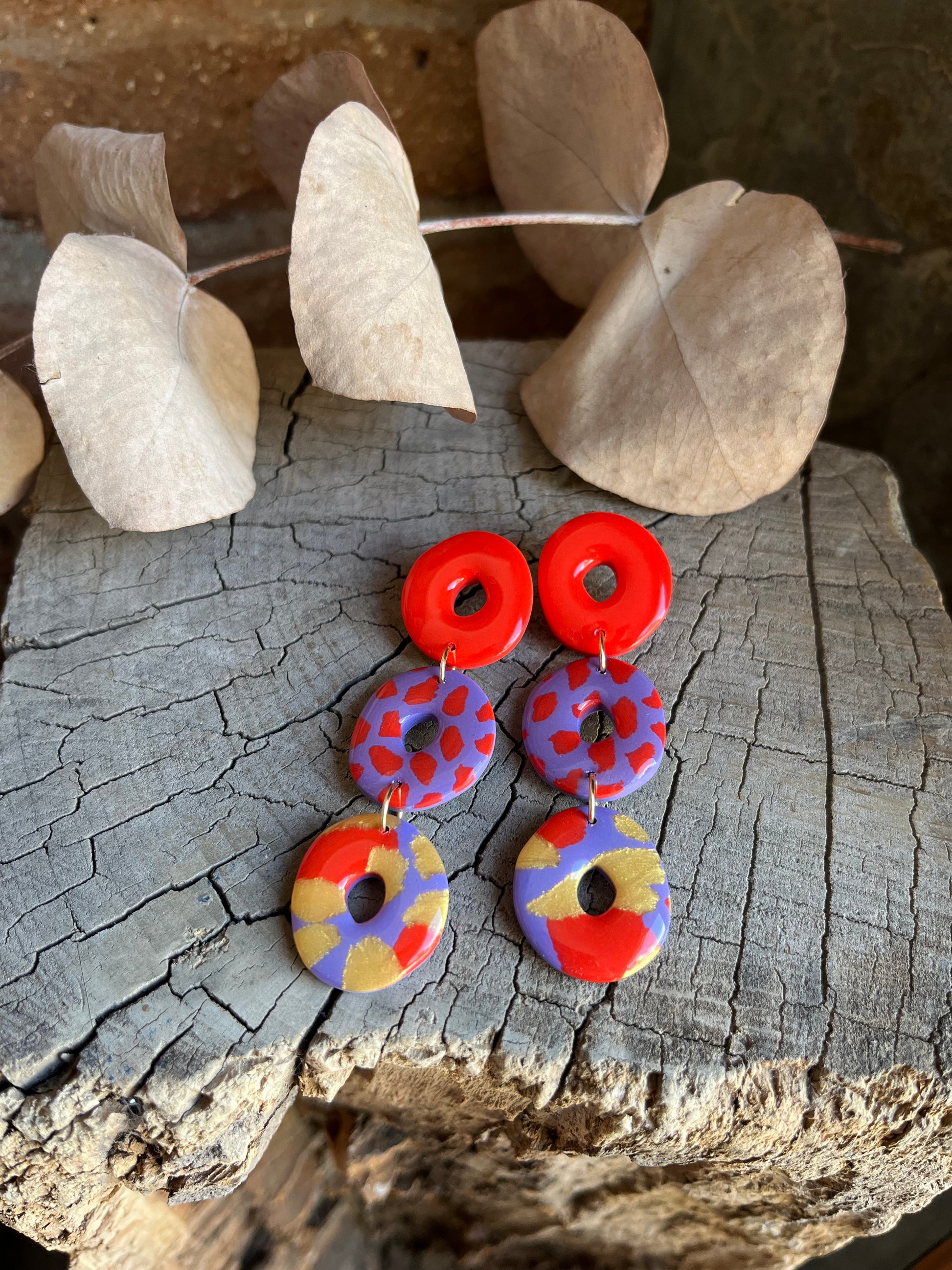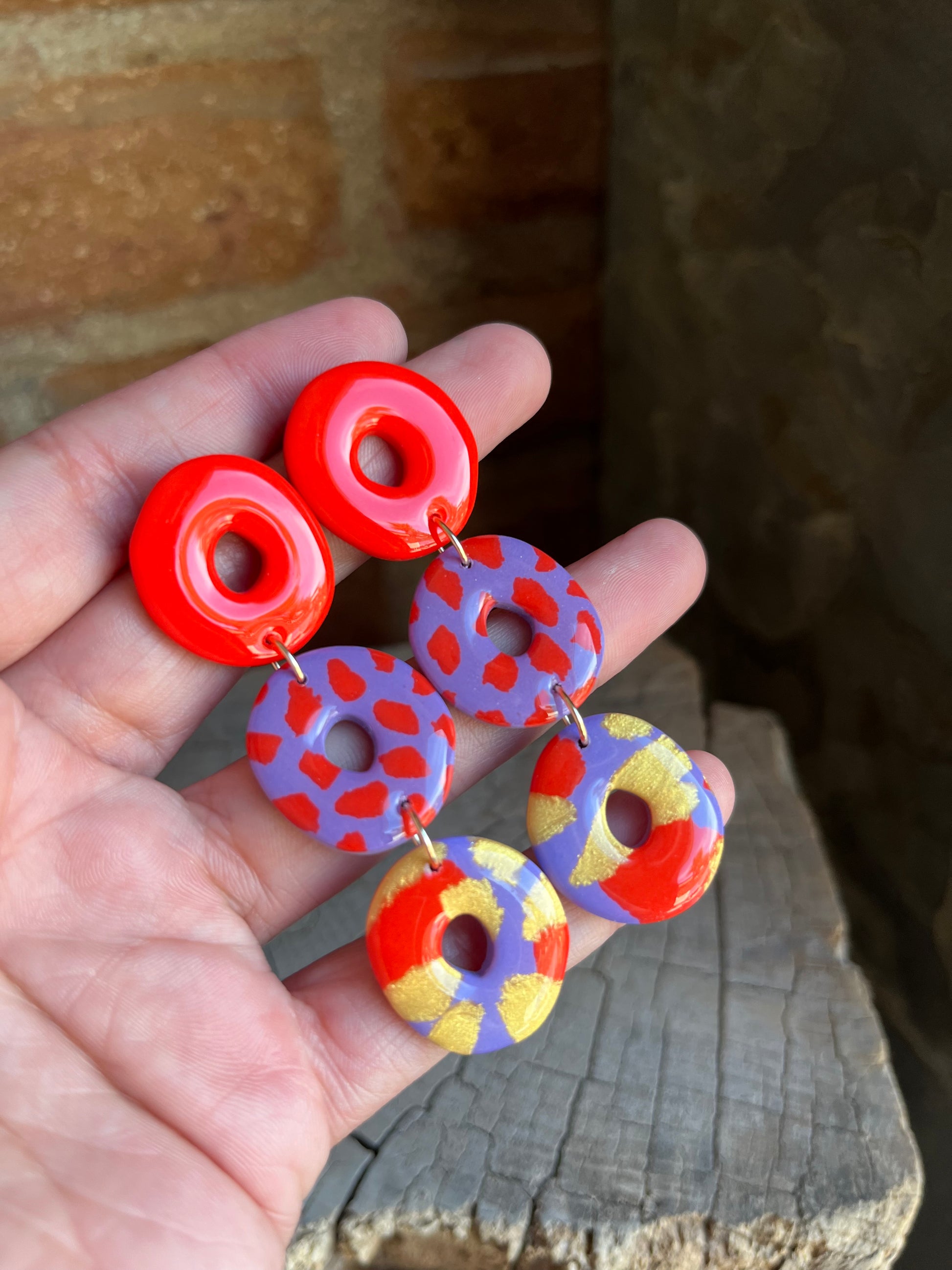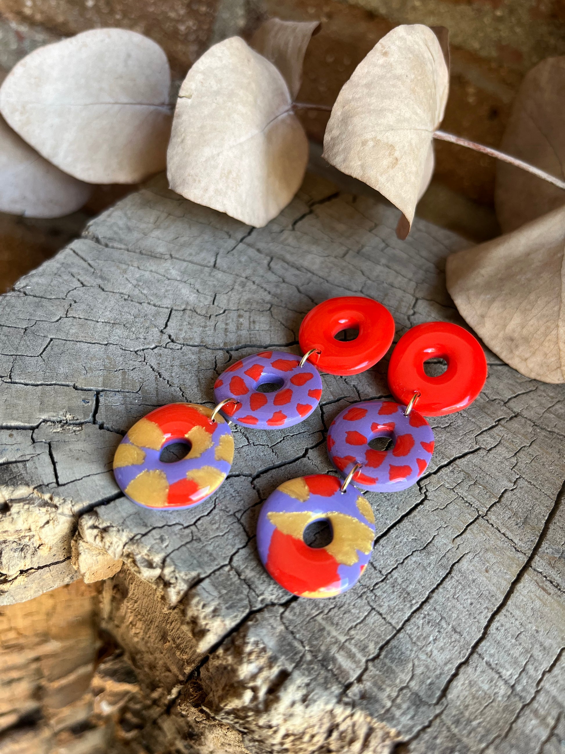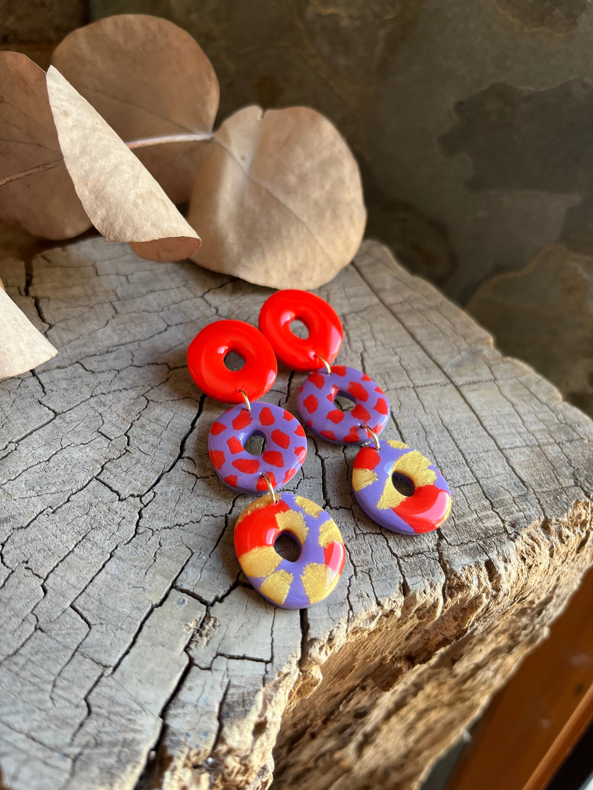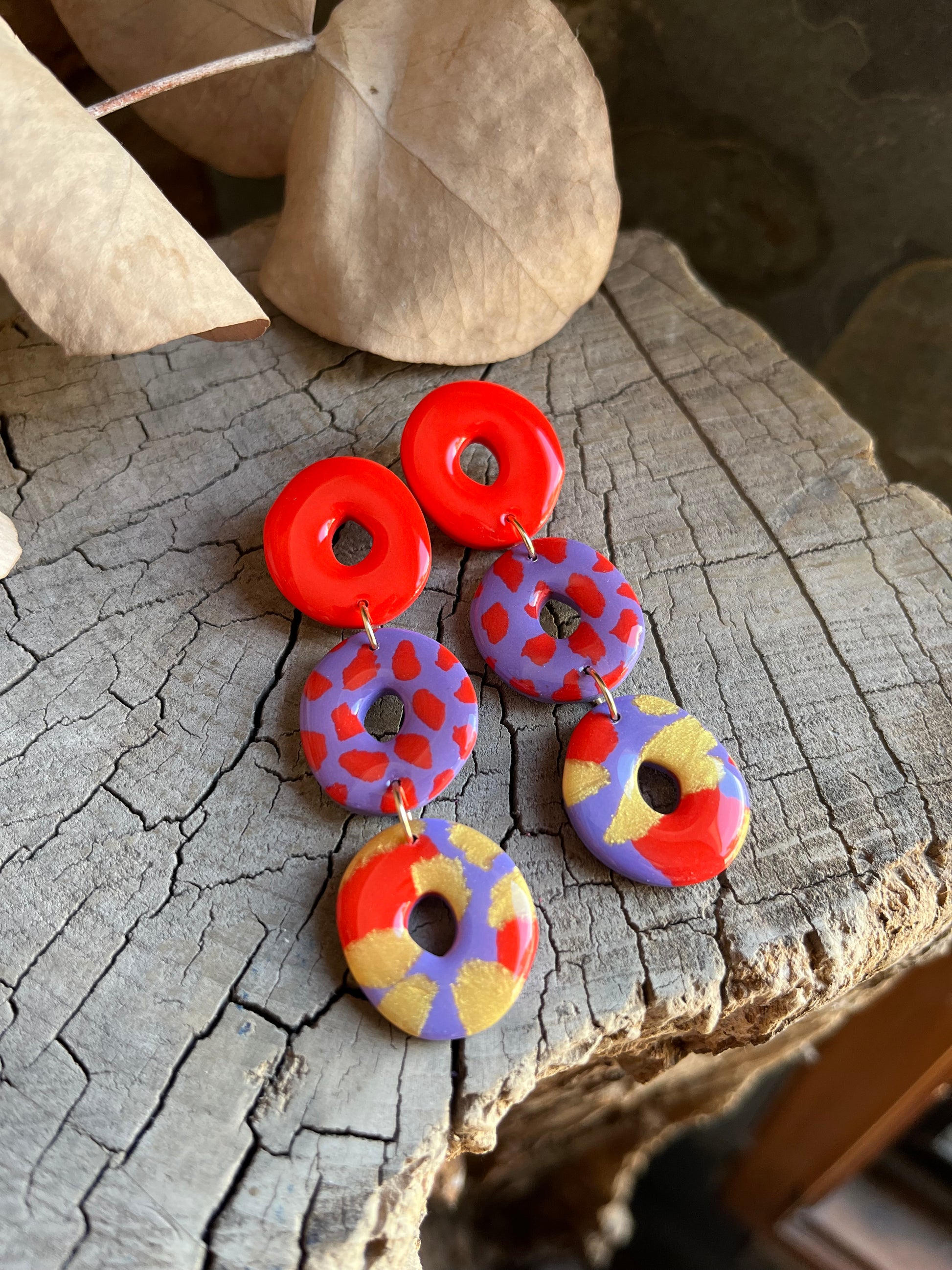Aros de arcilla polimérica con top coat de resina uv. Miden 7,3 cms. Palito de acero quirúrgico y tope de goma.