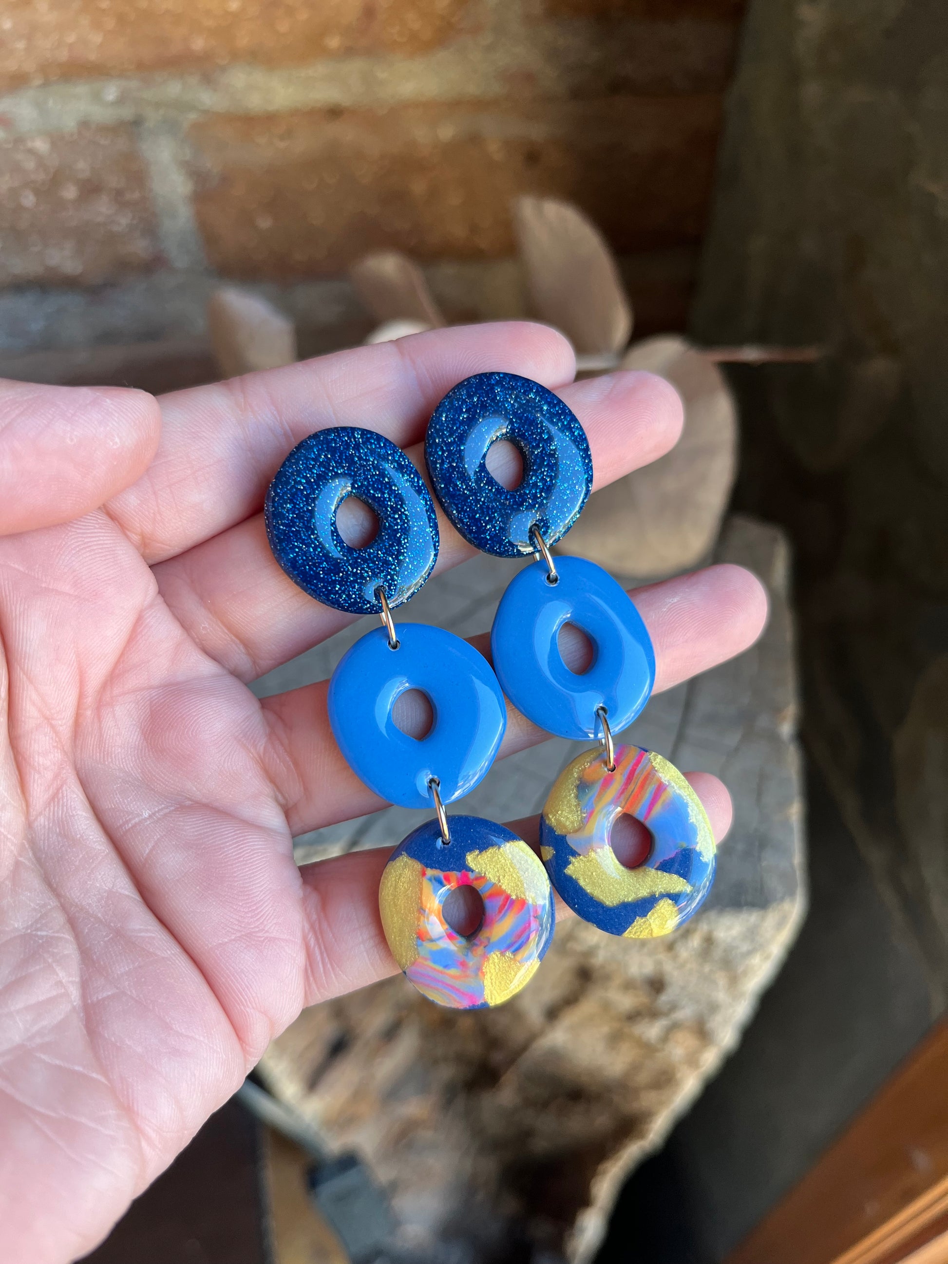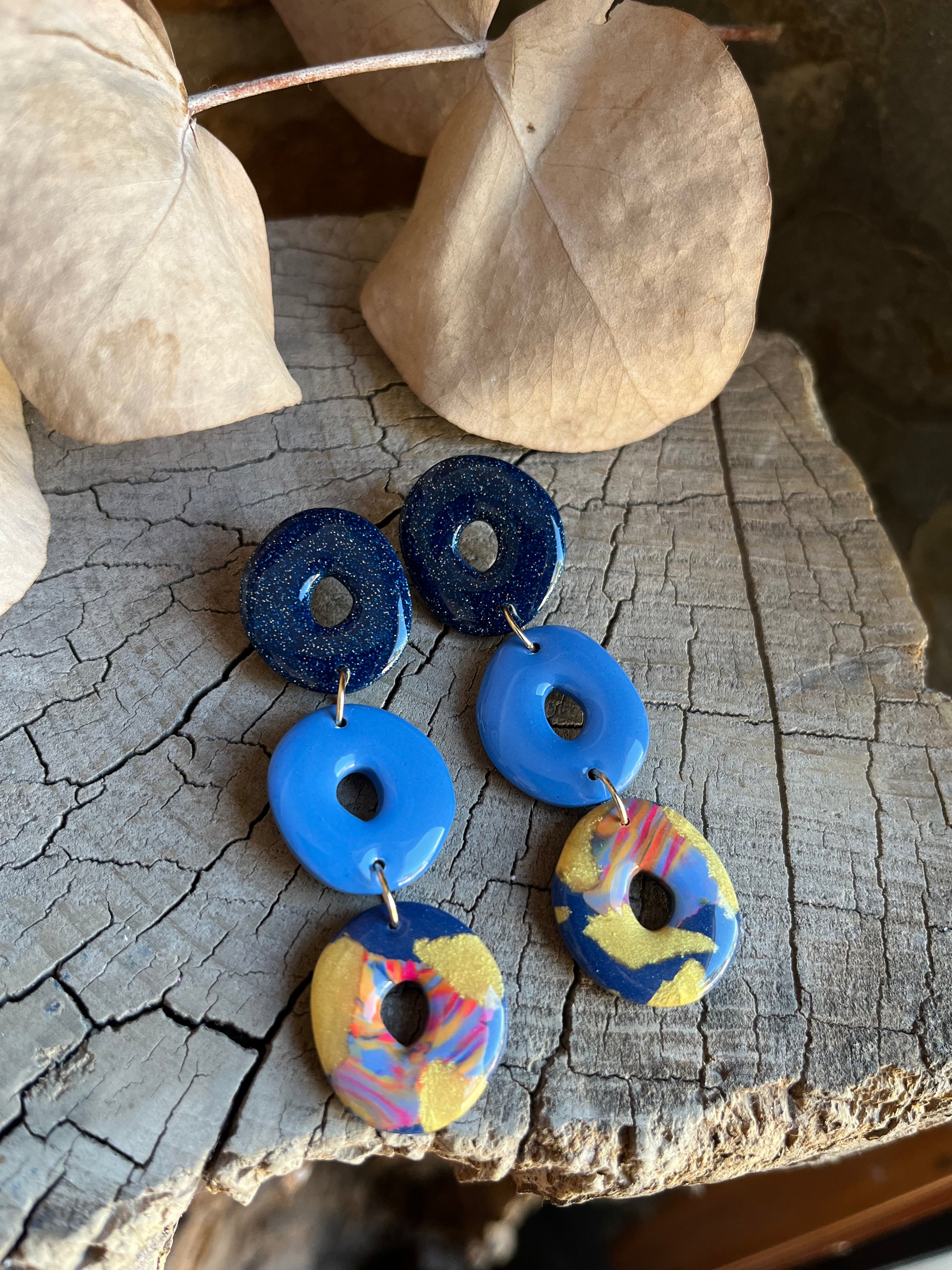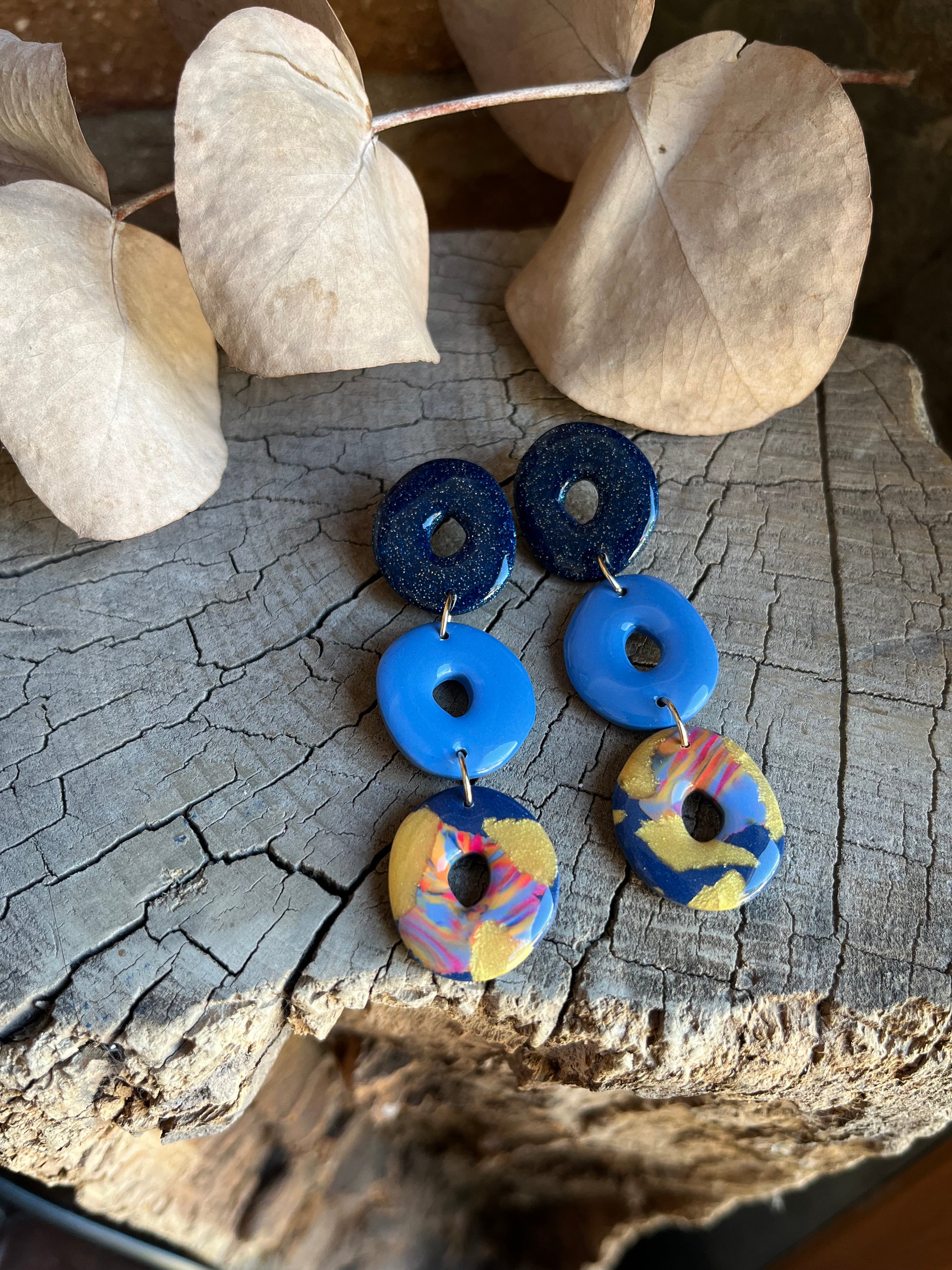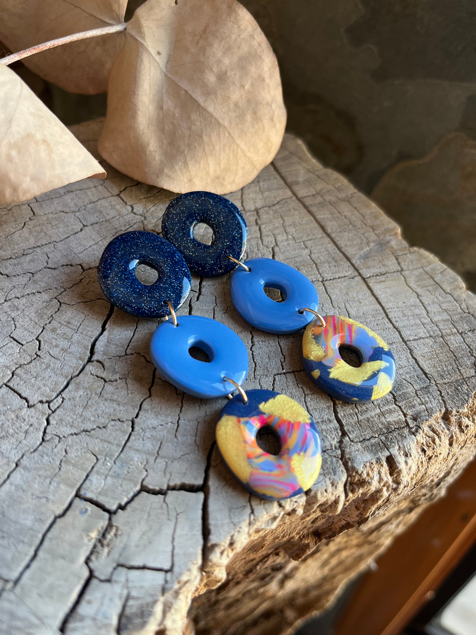 Aros de arcilla polimérica con top coat de resina uv. Miden 7,3 cms. Palito de acero quirúrgico y tope de goma.