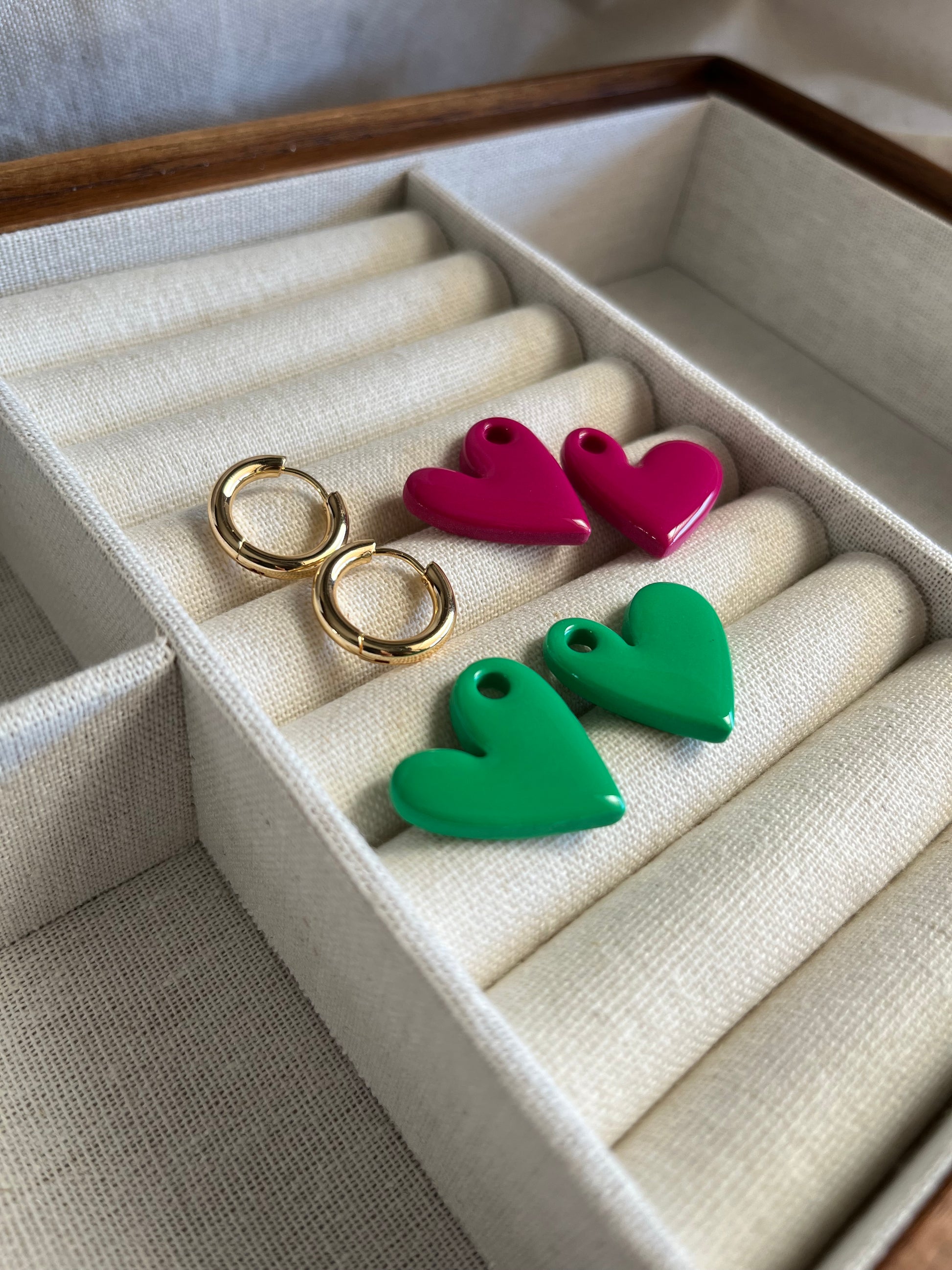 Argollas de acero inoxidable bañadas en oro de 18 kt (dorada) o rodio (plateada). Miden 18 mm de diámetro y 3 mm de grosor. Incluye dos corazones de 2,5 cms de arcilla polimérica con resina en verde y buganvilia.