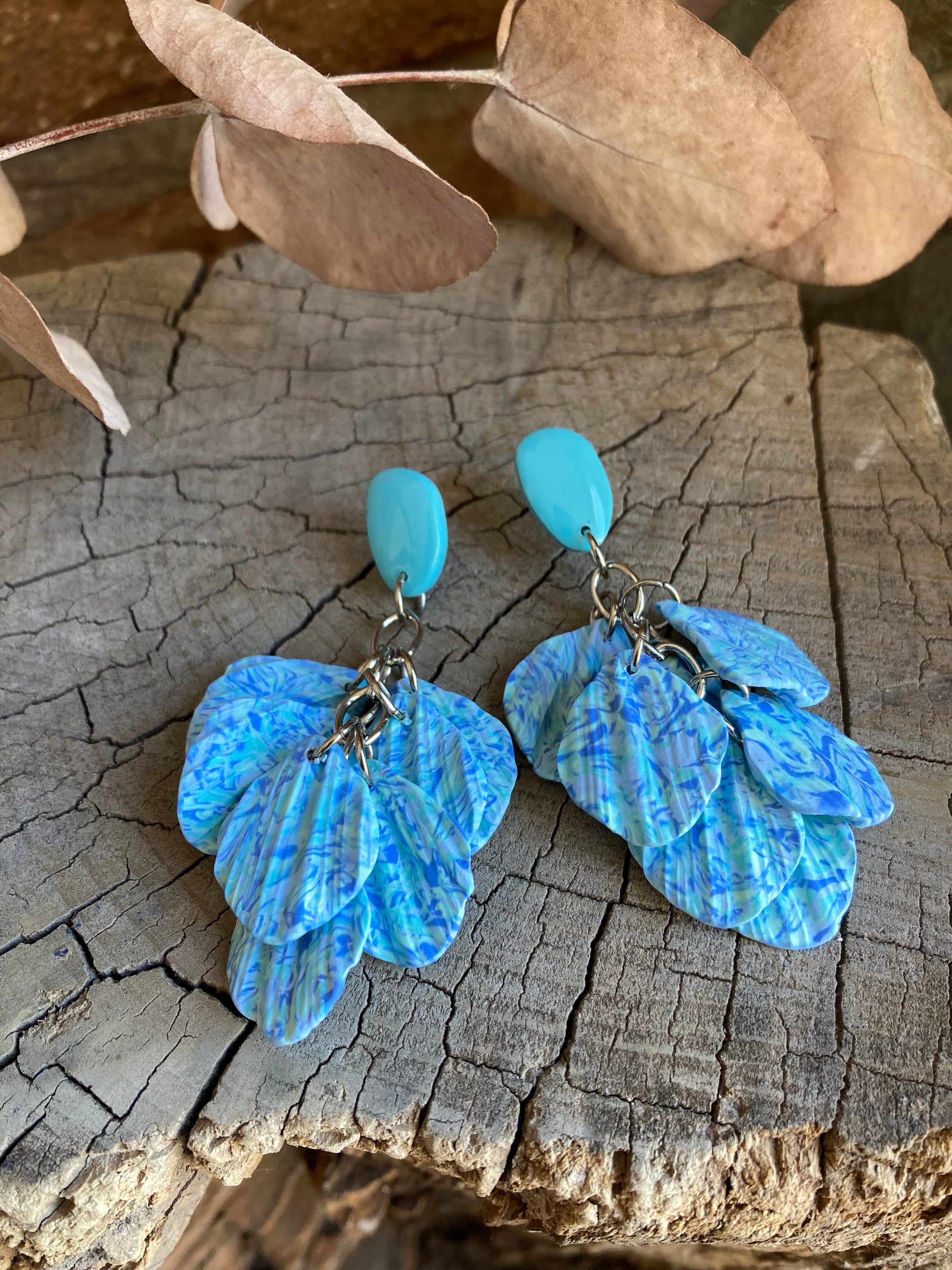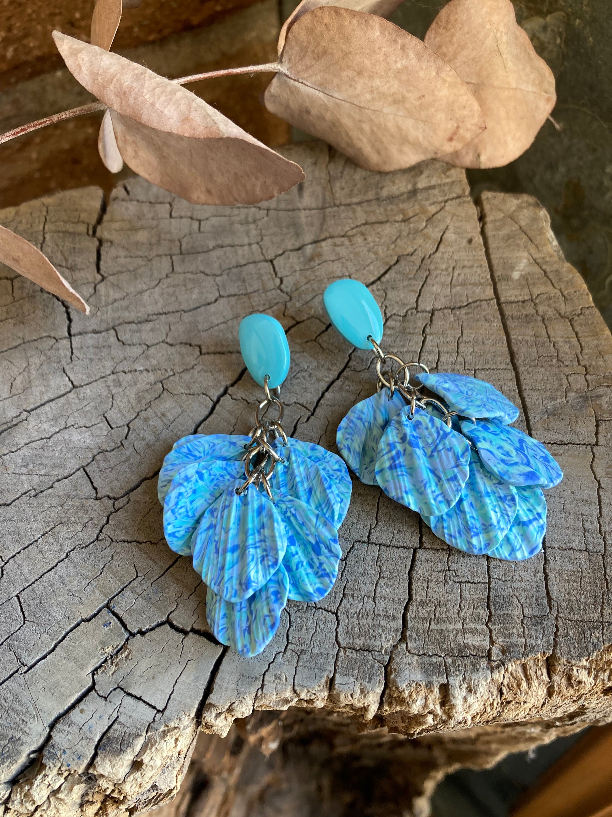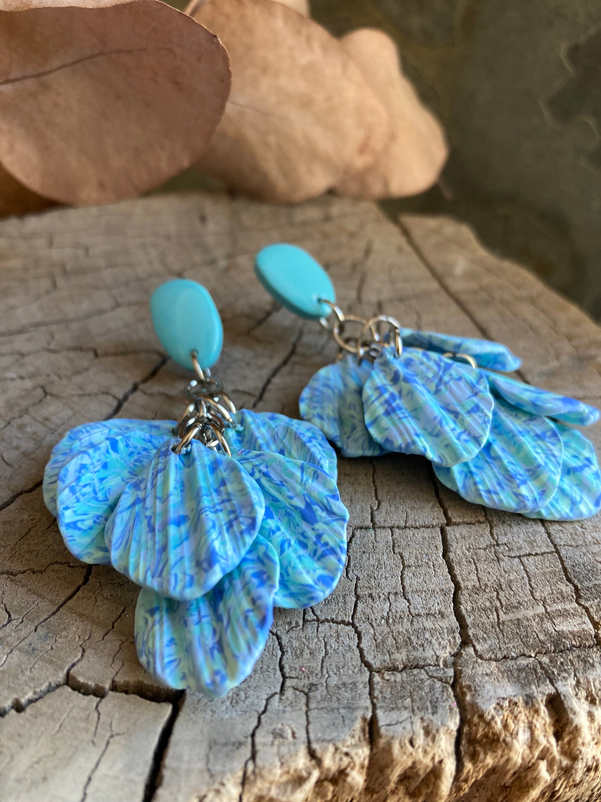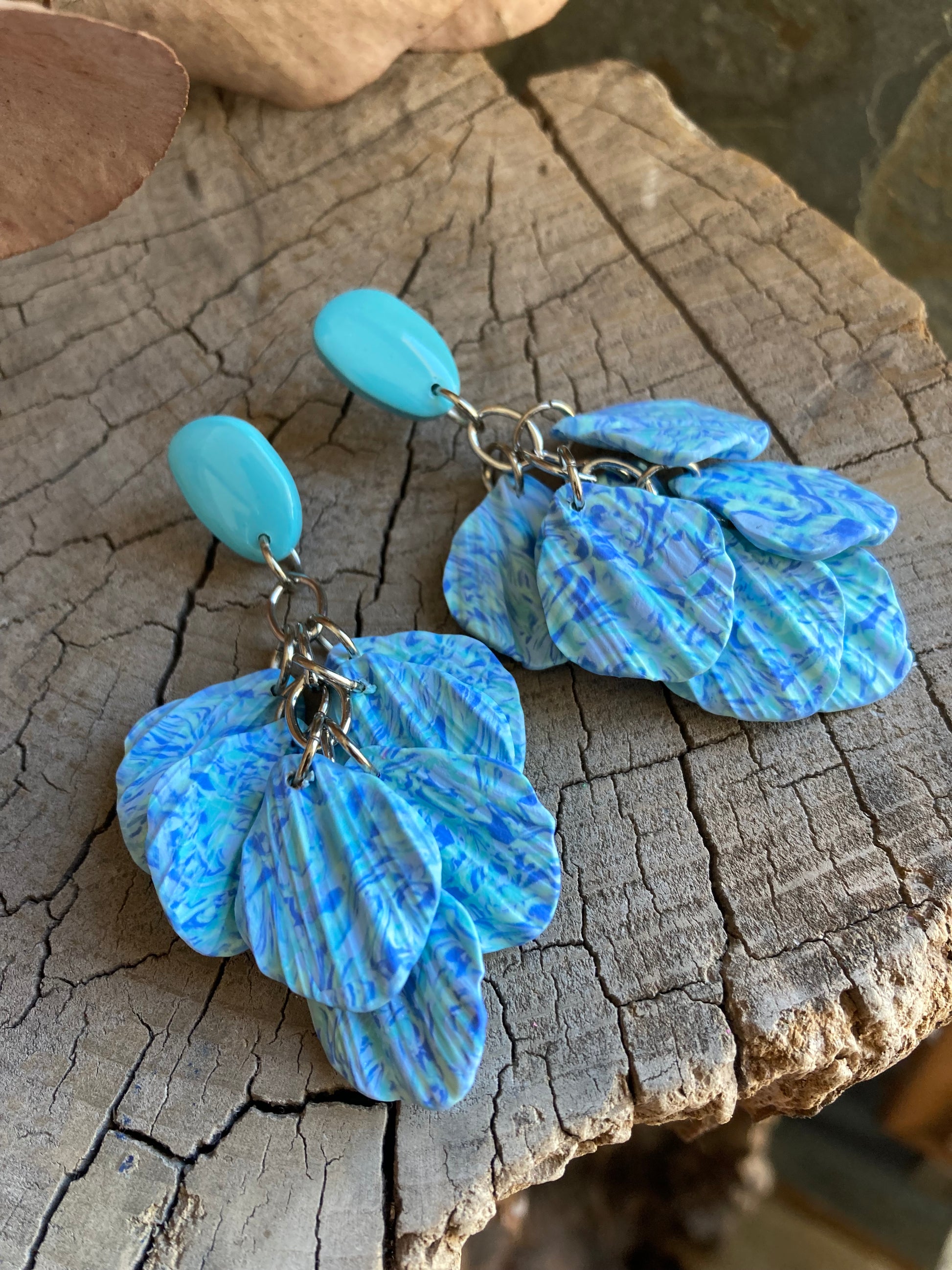 Aros con textura de pétalos en arcilla polimérica, colgando en cadena hipoalergénica bañada en oro. Miden 7 cms. Palito de acero quirúrgico y tope de goma.